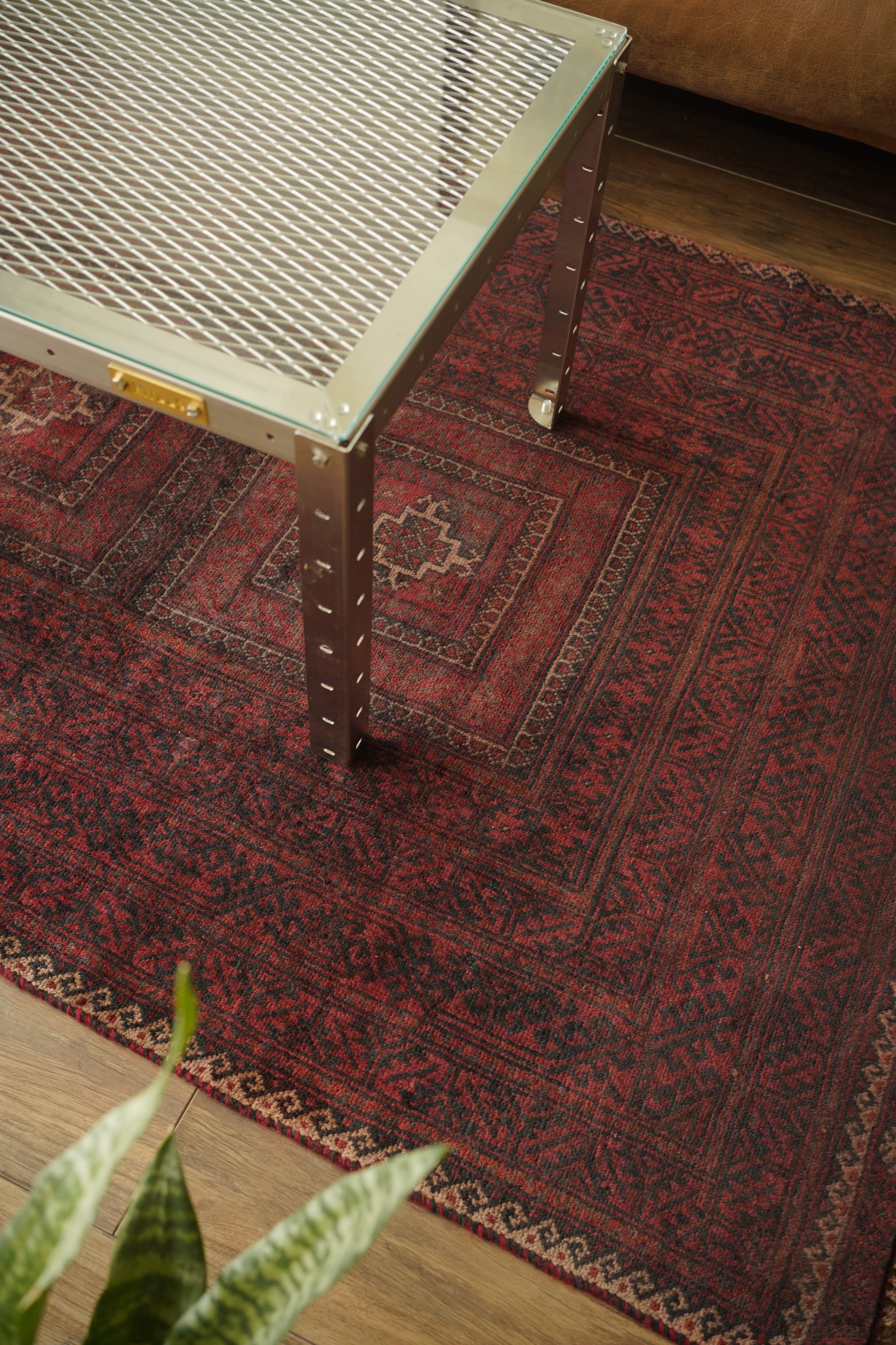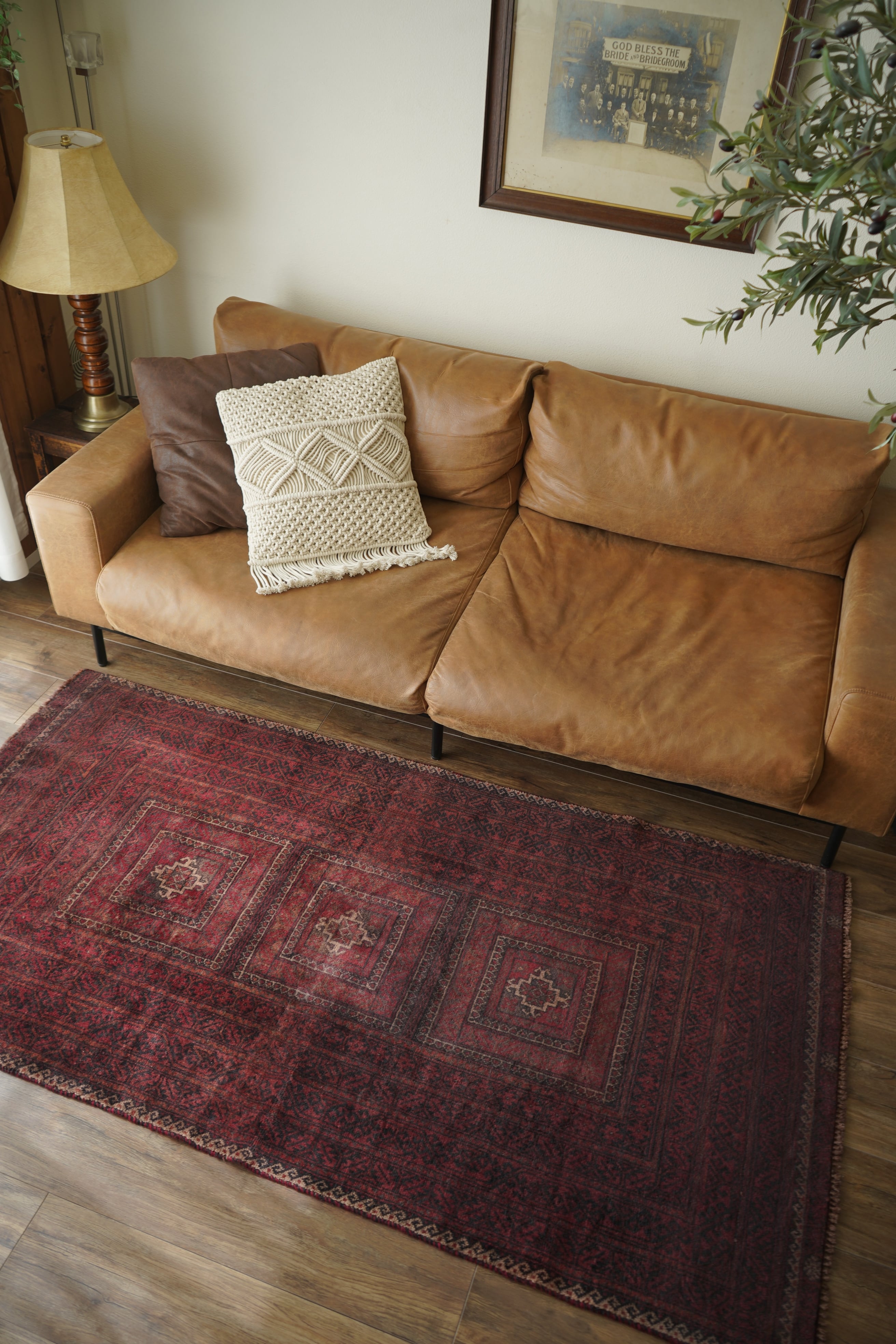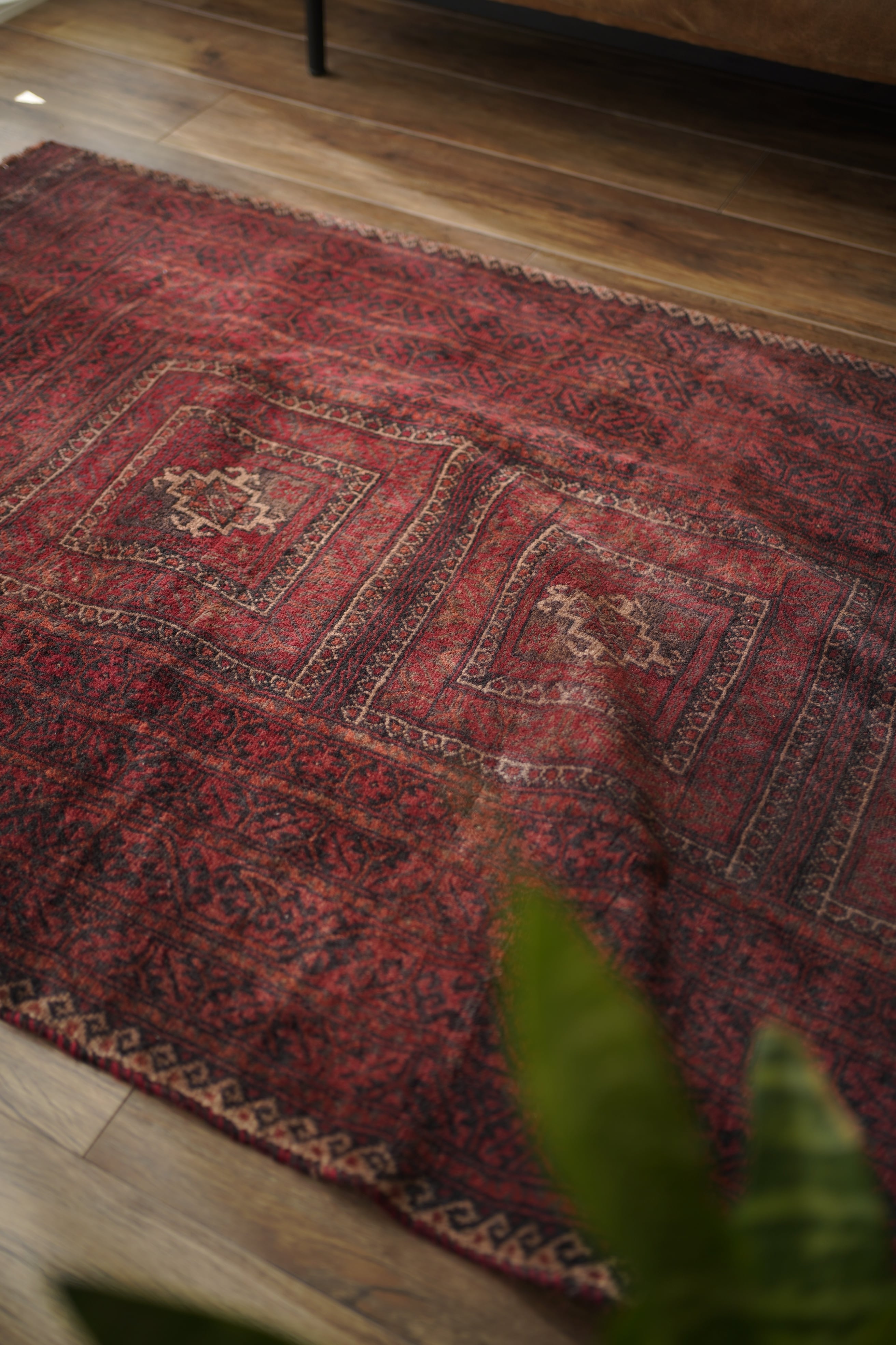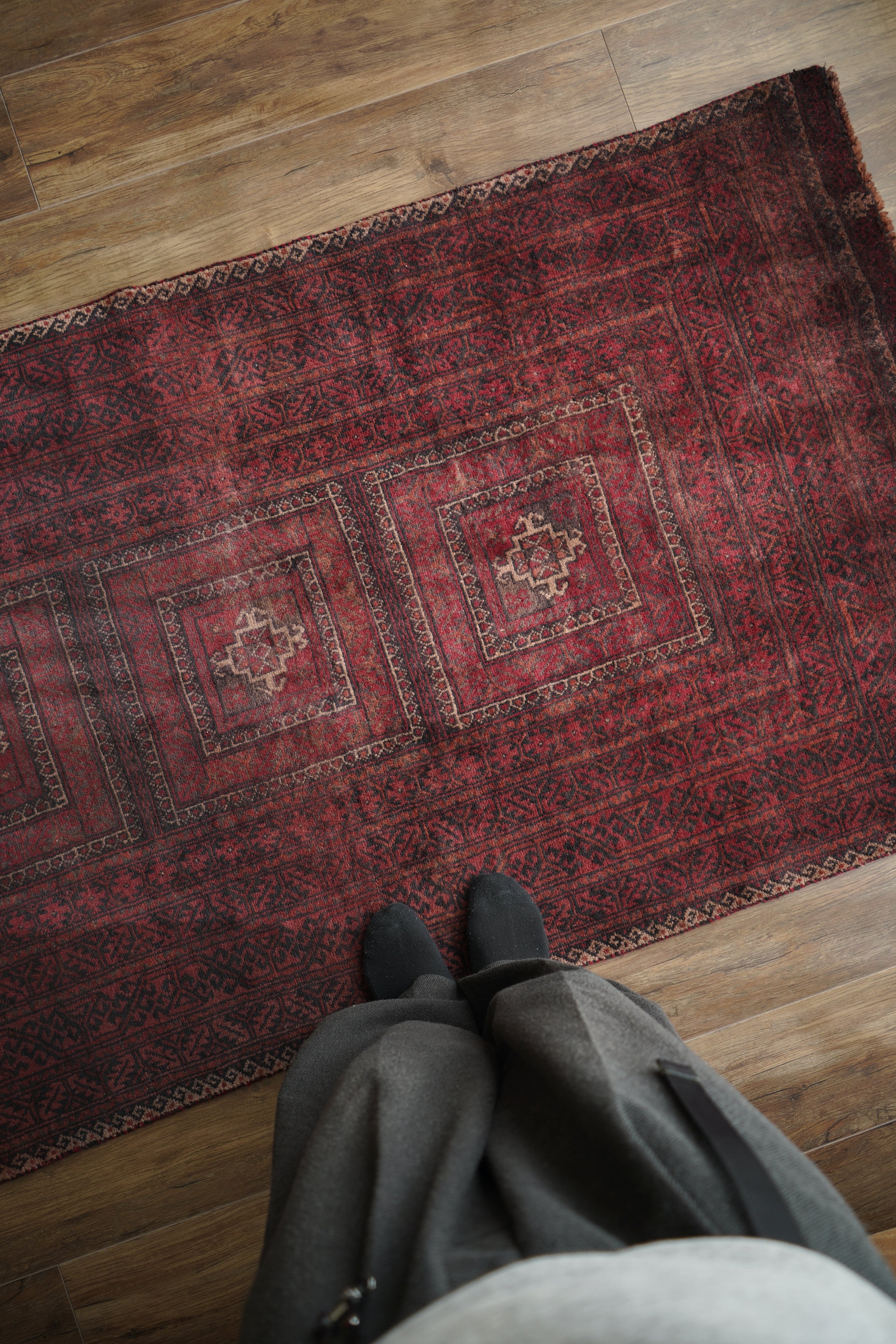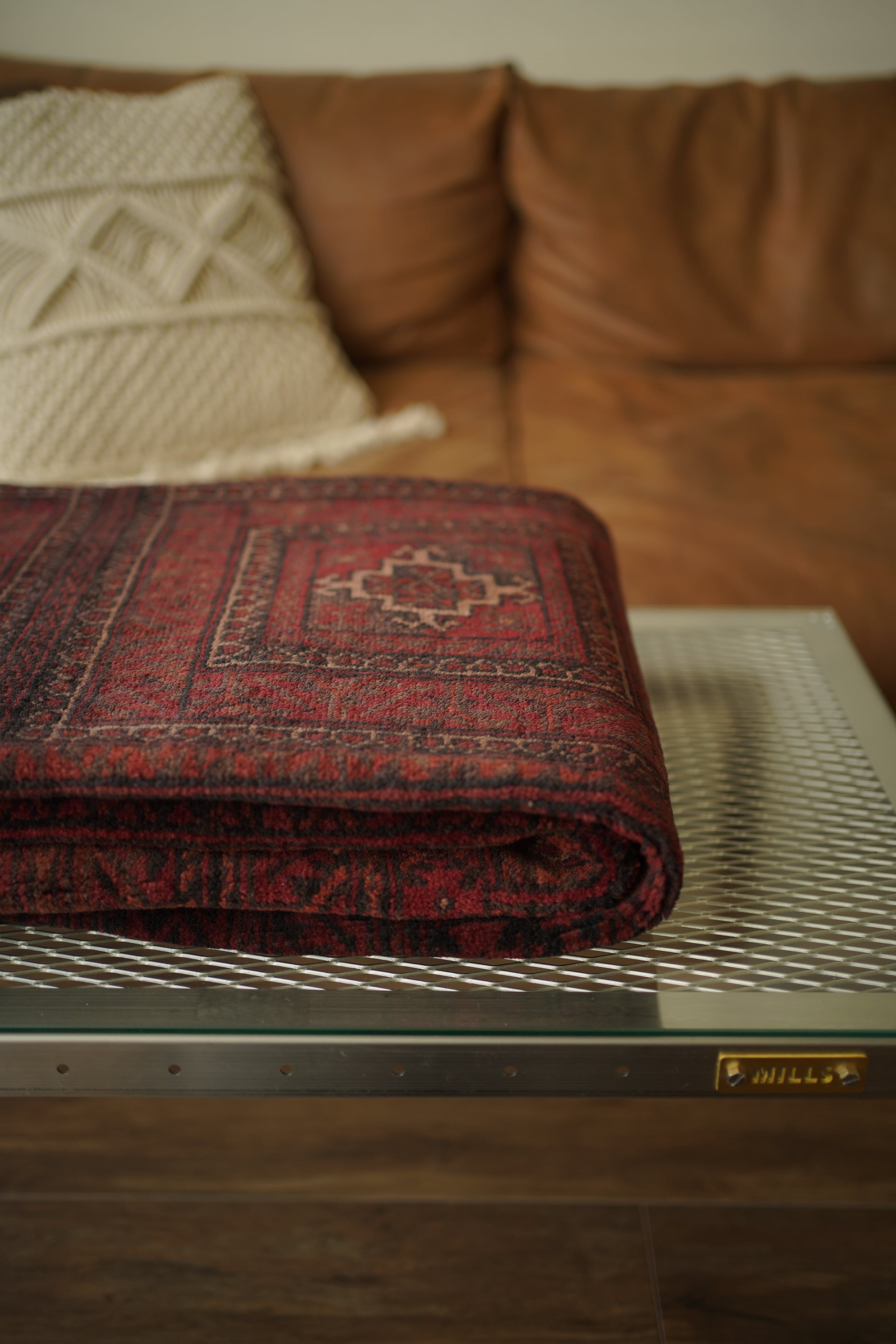 およそ50年前にアフガニスタンのバルーチ族によって手織りされたヴィンテージラグです。深みのあるえんじ色を基調に、黒や薄茶色がさりげなくあしらわれた落ち着きと奥行きを感じさせる一枚。中央には正方形のモチーフが3つ並び、全体として主張が強すぎず、空間に自然と溶け込みやすいバランスの良いデザインです。経年による色のかすれやパイルの表情が、ヴィンテージならではの味わいを引き立てており、光の当たり方や毛並みの向きによって表情がさりげなく変化するのも魅力のひとつです。厚みは約7mm程度。表面はふわりと柔らかい心地よい肌触り。通年で快適にご利用いただける質感です。目立ったダメージや補修跡も見受けられず、良好なコンディションを保っています。赤系でありながら派手さを抑えた渋みのある色合いは、木製家具や落ち着いたトーンのインテリアとも相性が良いかと思います。主張しすぎない赤系ラグをお探しの方におすすめの一枚です。