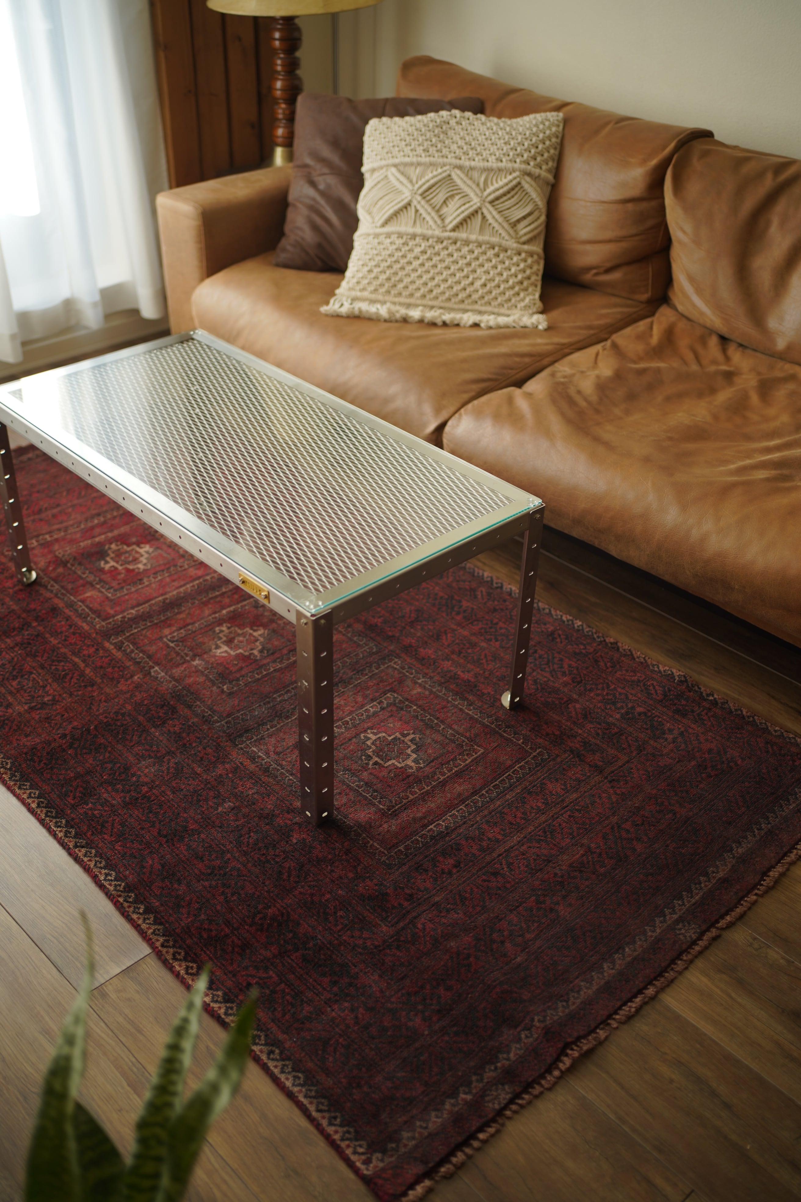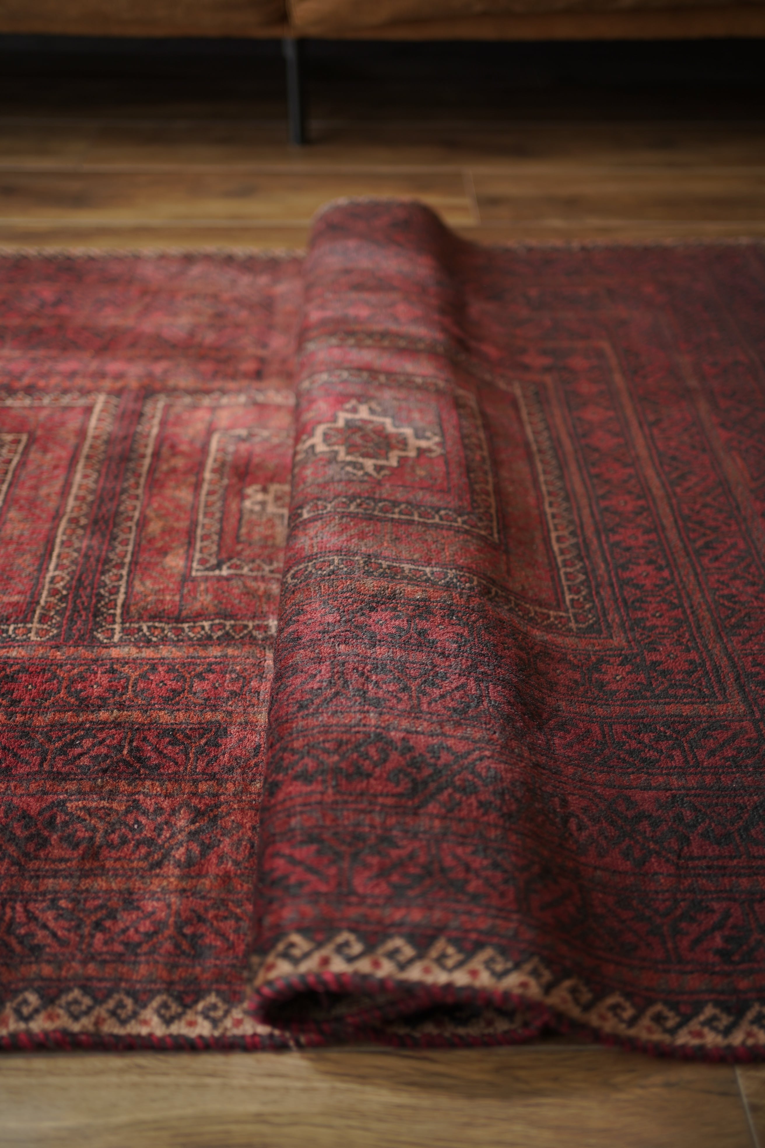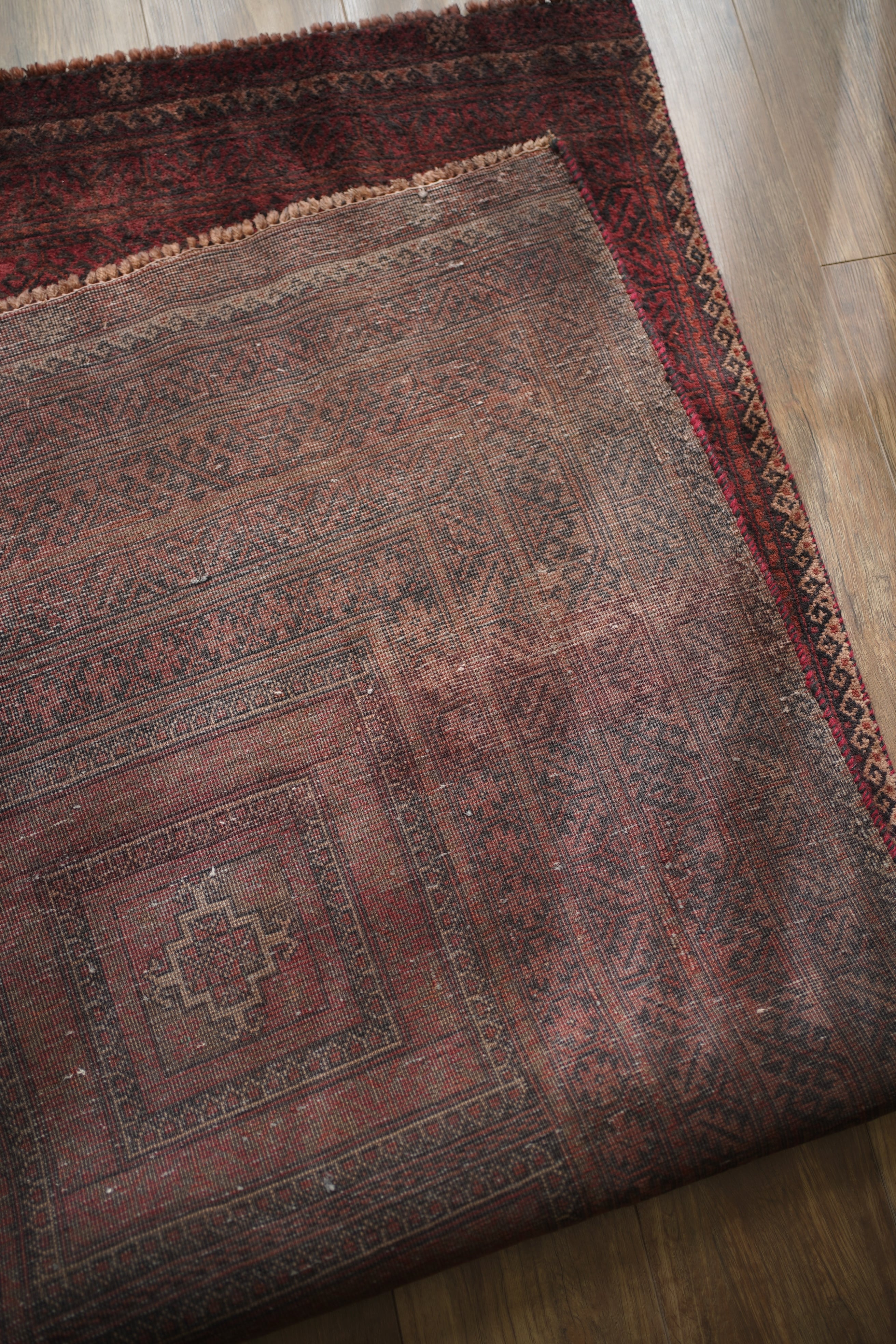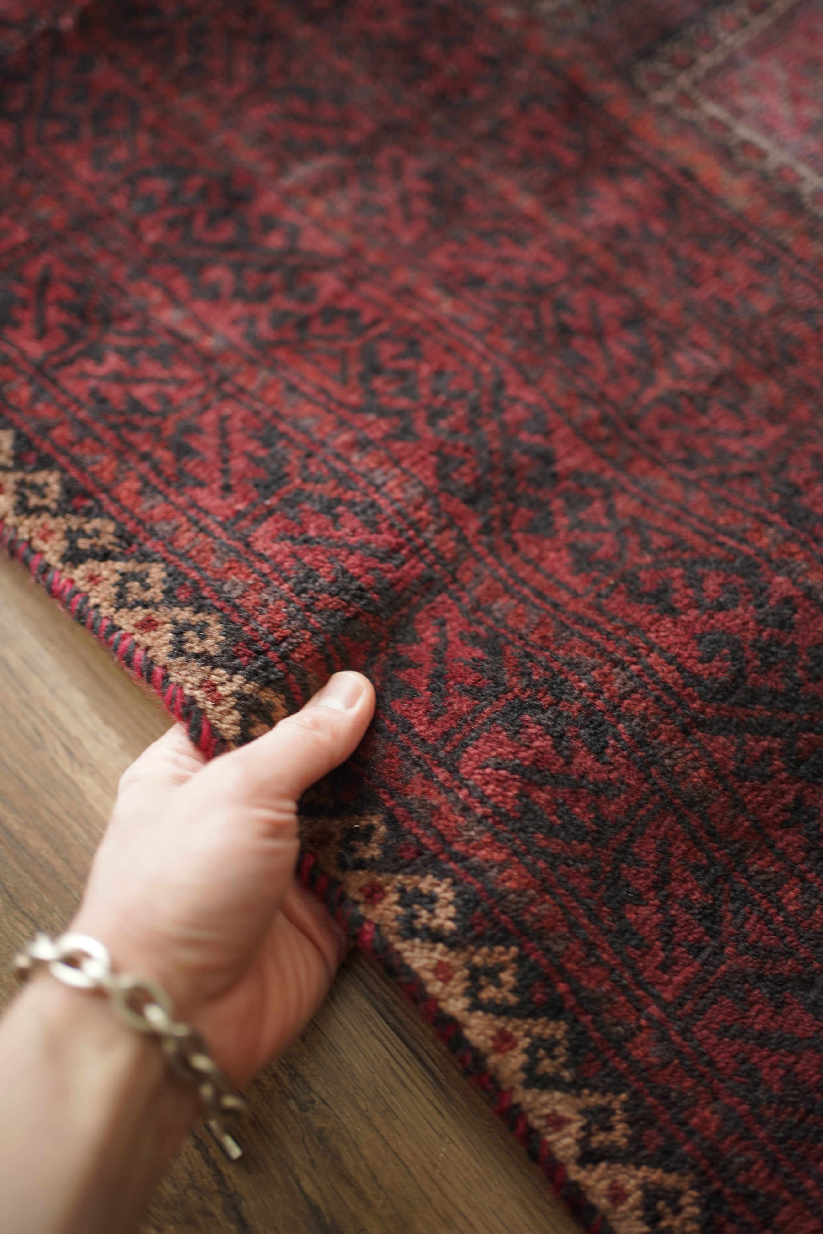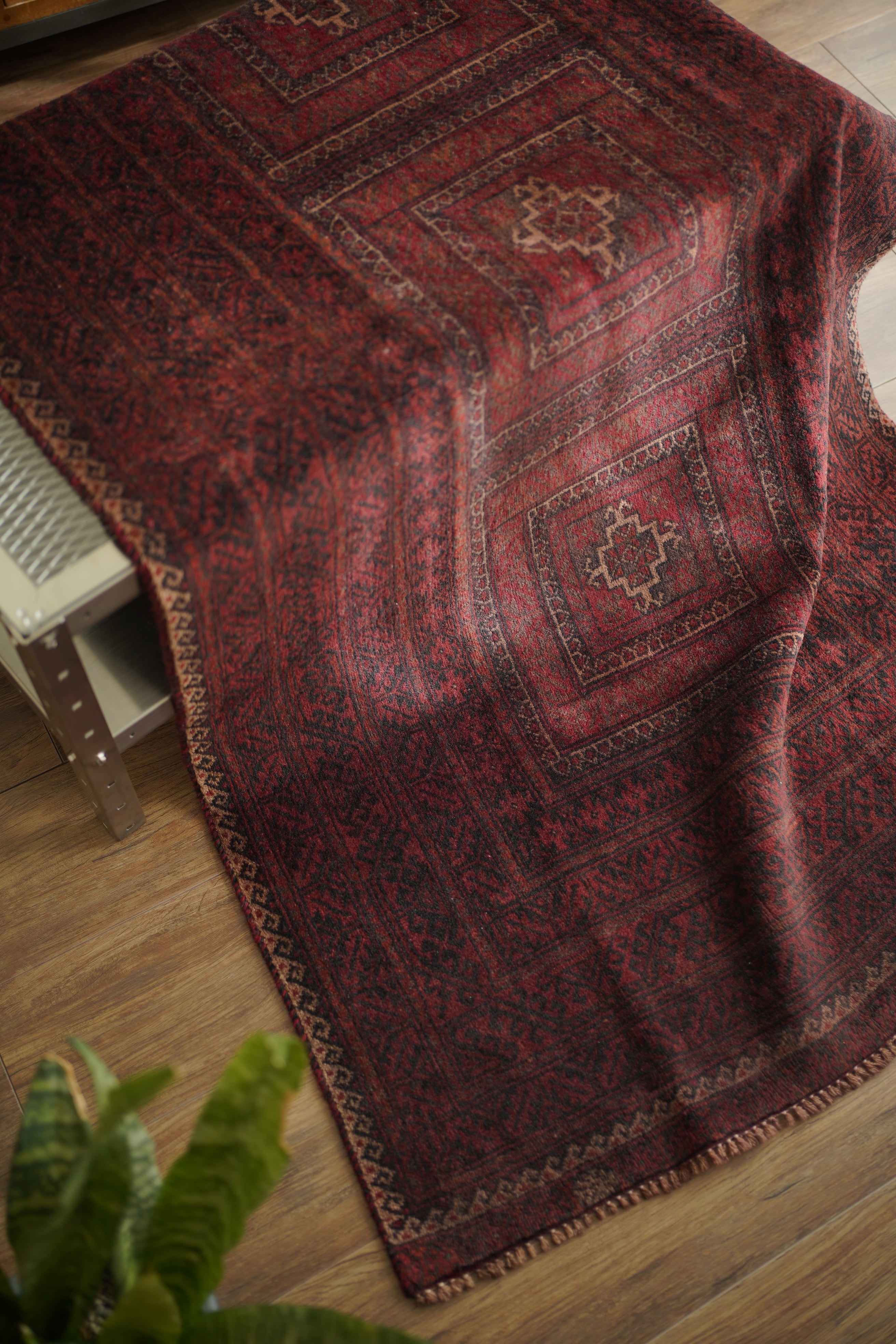 およそ50年前にアフガニスタンのバルーチ族によって手織りされたヴィンテージラグです。深みのあるえんじ色を基調に、黒や薄茶色がさりげなくあしらわれた落ち着きと奥行きを感じさせる一枚。中央には正方形のモチーフが3つ並び、全体として主張が強すぎず、空間に自然と溶け込みやすいバランスの良いデザインです。経年による色のかすれやパイルの表情が、ヴィンテージならではの味わいを引き立てており、光の当たり方や毛並みの向きによって表情がさりげなく変化するのも魅力のひとつです。厚みは約7mm程度。表面はふわりと柔らかい心地よい肌触り。通年で快適にご利用いただける質感です。目立ったダメージや補修跡も見受けられず、良好なコンディションを保っています。赤系でありながら派手さを抑えた渋みのある色合いは、木製家具や落ち着いたトーンのインテリアとも相性が良いかと思います。主張しすぎない赤系ラグをお探しの方におすすめの一枚です。