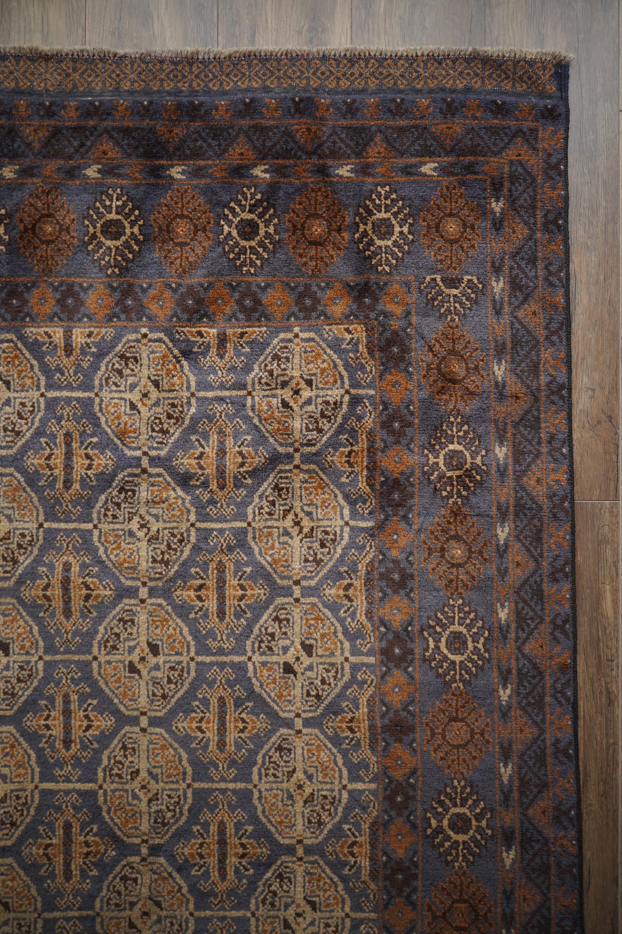 トルクメンデザインを踏襲しており、整然と並ぶ小さなギュル紋様と、外周に配された花紋や幾何学モチーフのボーダーとのバランスが非常に美しいです。フリンジ部分のキリムエンドの作りもポイント。