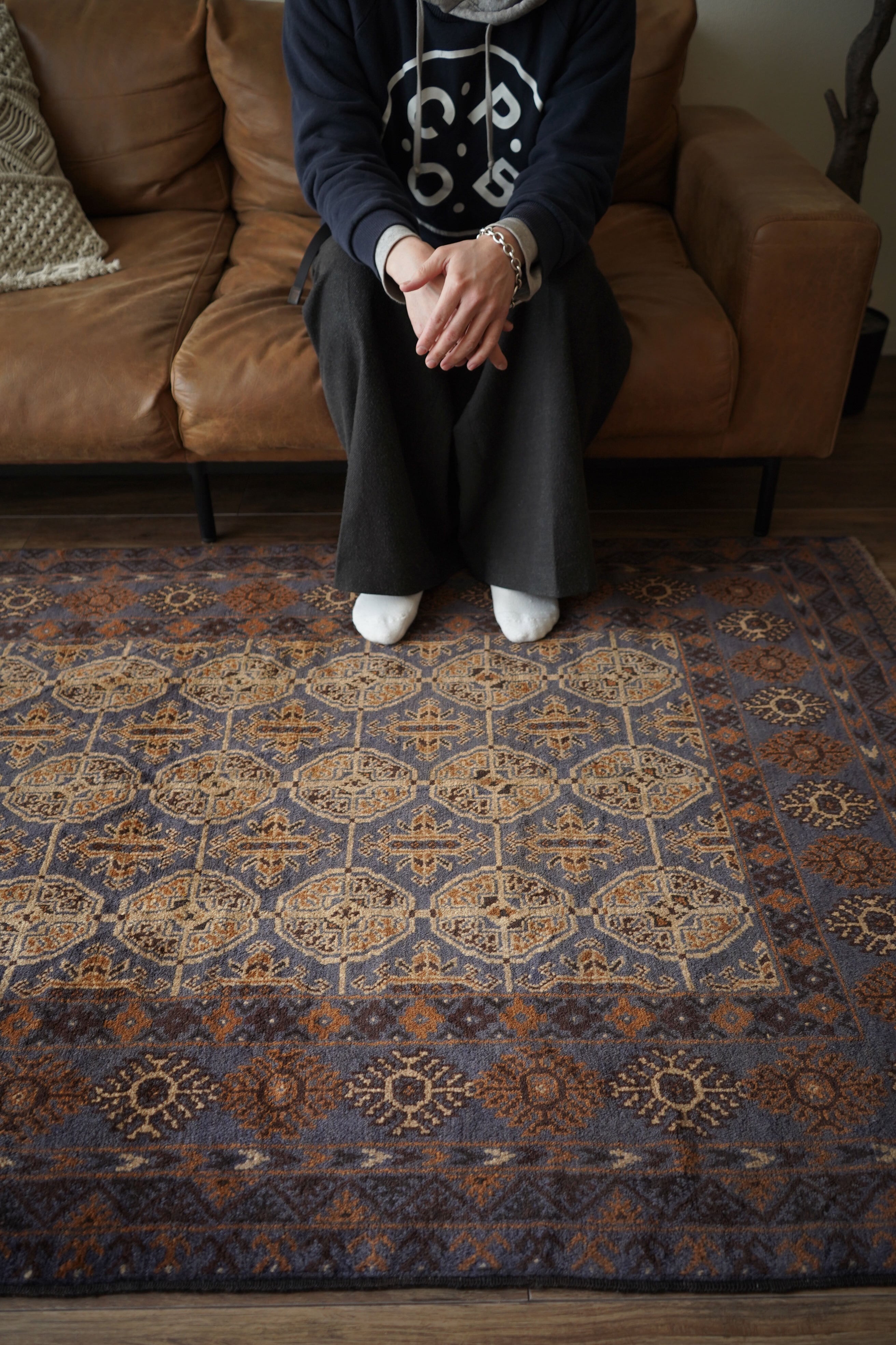 ほんのり青みを帯びたグレーカラーをベースに、キャメルやブラウンが織り交ぜられた落ち着いた配色。