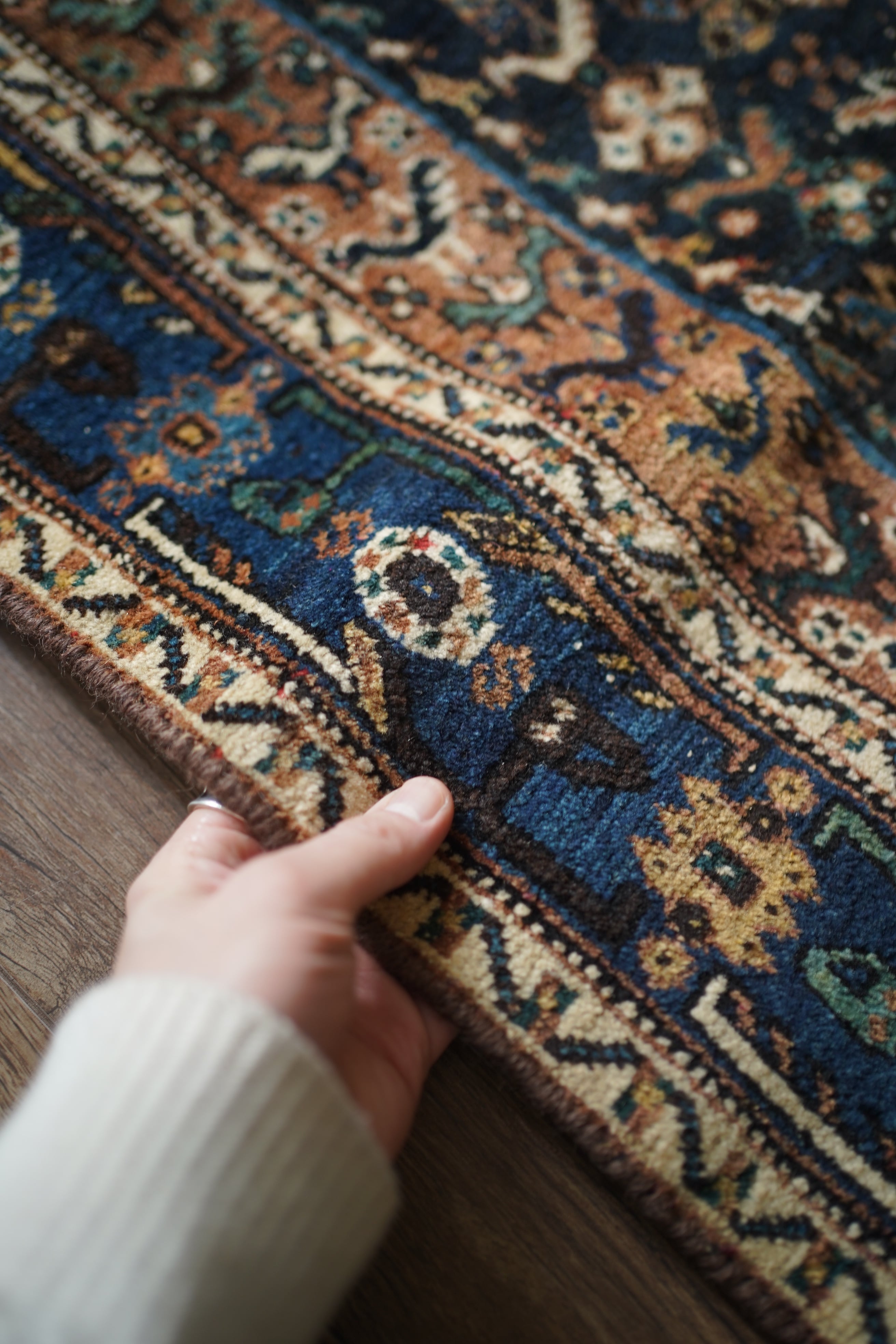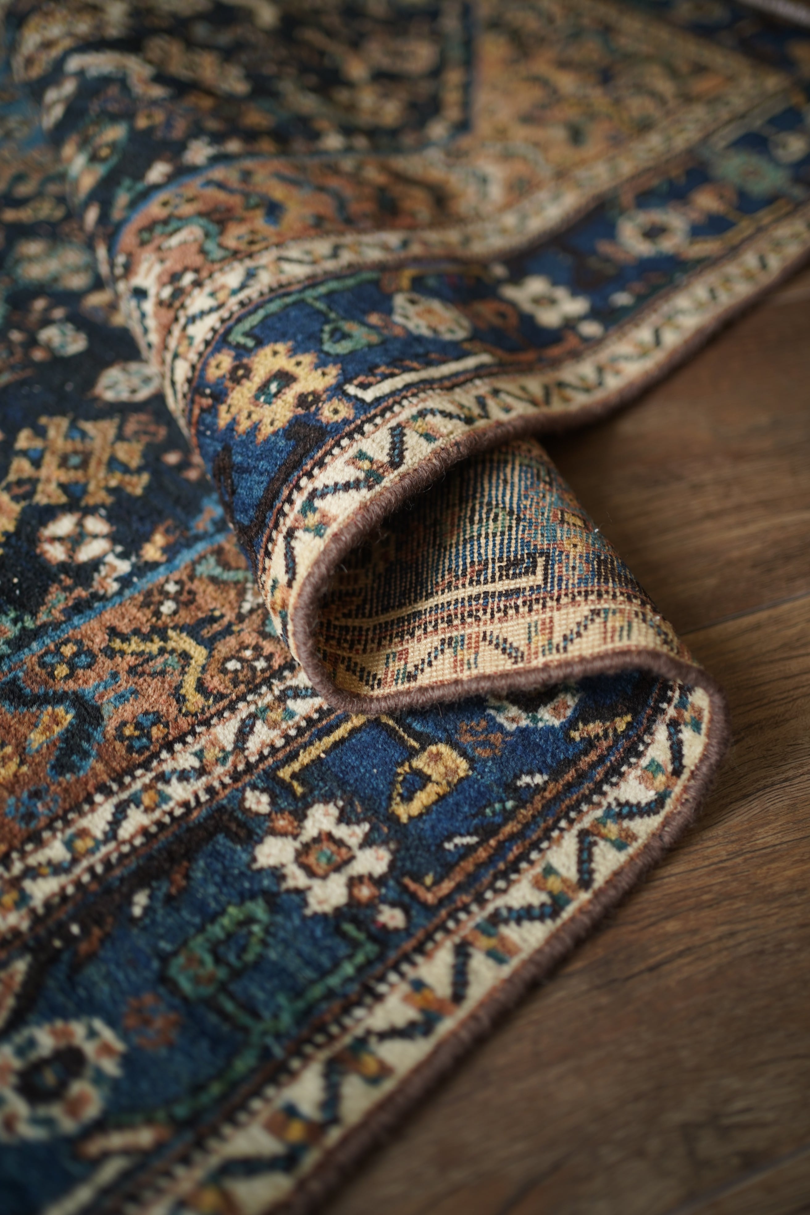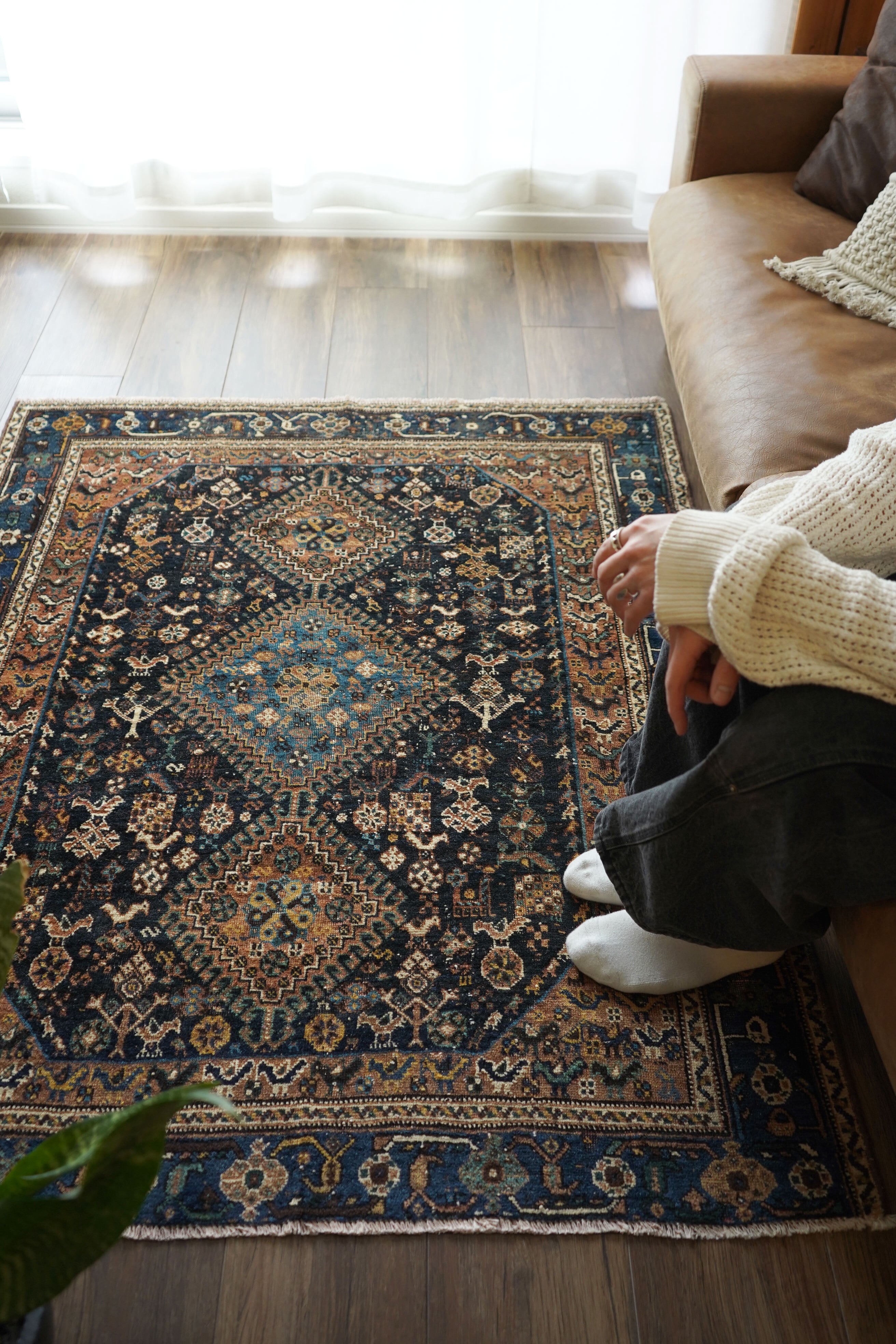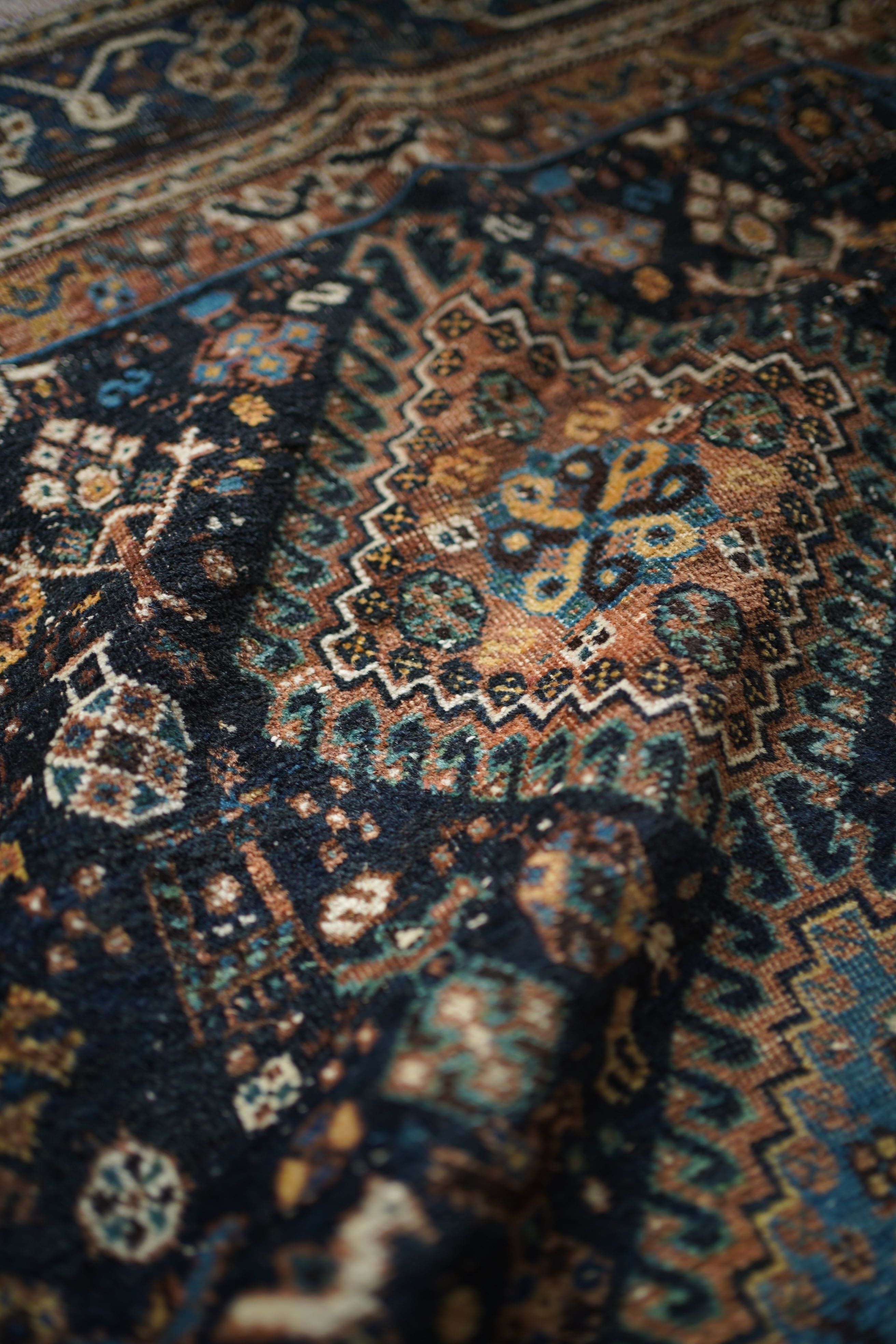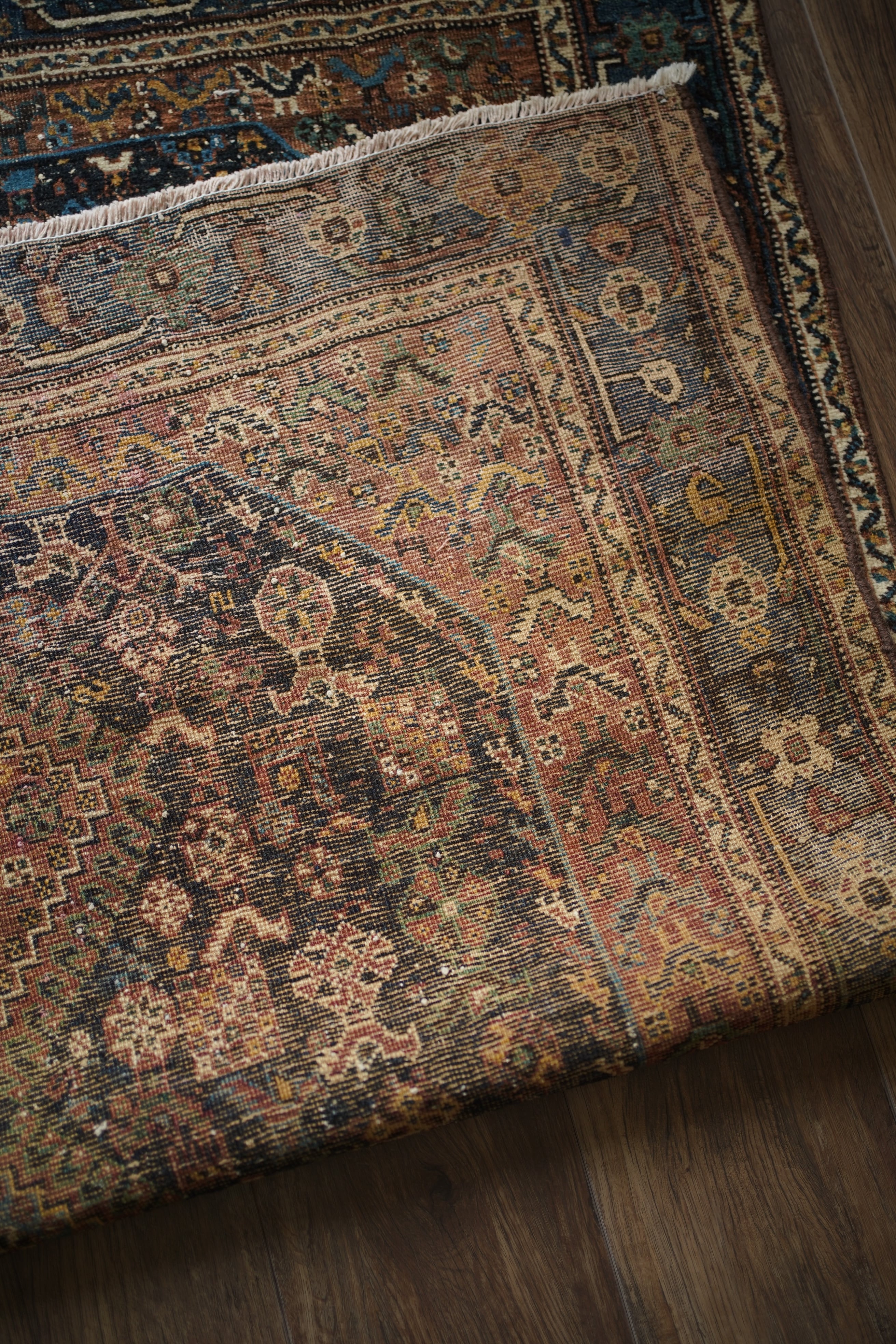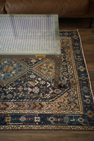 経年による摩擦でパイルが薄くなっている部分、職人の技術で見てもわからないほどに綺麗に補修された部分などもございますが、それもまた100年という歳月を物語る味わいとして、このラグならではの大きな魅力となっています。使い込まれたことで生まれた、渋く奥行きのある風合いをお楽しみいただけます。