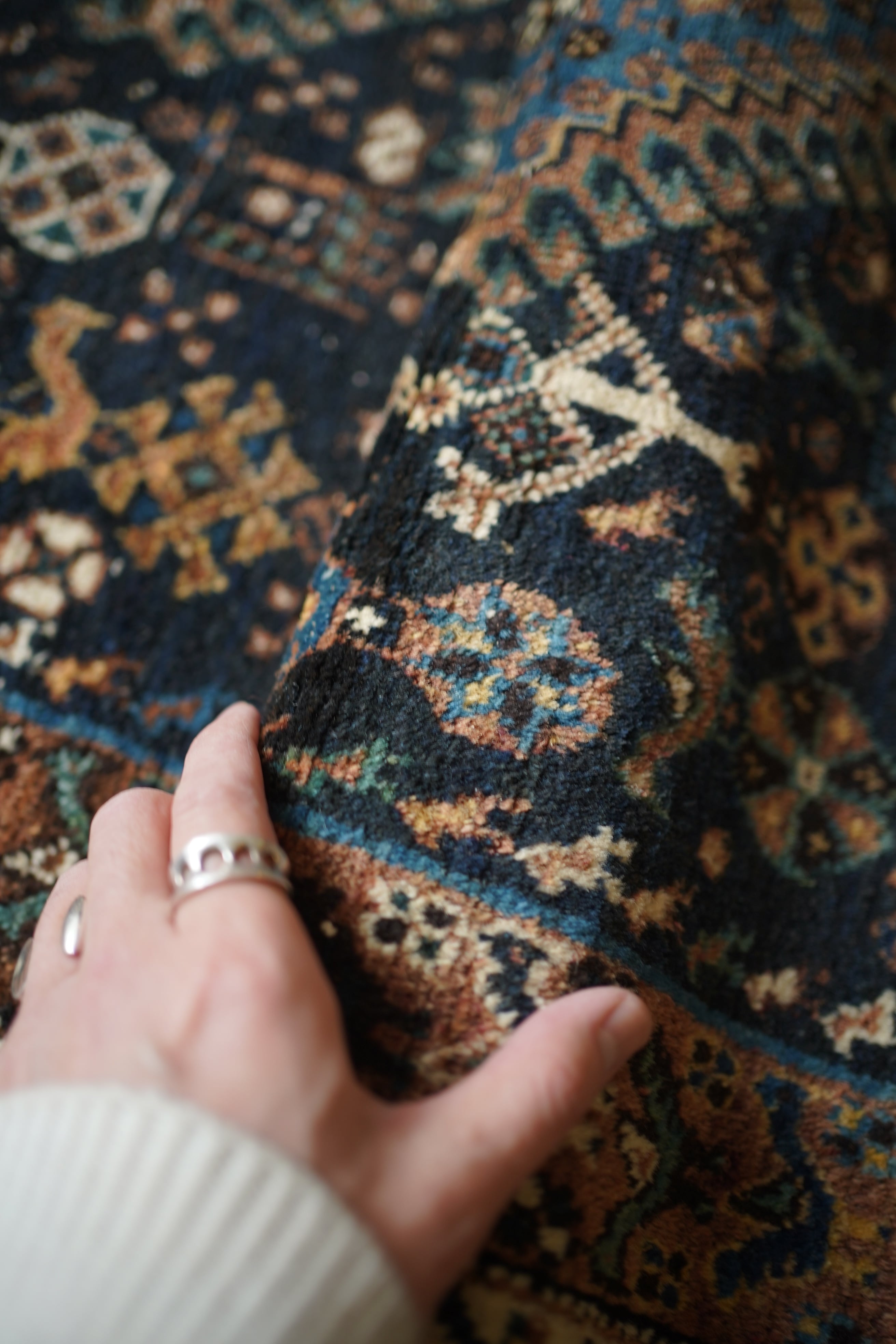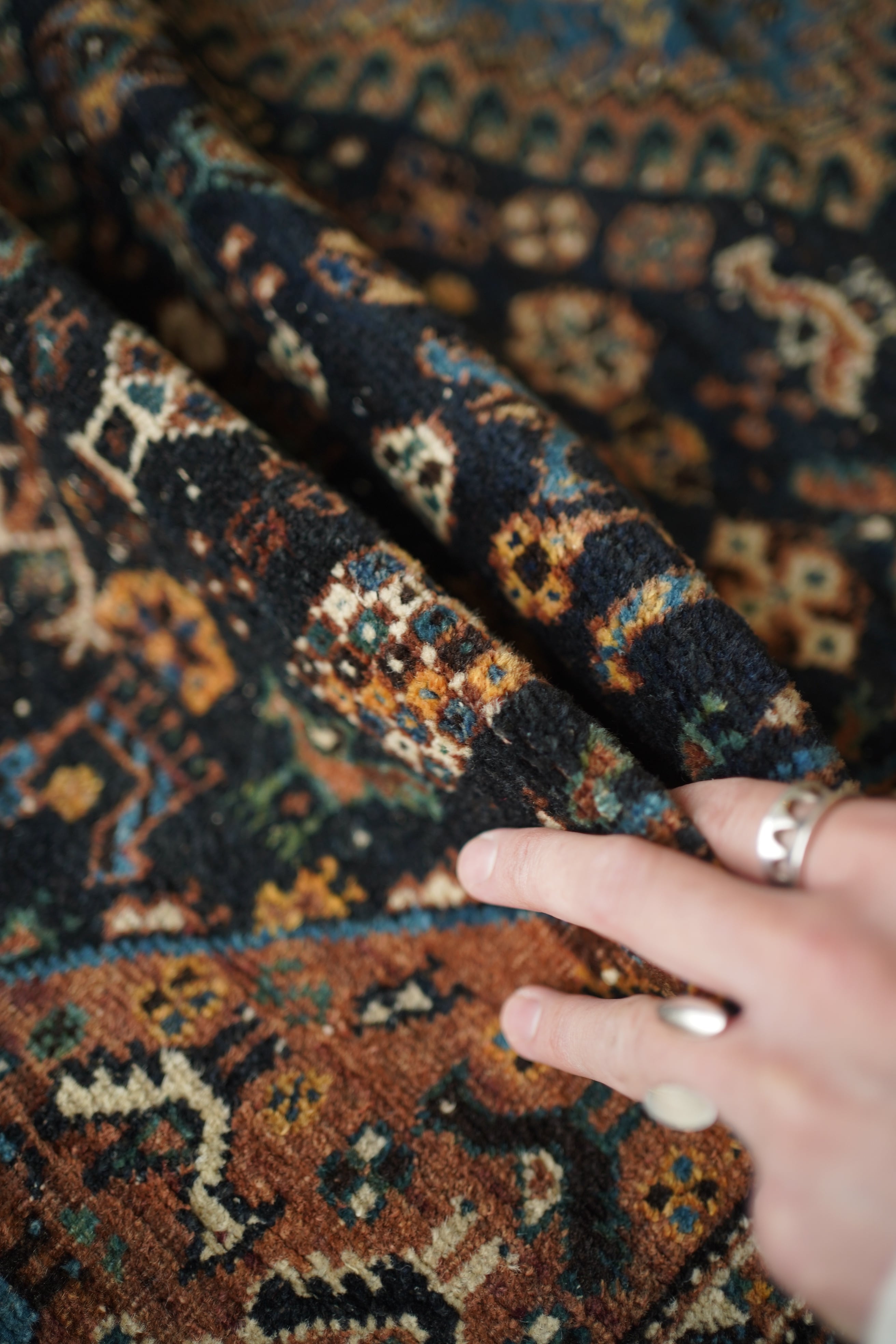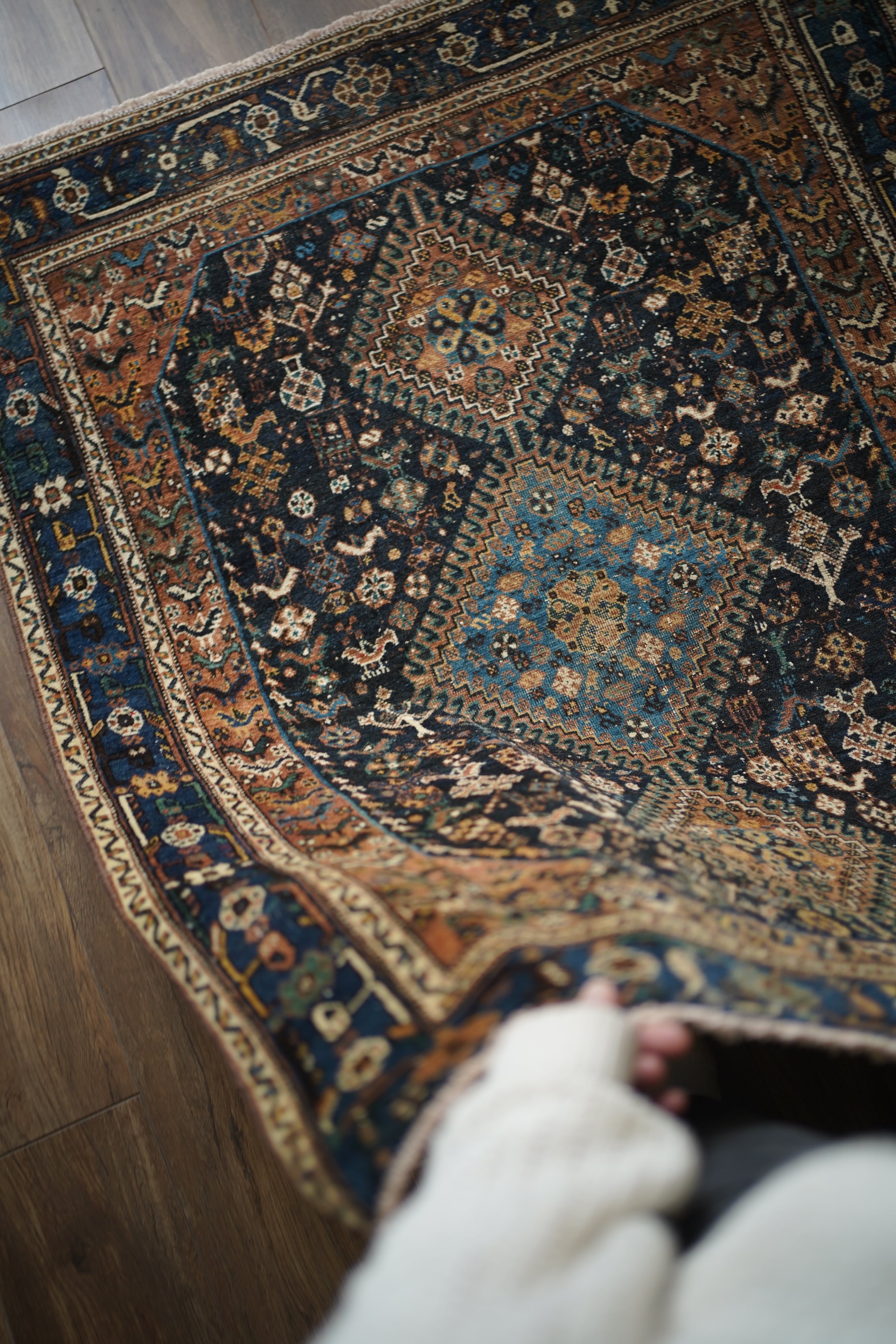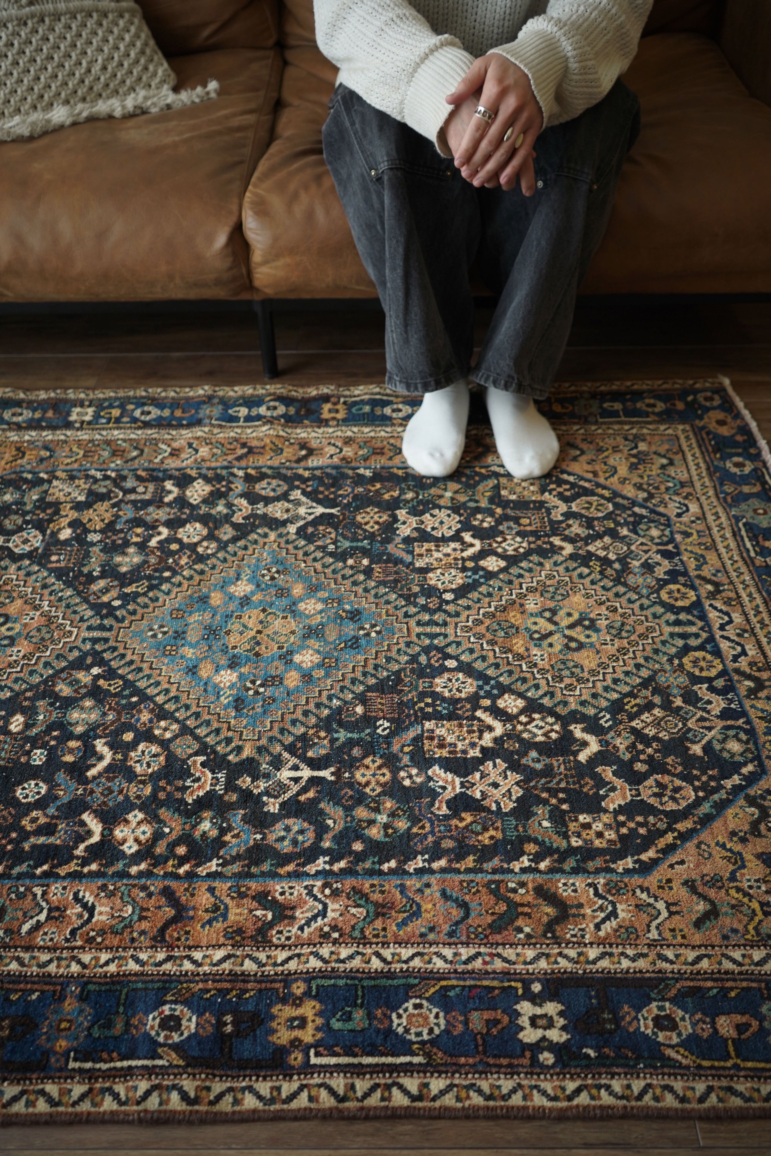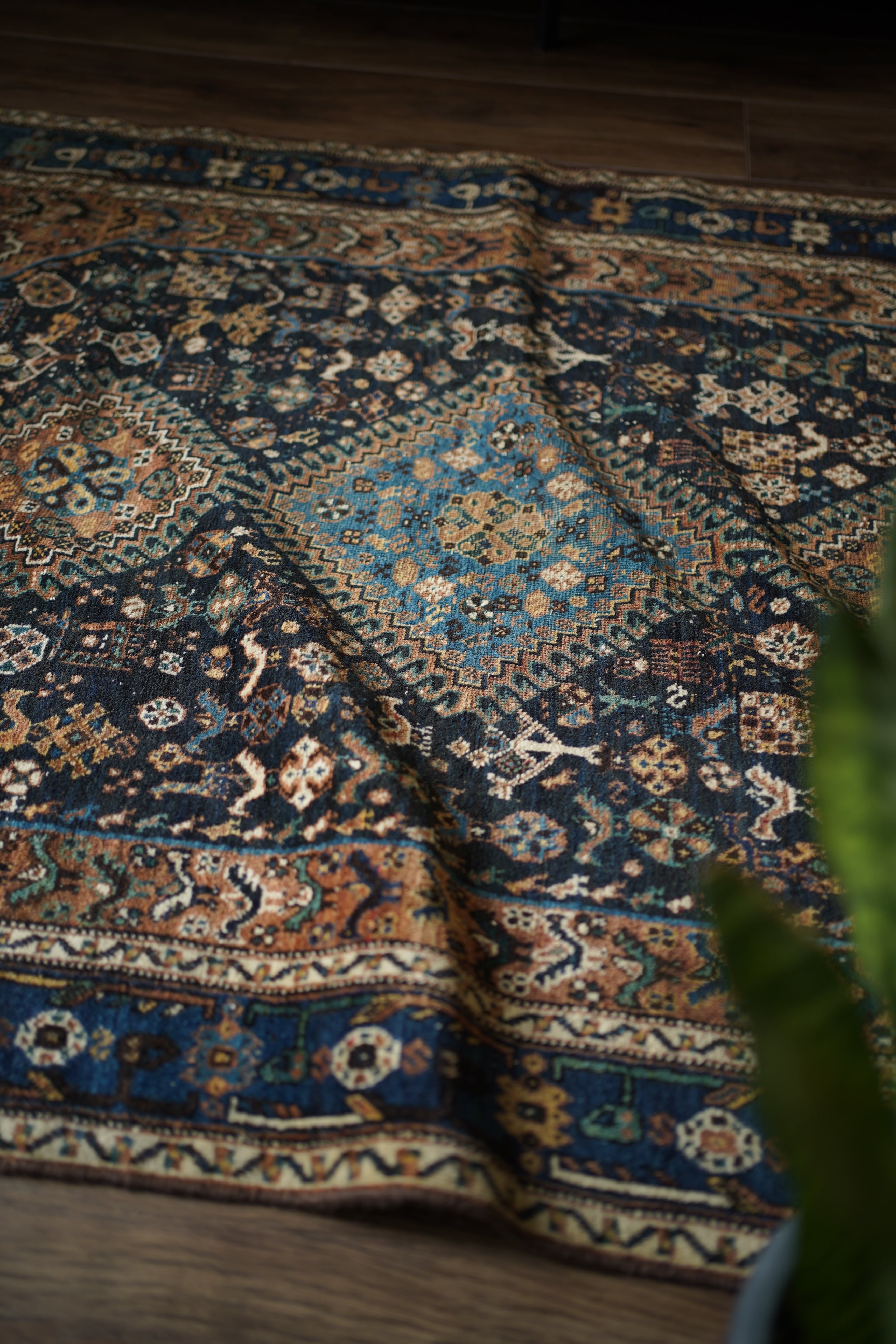 経年による摩擦でパイルが薄くなっている部分、職人の技術で見てもわからないほどに綺麗に補修された部分などもございますが、それもまた100年という歳月を物語る味わいとして、このラグならではの大きな魅力となっています。使い込まれたことで生まれた、渋く奥行きのある風合いをお楽しみいただけます。