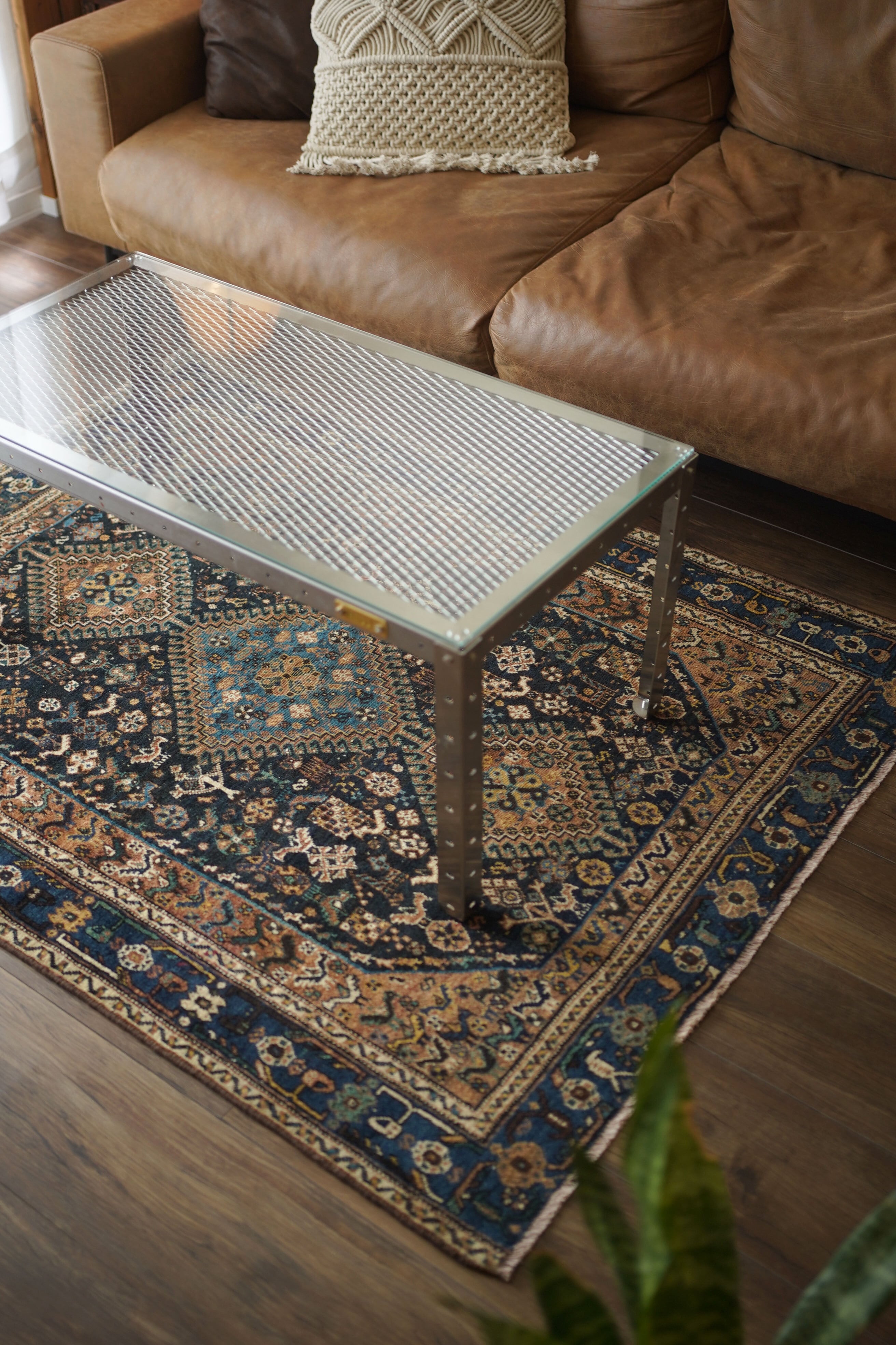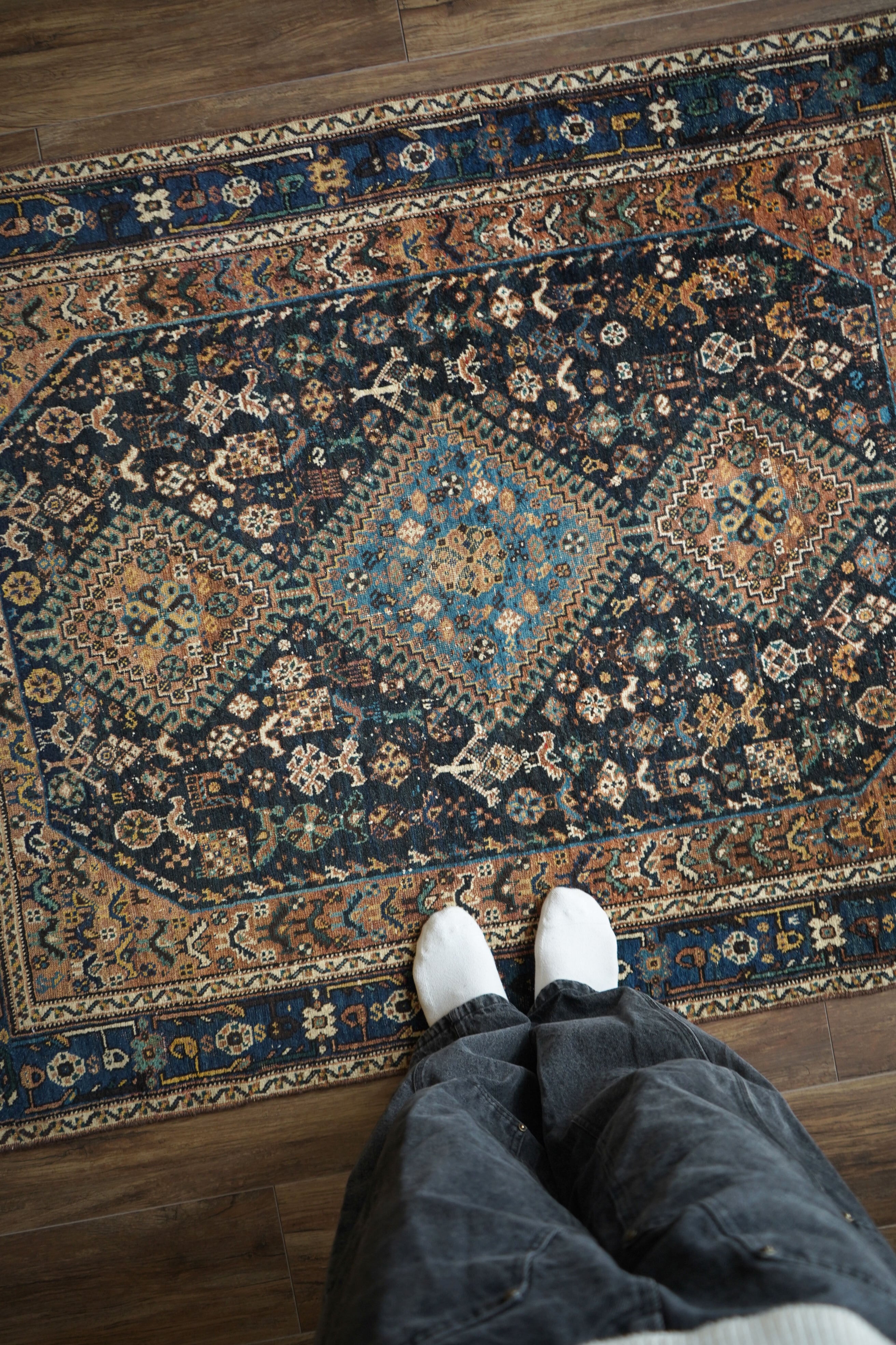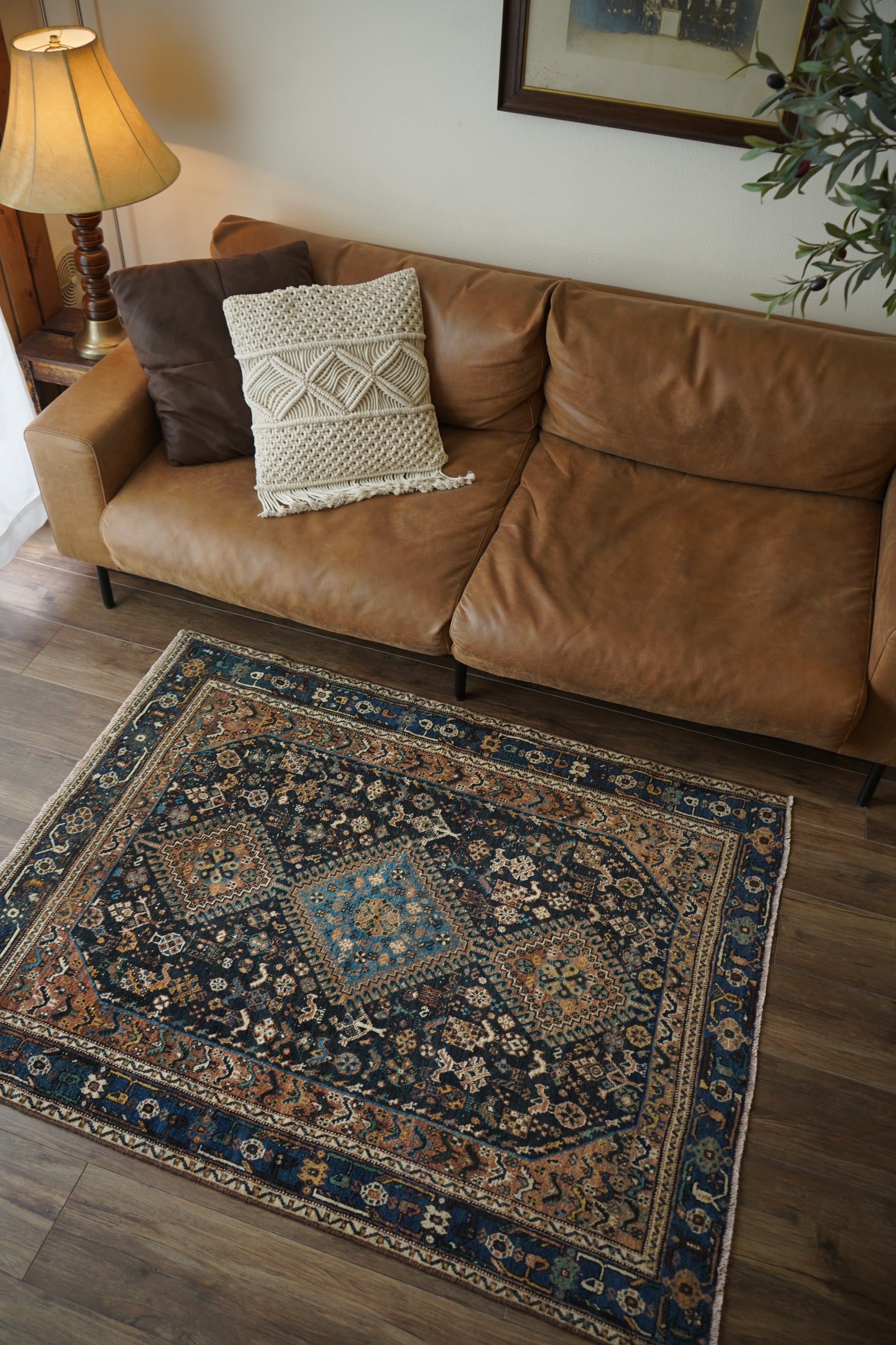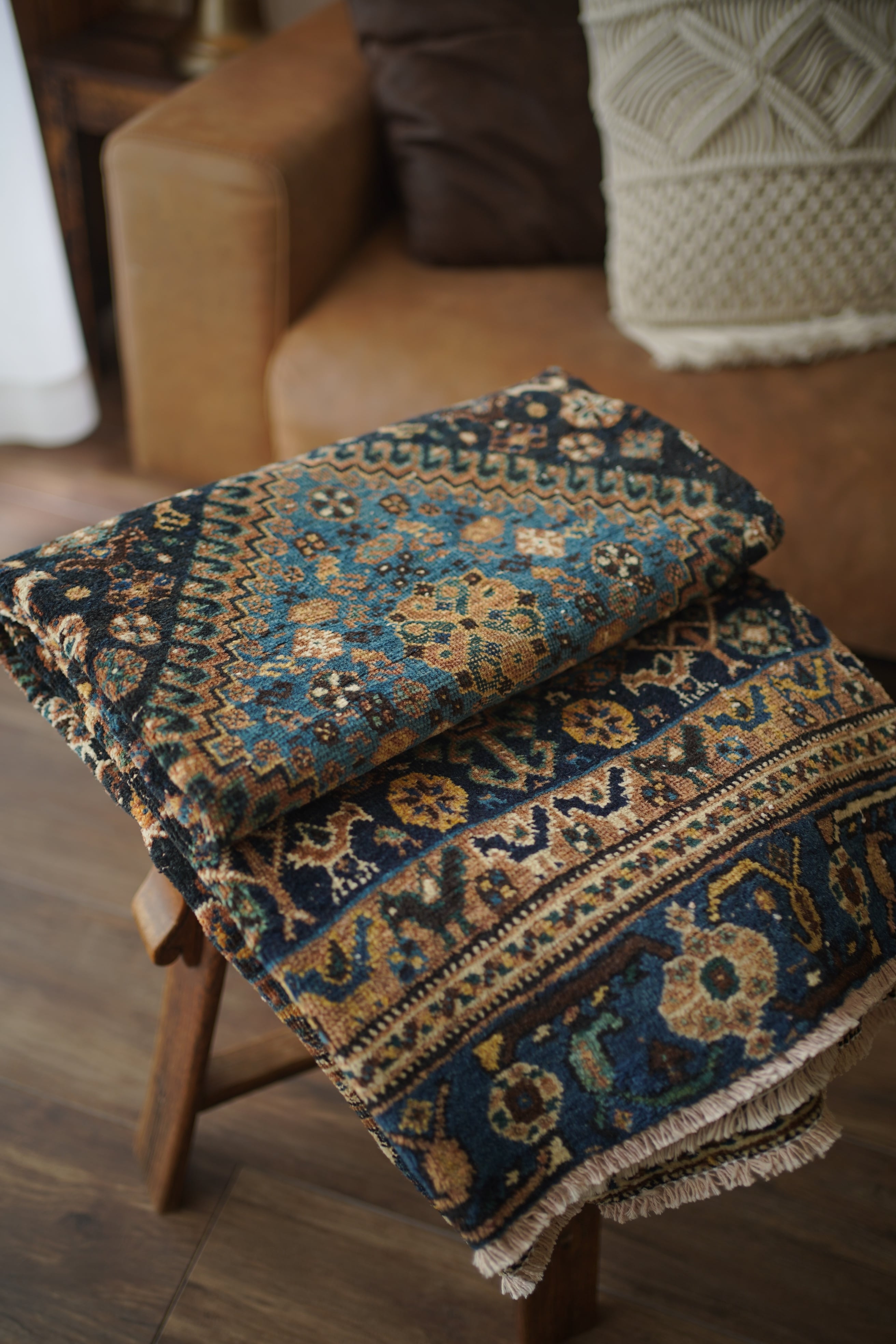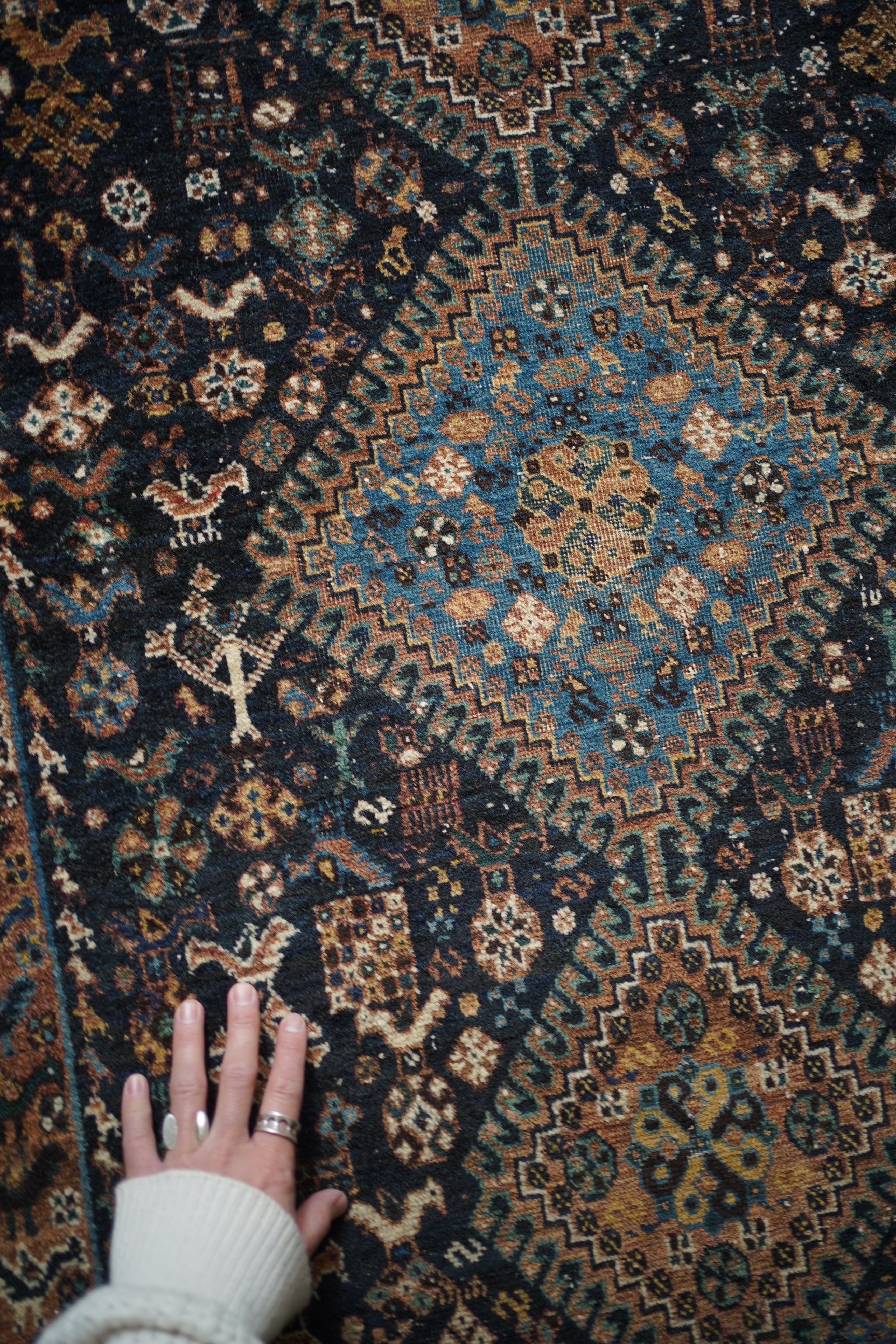 経年による摩擦でパイルが薄くなっている部分、職人の技術で見てもわからないほどに綺麗に補修された部分などもございますが、それもまた100年という歳月を物語る味わいとして、このラグならではの大きな魅力となっています。使い込まれたことで生まれた、渋く奥行きのある風合いをお楽しみいただけます。