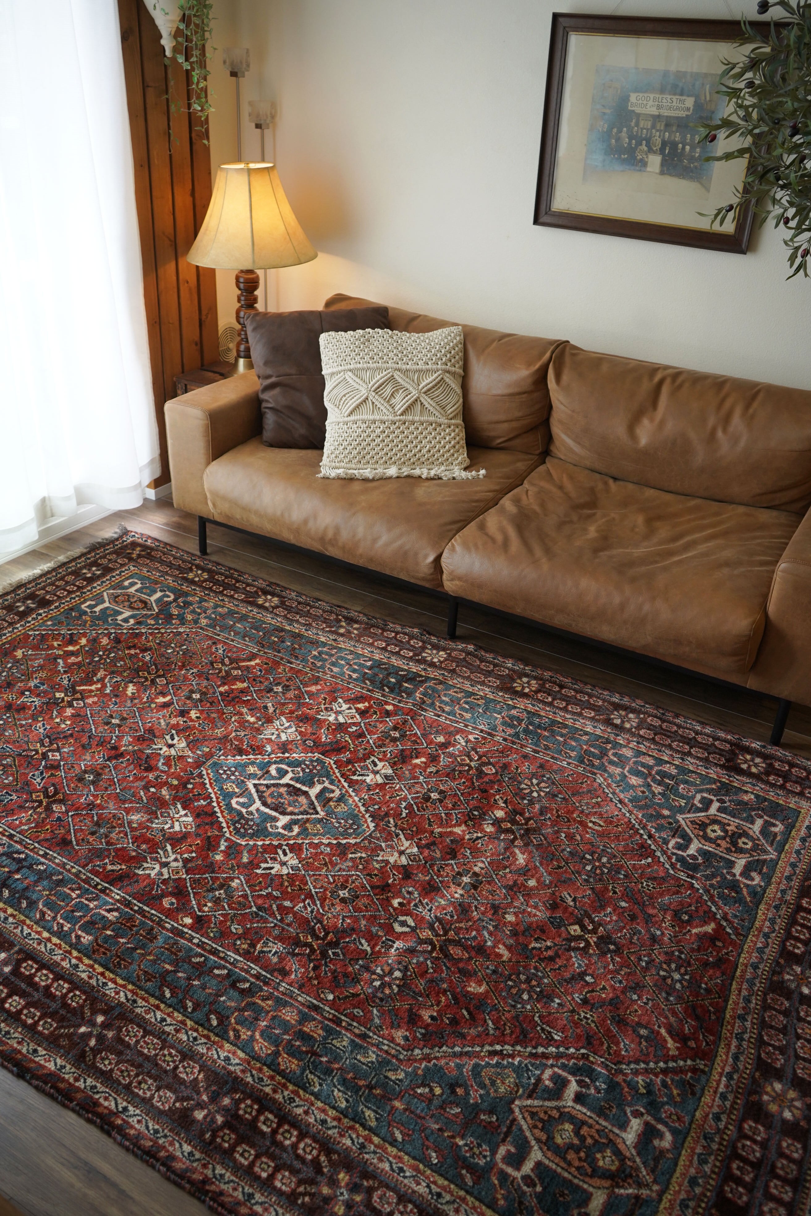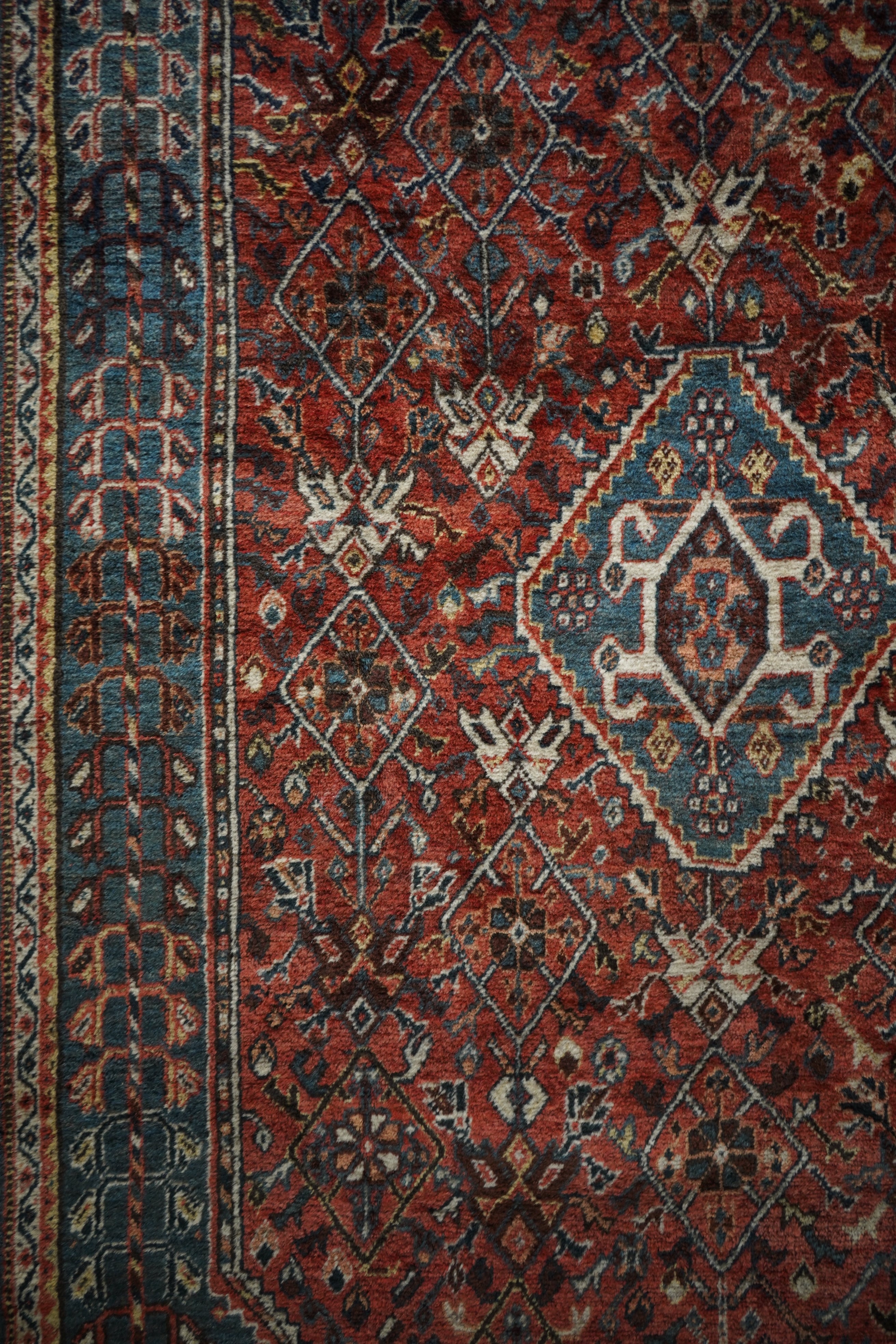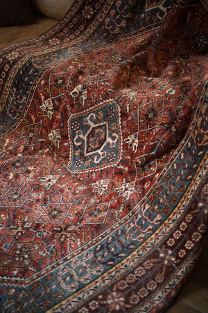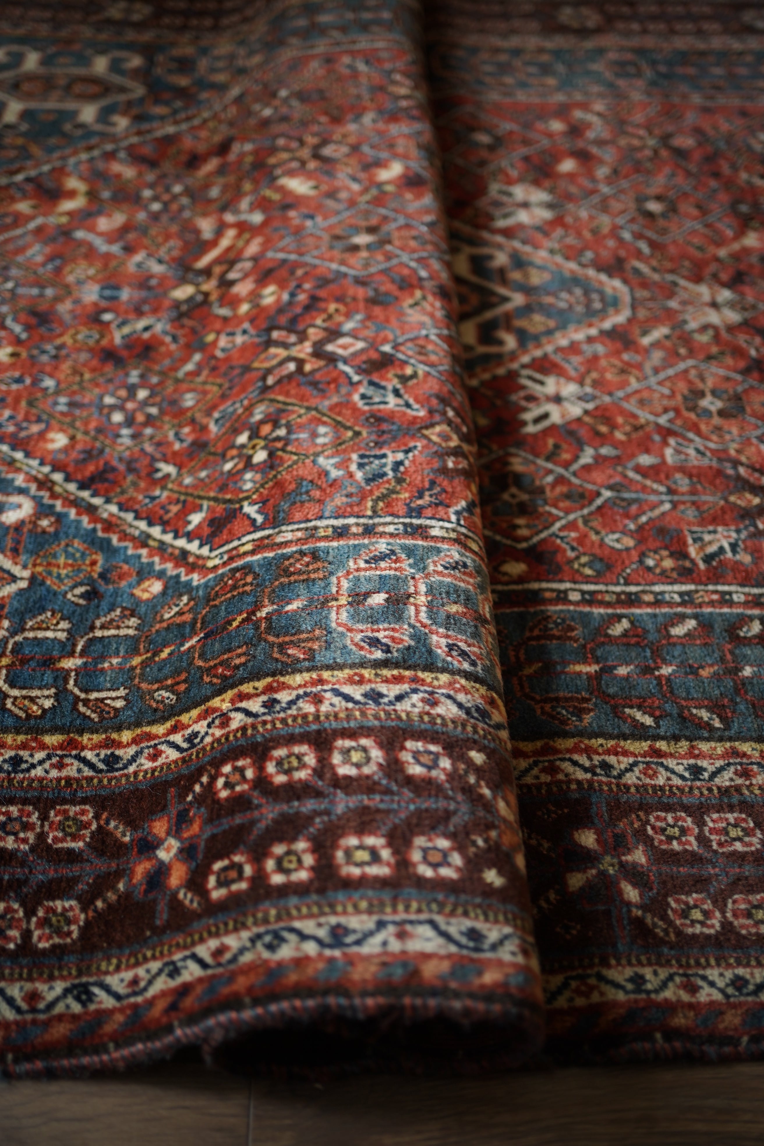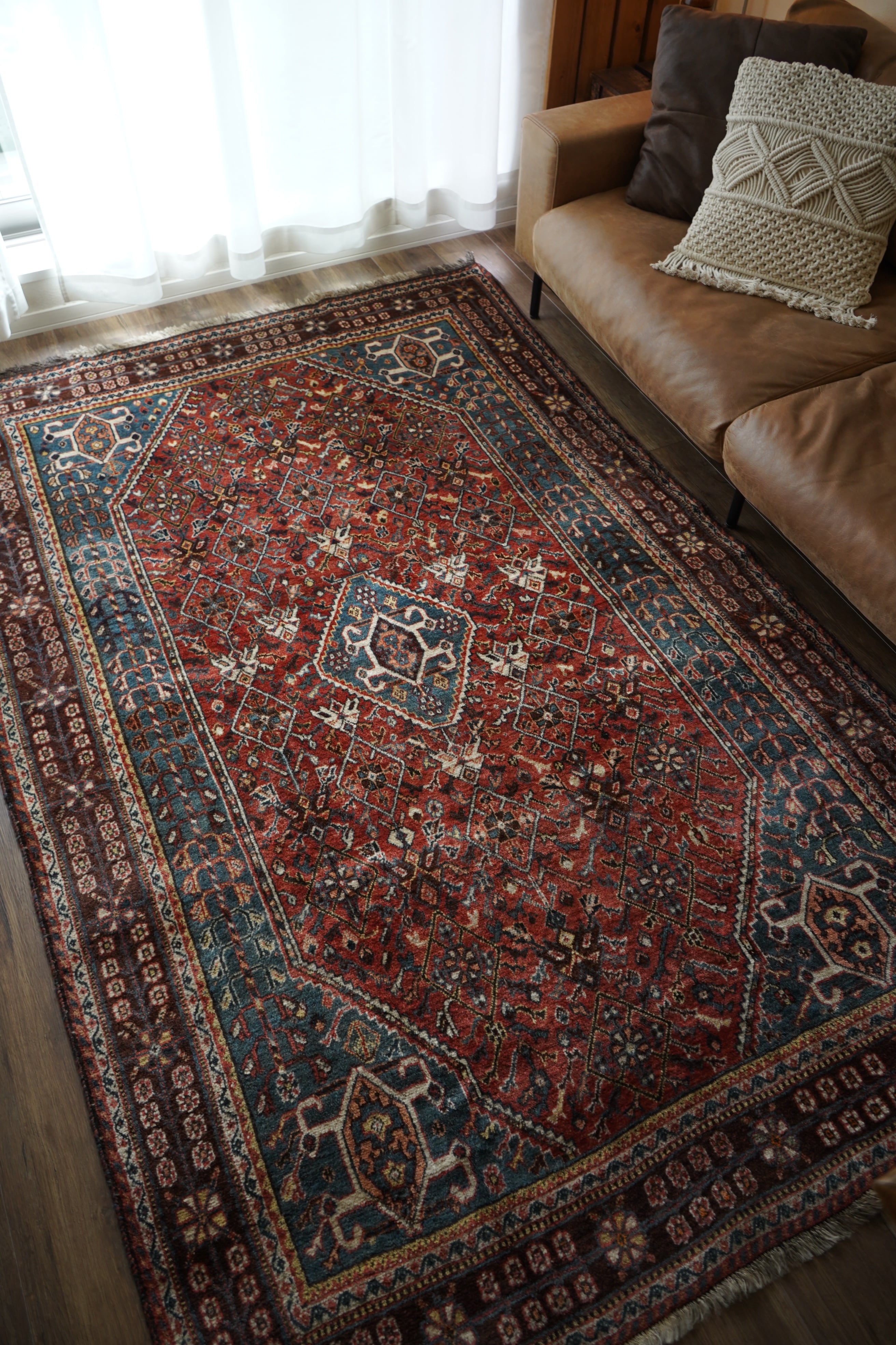 中央とコーナーに織り込まれたカシュガイメダリオンとフィールドに広がる繊細な部族紋様が印象的なデザインで、シンプルなデザイン構成でありながら繊細に使われた紋様が放つカッコ良さに惹かれ仕入れを決めました。