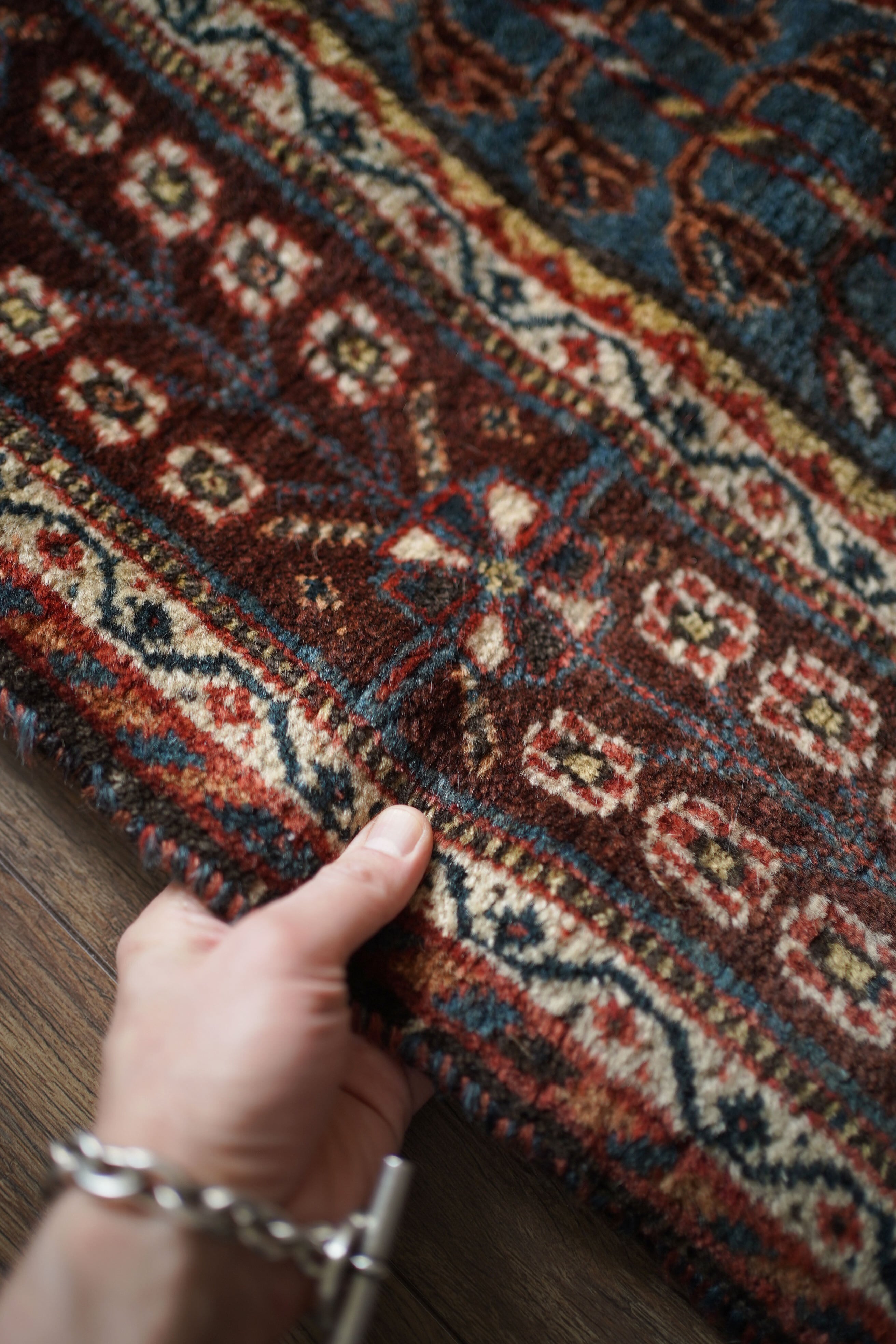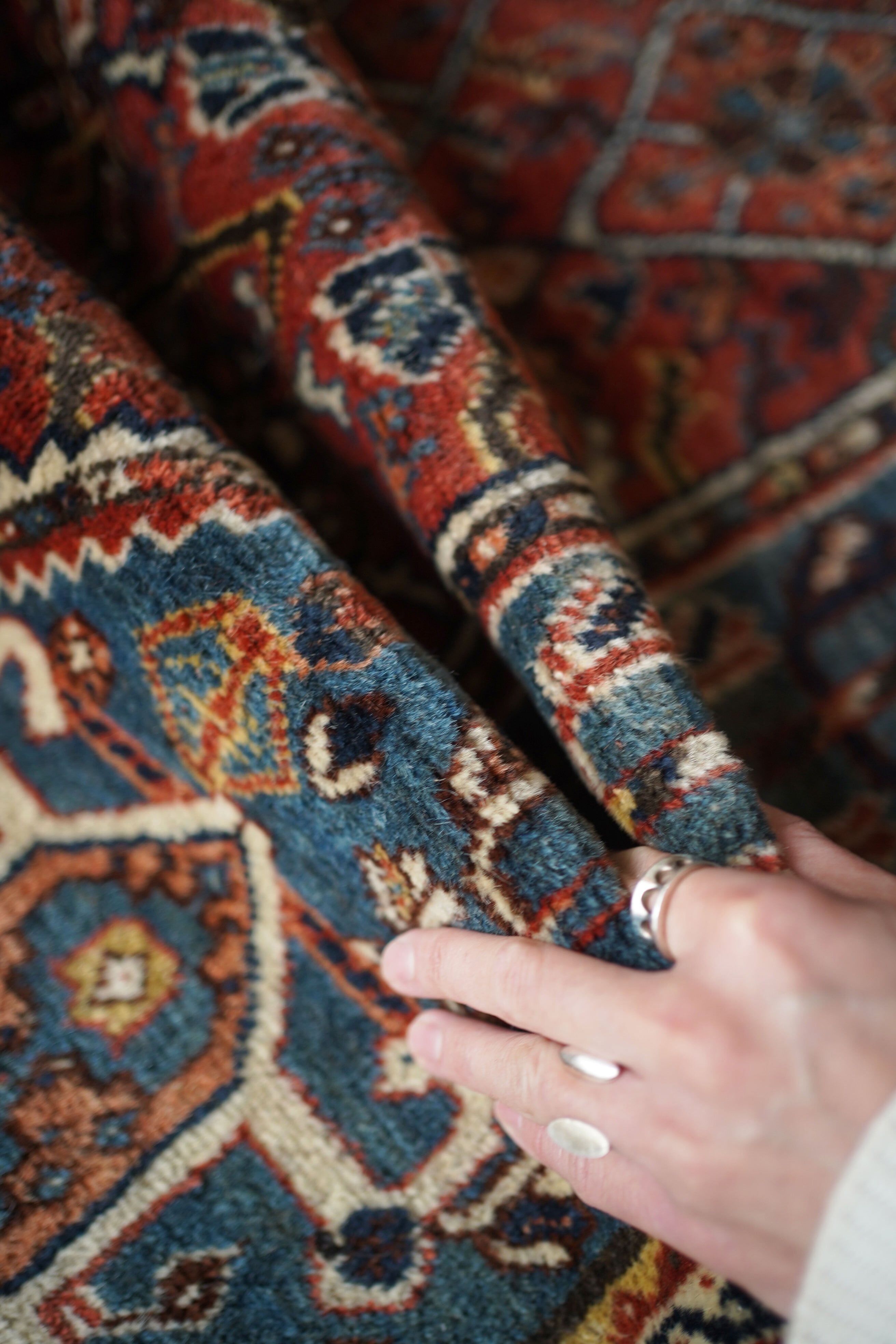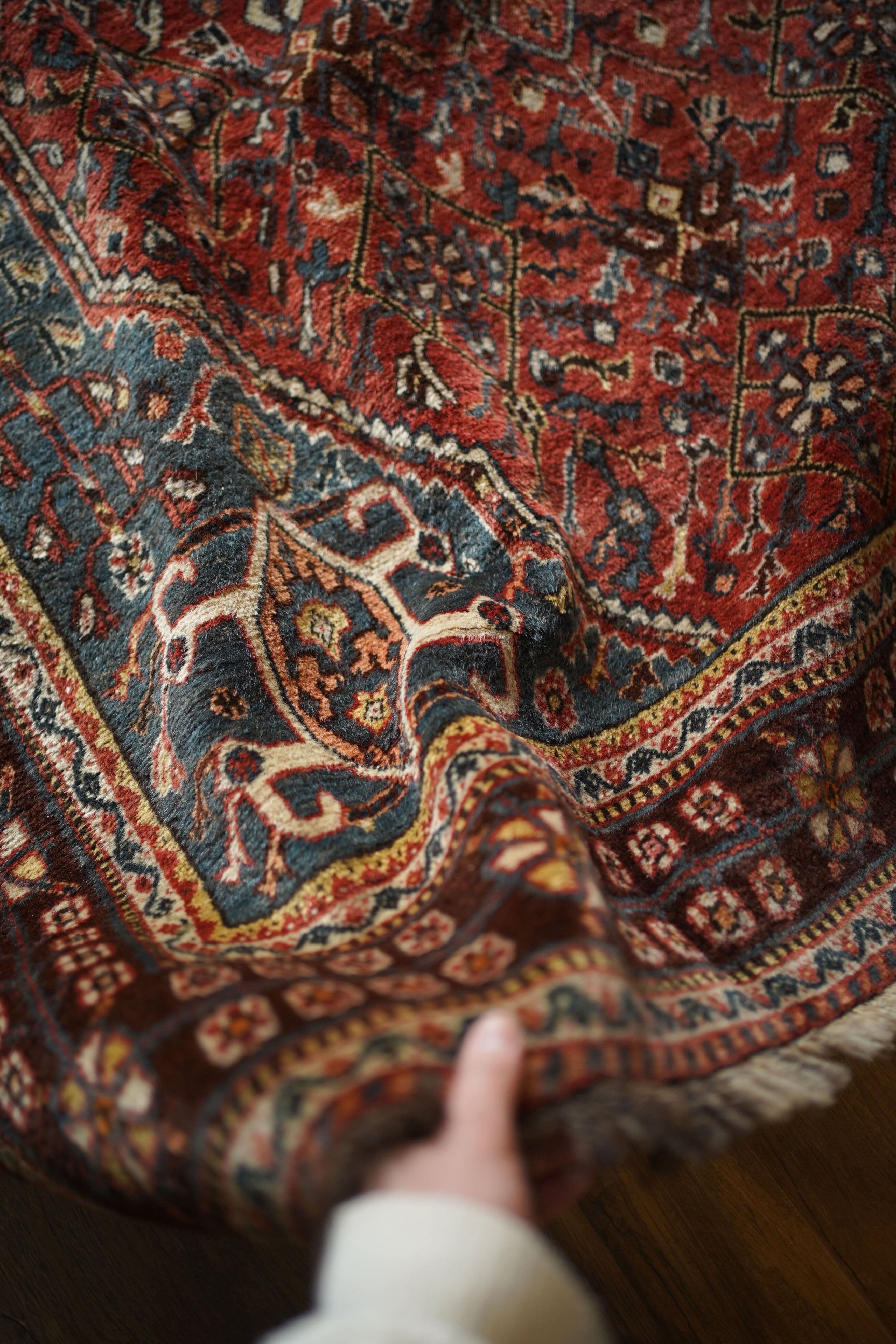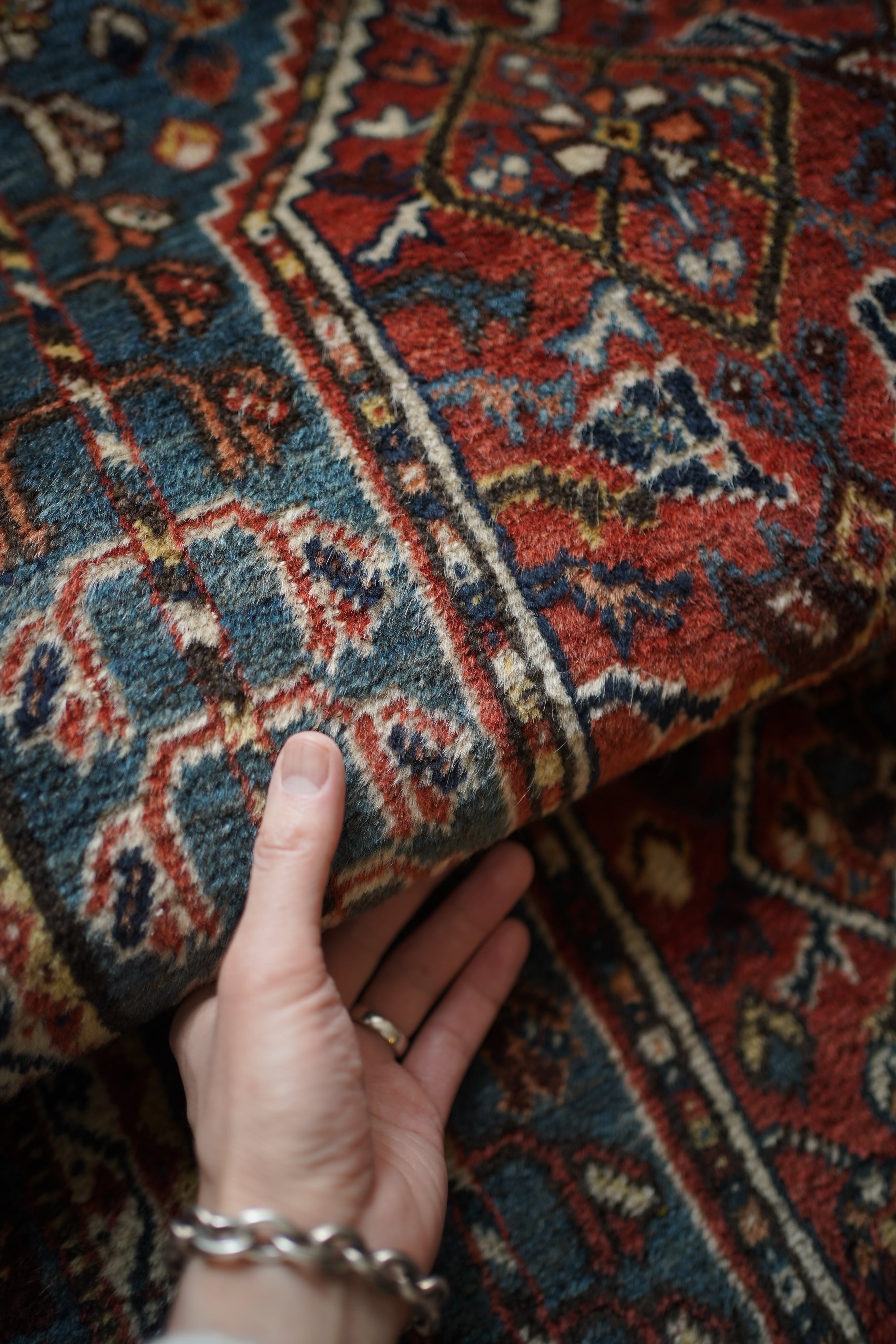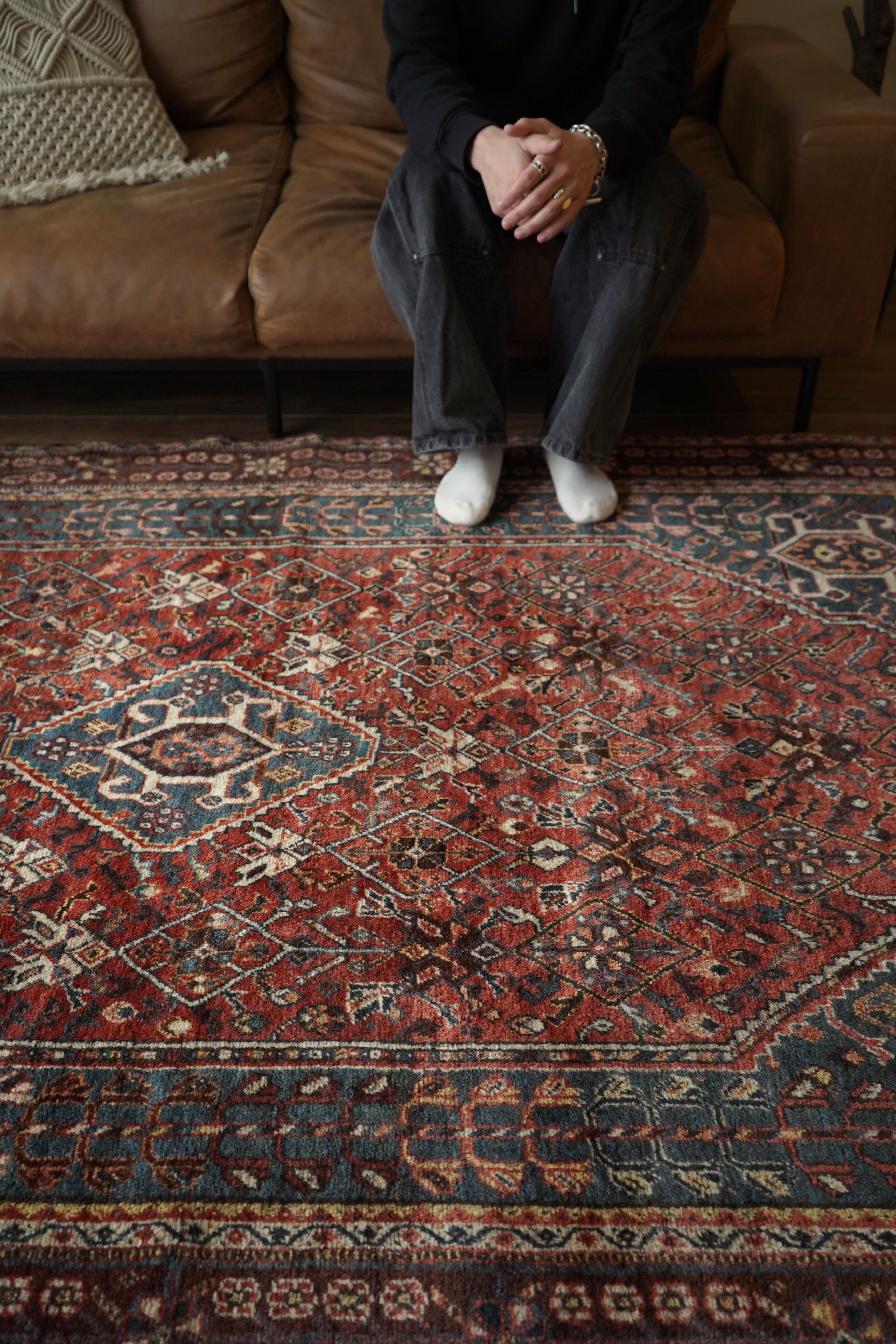 中央とコーナーに織り込まれたカシュガイメダリオンとフィールドに広がる繊細な部族紋様が印象的なデザインで、シンプルなデザイン構成でありながら繊細に使われた紋様が放つカッコ良さに惹かれ仕入れを決めました。