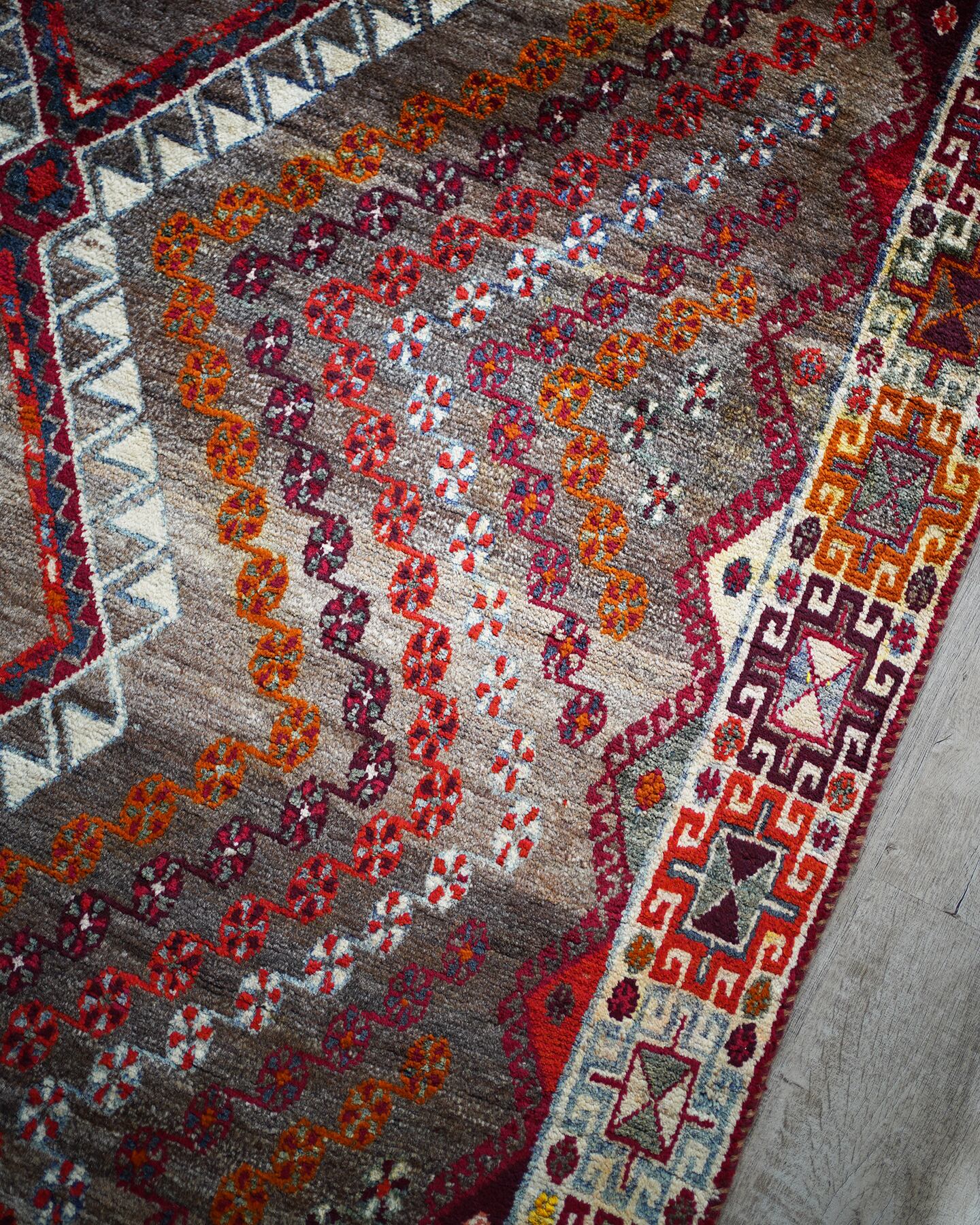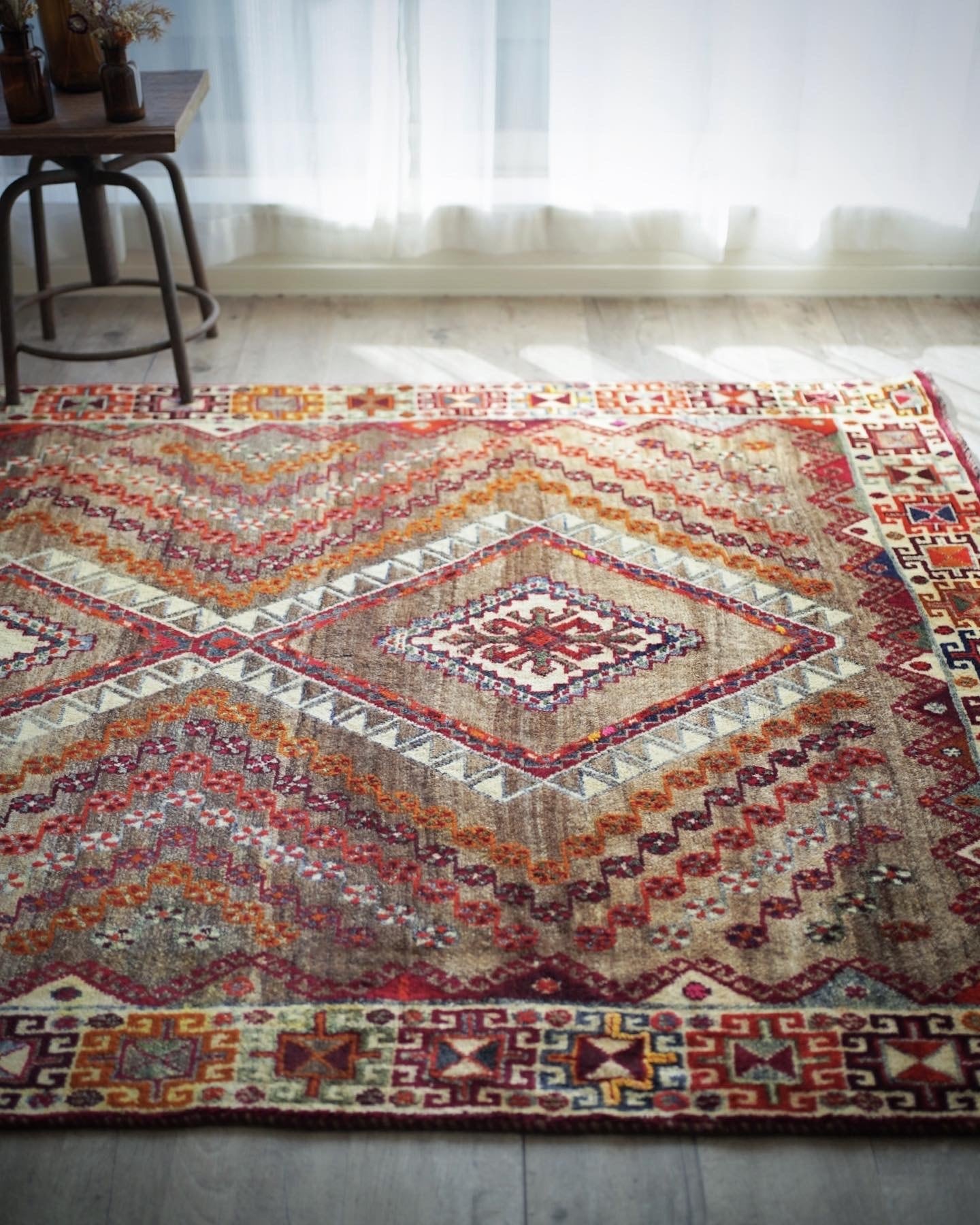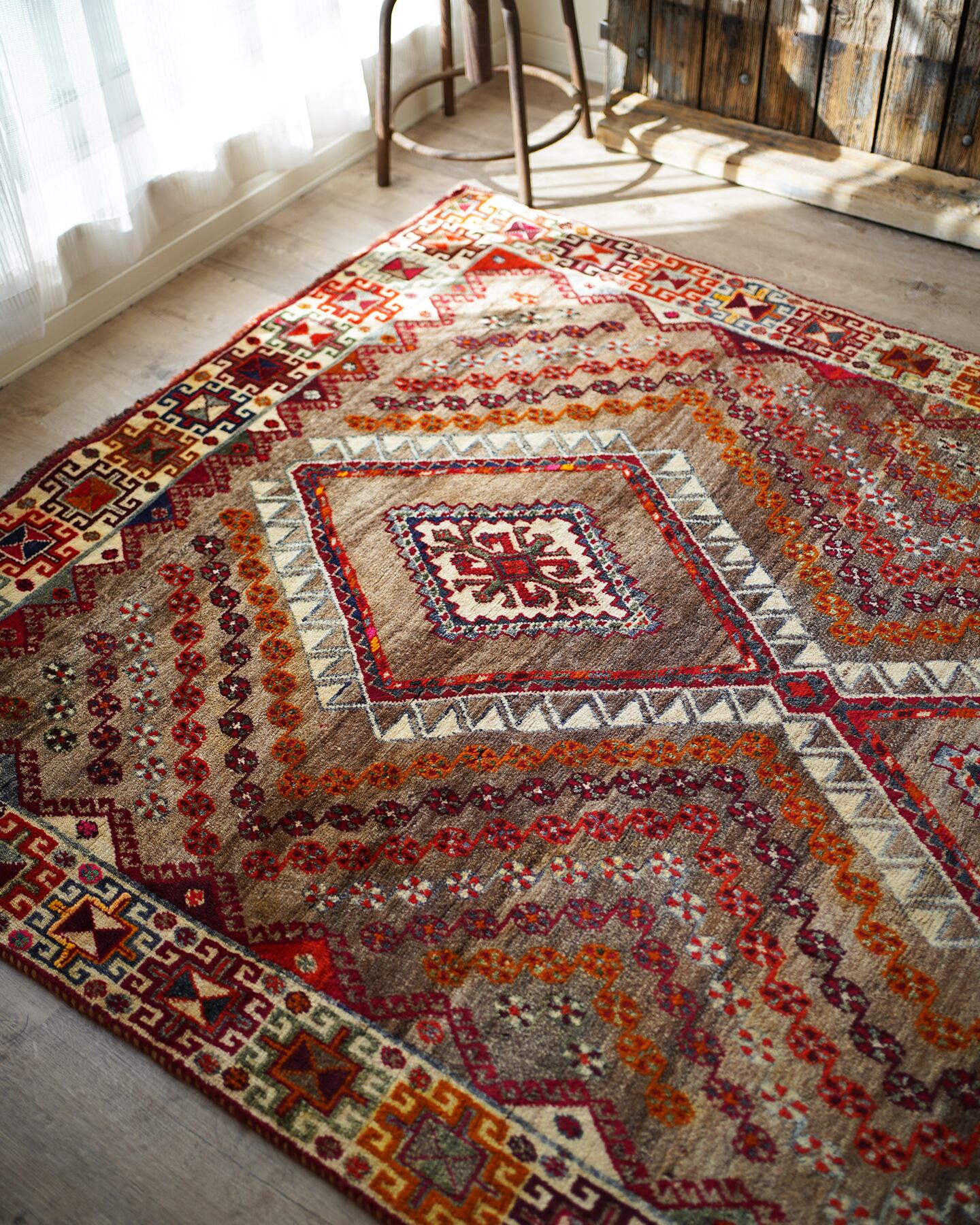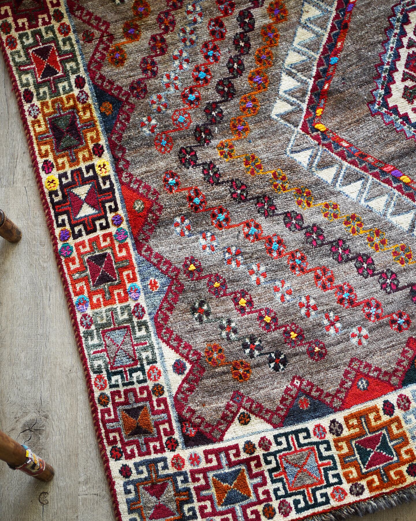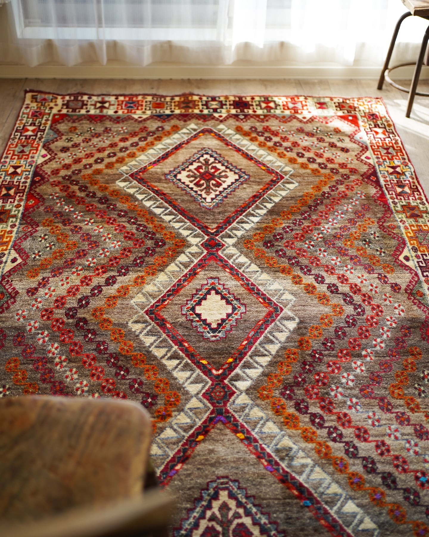 暗めのグレーをベースに、三連のメダリオンの周りにはカラフルな細かい装飾が施された珍しい色味のシラーズギャッベ。ふわっとした気持ちの良い肌触りで、厚みも1cm以上と毛足も長めですので、ゆったり絨毯の上で寛げます。このラグを一枚敷くだけで、お部屋がパッと華やかになりそうですね。補修跡なども無く、コンディションもパーフェクトです♪ リビングの主役にぜひお迎えください。