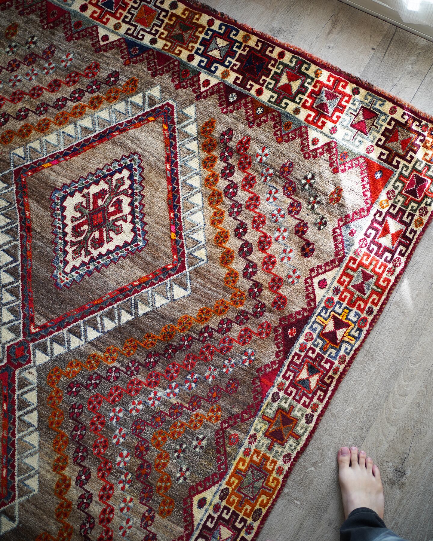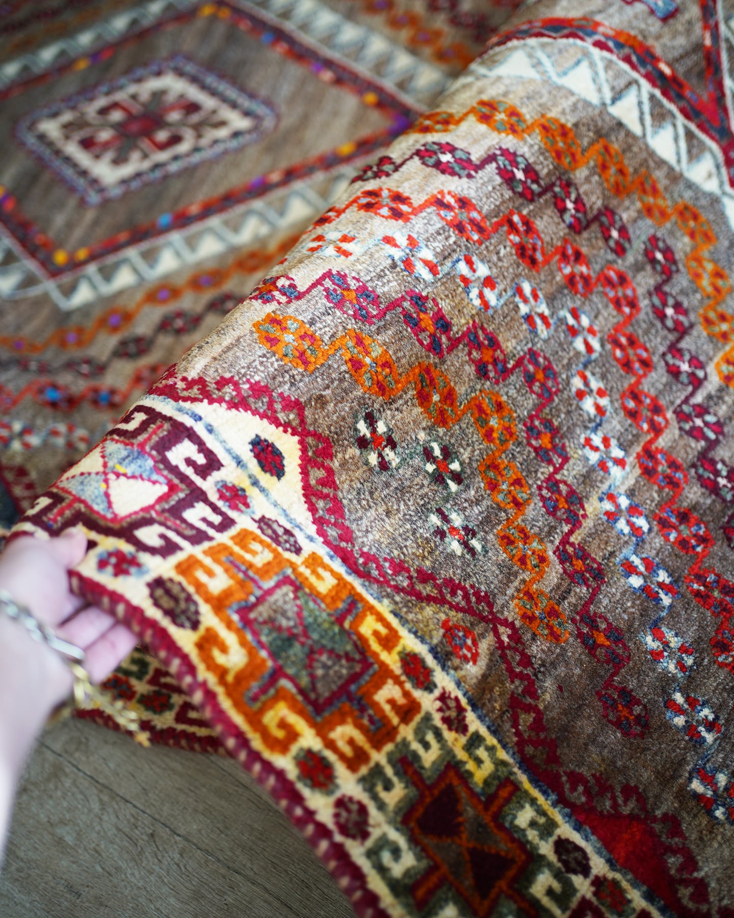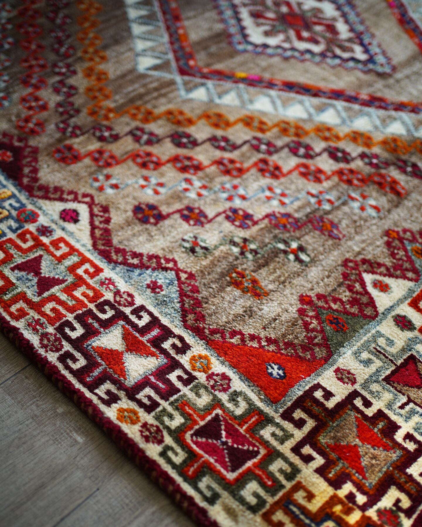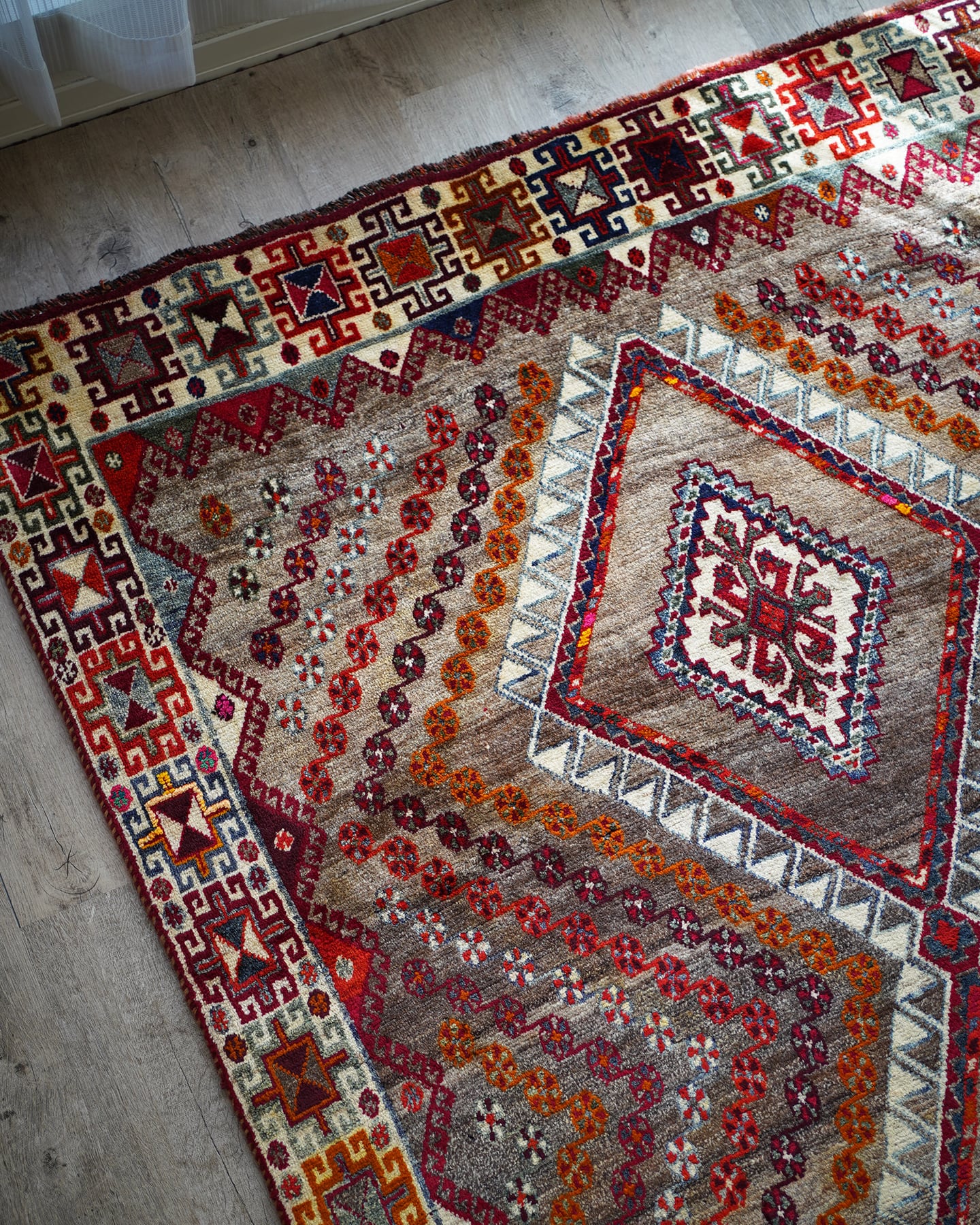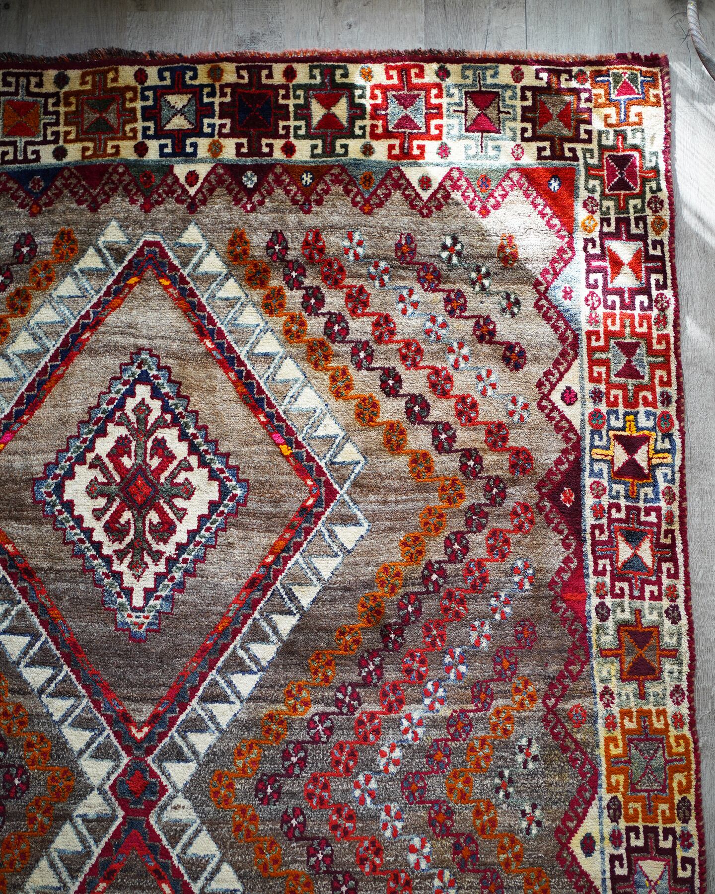 暗めのグレーをベースに、三連のメダリオンの周りにはカラフルな細かい装飾が施された珍しい色味のシラーズギャッベ。ふわっとした気持ちの良い肌触りで、厚みも1cm以上と毛足も長めですので、ゆったり絨毯の上で寛げます。このラグを一枚敷くだけで、お部屋がパッと華やかになりそうですね。補修跡なども無く、コンディションもパーフェクトです♪ リビングの主役にぜひお迎えください。
