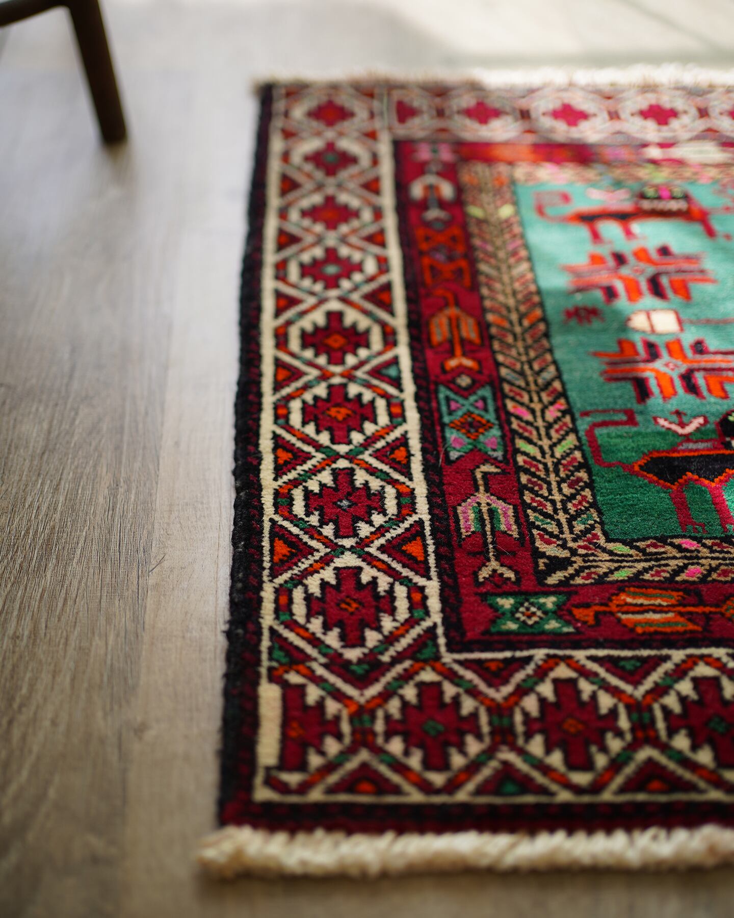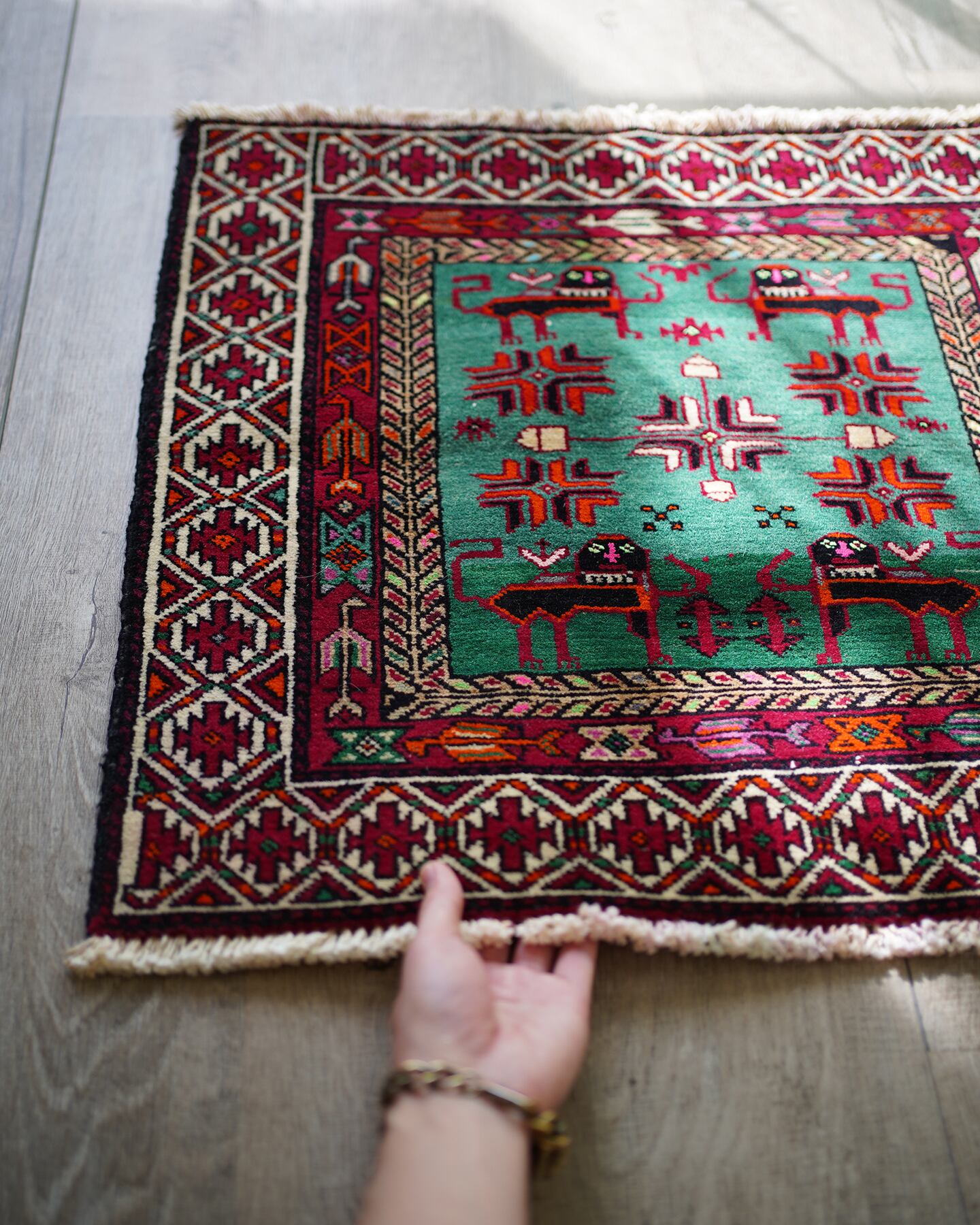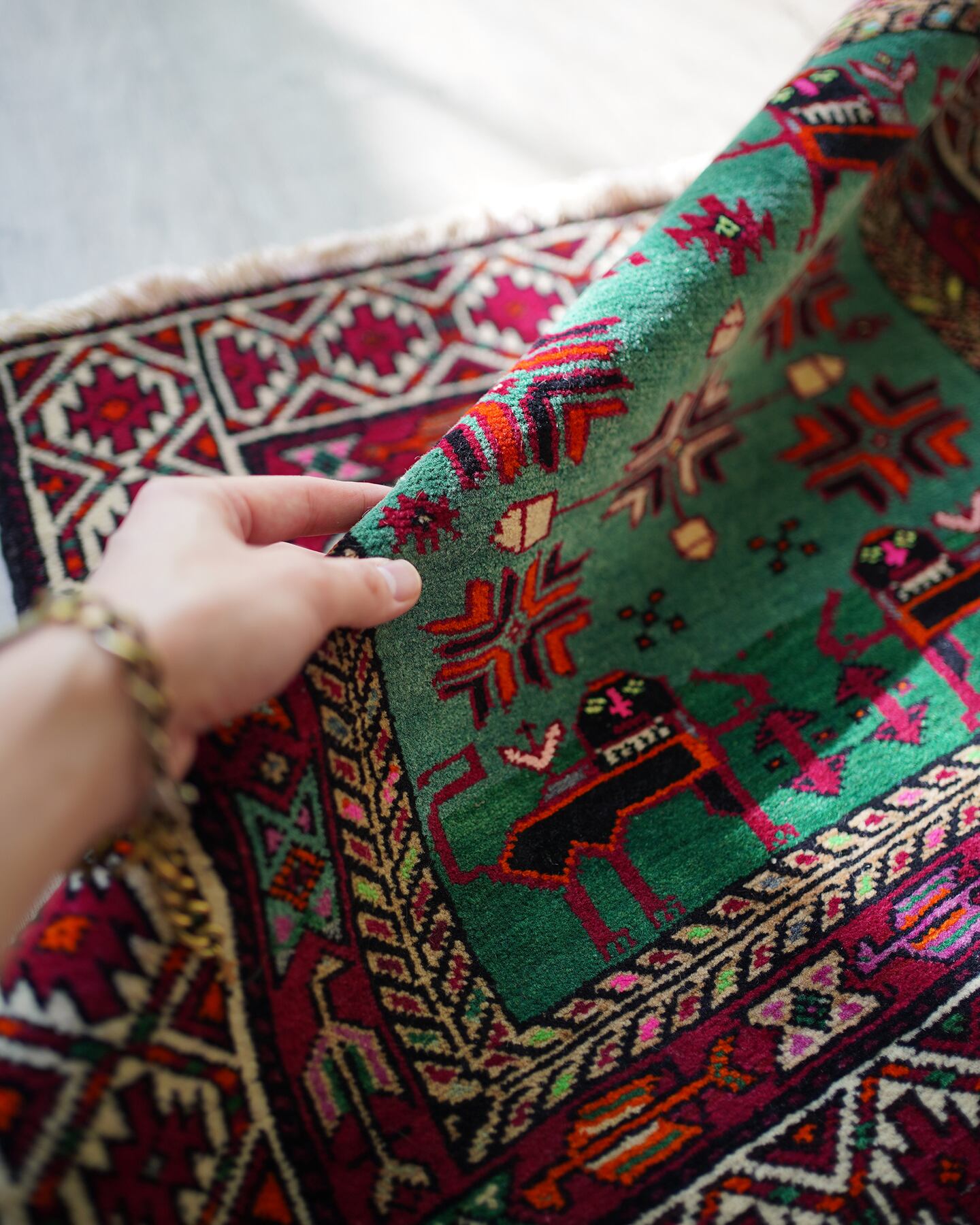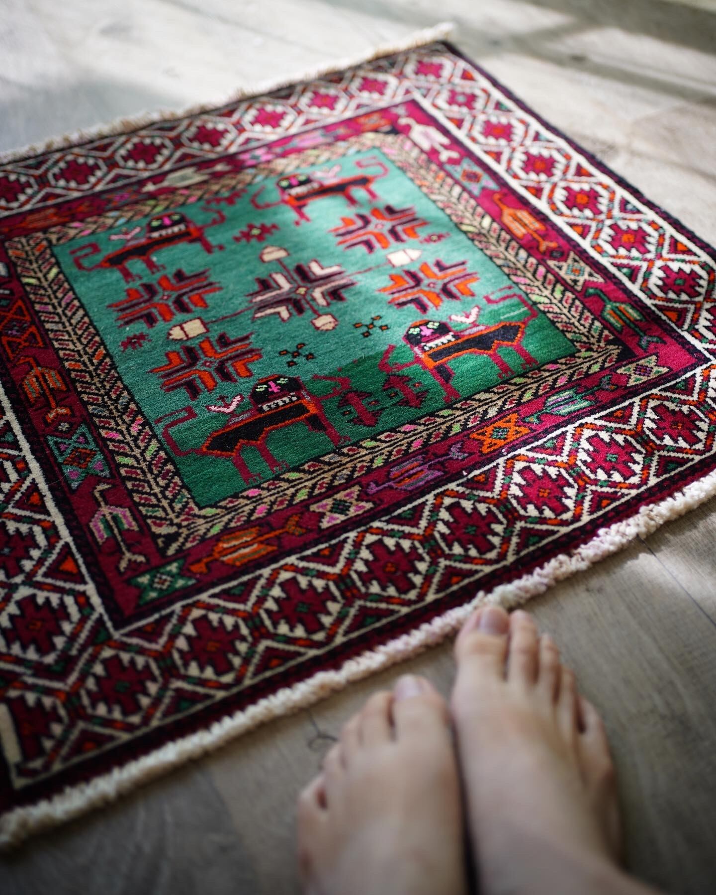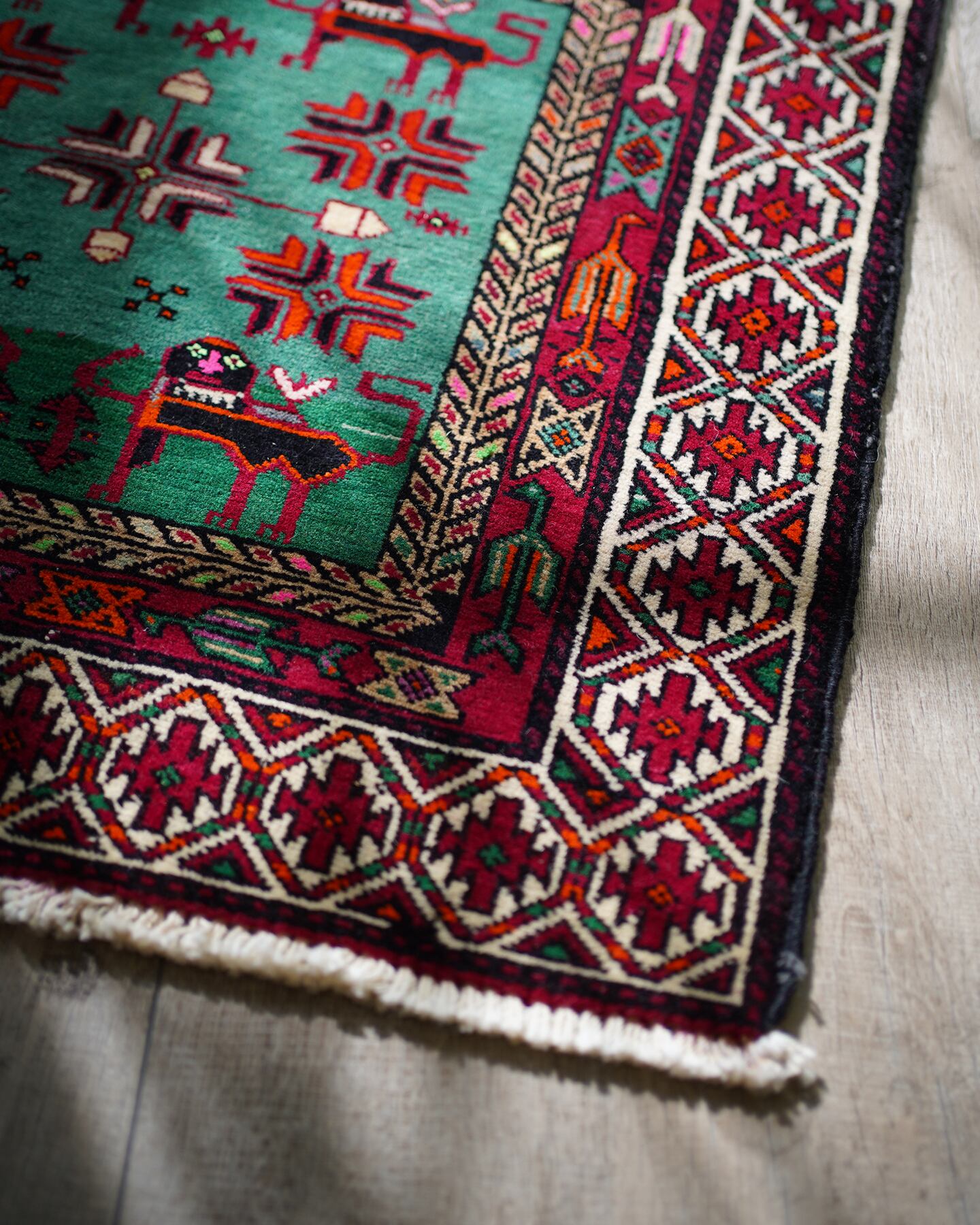 正方形タイプのスモールバルーチラグ。赤紫とエメラルドグリーンの色の組み合わせが素晴らしく、中央には4匹の猿のような生き物が織り込まれています。羊や鹿や鳥などはよく見かけますが、このような動物が織り込まれているラグはほとんど見たことがありません。サラサラとした気持ちの良い肌触りで、毛並みも詰まっており、品質の高さが伺える一枚です。厚みは7mm程度で、しっかりと張りのある質感。タペストリーとして飾ってもお部屋が可愛くなりそうですね♫
