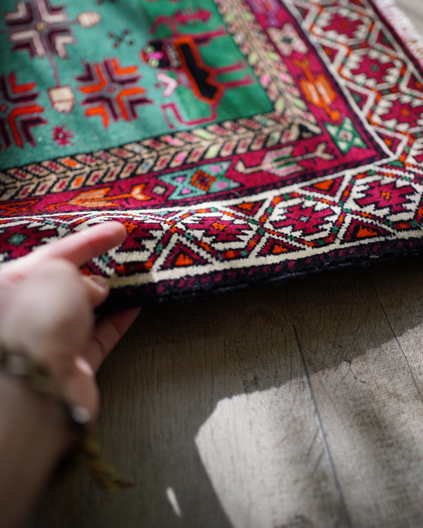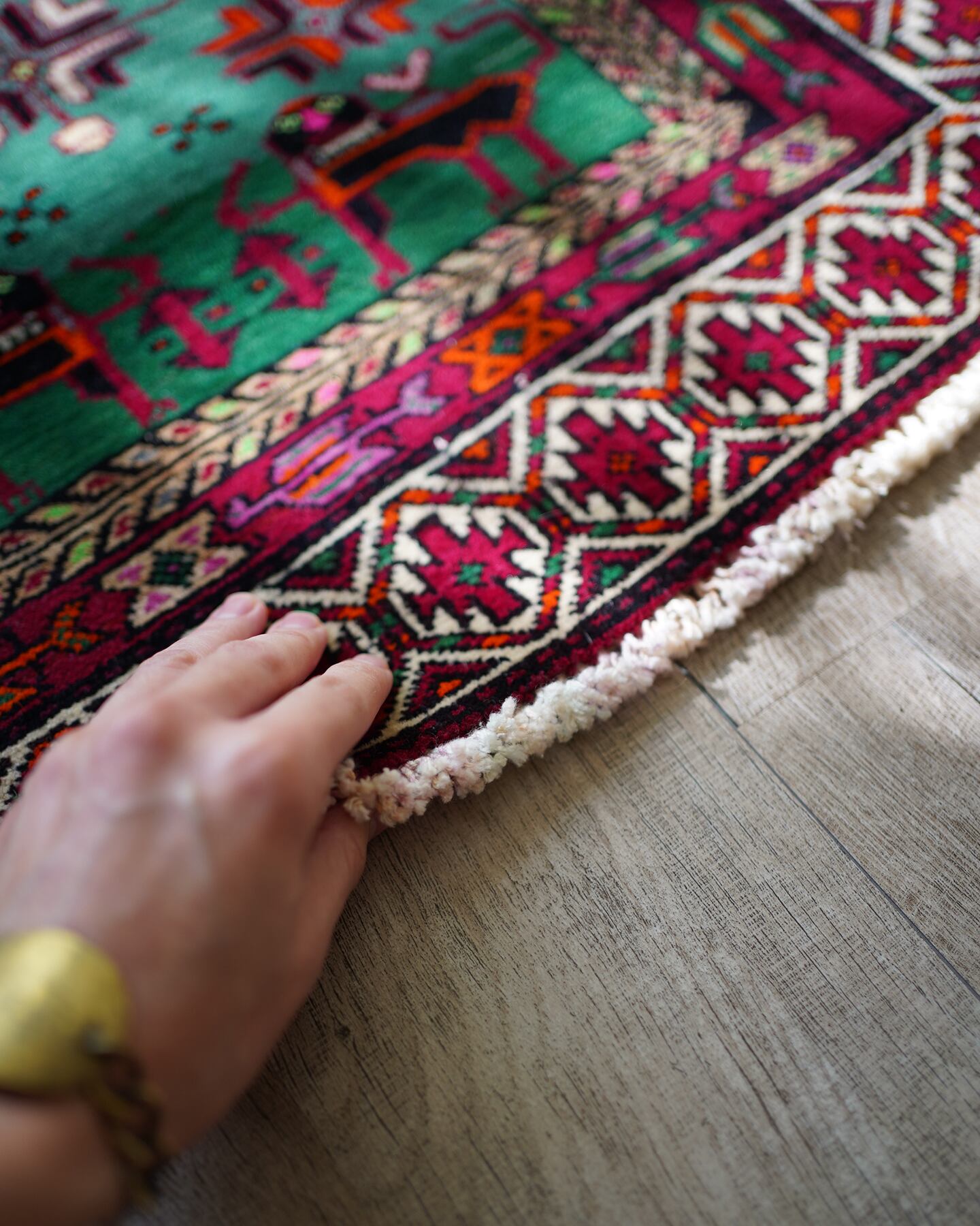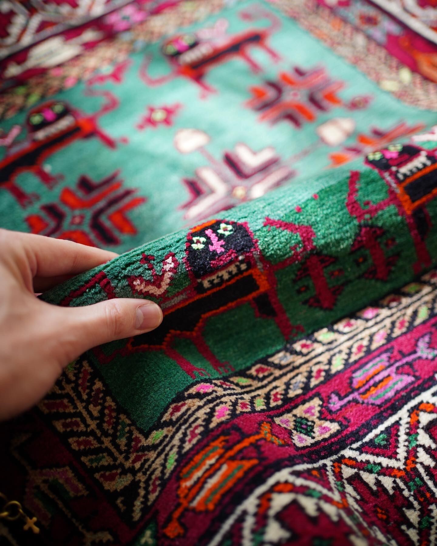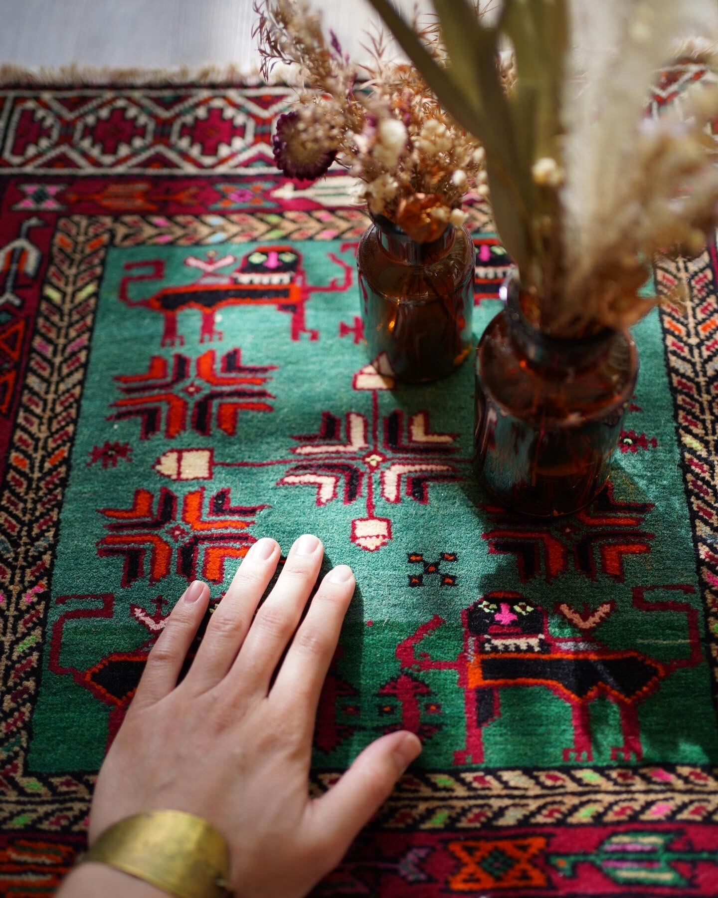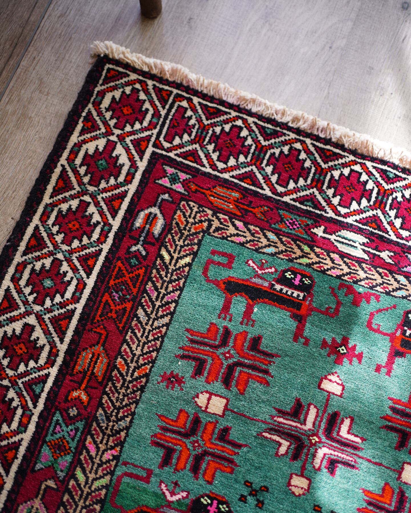 正方形タイプのスモールバルーチラグ。赤紫とエメラルドグリーンの色の組み合わせが素晴らしく、中央には4匹の猿のような生き物が織り込まれています。羊や鹿や鳥などはよく見かけますが、このような動物が織り込まれているラグはほとんど見たことがありません。サラサラとした気持ちの良い肌触りで、毛並みも詰まっており、品質の高さが伺える一枚です。厚みは7mm程度で、しっかりと張りのある質感。タペストリーとして飾ってもお部屋が可愛くなりそうですね♫