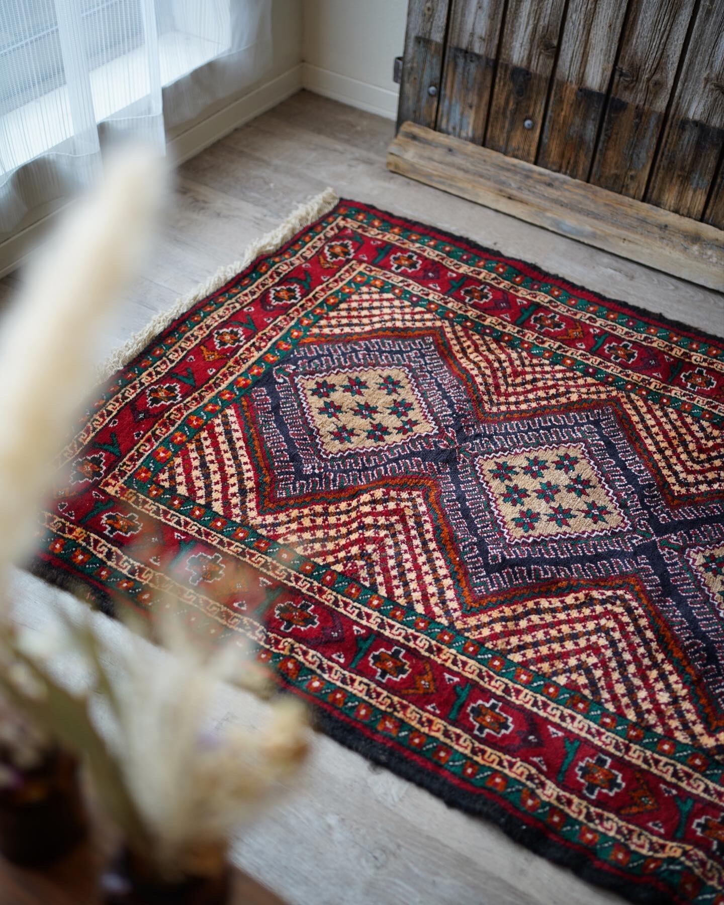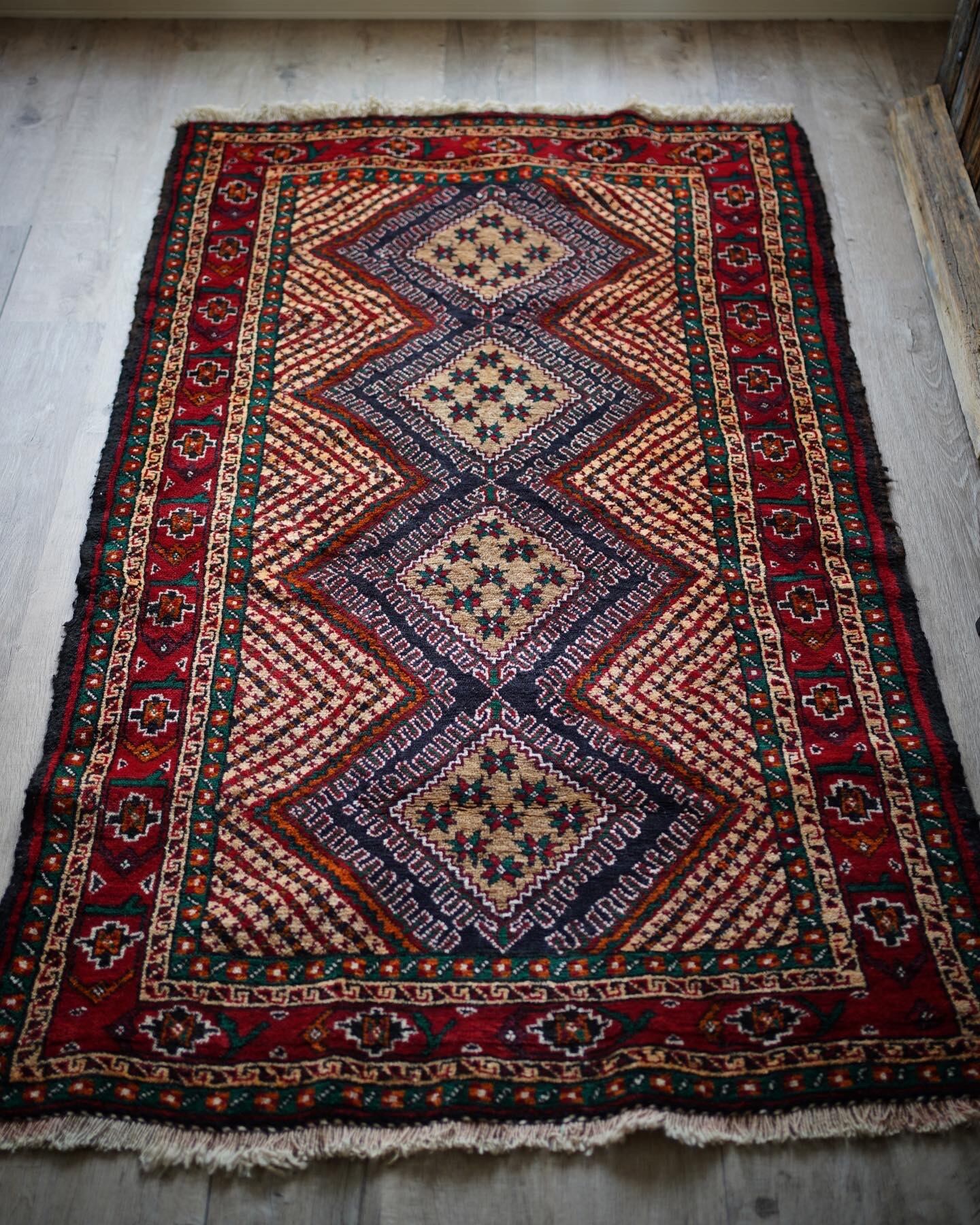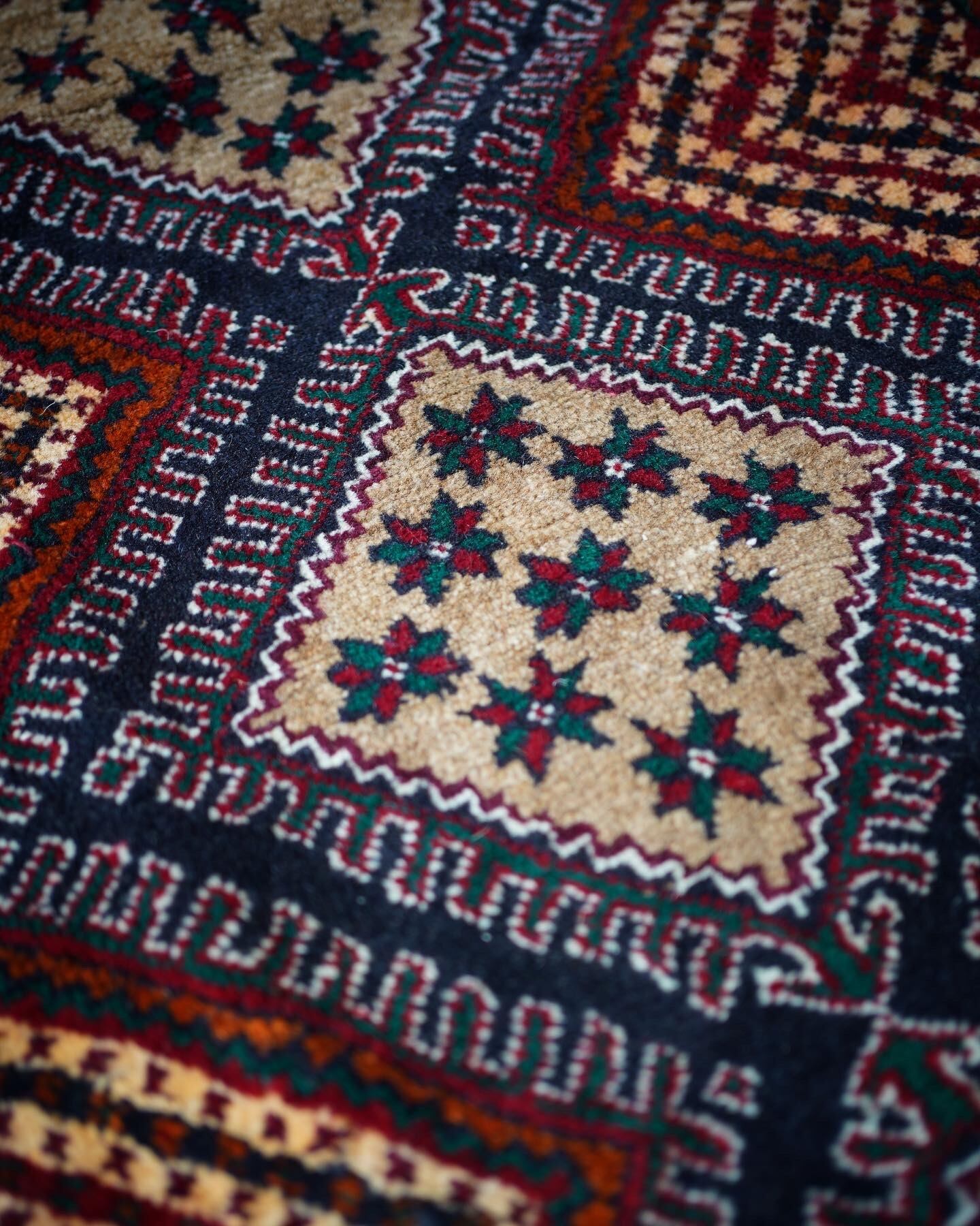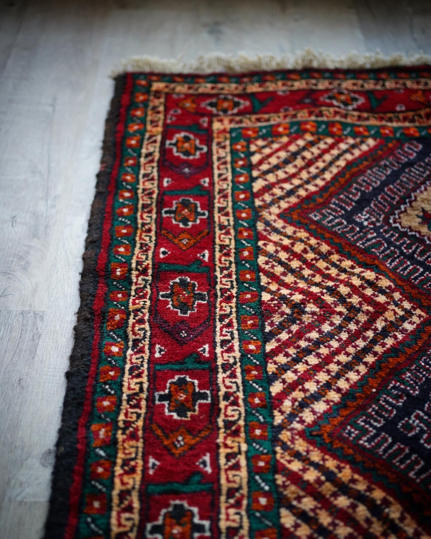イラン南東部からアフガニスタン北西部の国境付近に居住するバルーチ族によっておられた手織りのラグ。菱形の4つのメダリオン、フィールドのギザギザストライプが特徴的で、メダリオンの中には幸運の象徴を意味する八角星がたくさん織り込まれています。赤と緑の配色で上品ながらも可愛らしいデザインです。毛並みも1cmほどあるため厚く、フワフワ&もふもふした柔らかい肌触りで、寒くなってきたこの時期にピッタリの一枚です♫