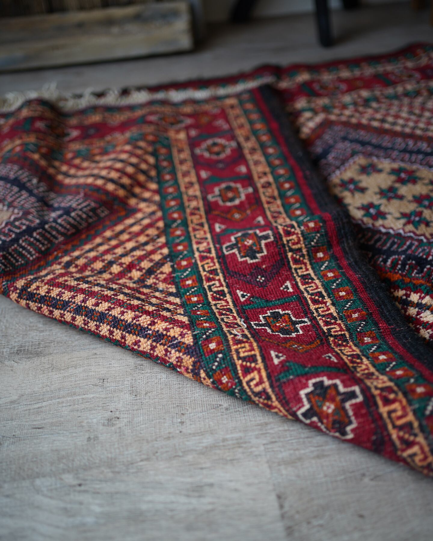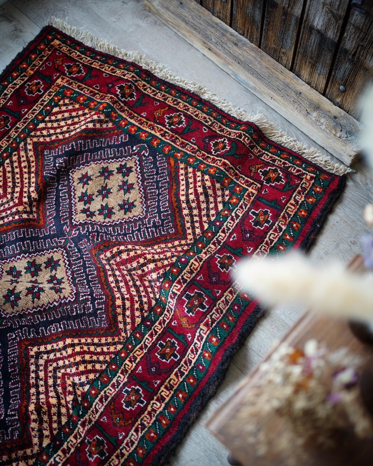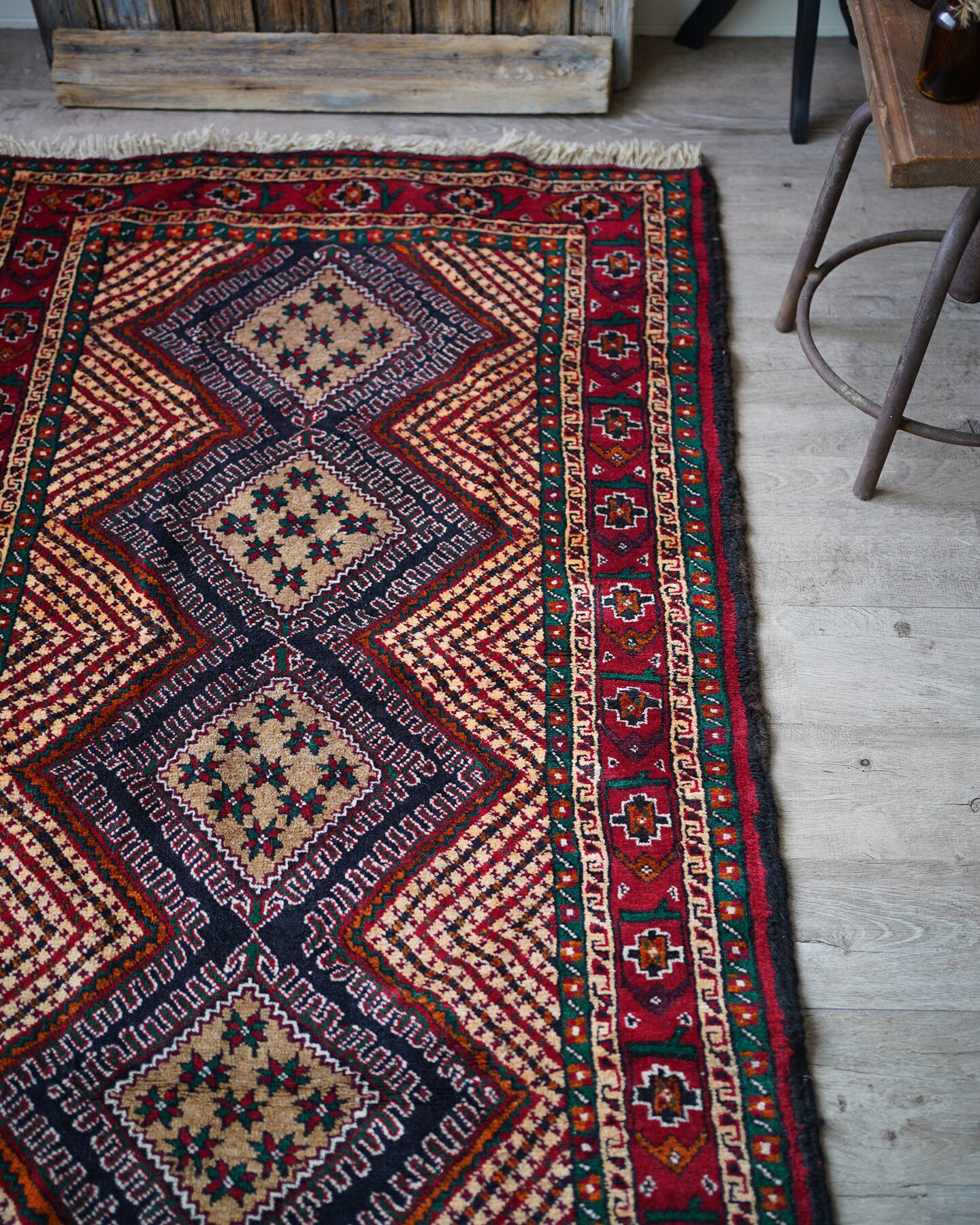 イラン南東部からアフガニスタン北西部の国境付近に居住するバルーチ族によっておられた手織りのラグ。菱形の4つのメダリオン、フィールドのギザギザストライプが特徴的で、メダリオンの中には幸運の象徴を意味する八角星がたくさん織り込まれています。赤と緑の配色で上品ながらも可愛らしいデザインです。毛並みも1cmほどあるため厚く、フワフワ&もふもふした柔らかい肌触りで、寒くなってきたこの時期にピッタリの一枚です♫