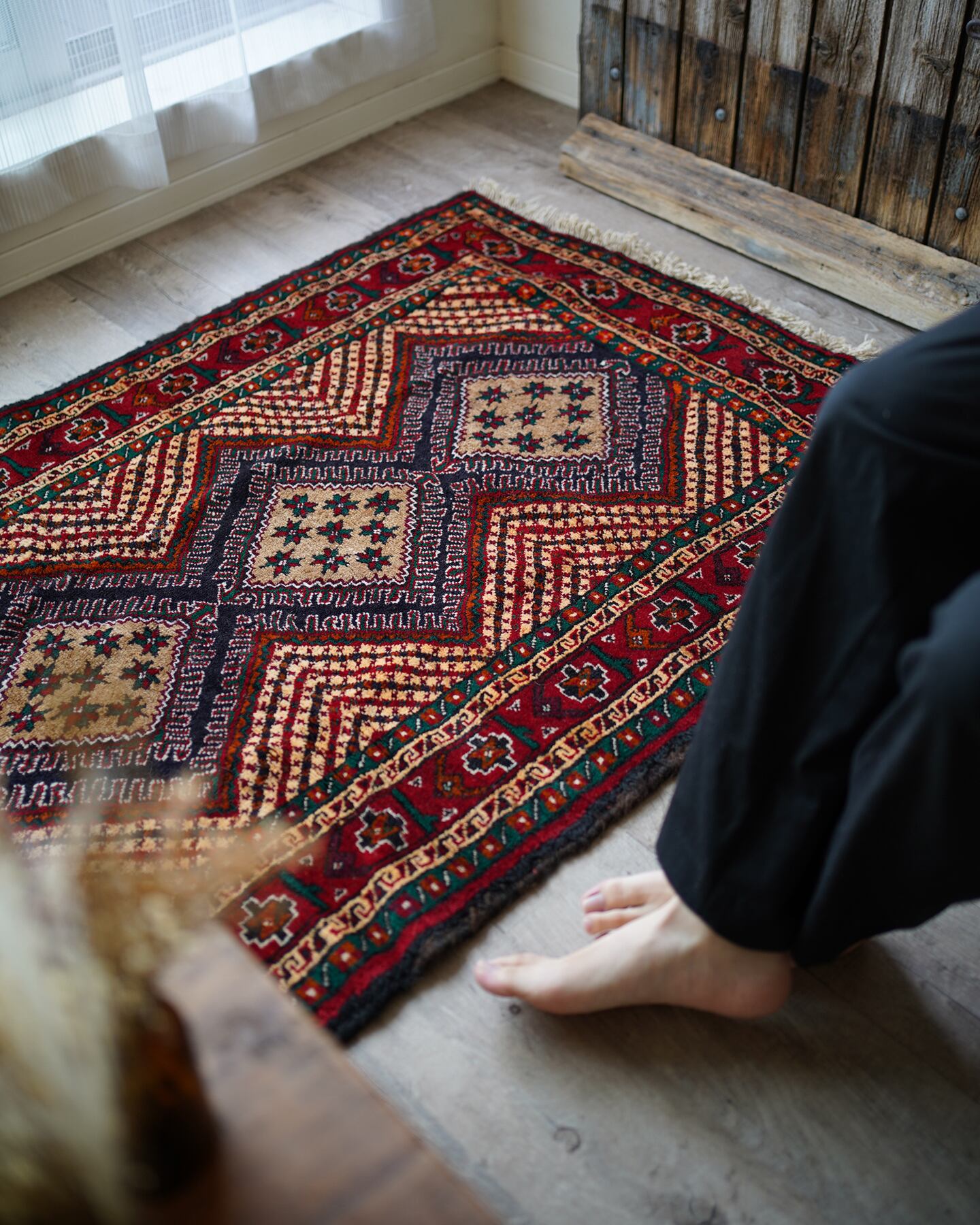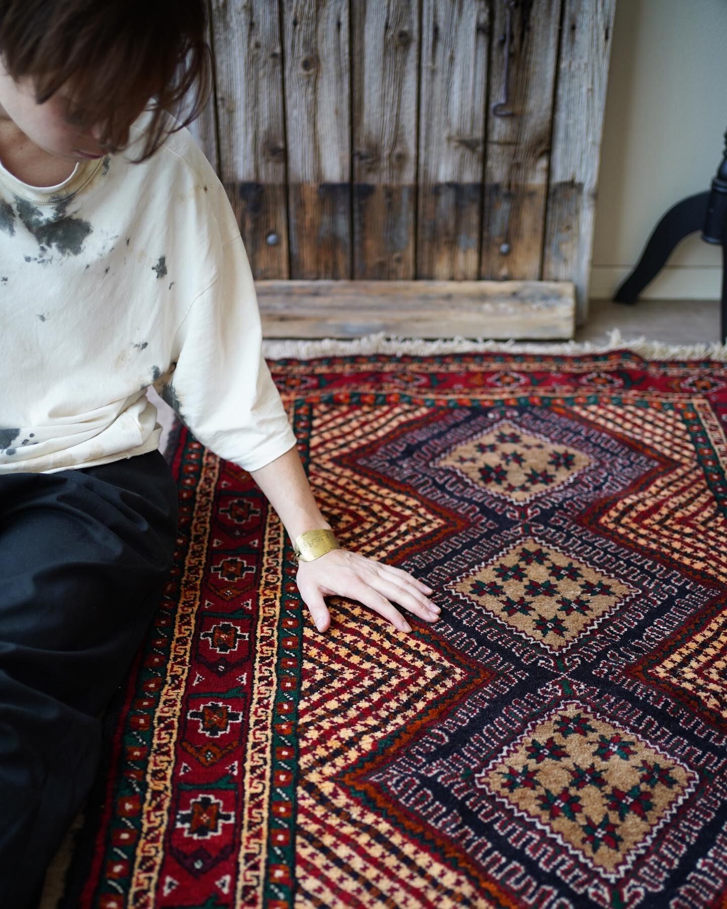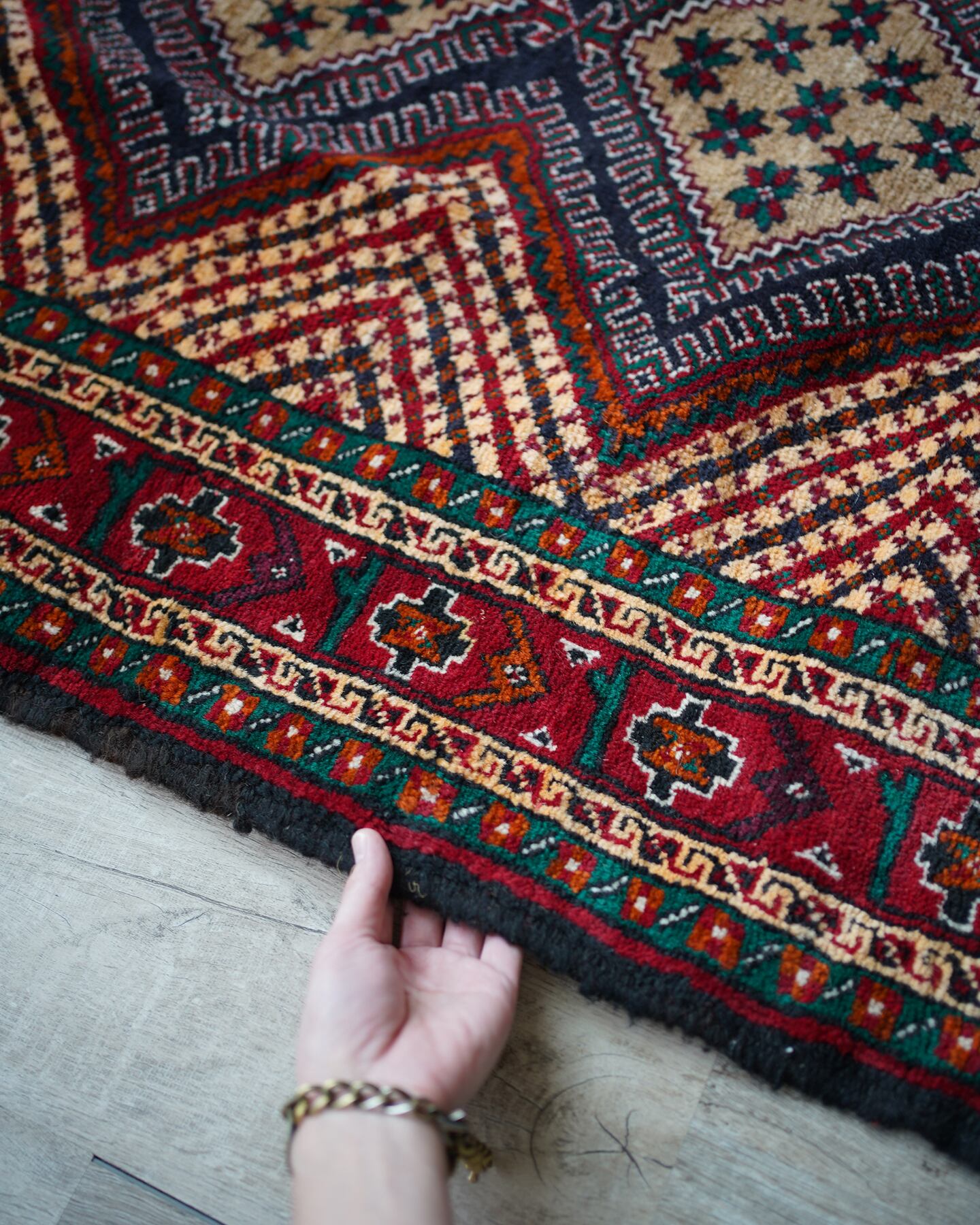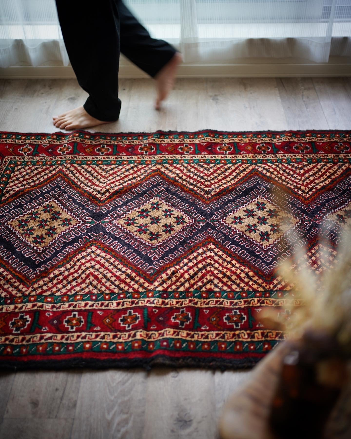イラン南東部からアフガニスタン北西部の国境付近に居住するバルーチ族によっておられた手織りのラグ。菱形の4つのメダリオン、フィールドのギザギザストライプが特徴的で、メダリオンの中には幸運の象徴を意味する八角星がたくさん織り込まれています。赤と緑の配色で上品ながらも可愛らしいデザインです。毛並みも1cmほどあるため厚く、フワフワ&もふもふした柔らかい肌触りで、寒くなってきたこの時期にピッタリの一枚です♫