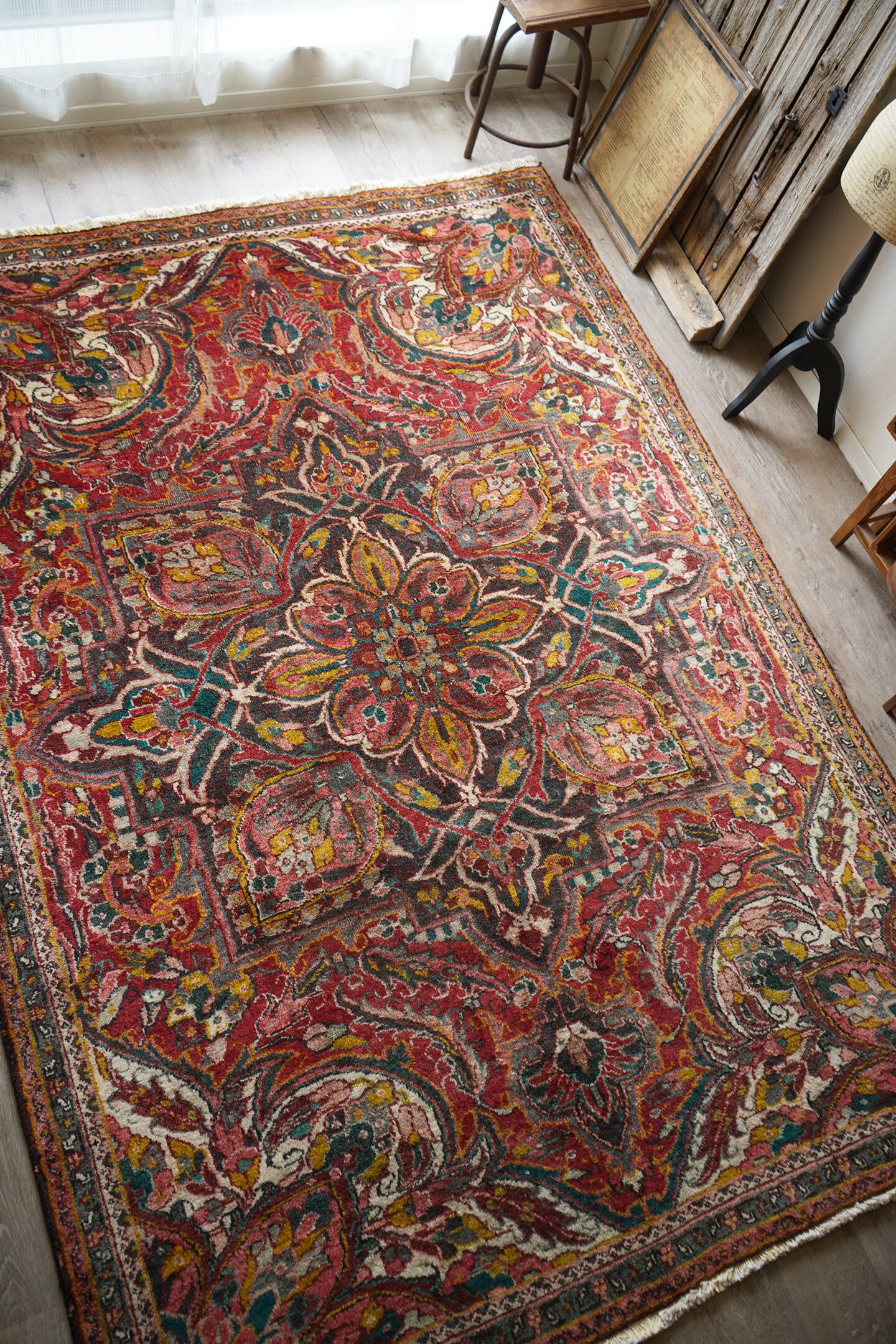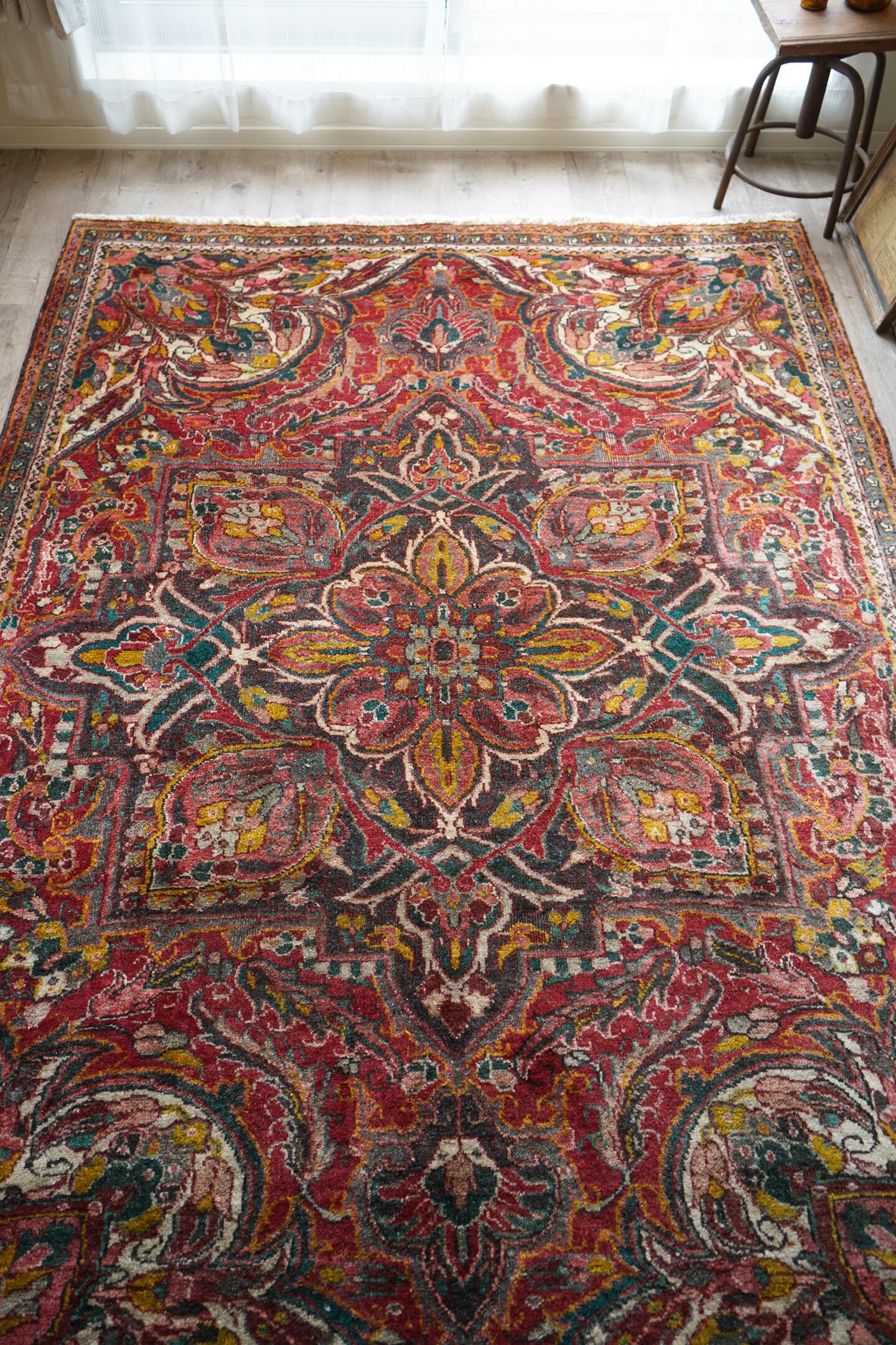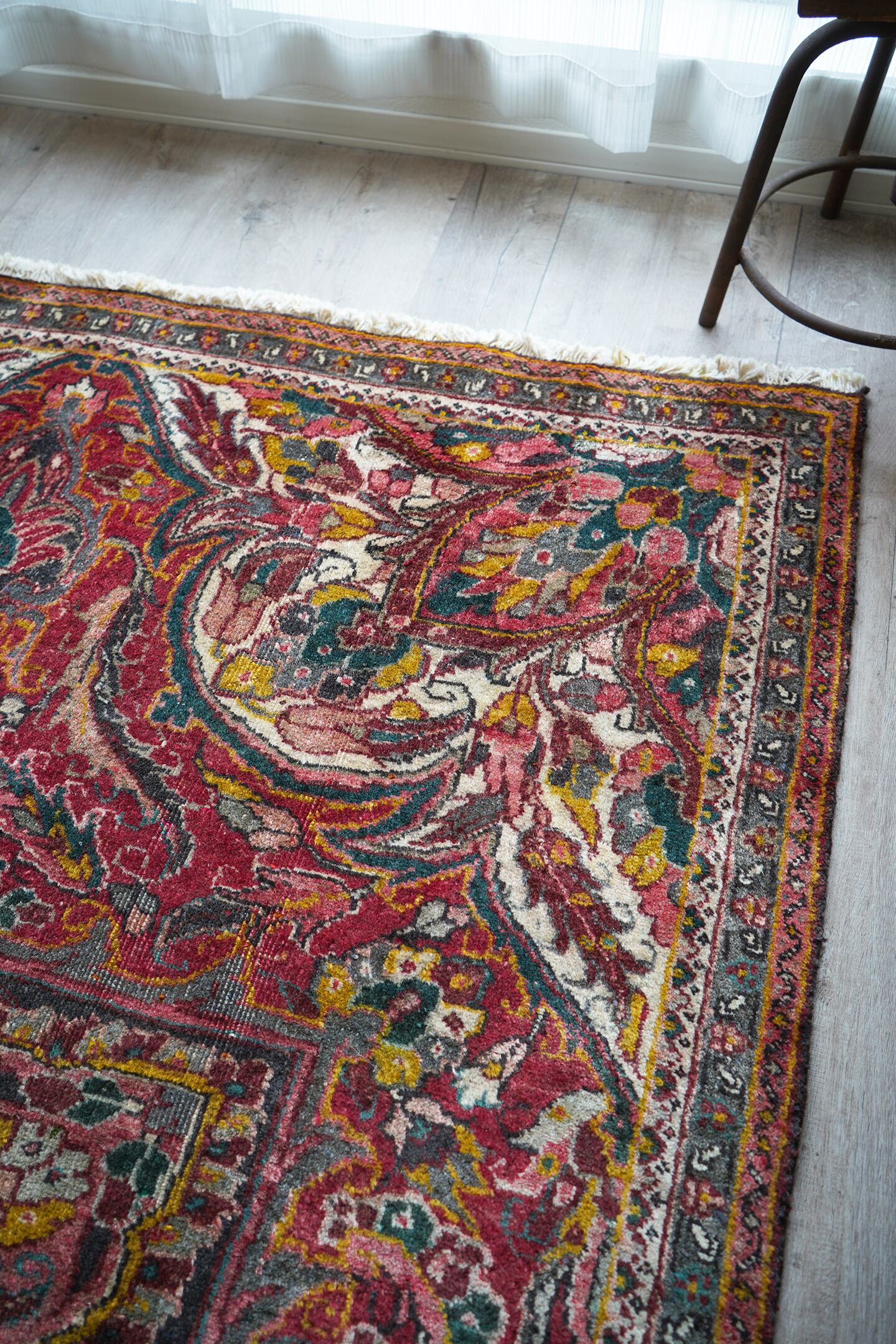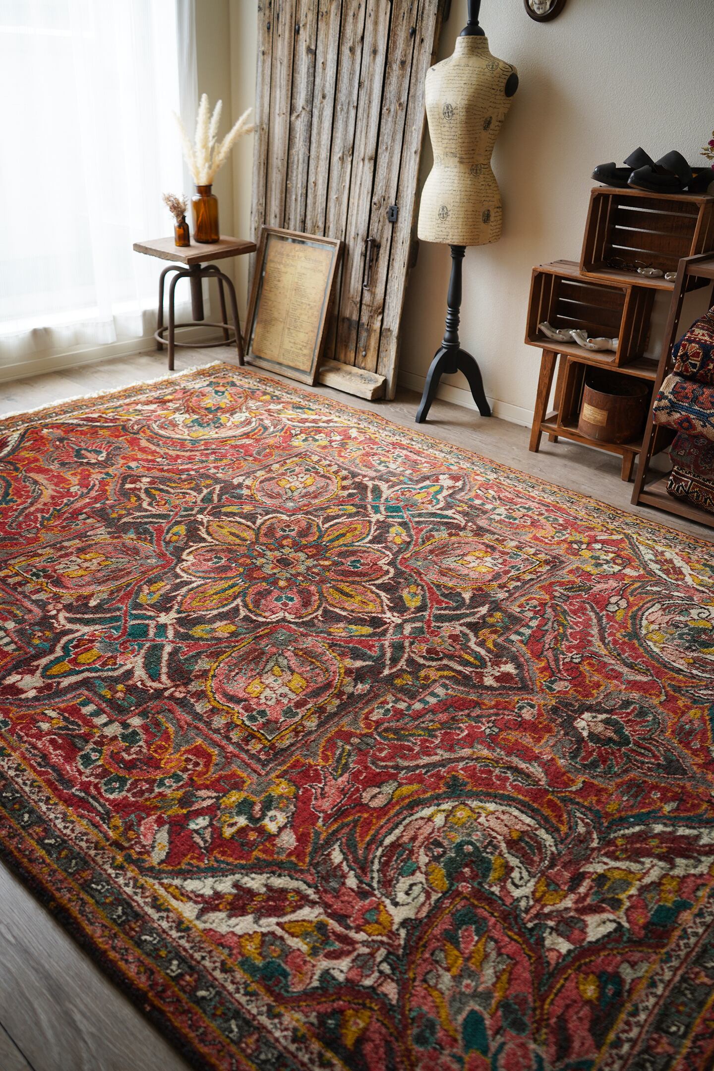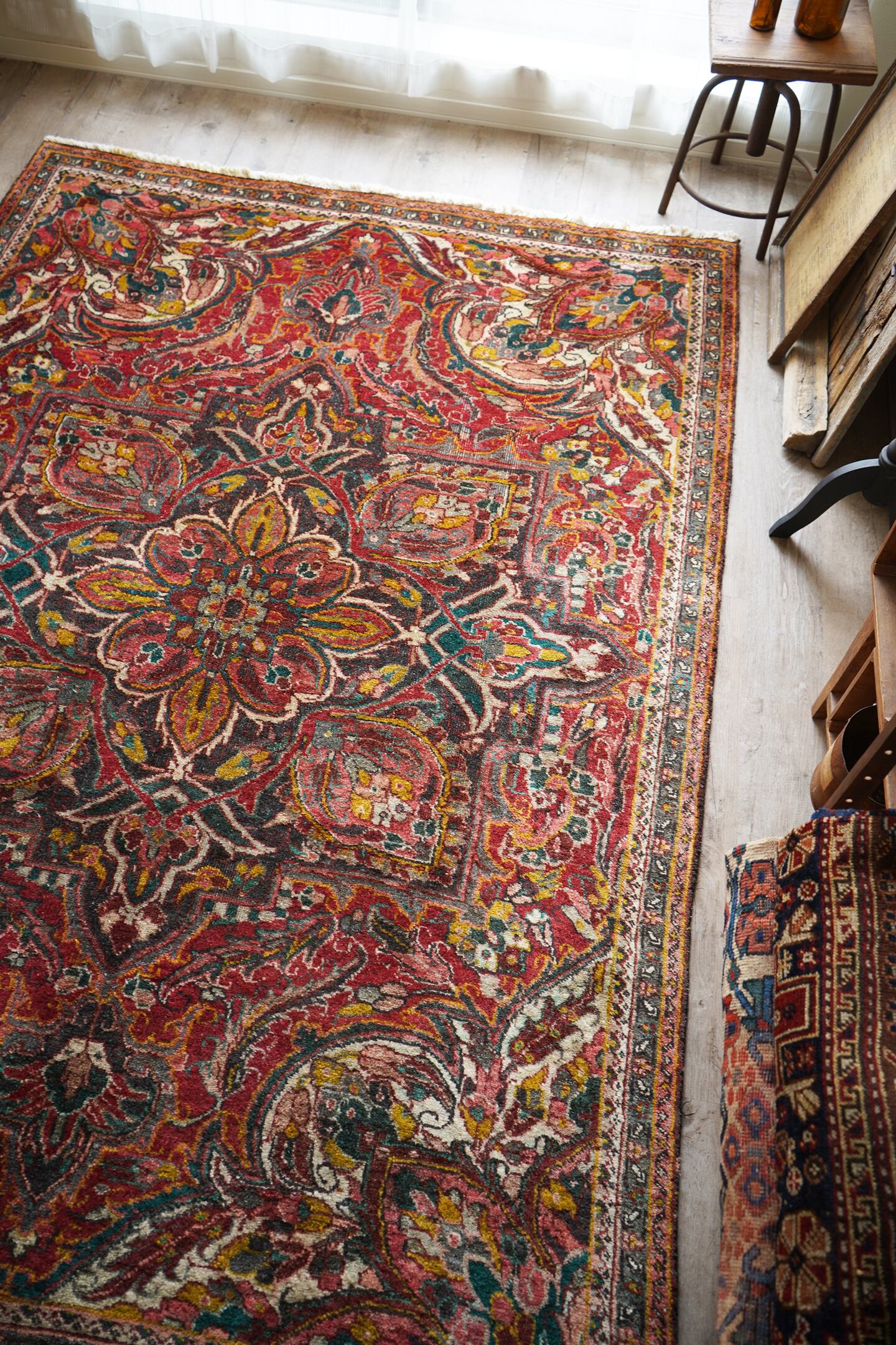 約100年前のイラン・タブリーズ産のアンティークラグ。絵画のようなタッチで描かれた花模様はまさにアート。配色は深い赤色をベースに淡いピンクや黄土色、グリーンなどが使われています。こちらのラグは元々9平米ほどの大きさで、ボロボロになった周りの部分をカットし、綺麗にリサイズして今に受け継がれたお品です。厚みは1.3cm程で、ふわサラッとした優しい肌触り。重さもあり、がっしりとした耐久性に優れた印象の質感となります。コンディションとしてはフリンジに少々の色移り、また一部パイルがすり減って薄くなっている箇所がございます(お写真最後の2枚をご参照ください)。存在感のあるラグで、リビングが華やかなること間違いなしです♪