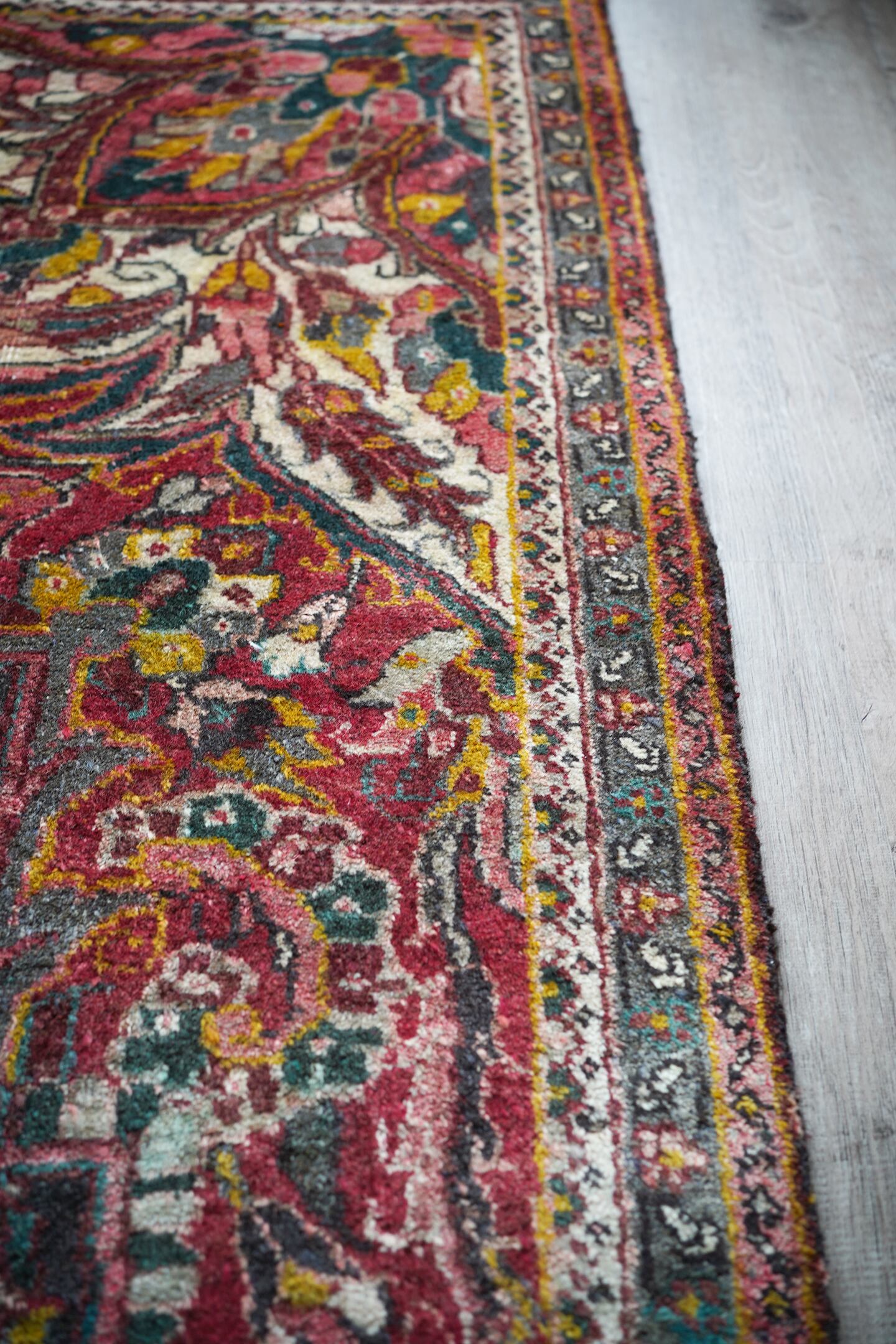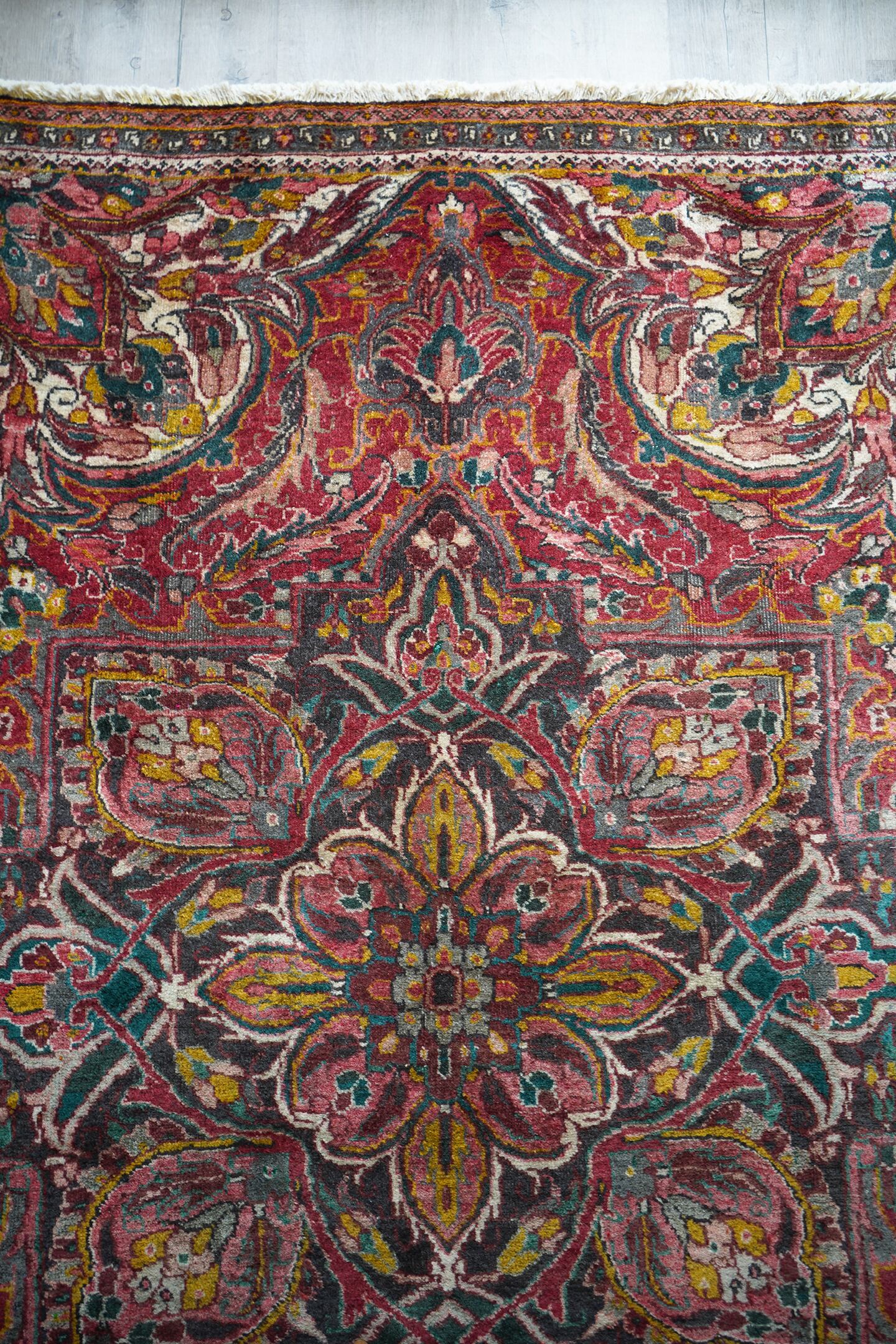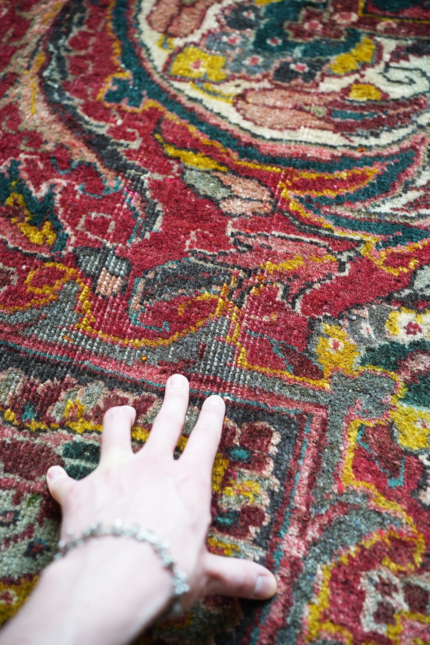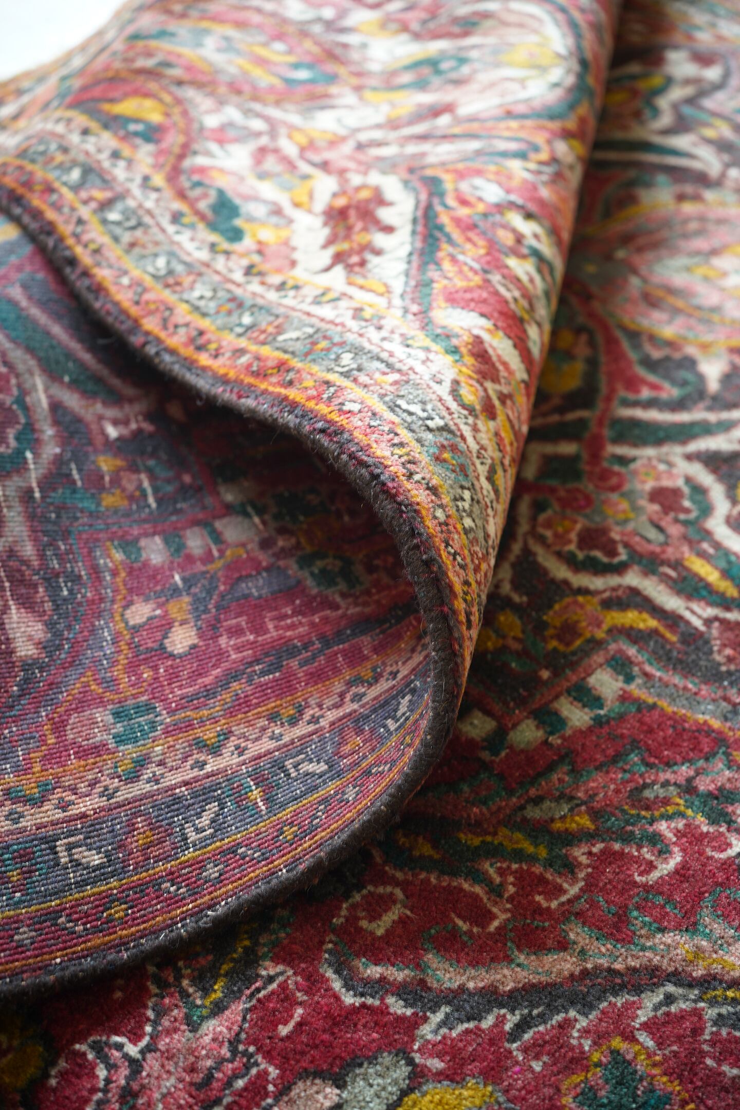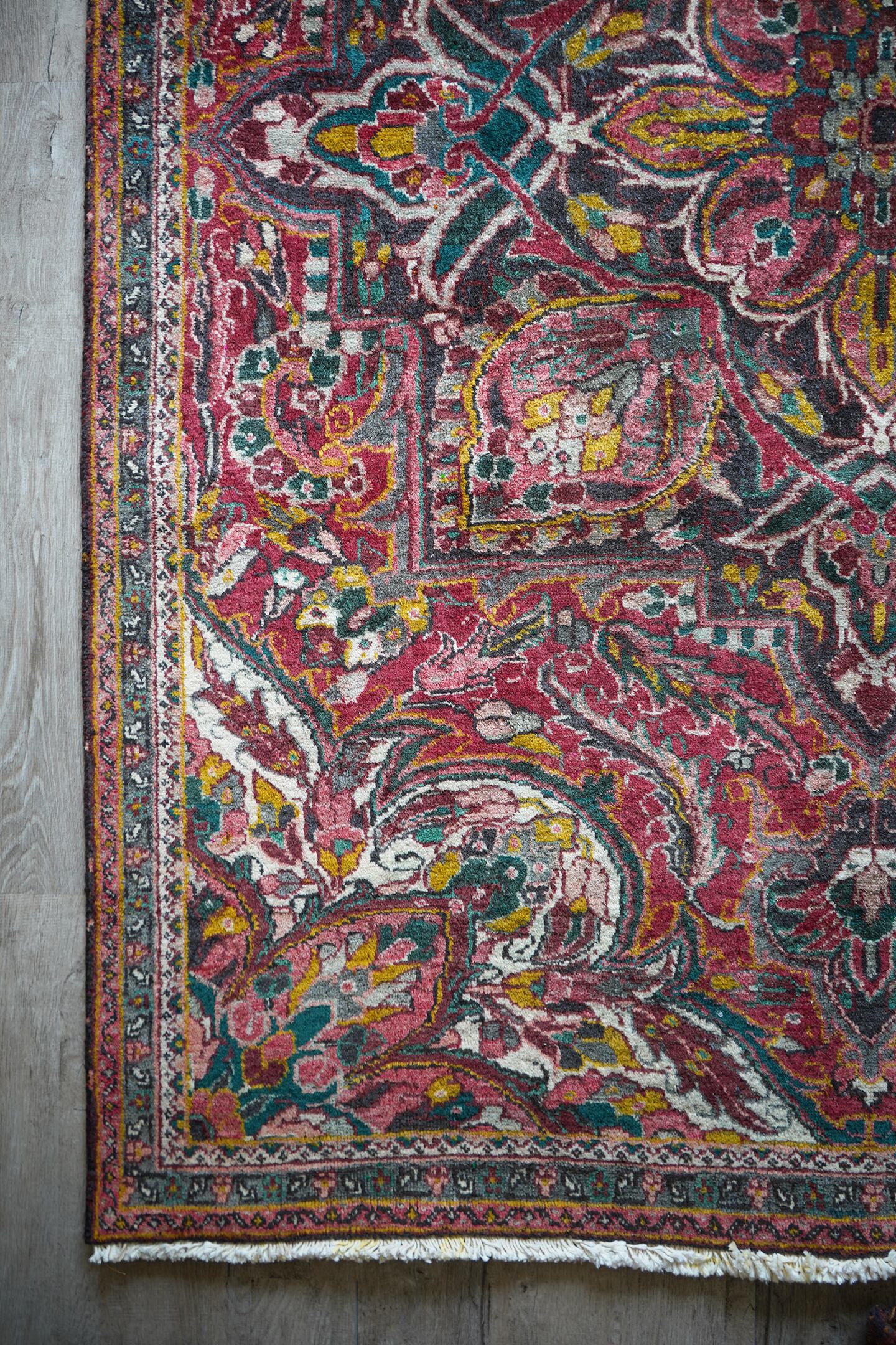 約100年前のイラン・タブリーズ産のアンティークラグ。絵画のようなタッチで描かれた花模様はまさにアート。配色は深い赤色をベースに淡いピンクや黄土色、グリーンなどが使われています。こちらのラグは元々9平米ほどの大きさで、ボロボロになった周りの部分をカットし、綺麗にリサイズして今に受け継がれたお品です。厚みは1.3cm程で、ふわサラッとした優しい肌触り。重さもあり、がっしりとした耐久性に優れた印象の質感となります。コンディションとしてはフリンジに少々の色移り、また一部パイルがすり減って薄くなっている箇所がございます(お写真最後の2枚をご参照ください)。存在感のあるラグで、リビングが華やかなること間違いなしです♪
