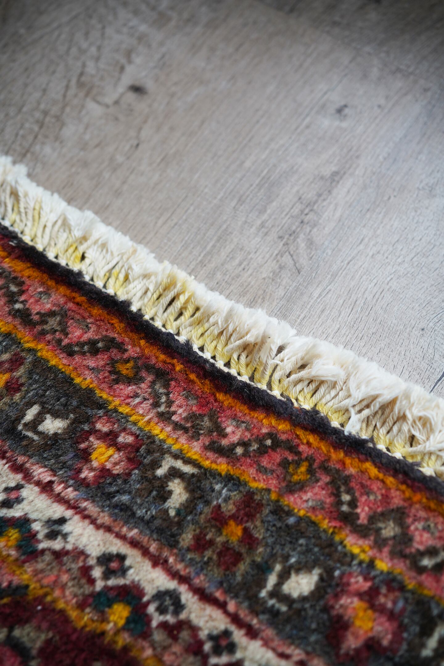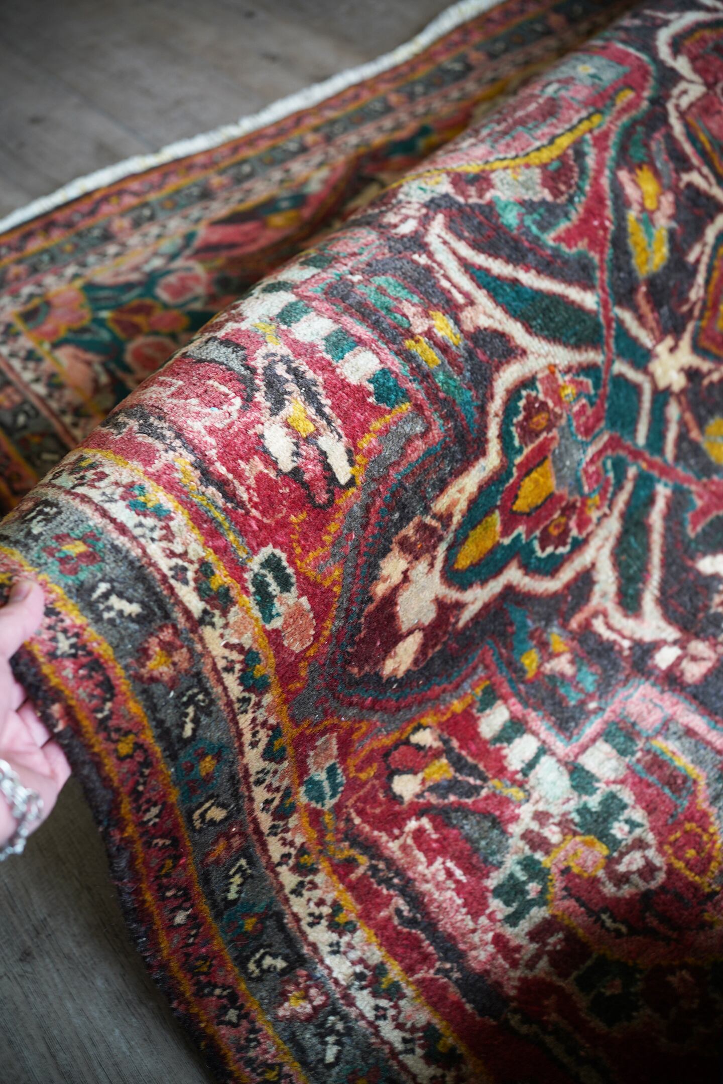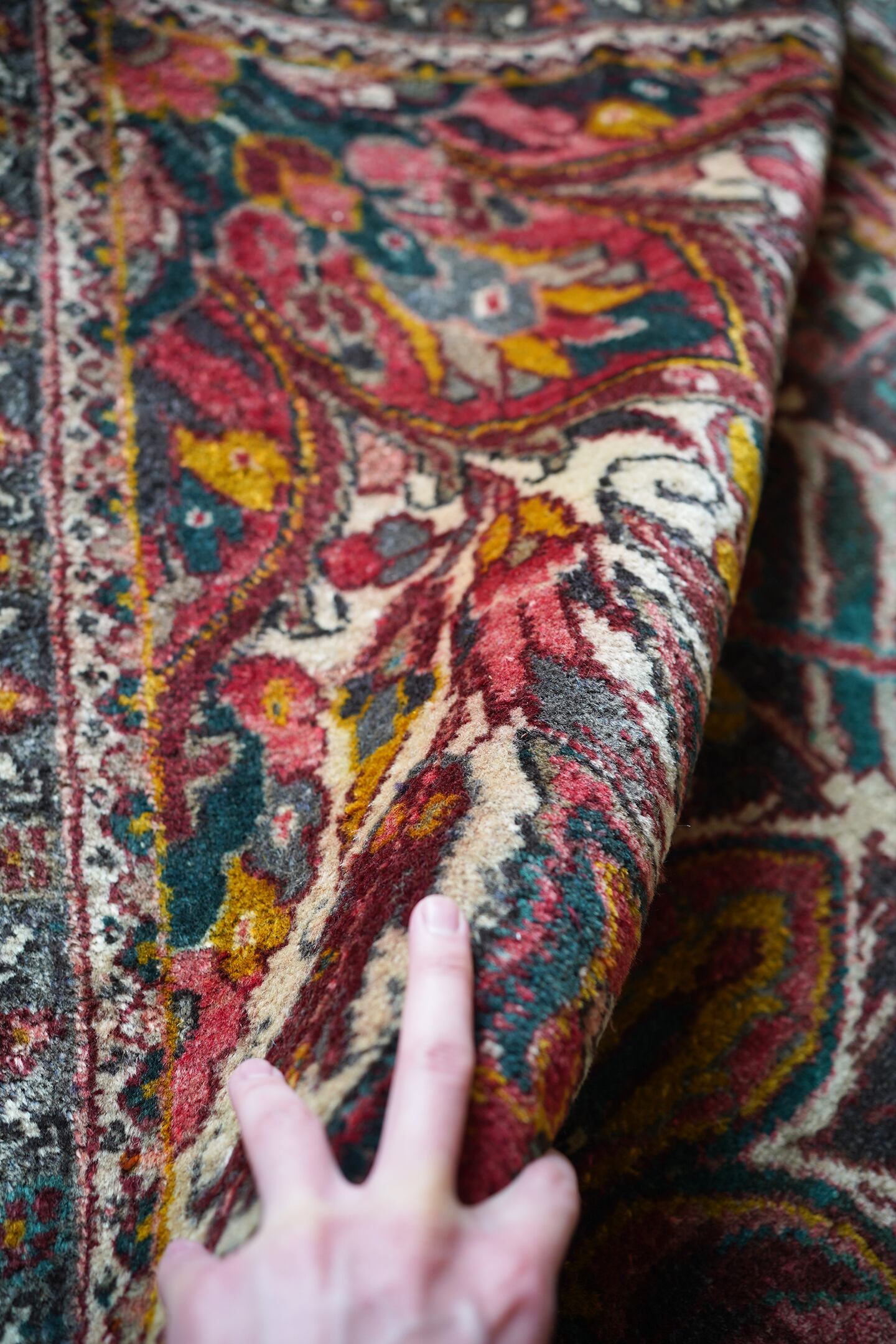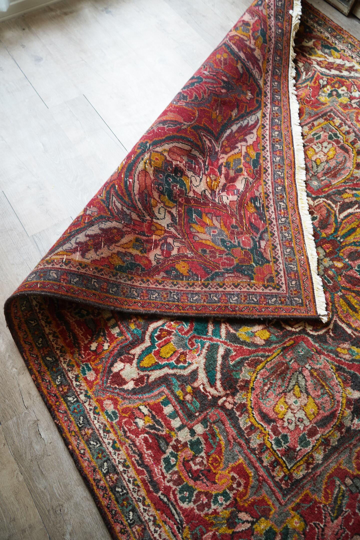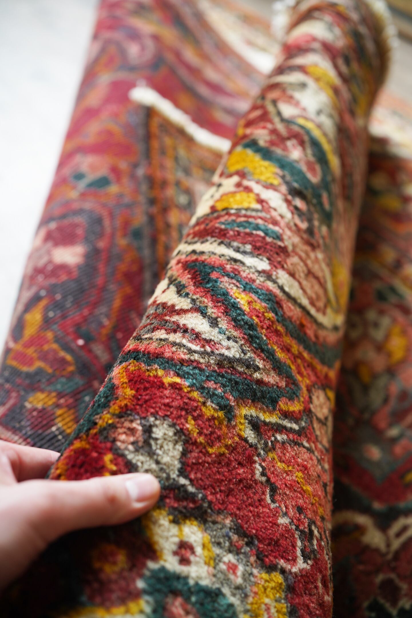 約100年前のイラン・タブリーズ産のアンティークラグ。絵画のようなタッチで描かれた花模様はまさにアート。配色は深い赤色をベースに淡いピンクや黄土色、グリーンなどが使われています。こちらのラグは元々9平米ほどの大きさで、ボロボロになった周りの部分をカットし、綺麗にリサイズして今に受け継がれたお品です。厚みは1.3cm程で、ふわサラッとした優しい肌触り。重さもあり、がっしりとした耐久性に優れた印象の質感となります。コンディションとしてはフリンジに少々の色移り、また一部パイルがすり減って薄くなっている箇所がございます(お写真最後の2枚をご参照ください)。存在感のあるラグで、リビングが華やかなること間違いなしです♪