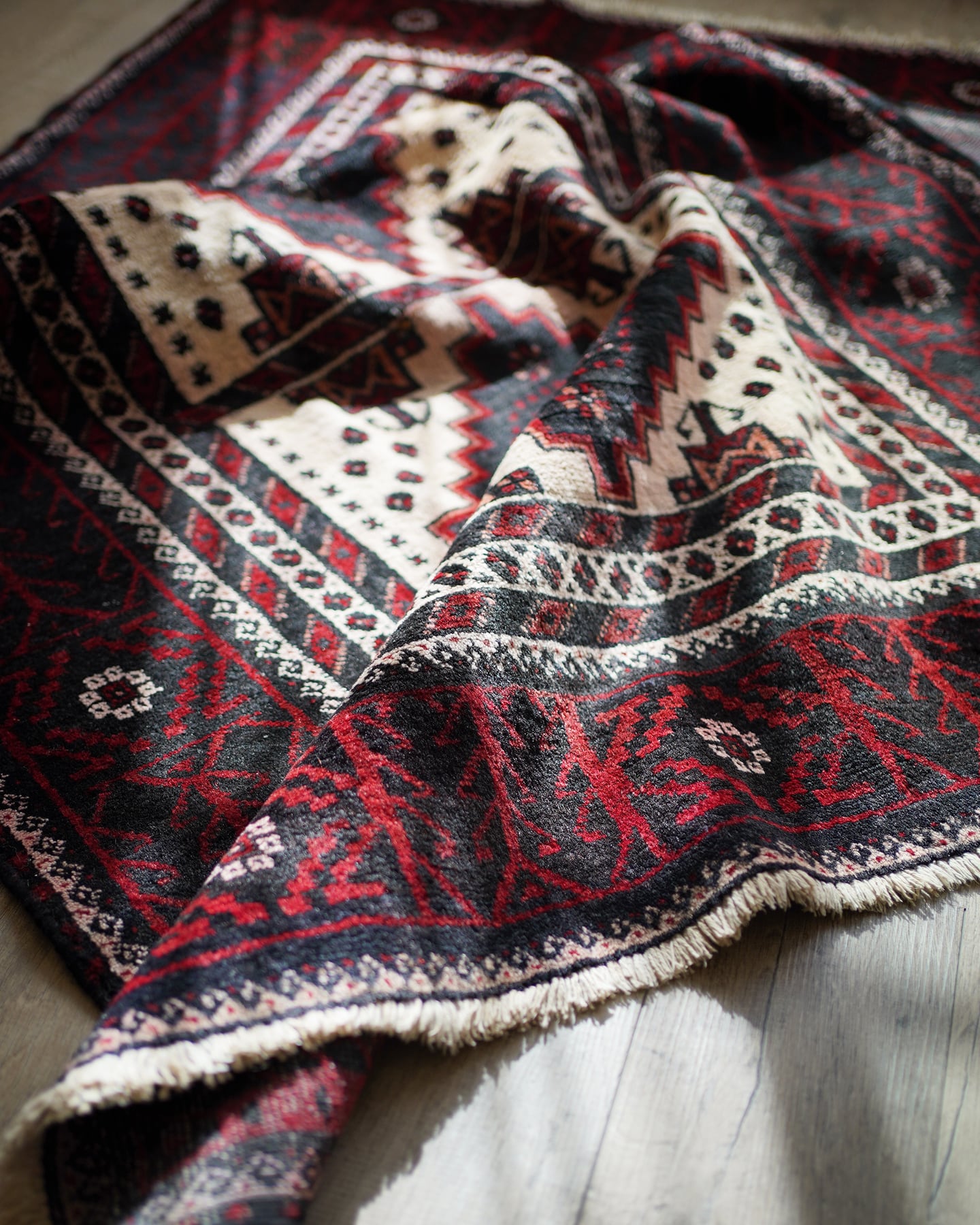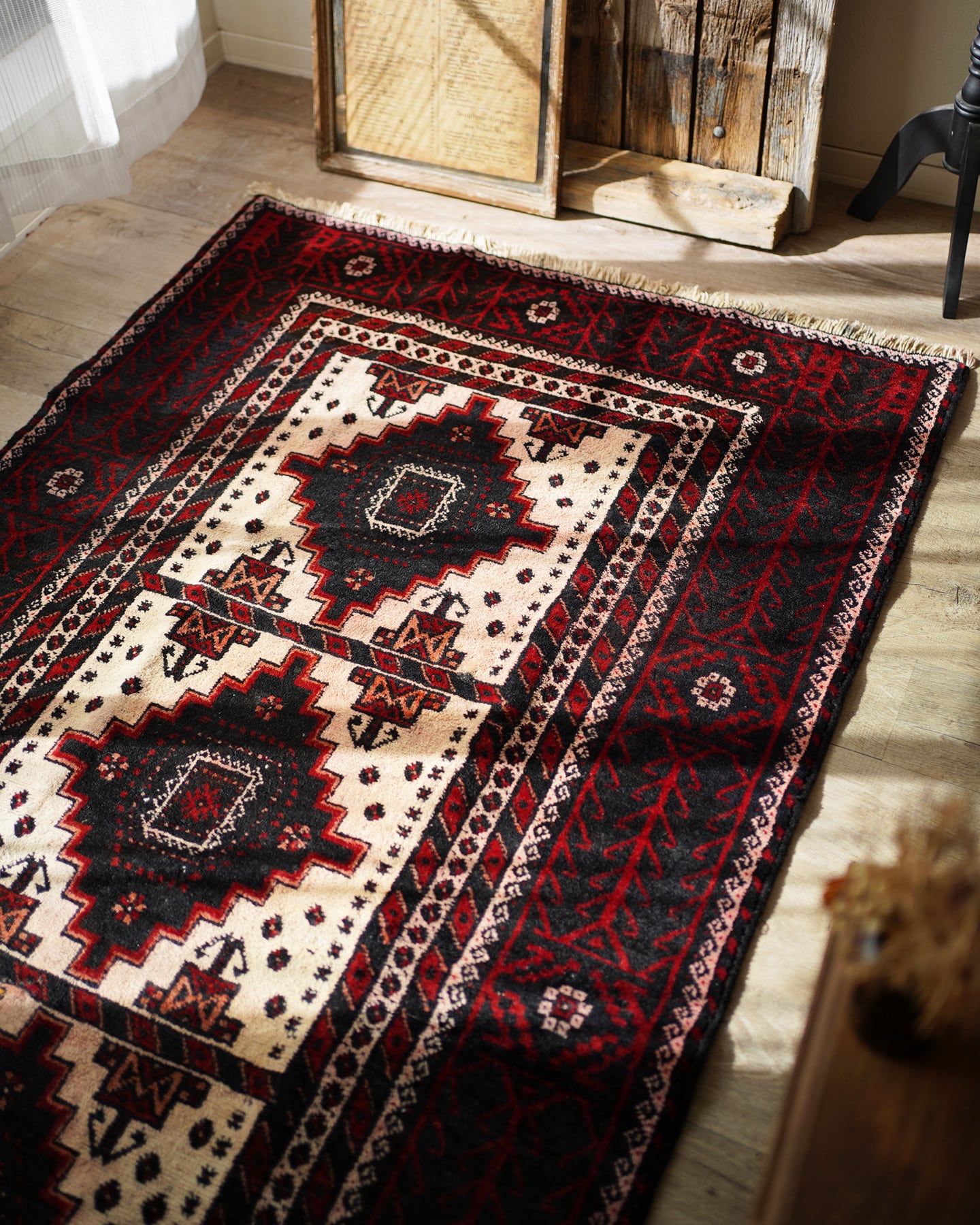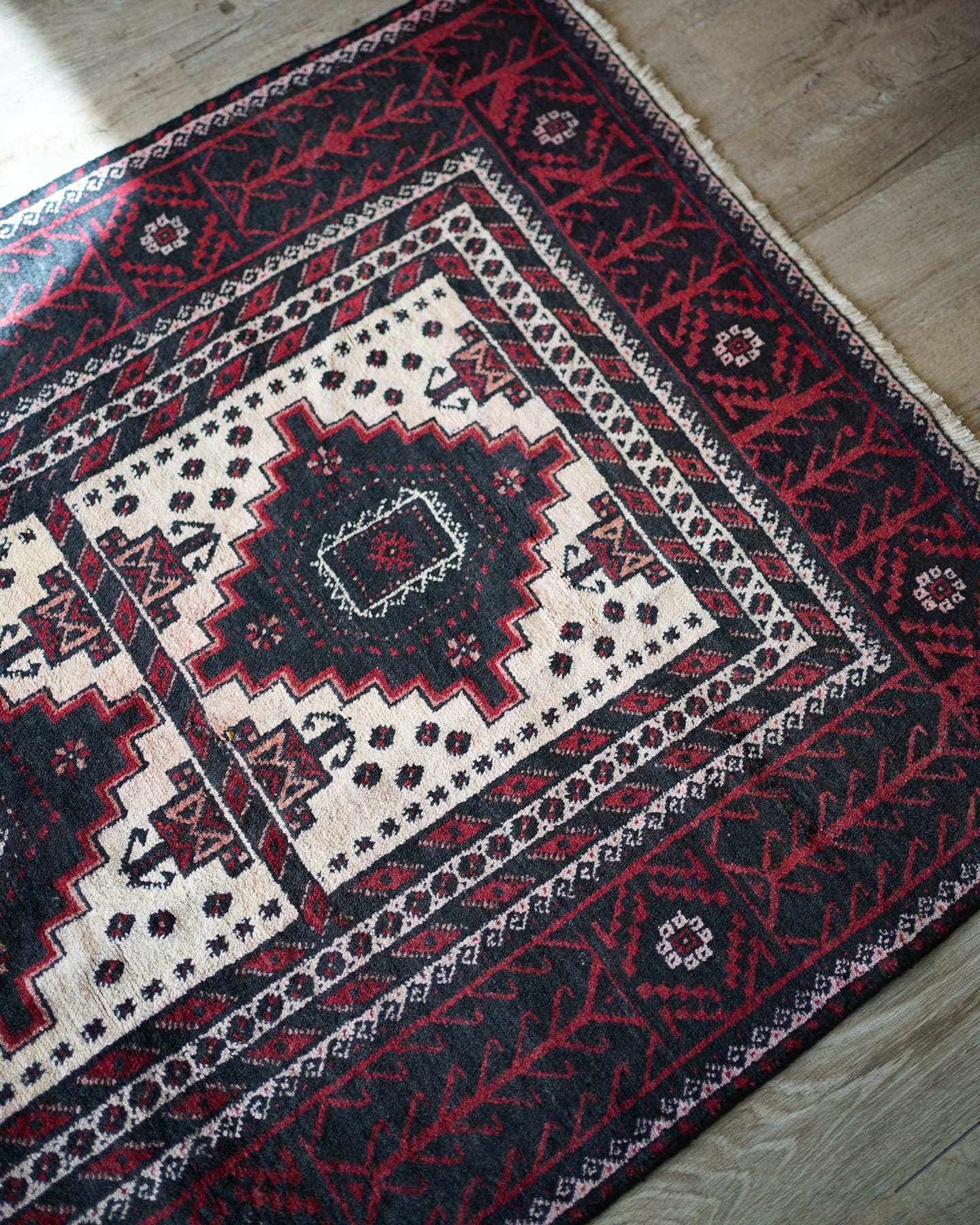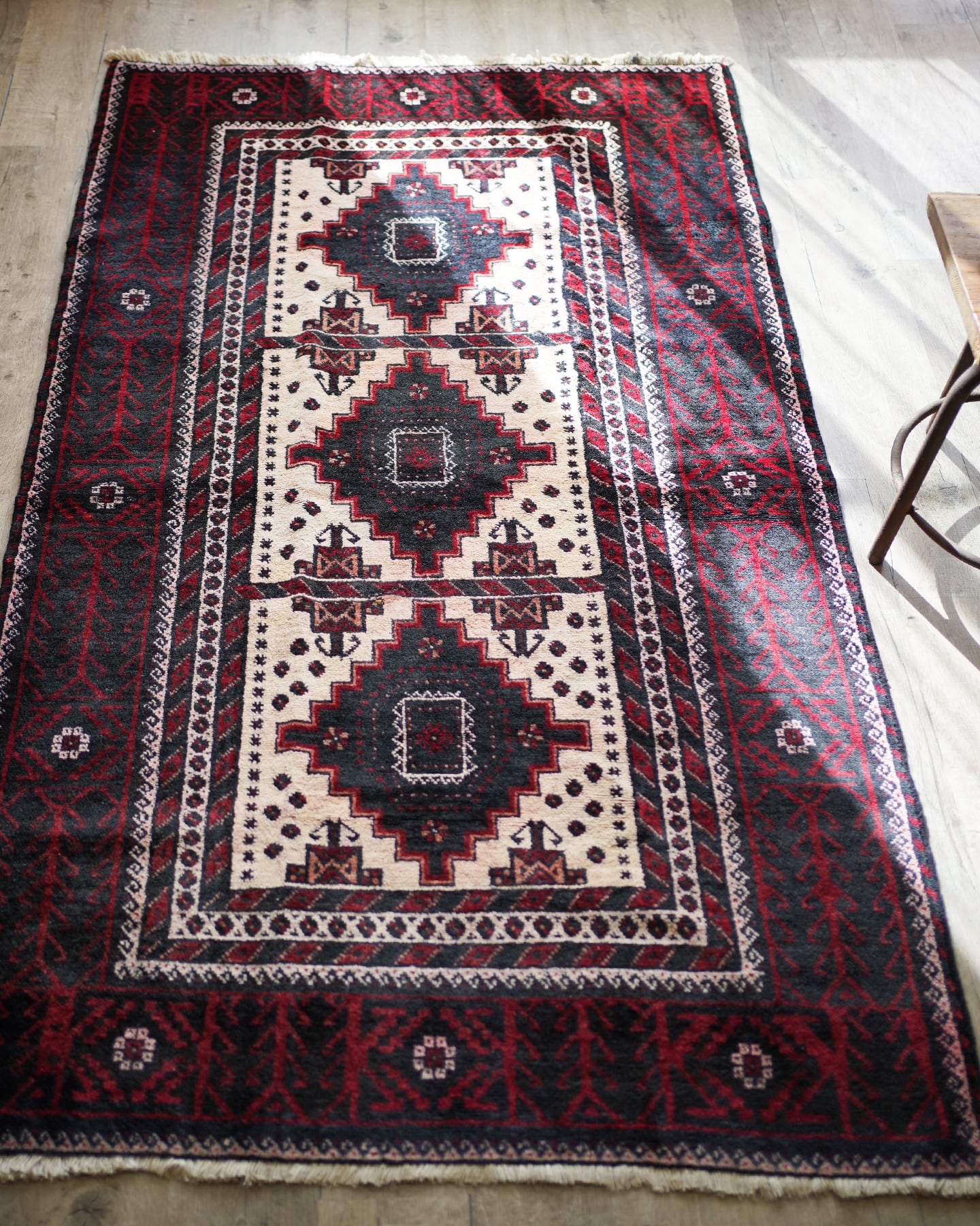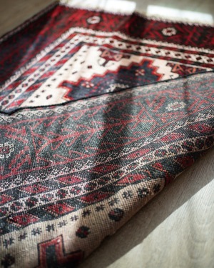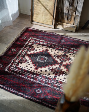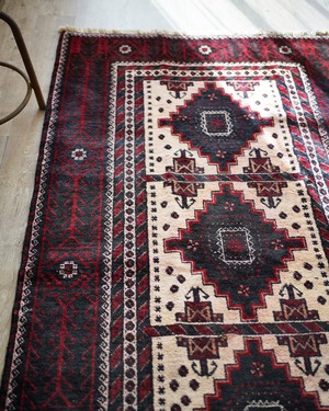 経年40-50年のバルーチラグ。赤・黒・白のコントラストが素敵で、ボーダーの黒と赤の部分は光の当たり具合で艶も見受けられます。フィールドの白部分が赤色の色移りによって、薄らとピンク色になっている箇所がございます。サラッとすべすべした滑らかな触り心地で、毛並みは8mm程度と程よい厚みがございます。全体的なコンディションとしては補修跡もなく、大変良好です。ソファ前などのリビング・ダイニングに使いやすいサイズ感です♫