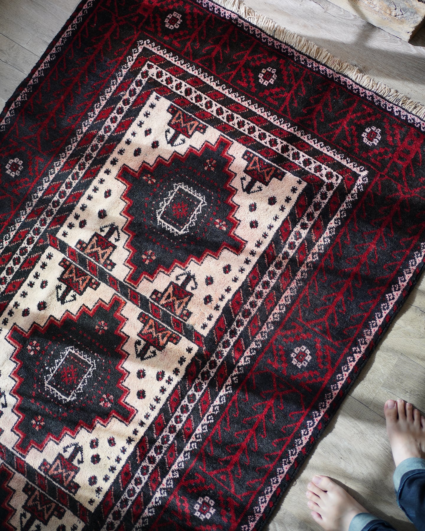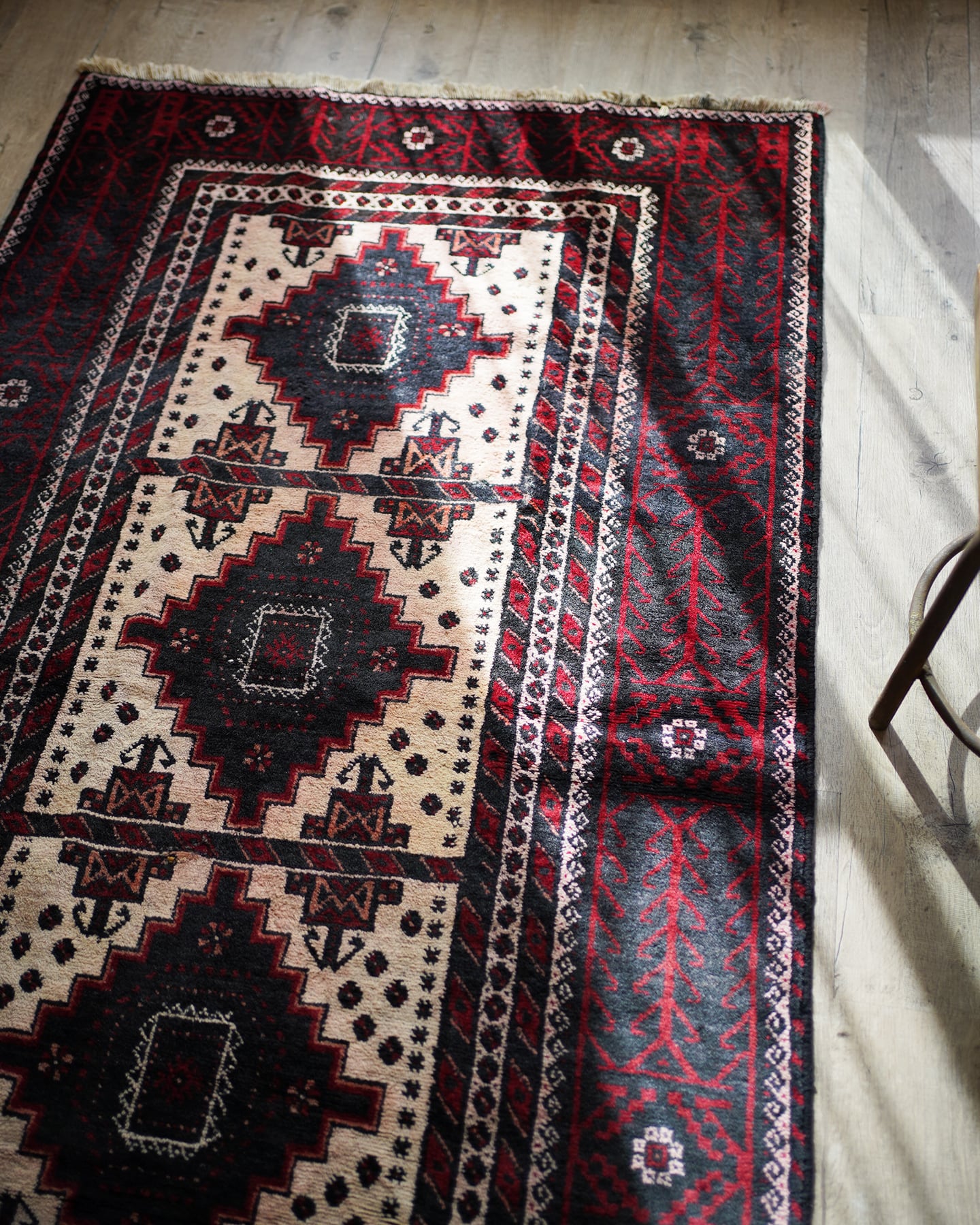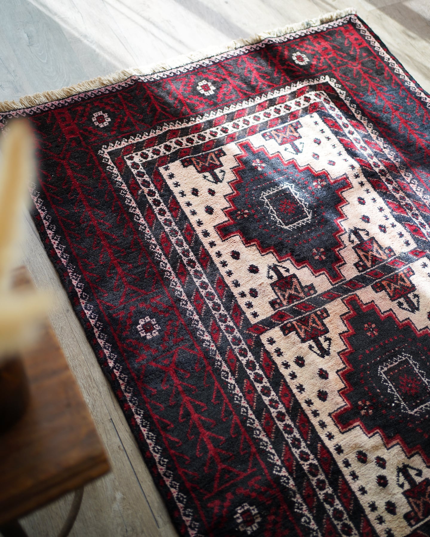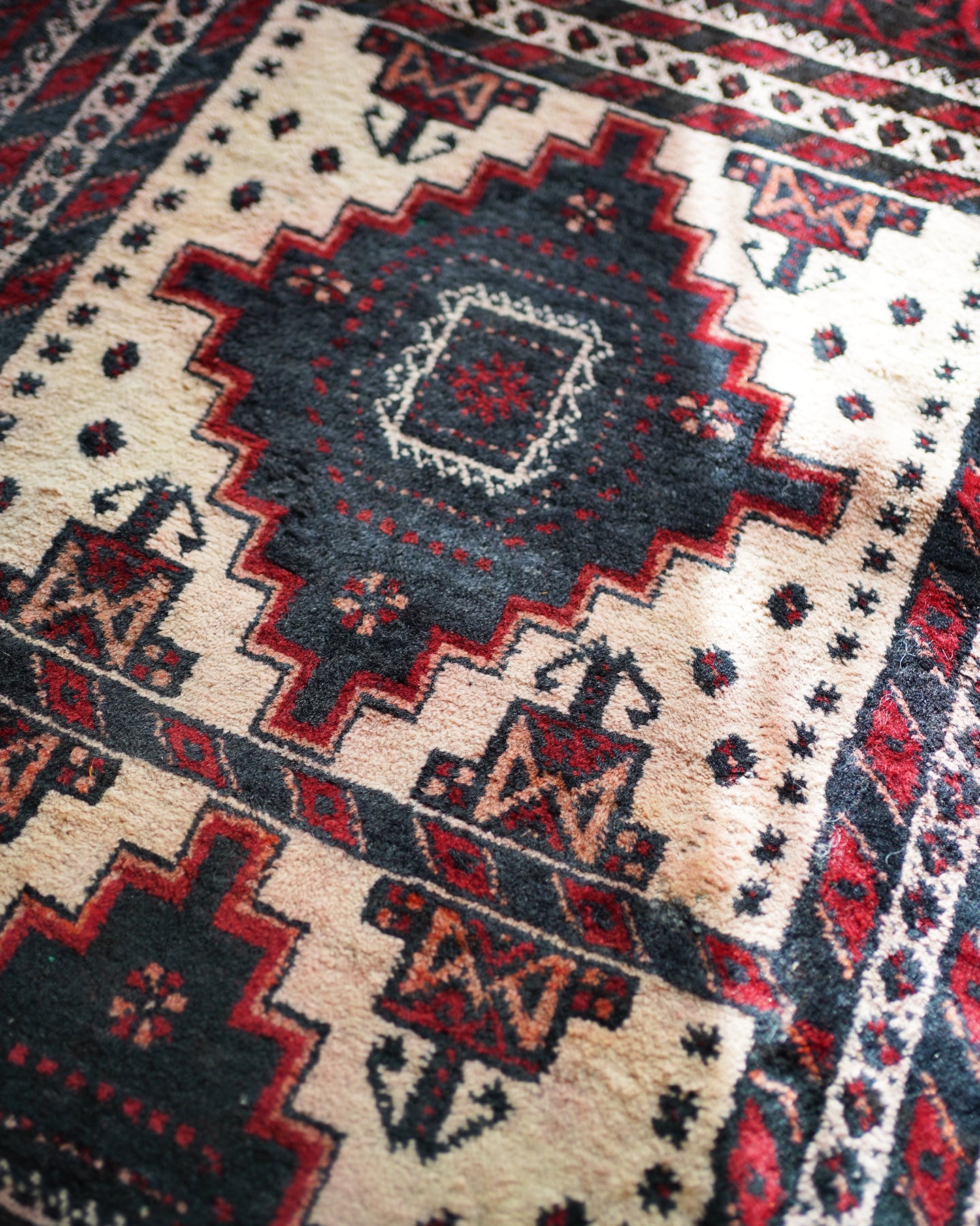 経年40-50年のバルーチラグ。赤・黒・白のコントラストが素敵で、ボーダーの黒と赤の部分は光の当たり具合で艶も見受けられます。フィールドの白部分が赤色の色移りによって、薄らとピンク色になっている箇所がございます。サラッとすべすべした滑らかな触り心地で、毛並みは8mm程度と程よい厚みがございます。全体的なコンディションとしては補修跡もなく、大変良好です。ソファ前などのリビング・ダイニングに使いやすいサイズ感です♫