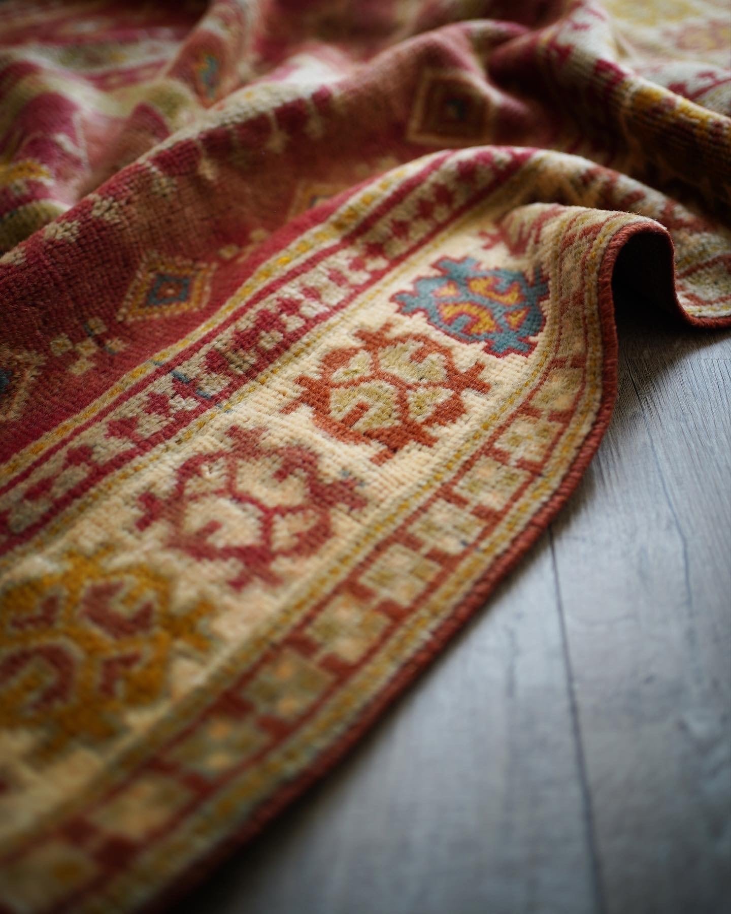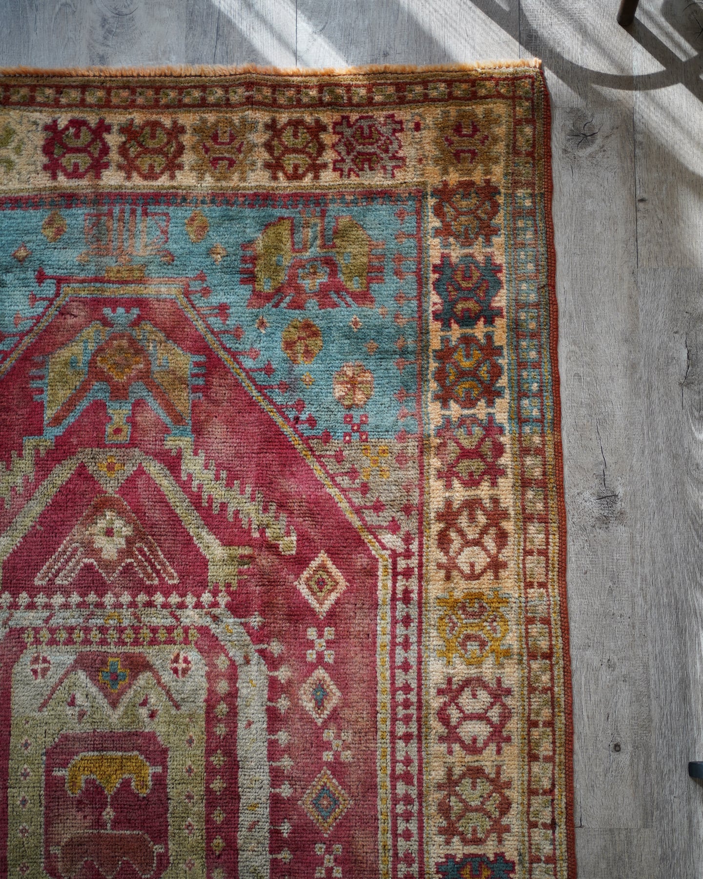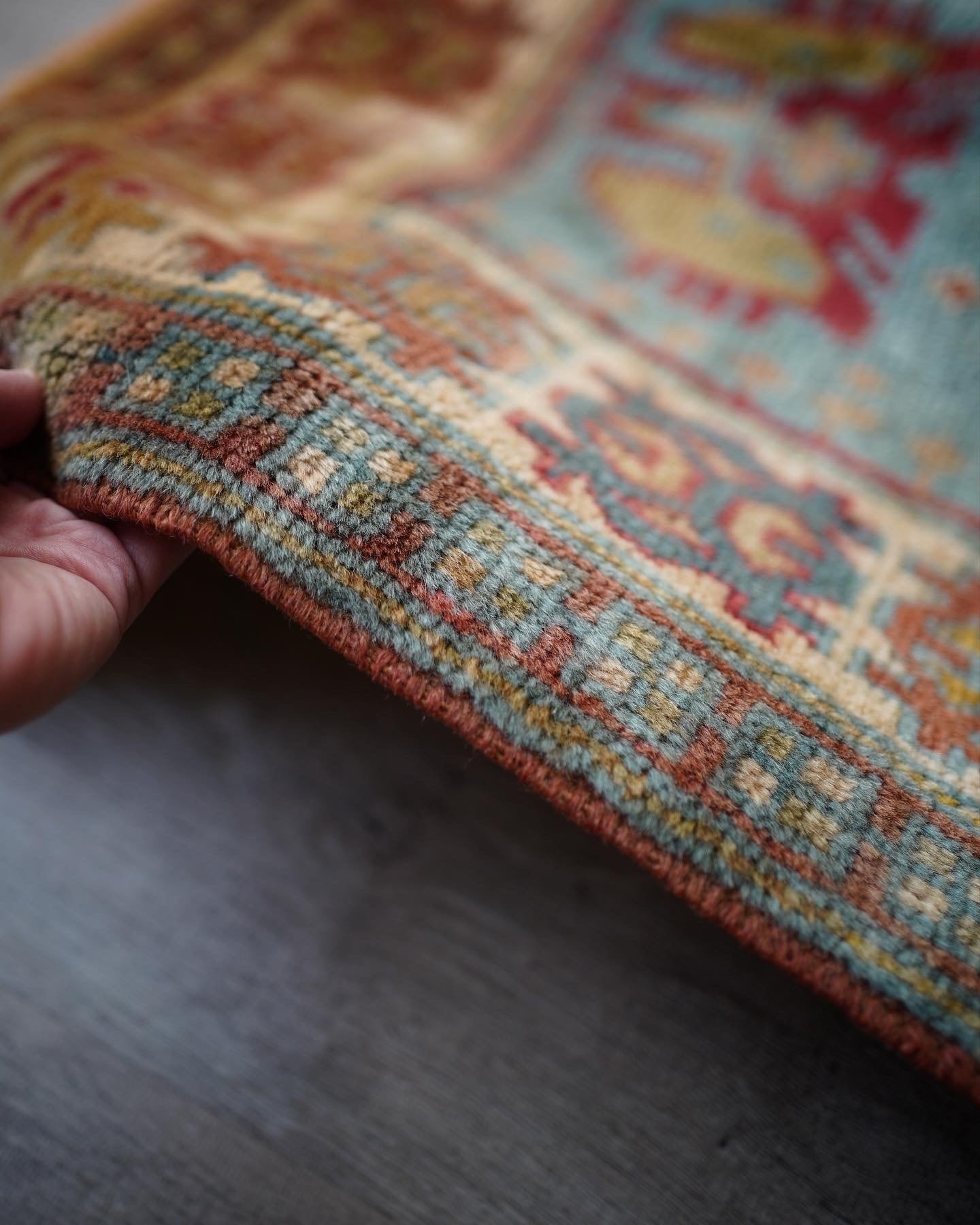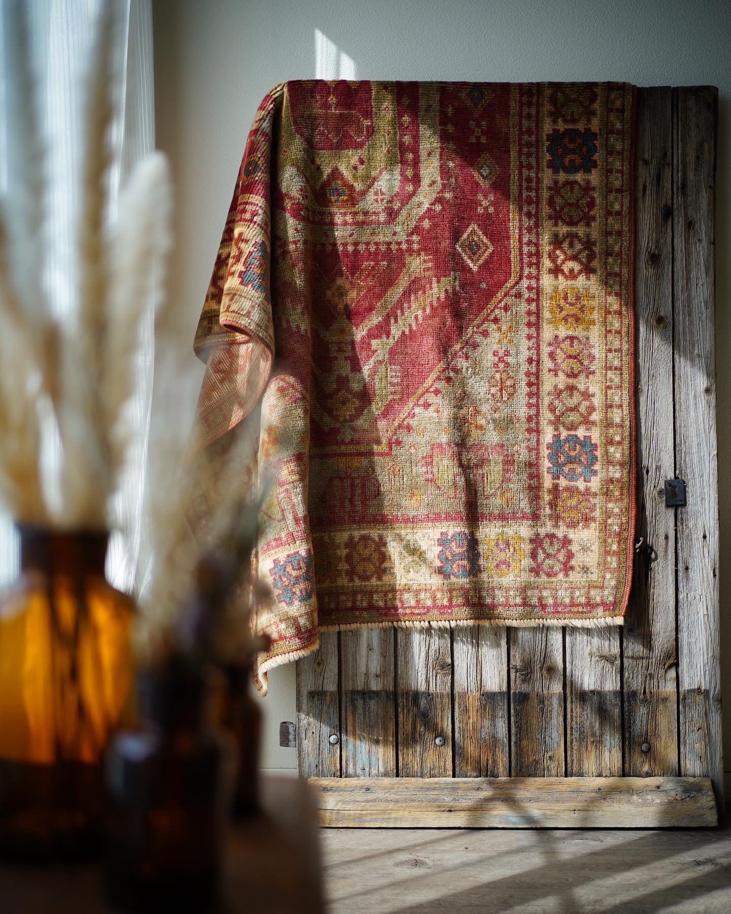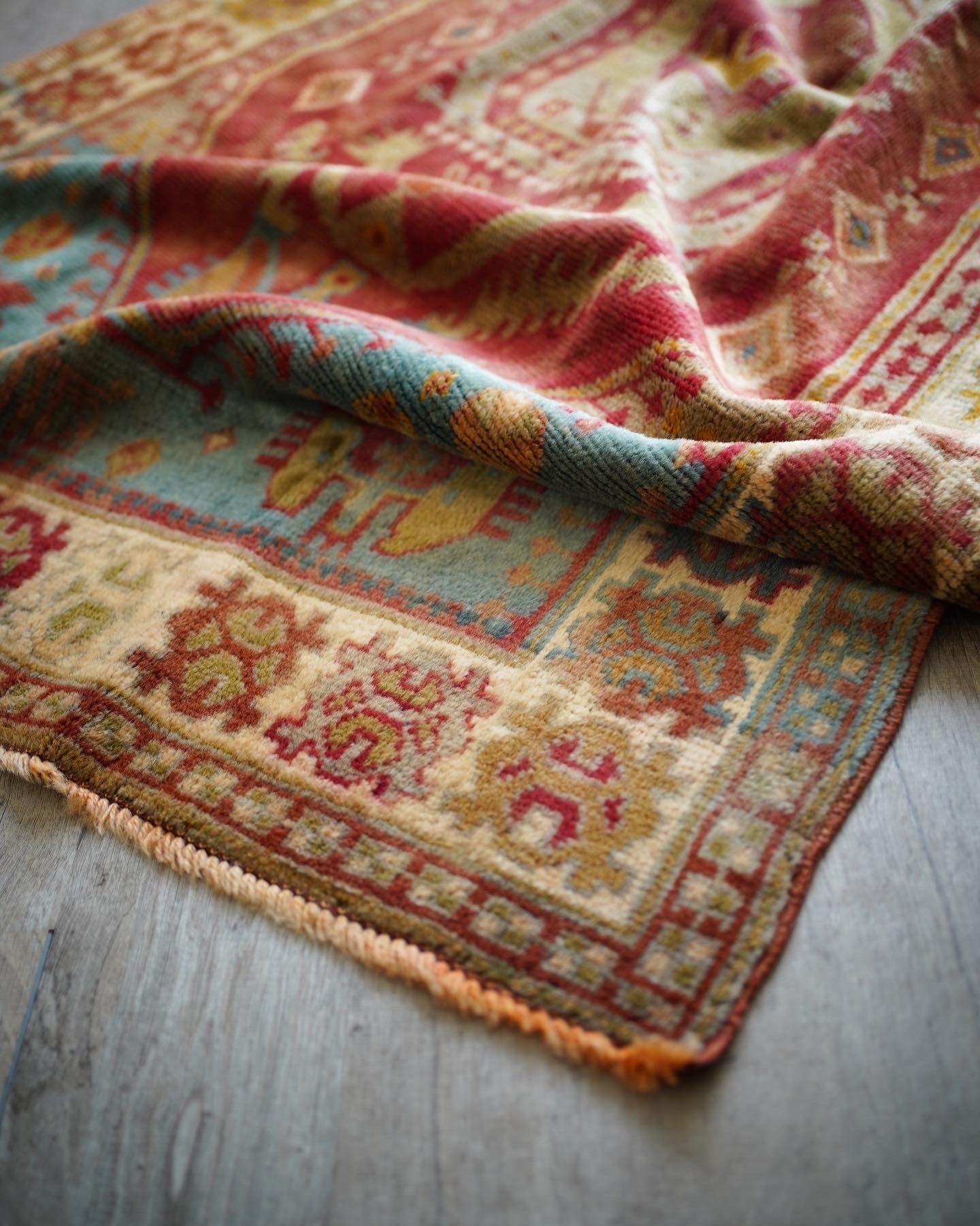 トルコ、イラン、イラクなどの国境地域に住むクルド族によって織られた経年60年ほどのクルディッシュラグ。ベージュと黄土色の中間ぐらいの色味で一部フィールドの部分にブルーグリーンの異なる色味の糸を使っているところも素敵です。また見る角度や方向によって変わった色合いを醸し出します。毛並みは5〜6mm程度で薄めですが、つるっと滑らかで優しい肌触り。生地全体は柔らかくも少し張りがあるタイプです。アースカラーなので、どんな場所にも自然に馴染む、使い勝手の良い一枚♫ 目立った補修跡もなくコンディションも大変良好です。