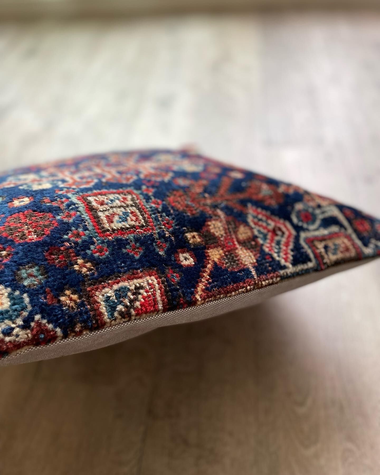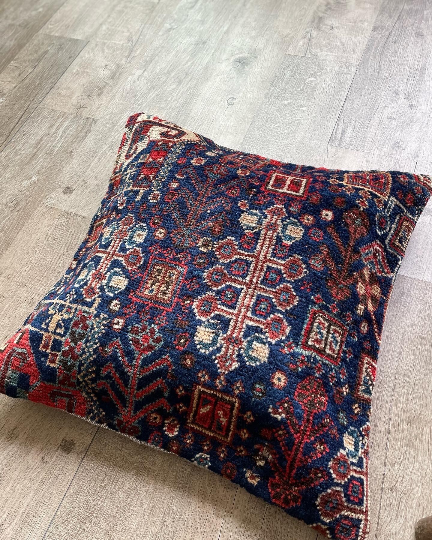 おおよそ100年〜120年前にイランのシラーズで織られたラグから作製されたクッションカバー。家族の長寿・健康や子供の成長への願いが込められた“生命の樹”の紋様やカシュカイ族やハムセ族に見られるメダリオンも見切れていますが、見受けられます。深く輝くようなネイビーの色味が美しい一枚です。