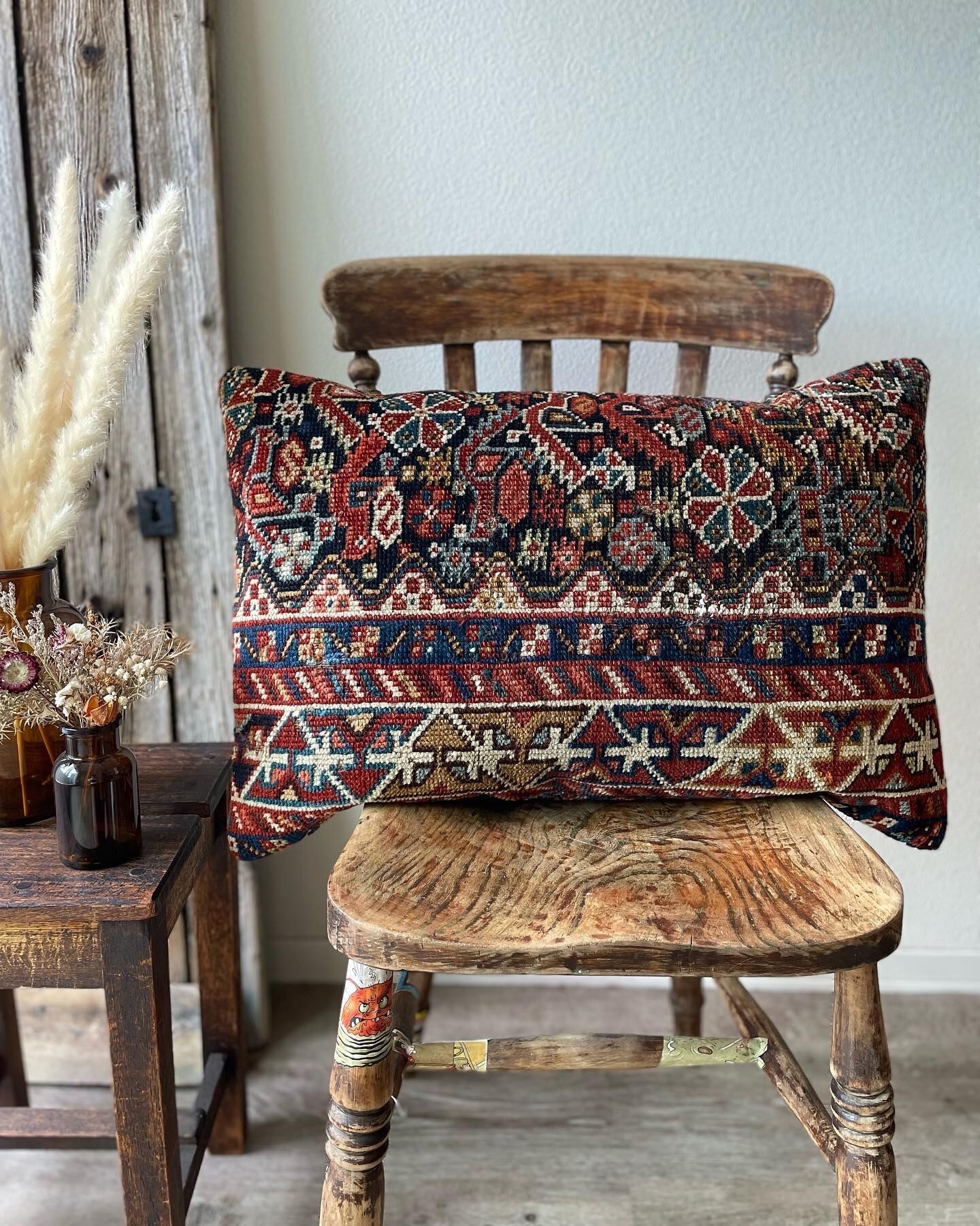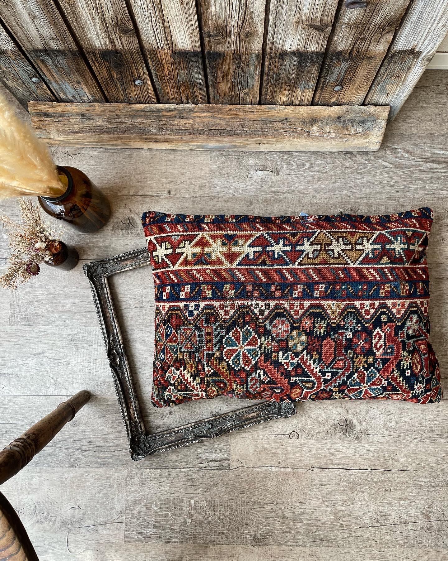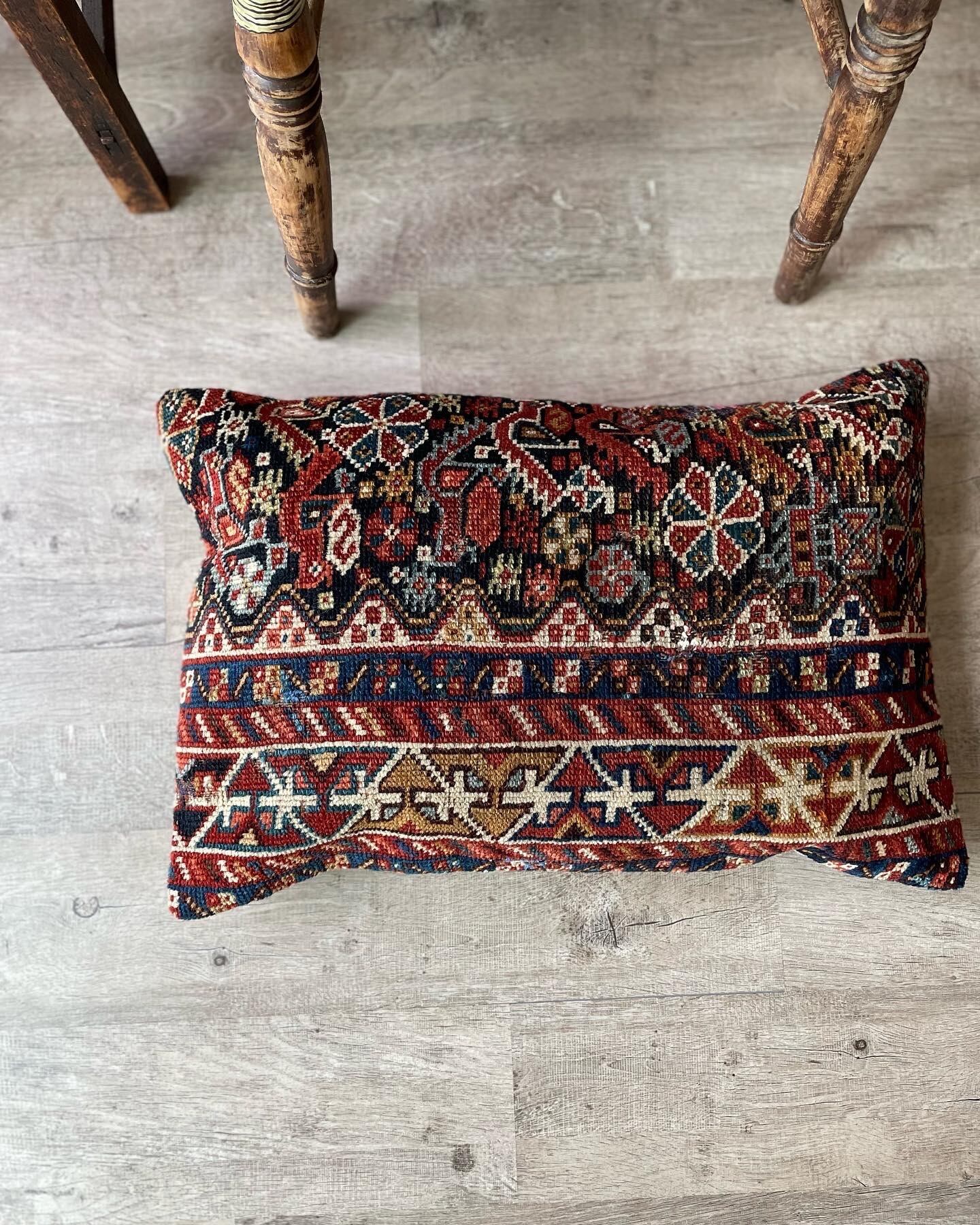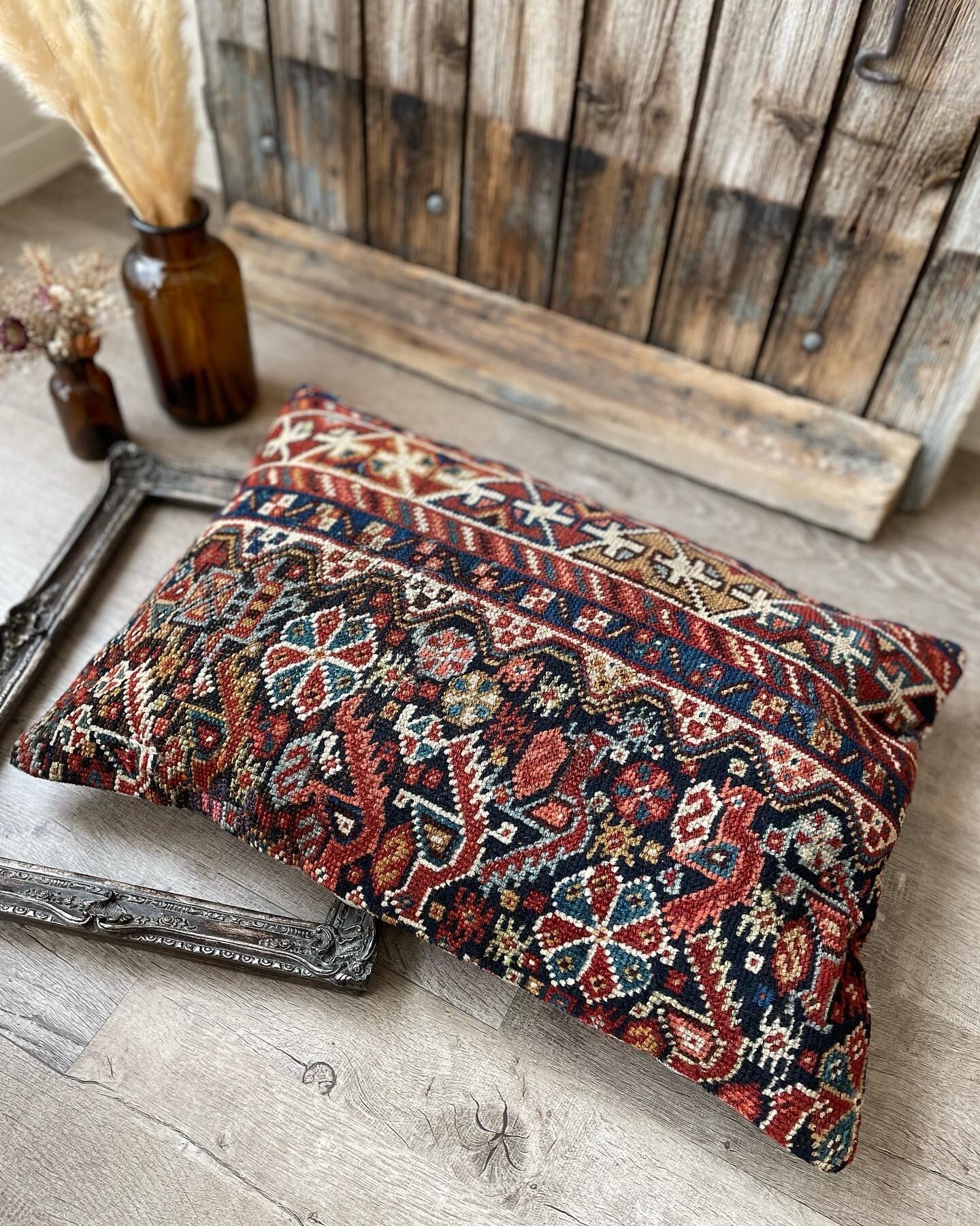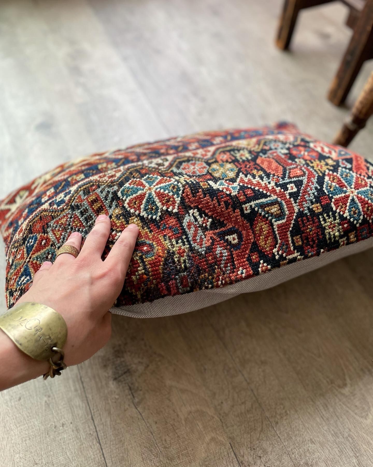 おおよそ100年〜120年前にイランのシラーズで織られたラグから作製されたクッションカバー。鳥やヤギなどの動物紋様をはじめ、魔除を意味する狼の足跡など、複雑で繊細なデザインと深い色彩が大変魅力的な1枚です。