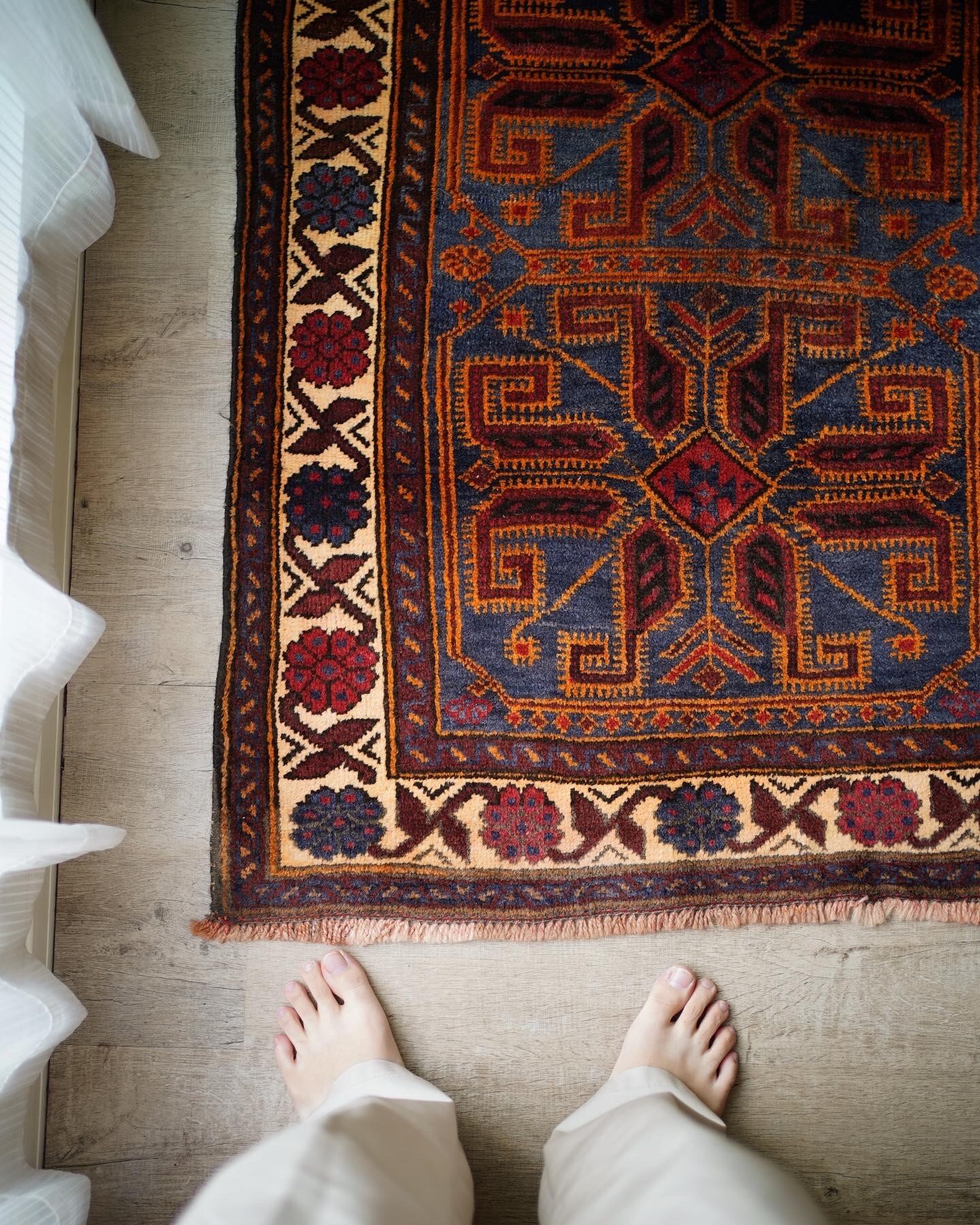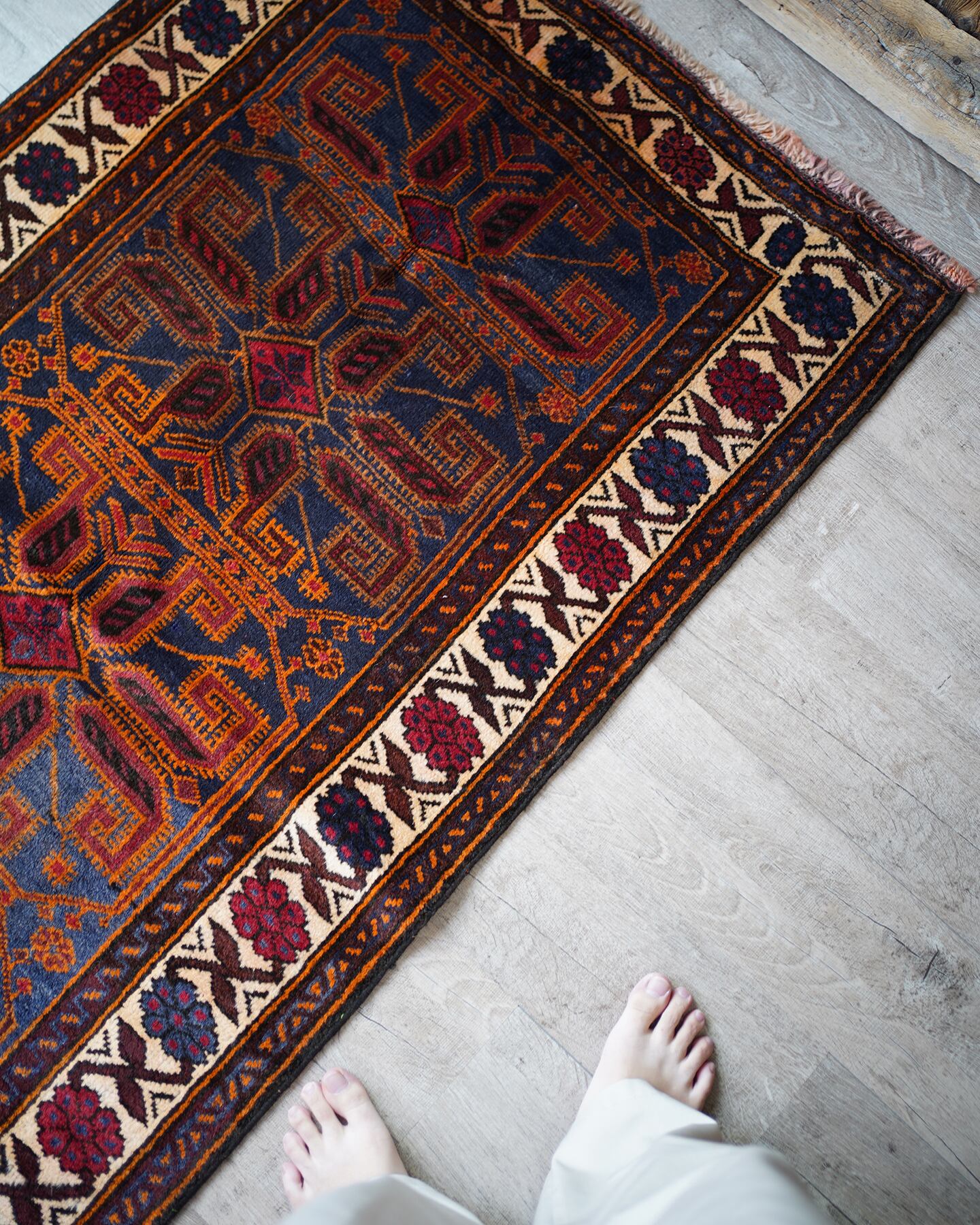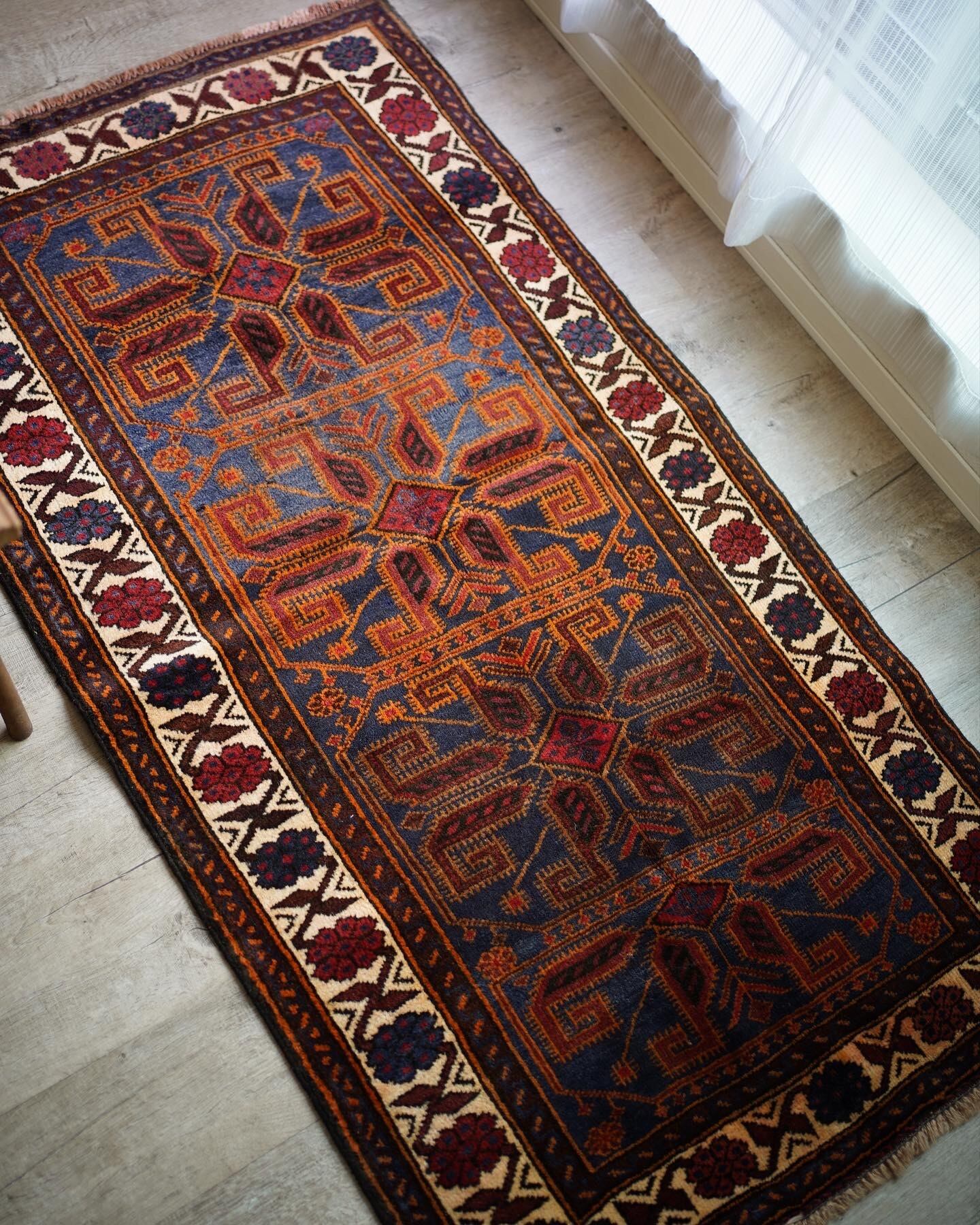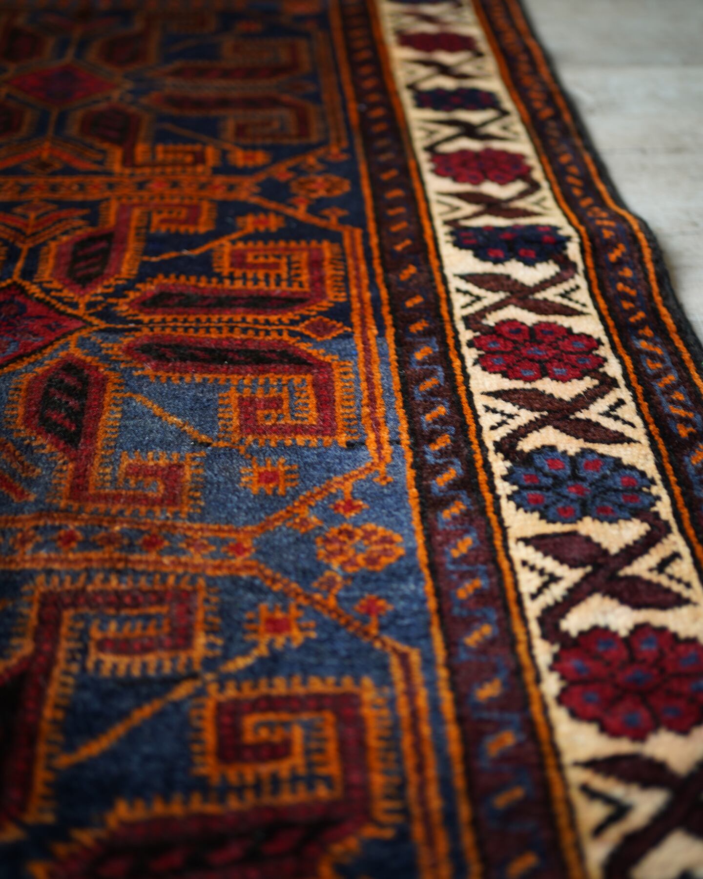 しなやかで滑らかな肌触りのアフガンバルーチラグです。フィールドの色味は真ん中を境に深いネイビーと色褪せたネイビーで少し色味が異なっているのもポイント。ボーダーには花の紋様が連続しています。一部補修したような箇所がありますが、よく見ないと全くわからないほど丁寧に補修されています。全体的にもコンディション良好で、パイルも8mmほどあるため、程よい厚みがあります♫