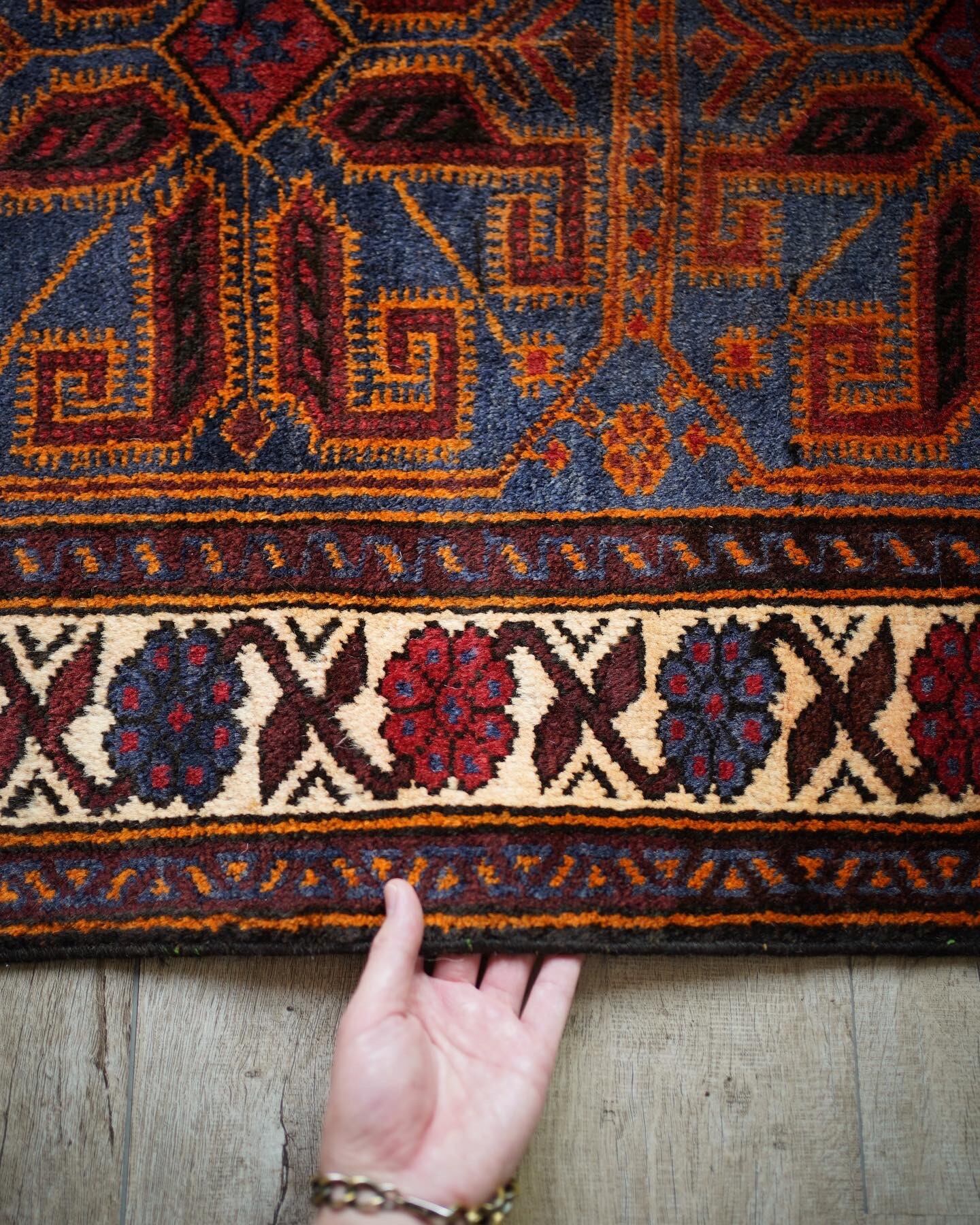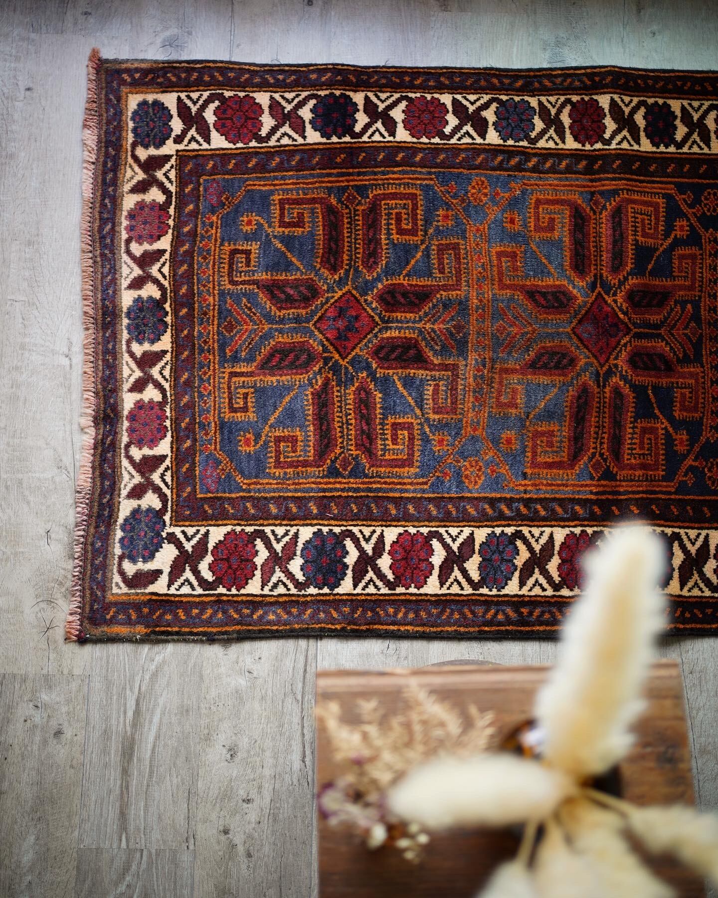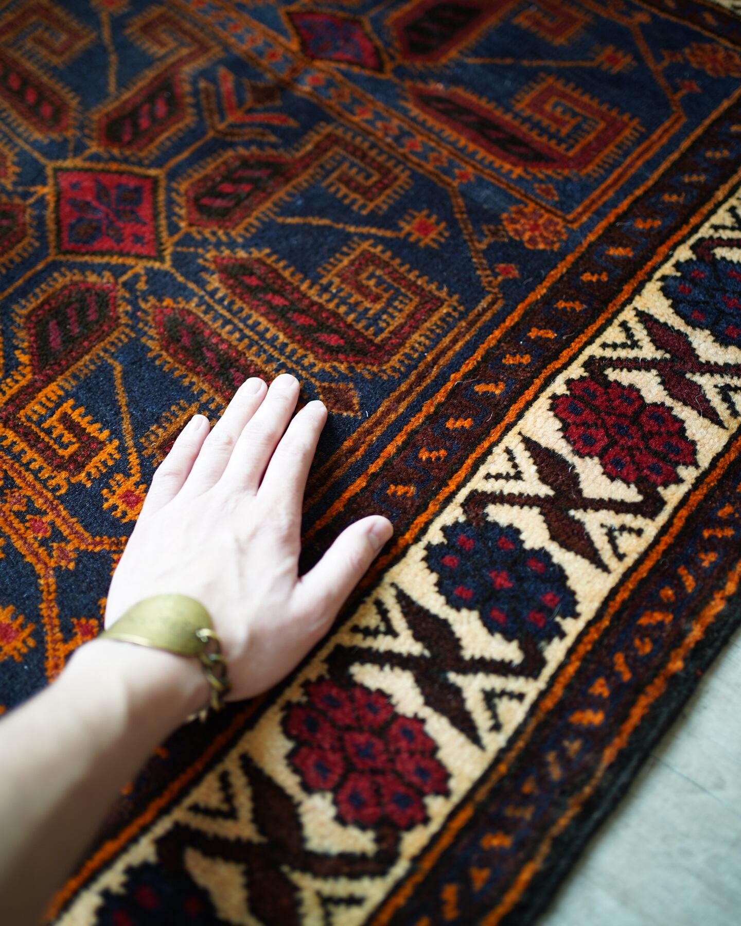 しなやかで滑らかな肌触りのアフガンバルーチラグです。フィールドの色味は真ん中を境に深いネイビーと色褪せたネイビーで少し色味が異なっているのもポイント。ボーダーには花の紋様が連続しています。一部補修したような箇所がありますが、よく見ないと全くわからないほど丁寧に補修されています。全体的にもコンディション良好で、パイルも8mmほどあるため、程よい厚みがあります♫