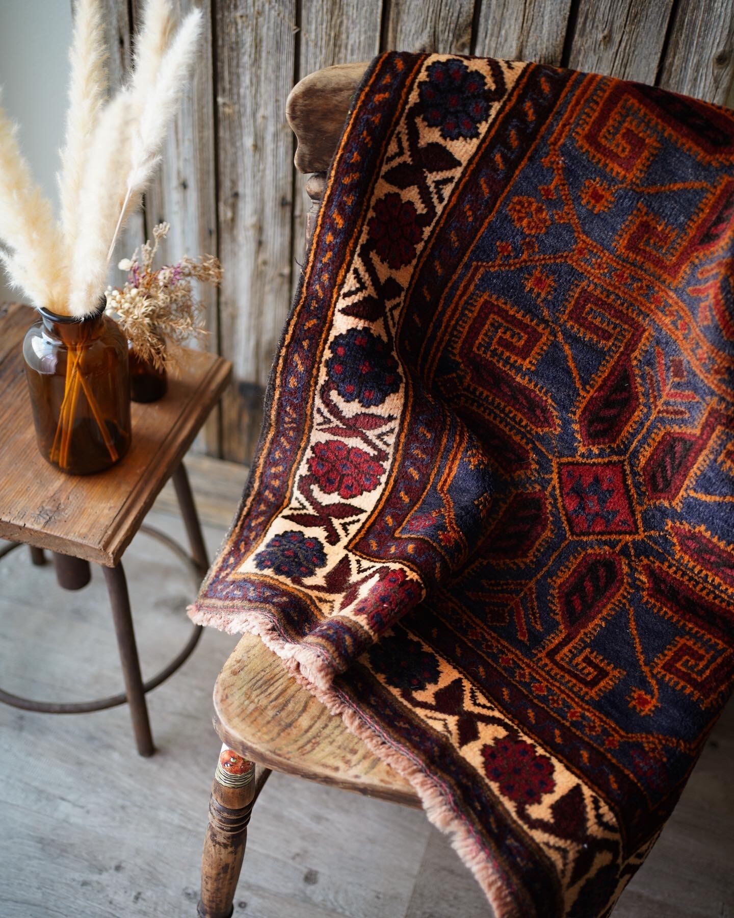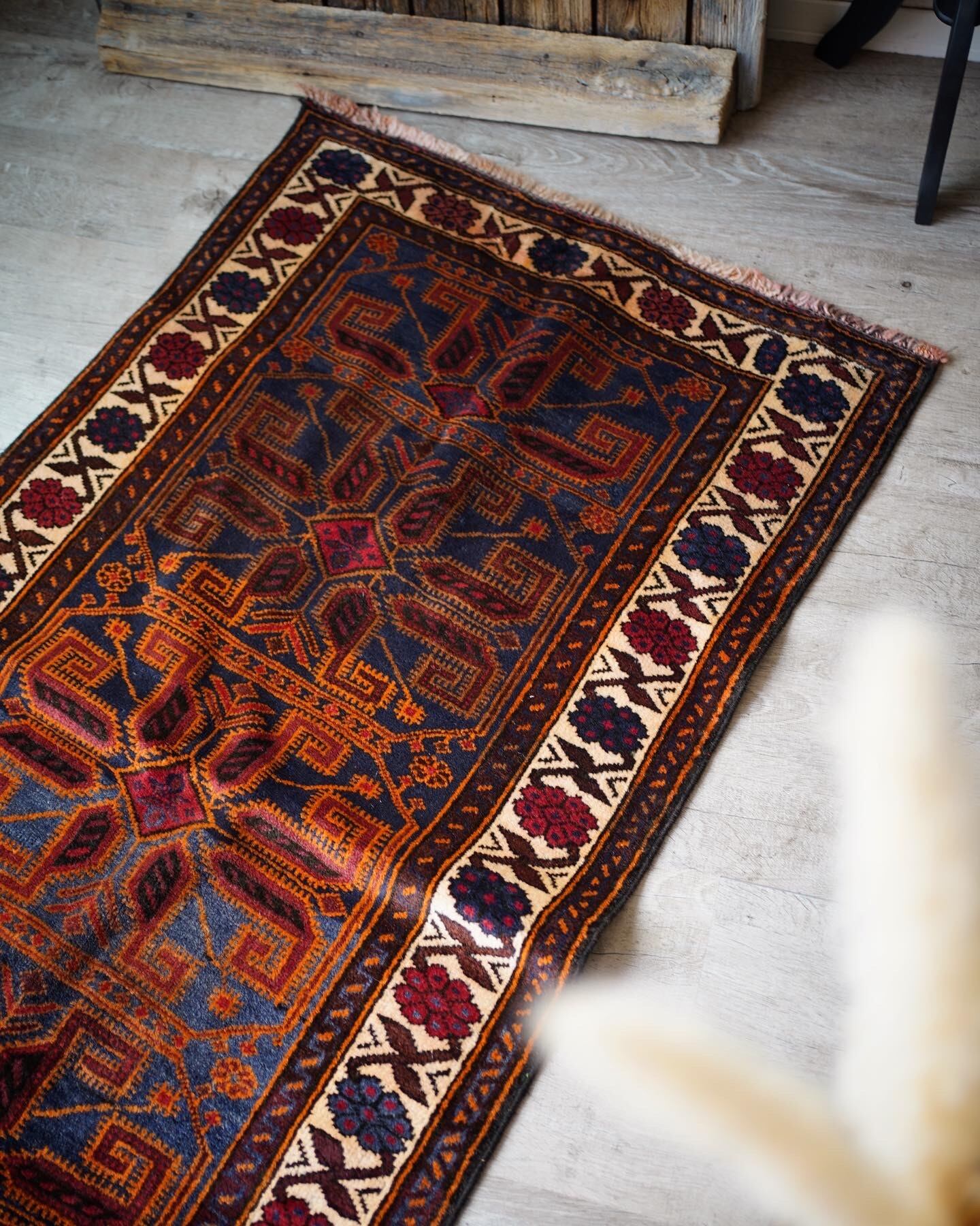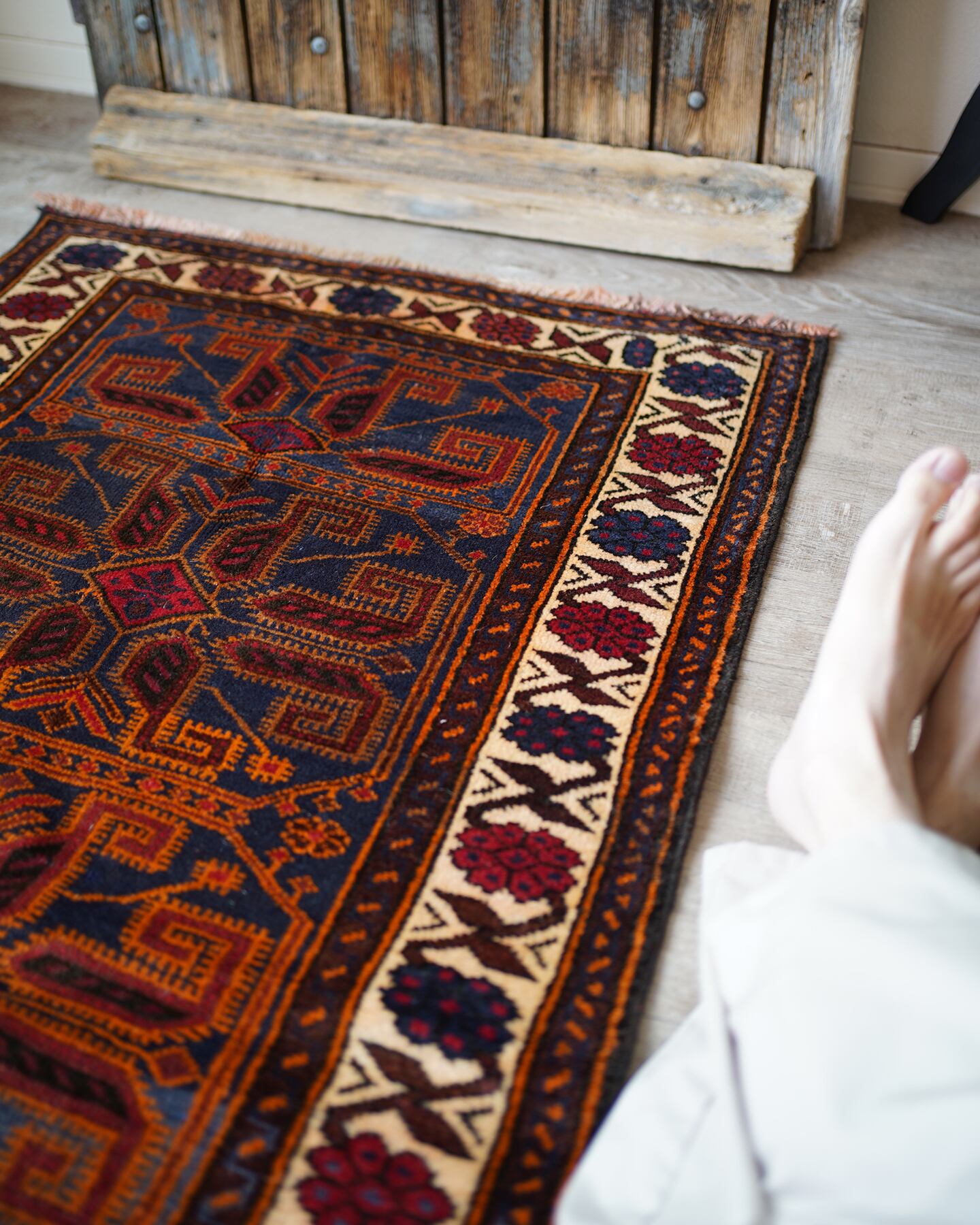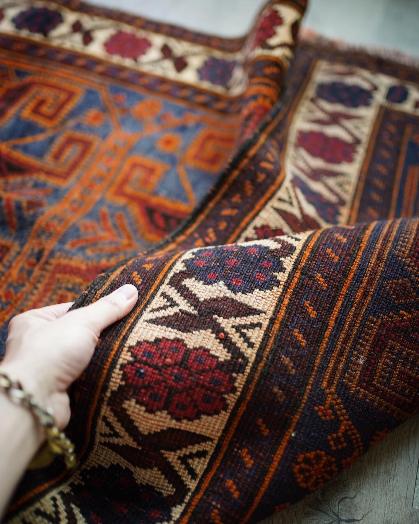 しなやかで滑らかな肌触りのアフガンバルーチラグです。フィールドの色味は真ん中を境に深いネイビーと色褪せたネイビーで少し色味が異なっているのもポイント。ボーダーには花の紋様が連続しています。一部補修したような箇所がありますが、よく見ないと全くわからないほど丁寧に補修されています。全体的にもコンディション良好で、パイルも8mmほどあるため、程よい厚みがあります♫