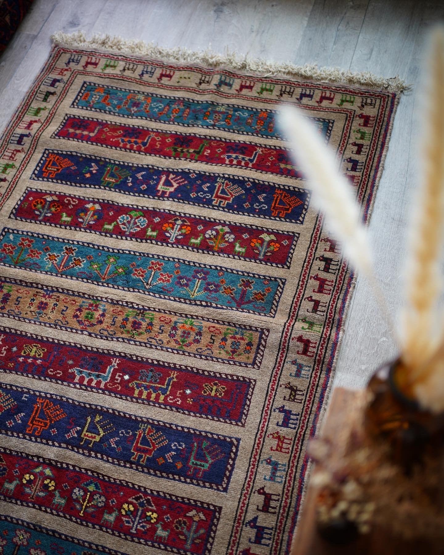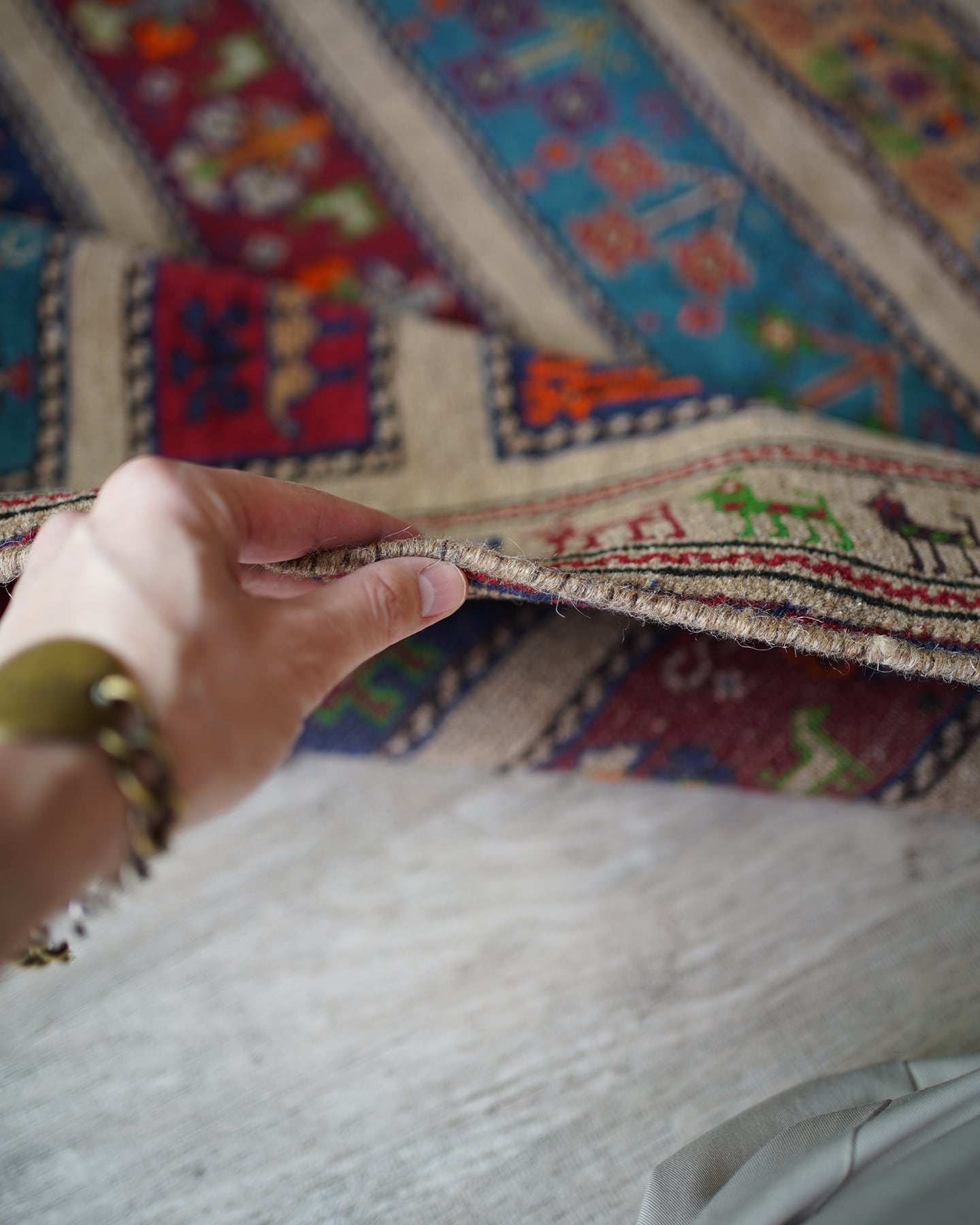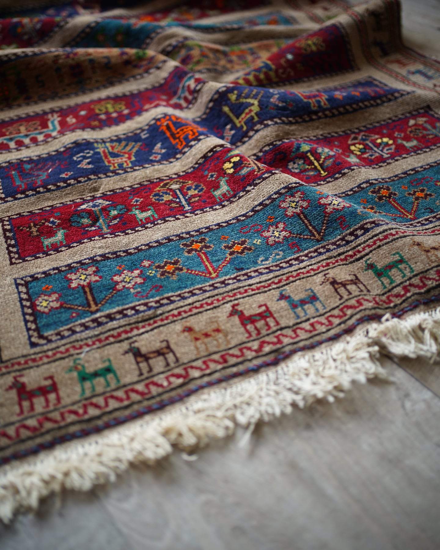 鳥や羊、花などの様々なカラフルな紋様が織られた可愛らしいバルーチラグ。ボーダーには鹿が整列しています。全体的にカラフルですが、ベースが薄めのブラウンなので、比較的落ち着いた雰囲気の一枚です。厚みは7mm〜8mm程度でサラッと柔らかい質感。ソファの前やベッドサイドなどにオススメです♪