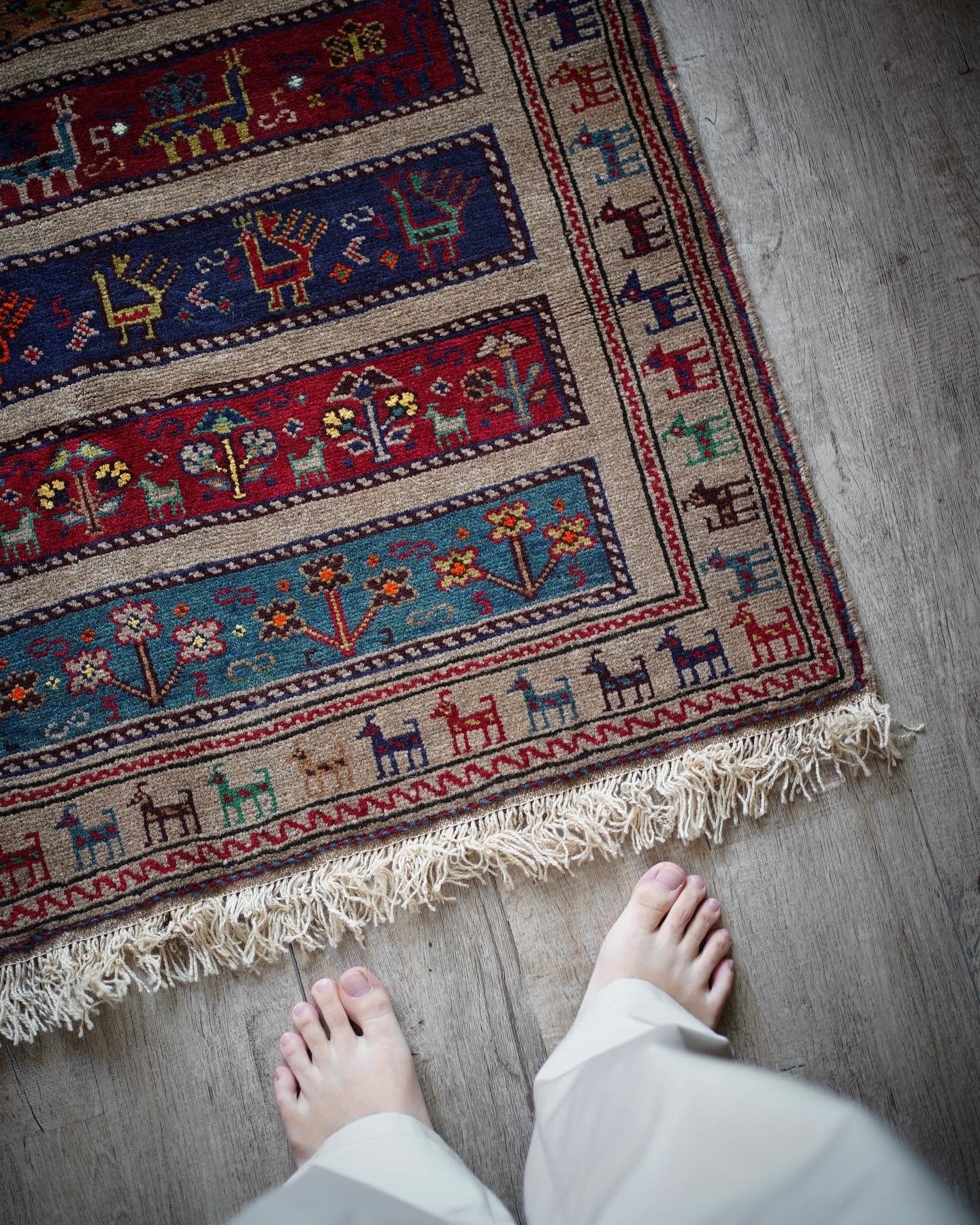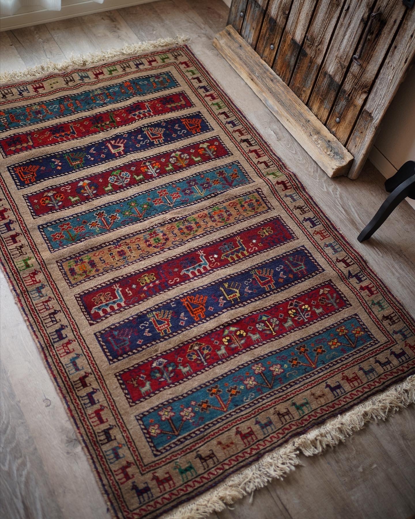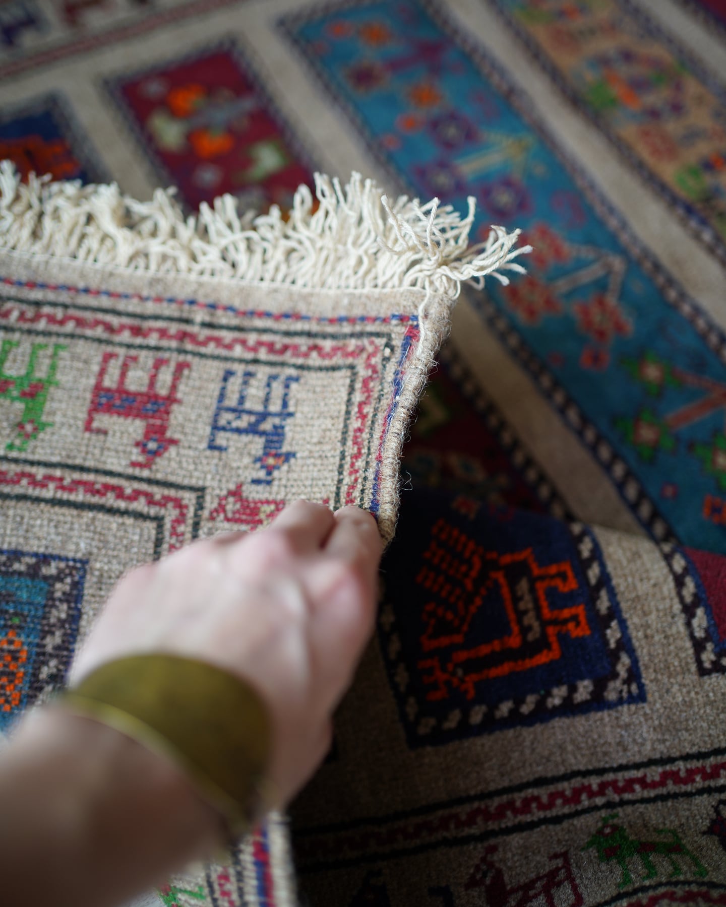 鳥や羊、花などの様々なカラフルな紋様が織られた可愛らしいバルーチラグ。ボーダーには鹿が整列しています。全体的にカラフルですが、ベースが薄めのブラウンなので、比較的落ち着いた雰囲気の一枚です。厚みは7mm〜8mm程度でサラッと柔らかい質感。ソファの前やベッドサイドなどにオススメです♪