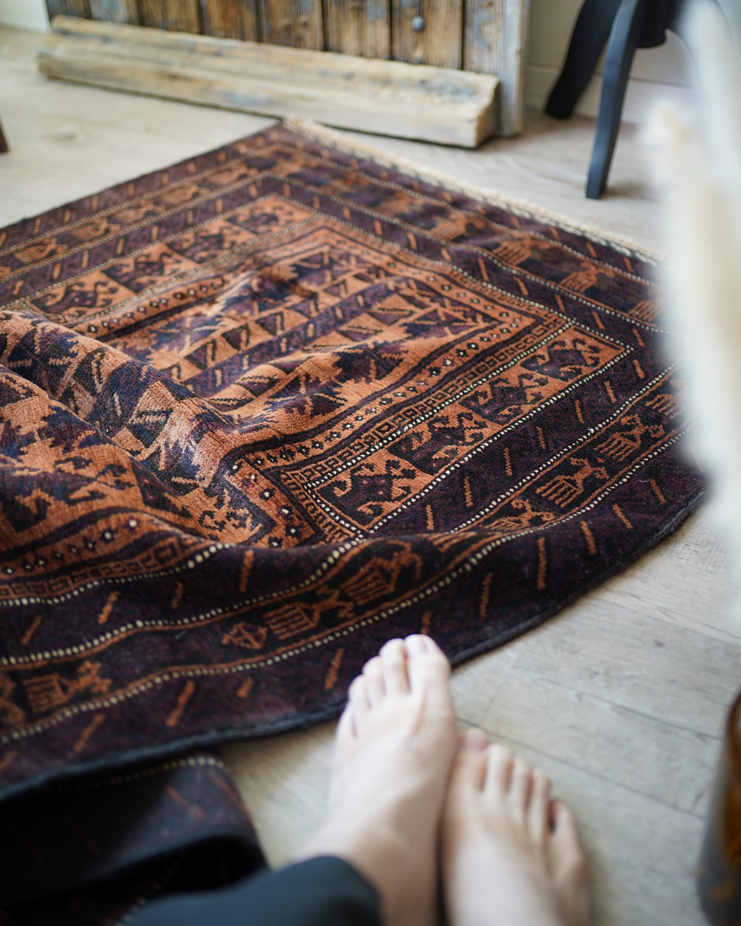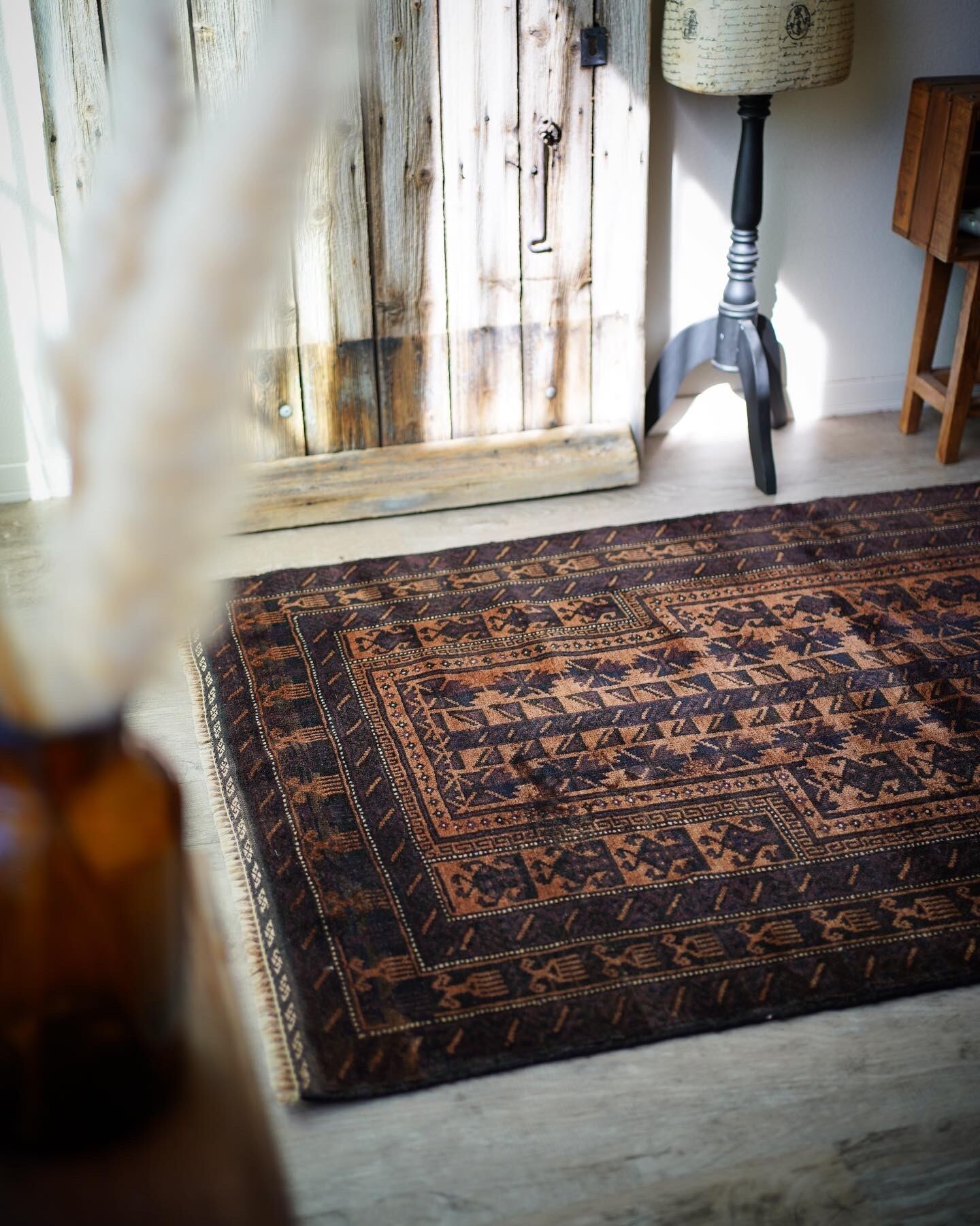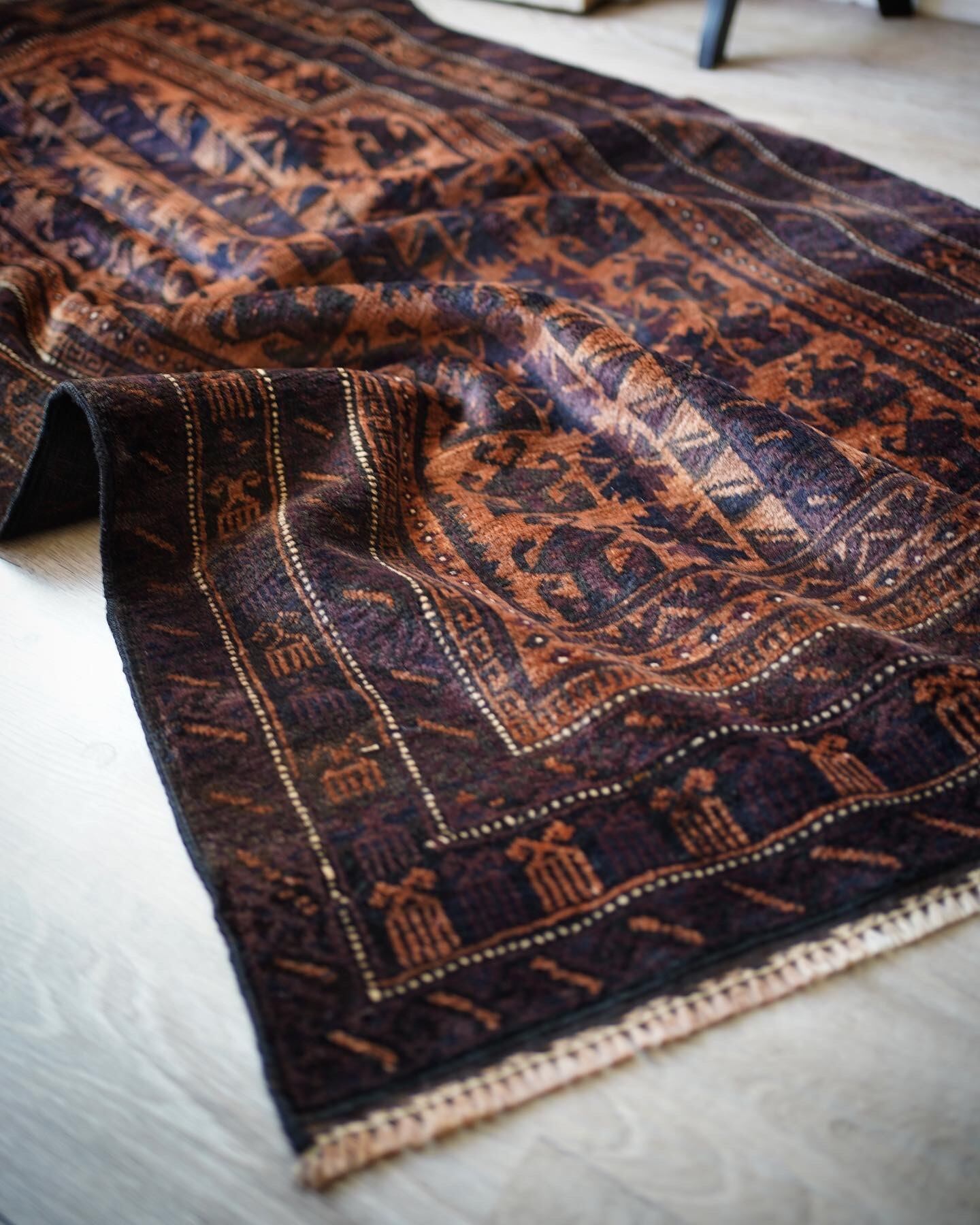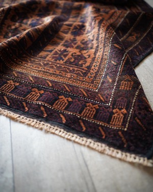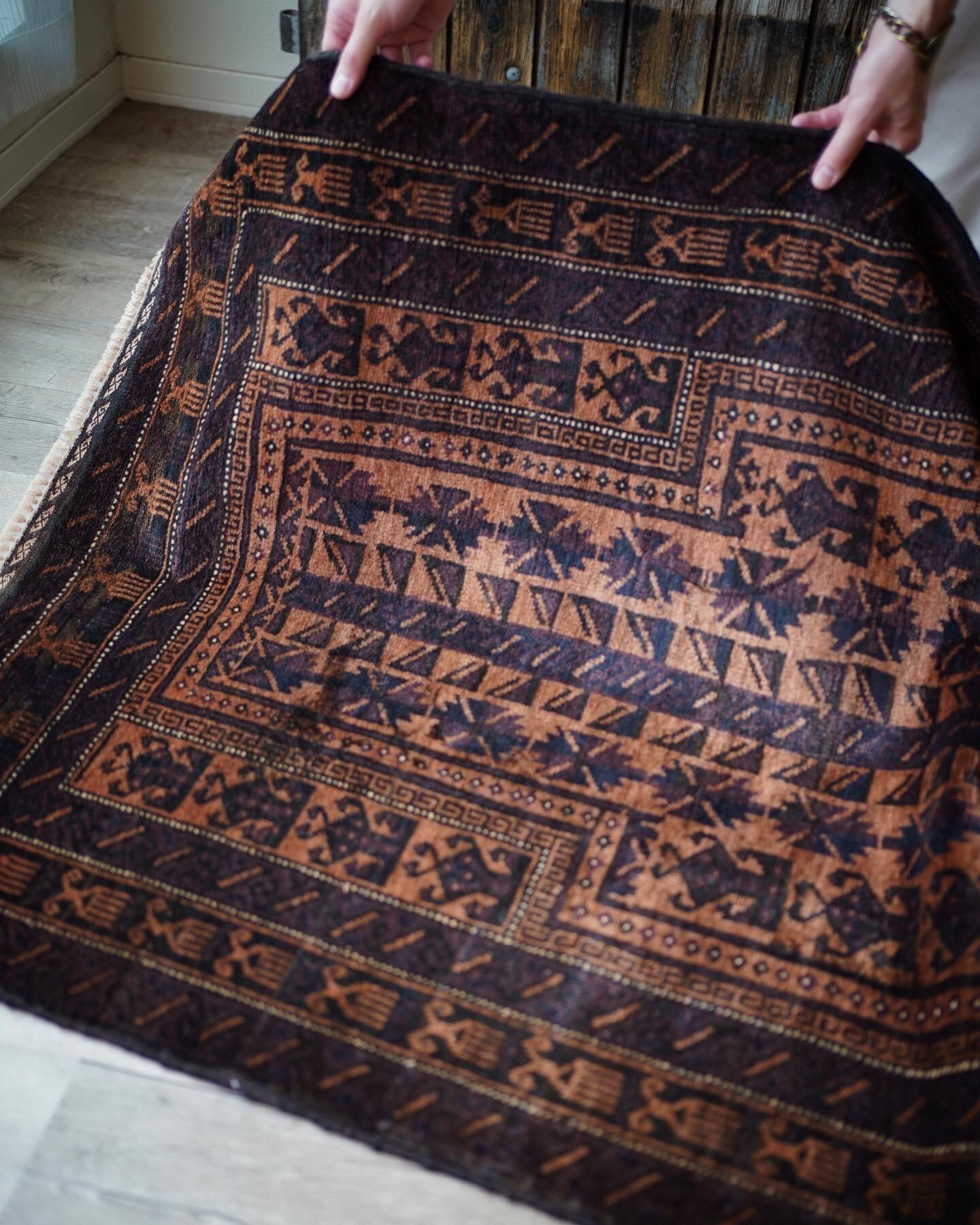 ブラウンとブラックカラーのアフガニスタン産のプレイヤーラグ。光の当たり具合や見る角度でフィールド部分がオレンジにも見え、艶もあり大変美しいです。一部補修によりパイルの色味が濃くなっている部分(お写真最後)がありますが、それ以外のコンディションは大変良好です。両サイドはキリムエンドになっています。表面の触り心地はサラッとしなやか、厚みは6mm〜7mm程度、全体的な質感は柔らかくも張りがあります。ソファの前など、素敵にコーディネートしてくれる一枚です♫