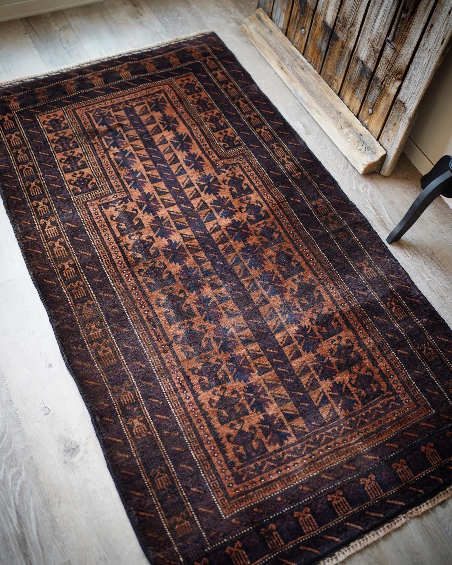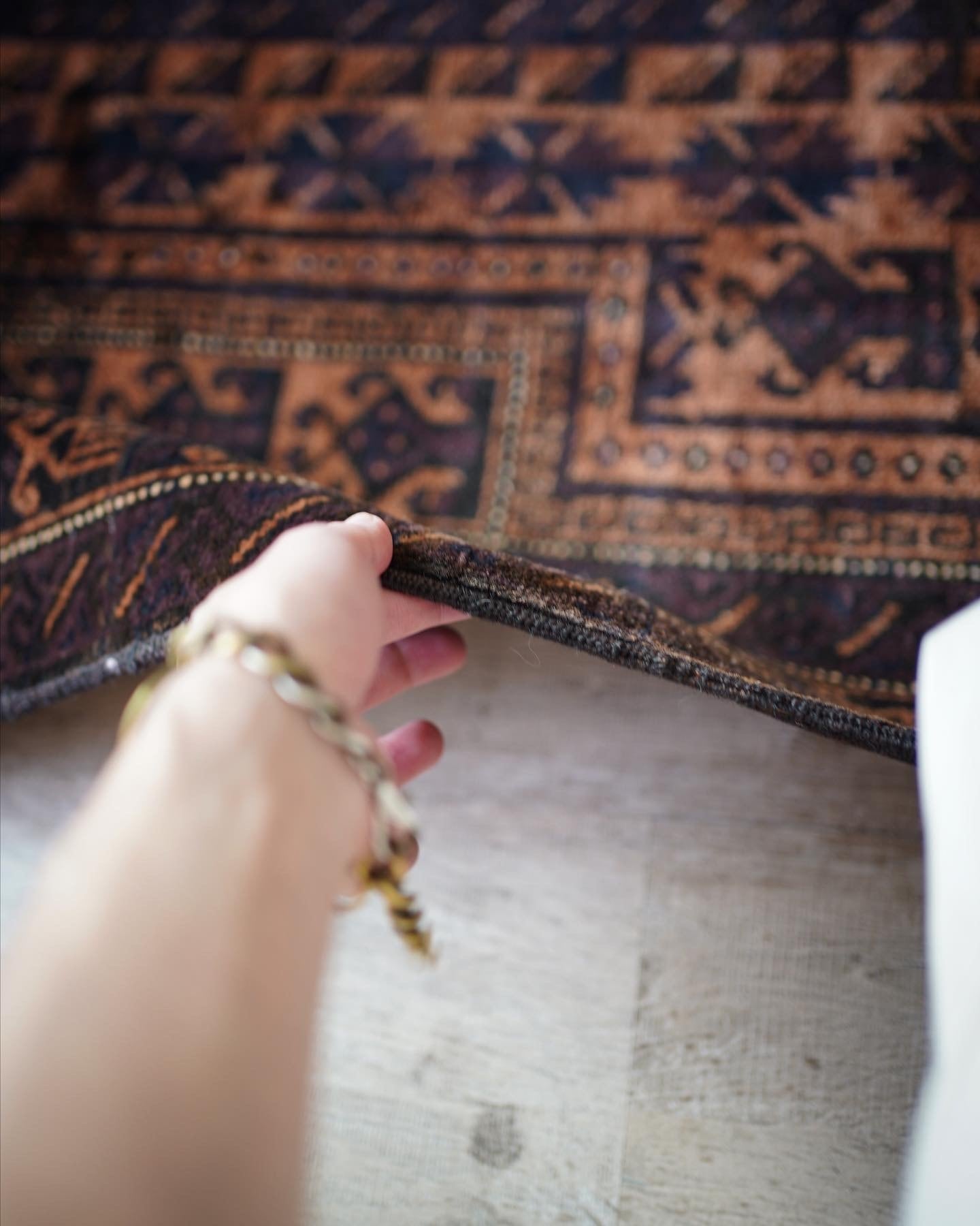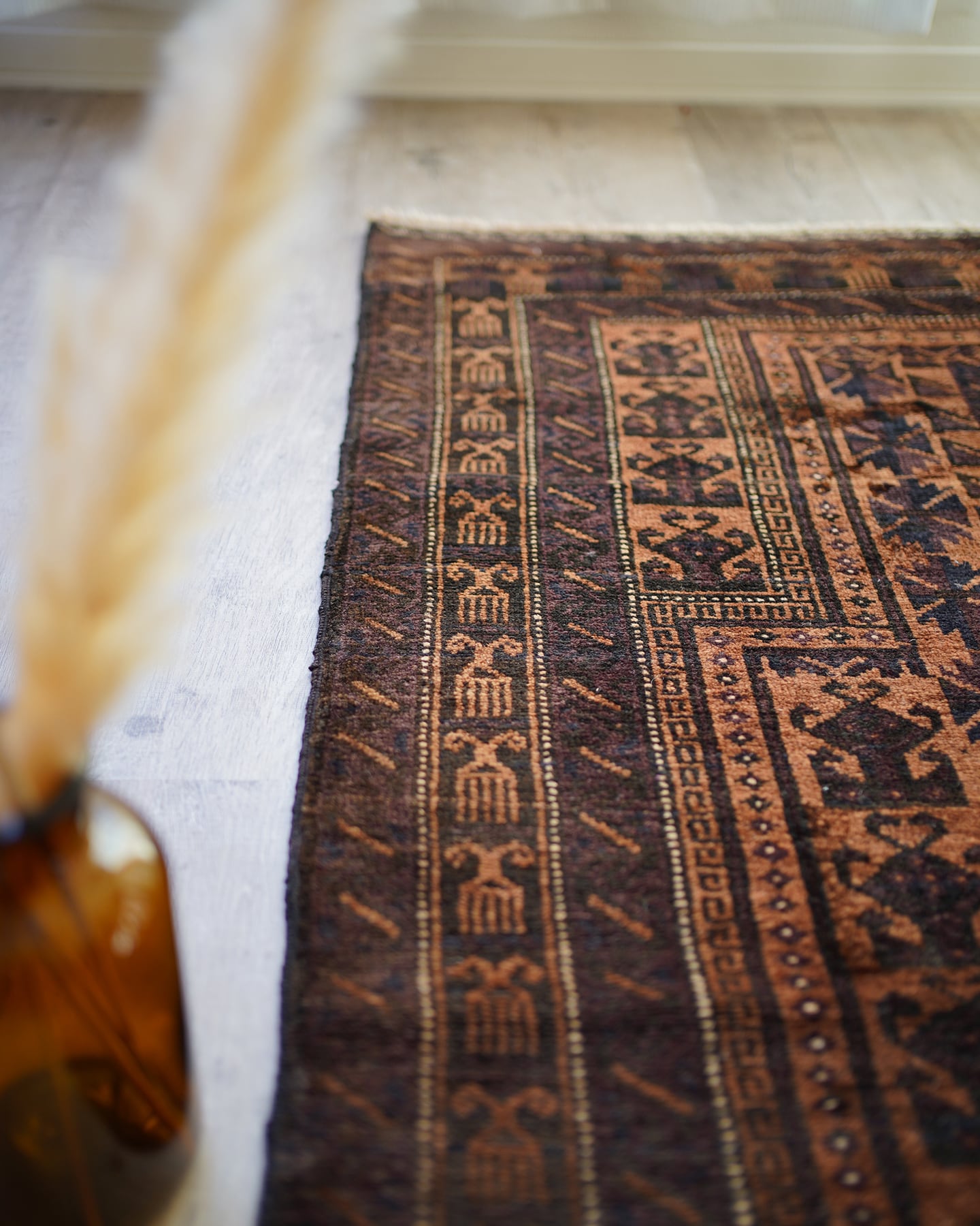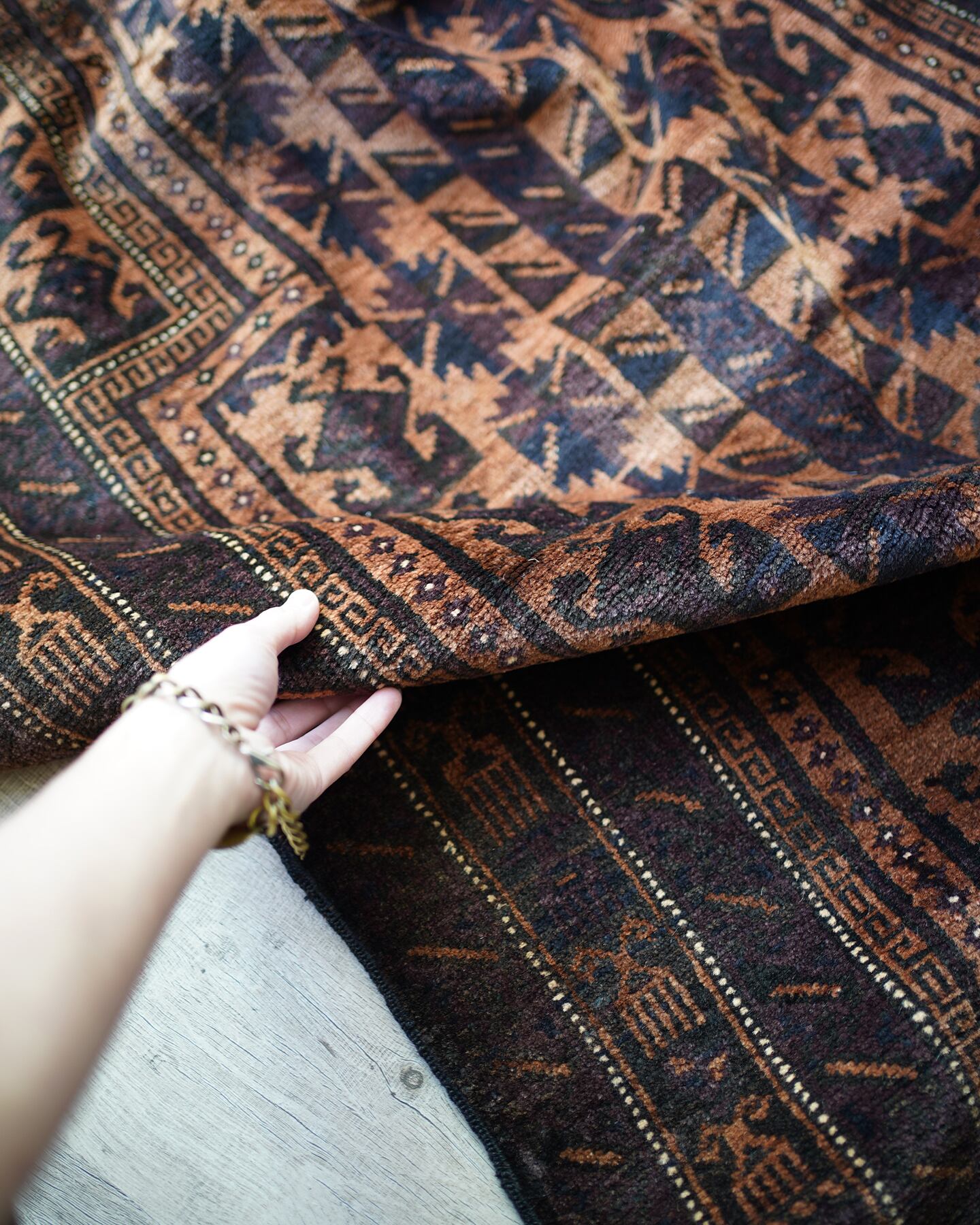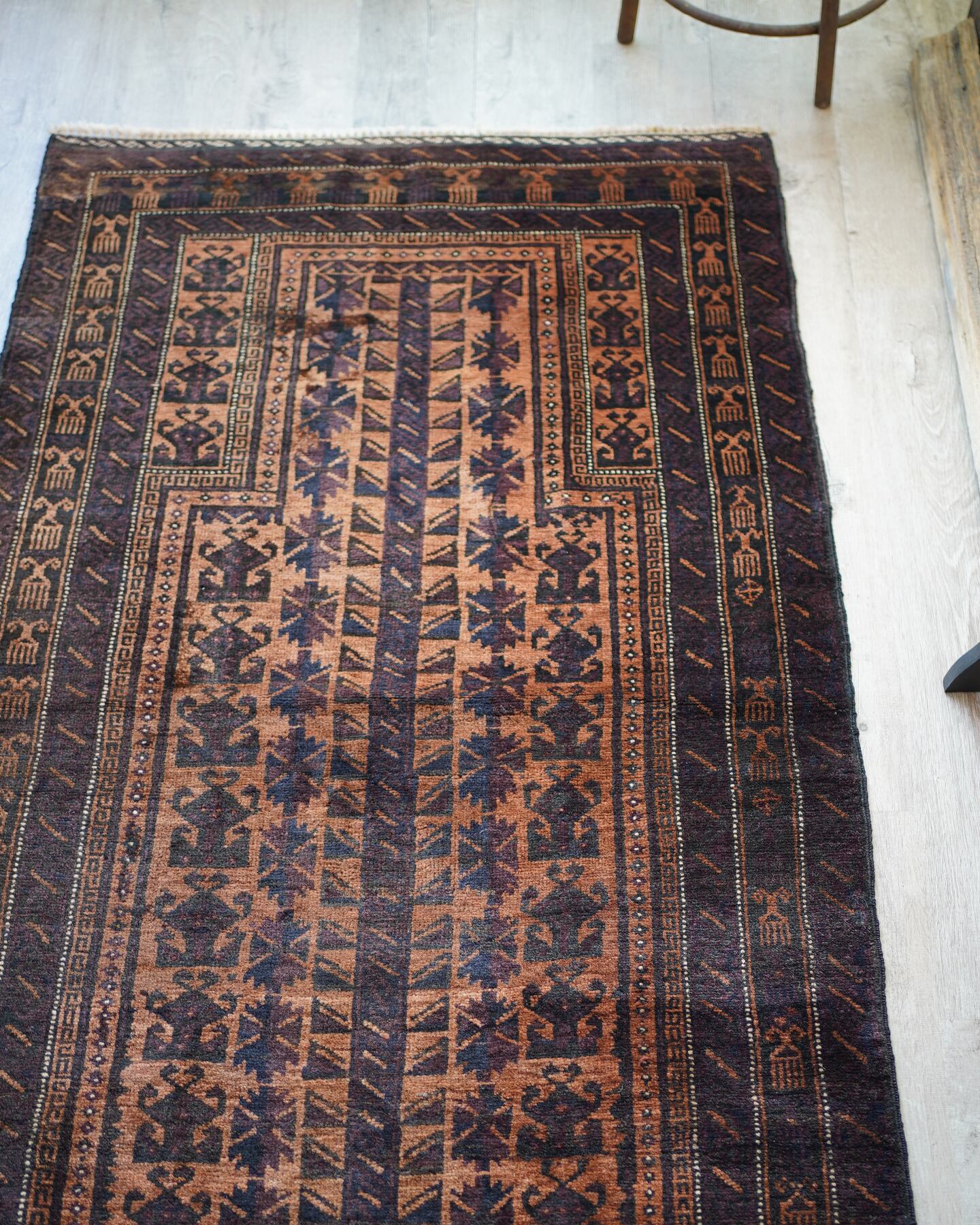 ブラウンとブラックカラーのアフガニスタン産のプレイヤーラグ。光の当たり具合や見る角度でフィールド部分がオレンジにも見え、艶もあり大変美しいです。一部補修によりパイルの色味が濃くなっている部分(お写真最後)がありますが、それ以外のコンディションは大変良好です。両サイドはキリムエンドになっています。表面の触り心地はサラッとしなやか、厚みは6mm〜7mm程度、全体的な質感は柔らかくも張りがあります。ソファの前など、素敵にコーディネートしてくれる一枚です♫