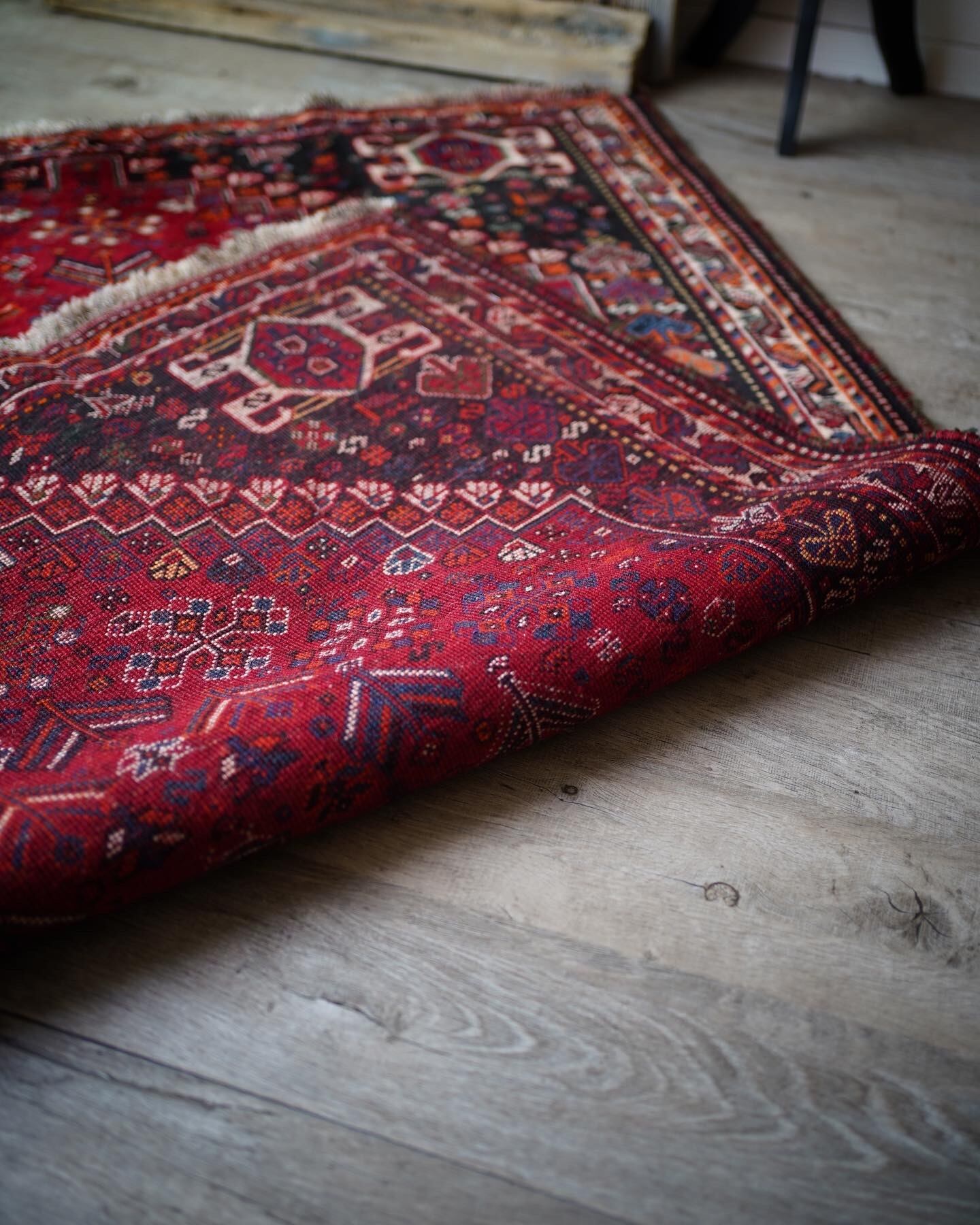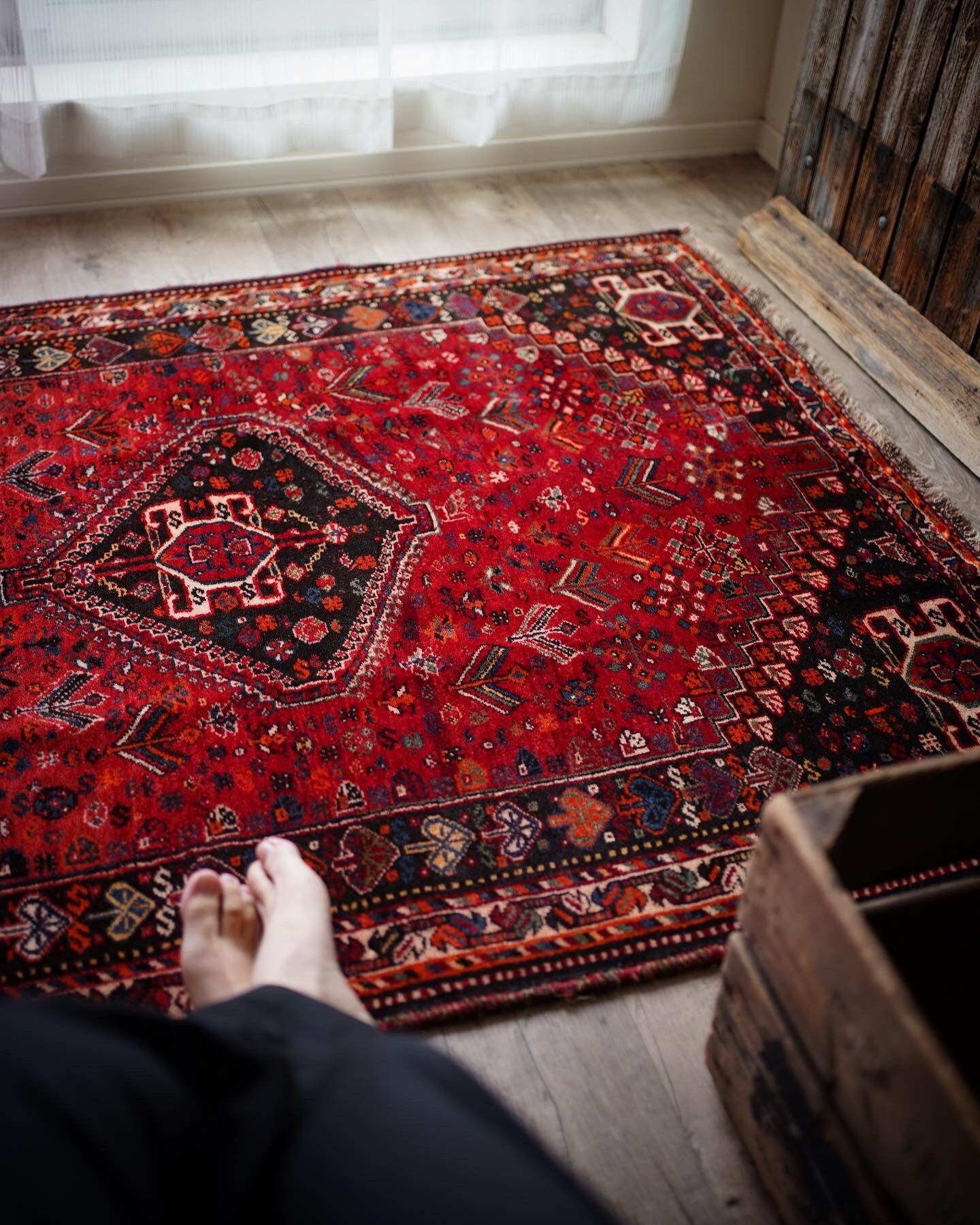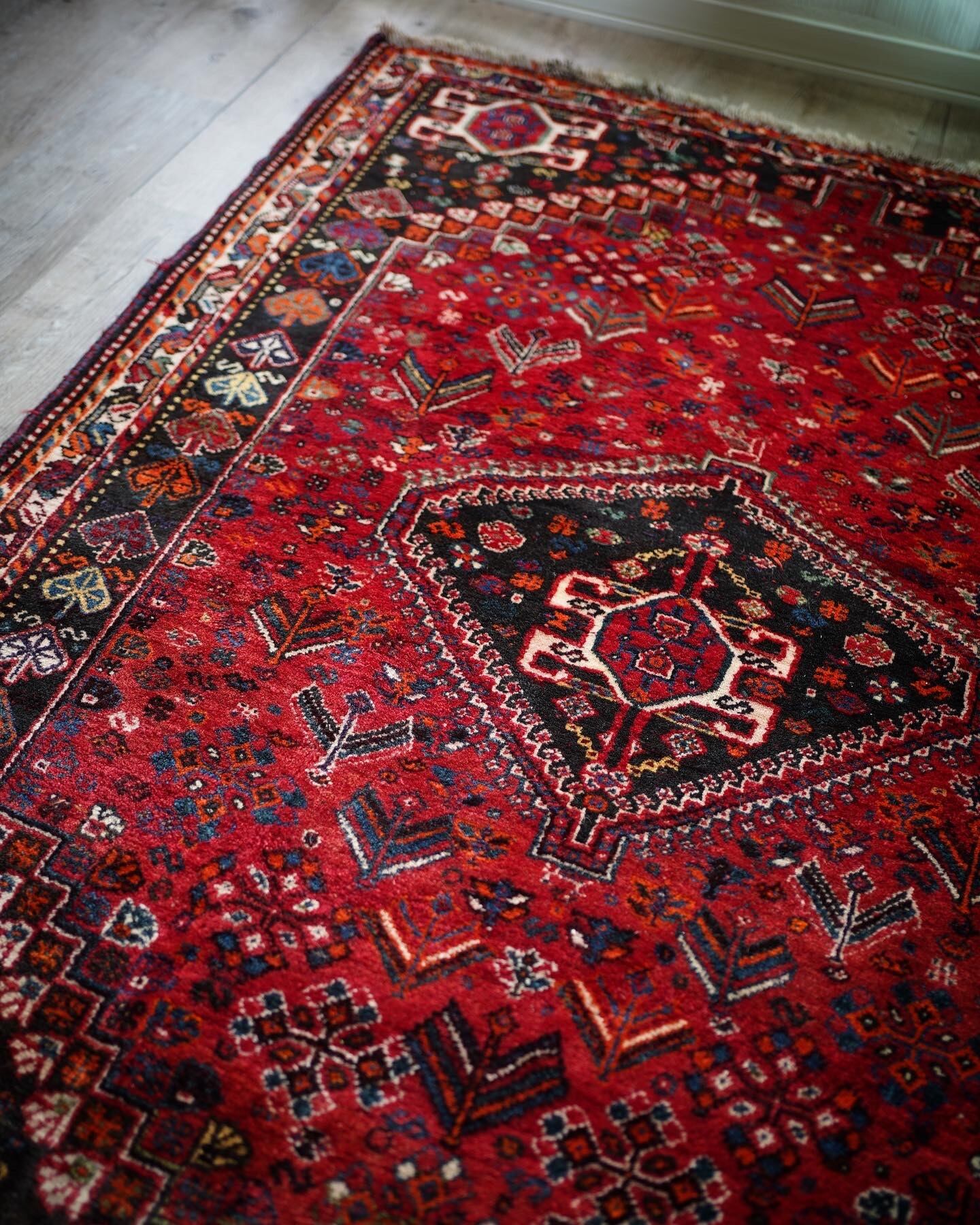 店主一目惚れの真っ赤な可愛いシラーズ産カシュガイラグ。ボーダーには多種多様な色味のスペードのような紋様、フィールドにはV字の花紋様が織られており、花紋様に合わせて中央のメダリオンもV字の可愛いフォルムになっているようです。眺めているだけでワクワクしてしまうほどキュートなラグです♫パイルは9mm〜1cm程度で厚みがあります。ふわサラッとしたとっても良い肌触りです。補修跡もなく、パーフェクトなコンディション。あー可愛い。。その一言に尽きます。笑