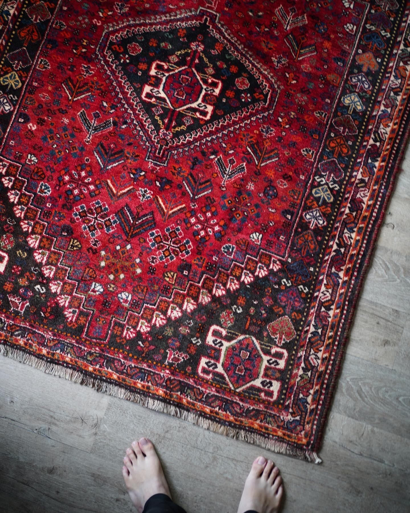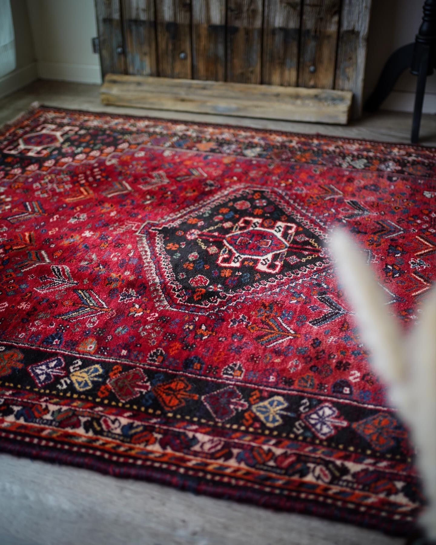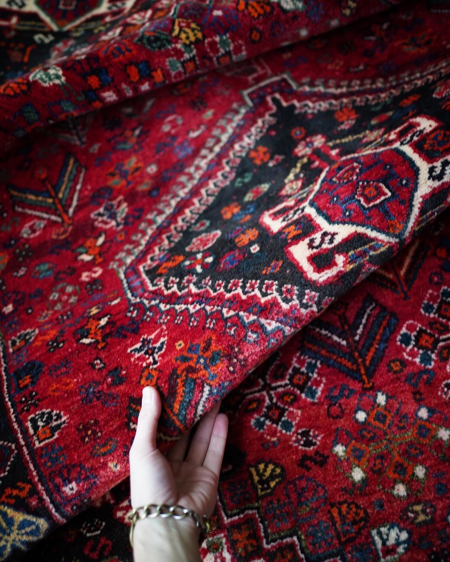店主一目惚れの真っ赤な可愛いシラーズ産カシュガイラグ。ボーダーには多種多様な色味のスペードのような紋様、フィールドにはV字の花紋様が織られており、花紋様に合わせて中央のメダリオンもV字の可愛いフォルムになっているようです。眺めているだけでワクワクしてしまうほどキュートなラグです♫パイルは9mm〜1cm程度で厚みがあります。ふわサラッとしたとっても良い肌触りです。補修跡もなく、パーフェクトなコンディション。あー可愛い。。その一言に尽きます。笑
