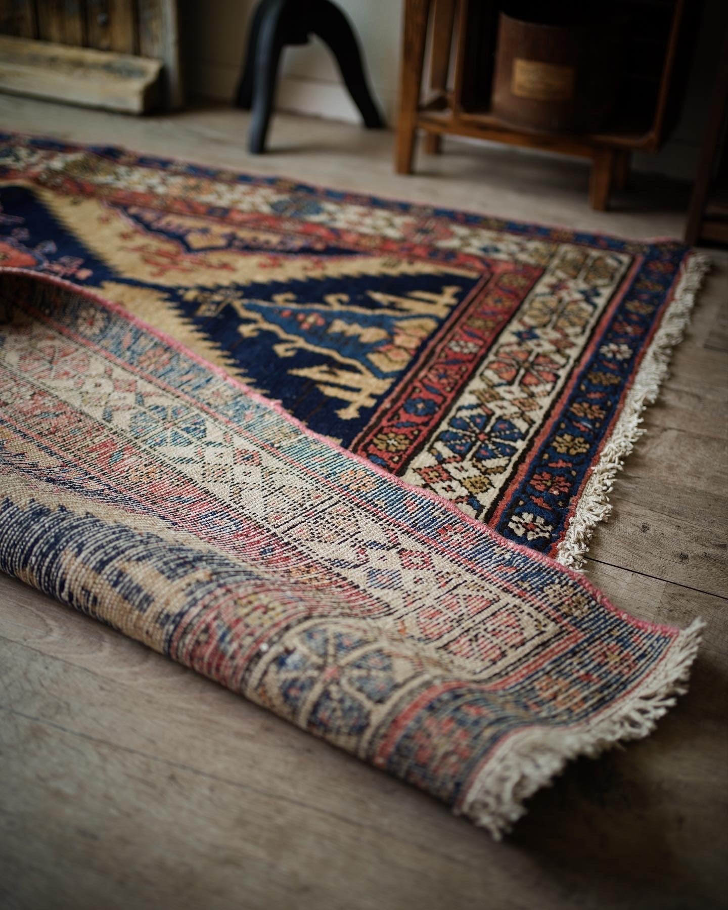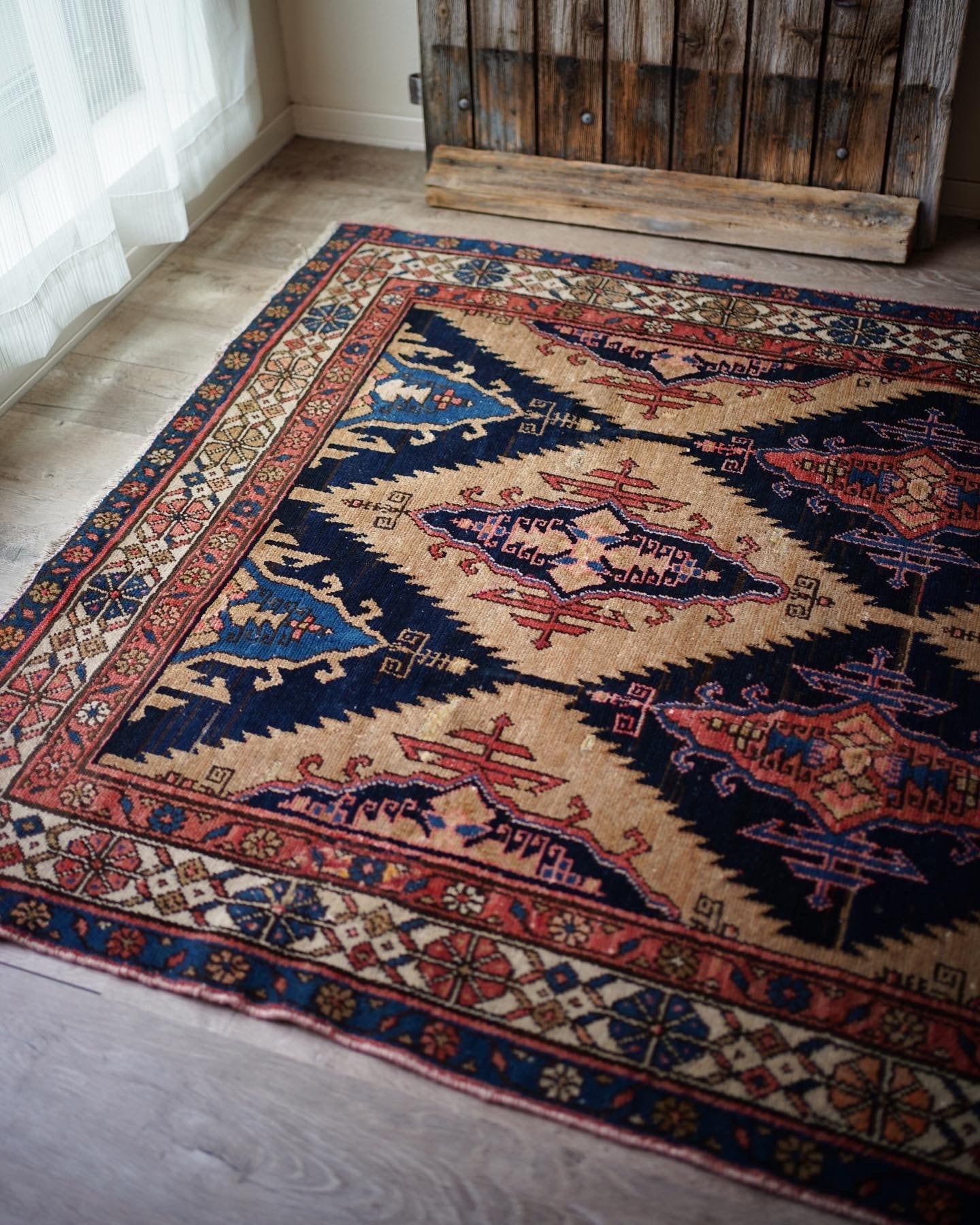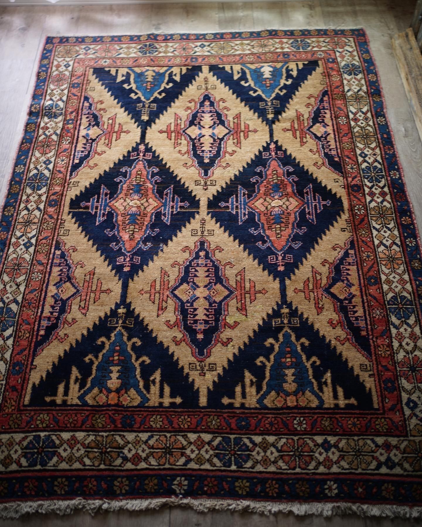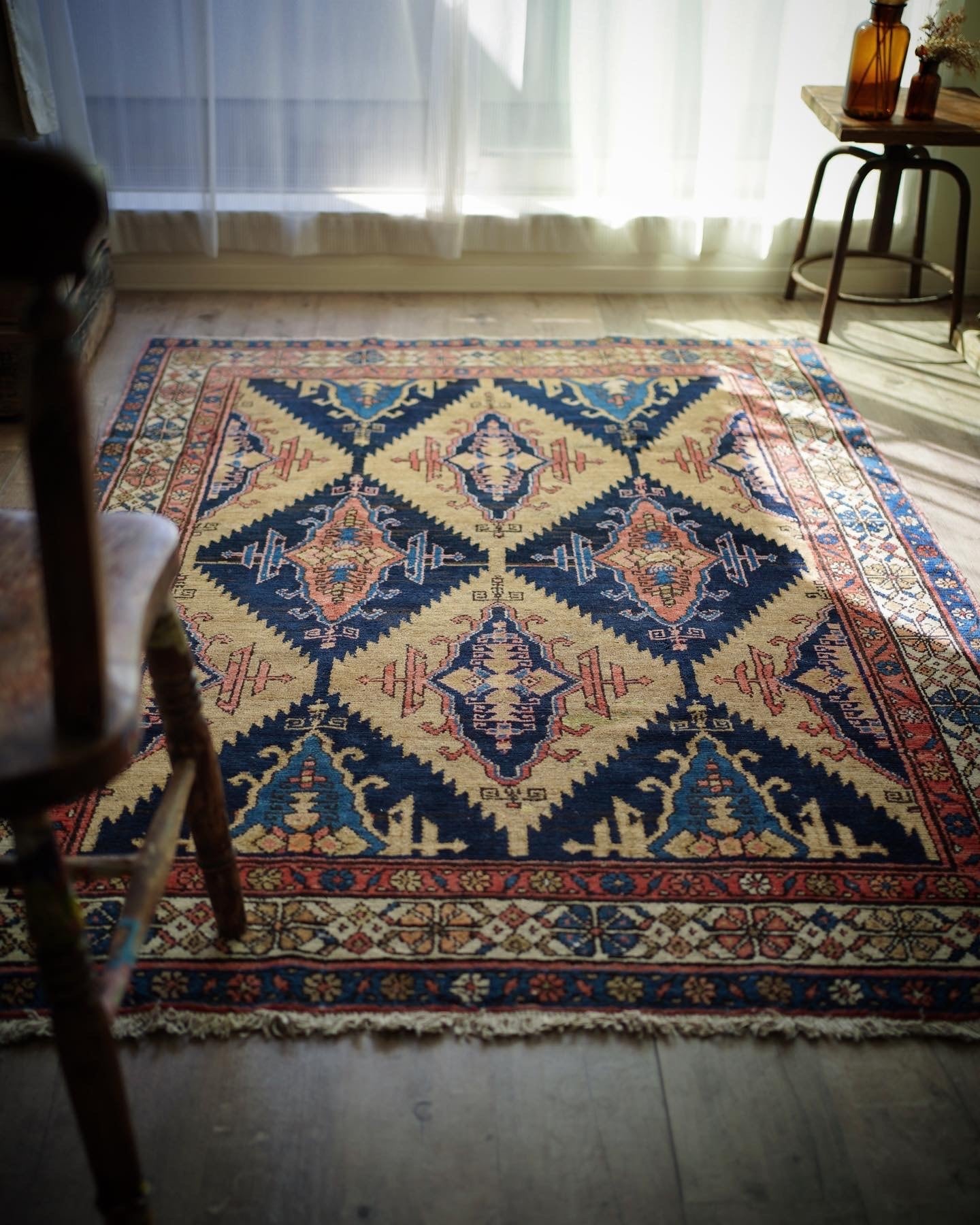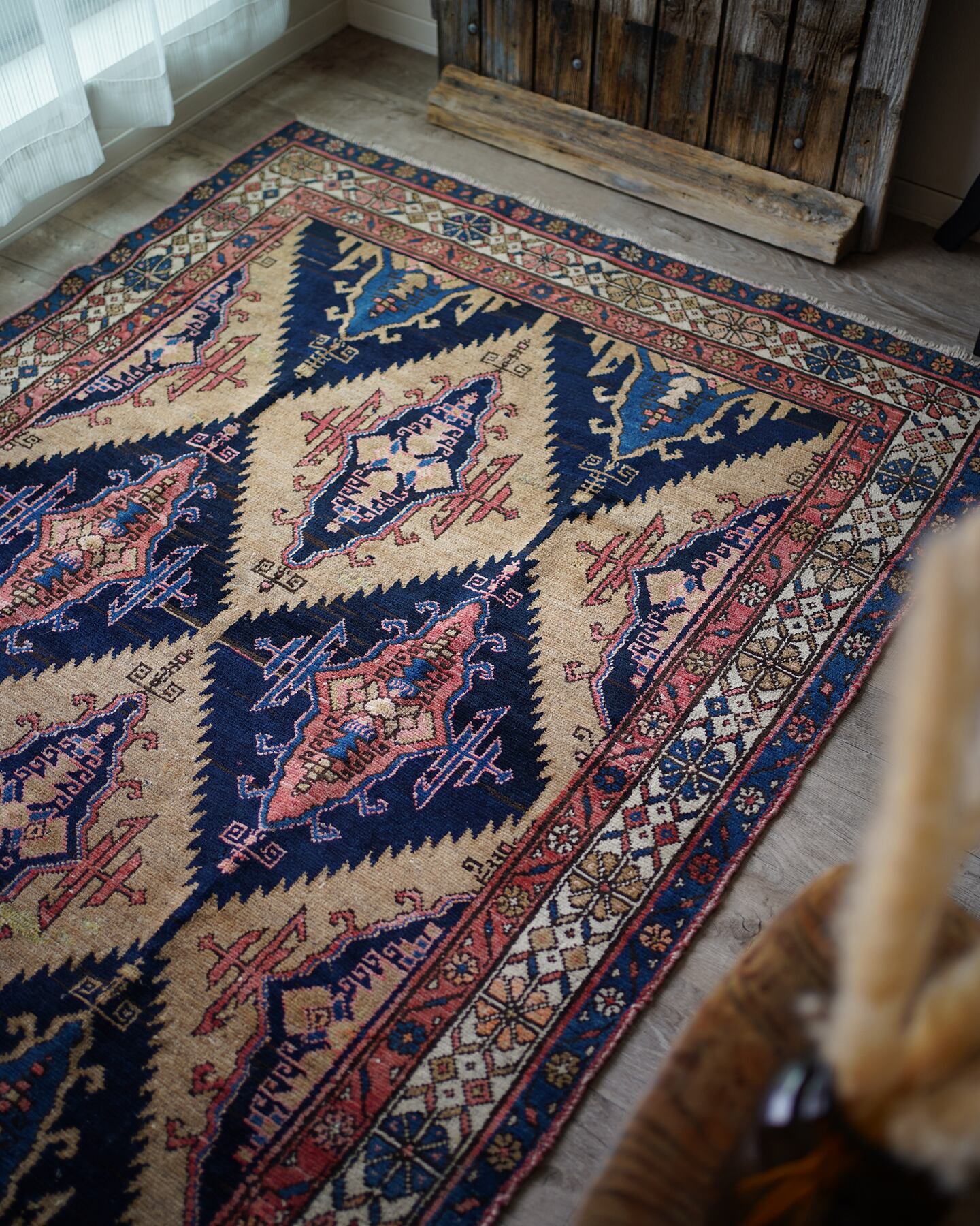経年80年のアフシャール族によって織られたセミアンティークのラグ。菱形の濃いめのネイビーと薄いブラウンの紋様のコントラストがカッコいい一枚。あまり見かけないタイプのデザインです。ピンクの色味も入っているところが店主的にポイント高いです♫サラサラとした肌触り、毛並みは6mm〜7mm程度です。補修により少しだけ色味が変わっているところ(お写真最後)がありますが、馴染んでいるためほとんど気にならないかと思います。見れば見るほど好きになるスルメのようなラグです。笑