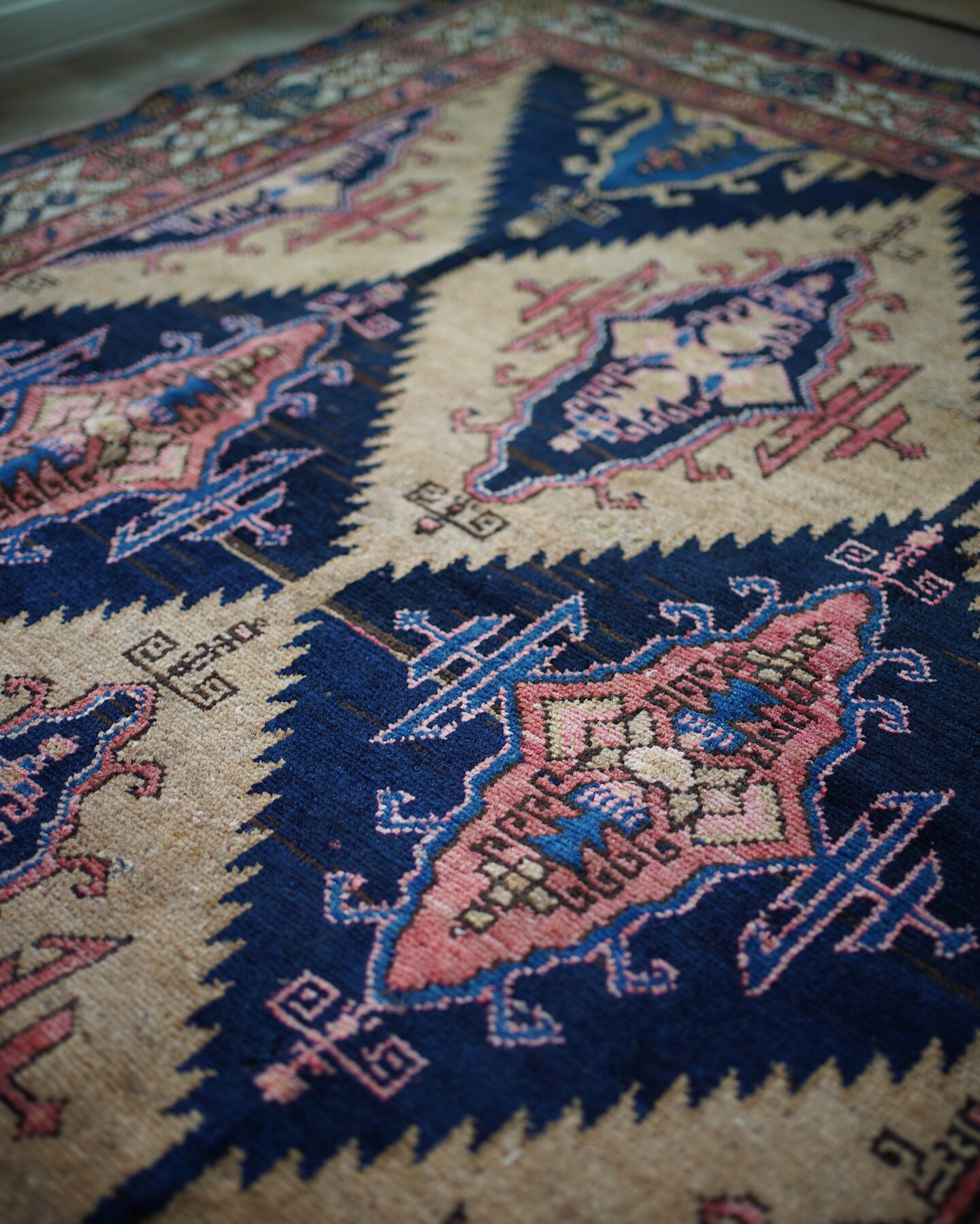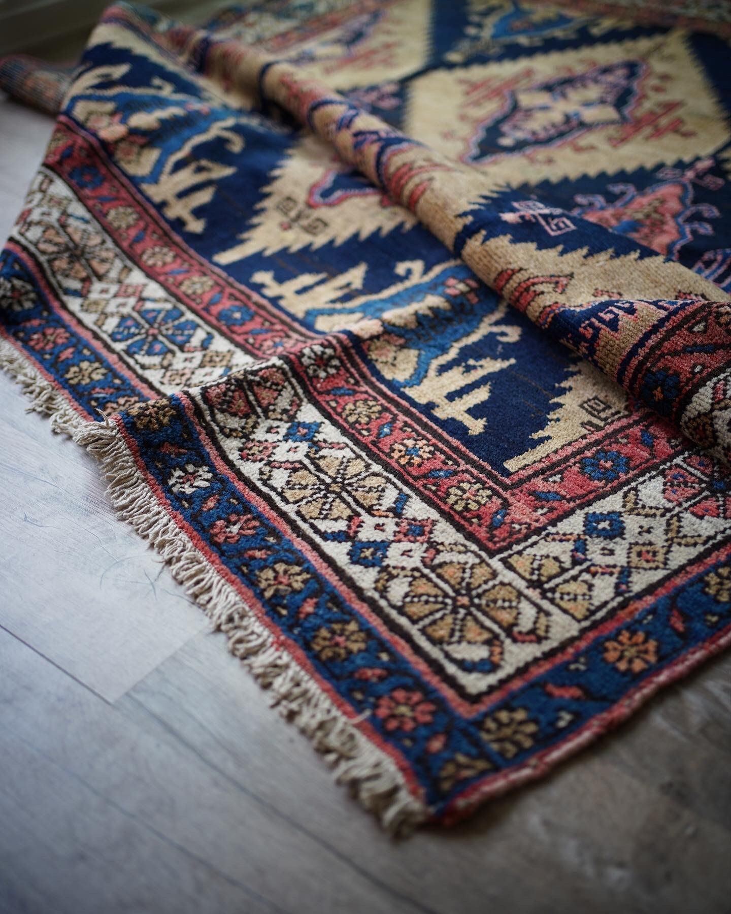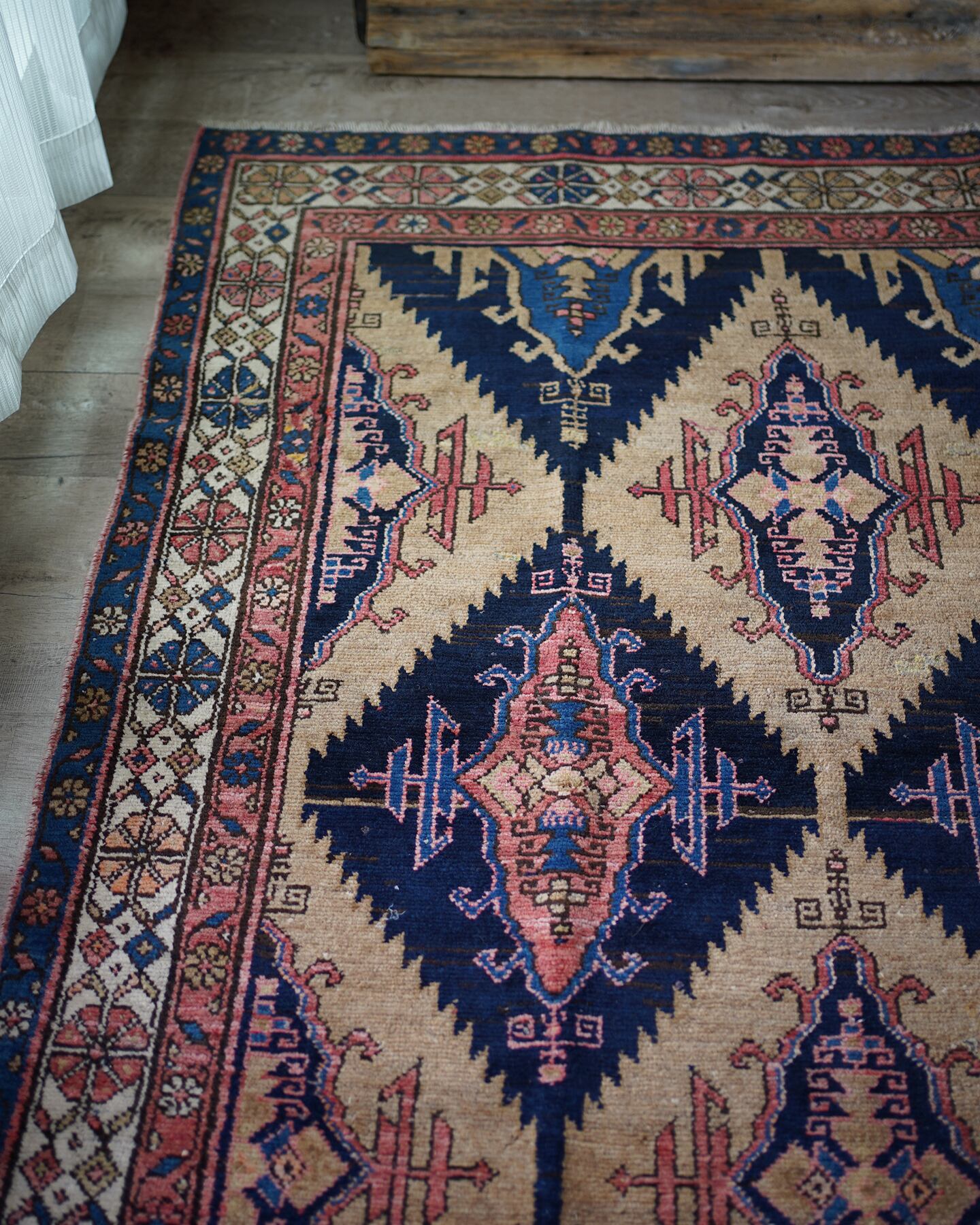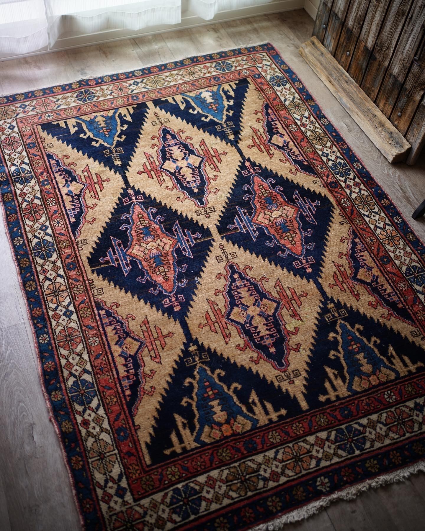 経年80年のアフシャール族によって織られたセミアンティークのラグ。菱形の濃いめのネイビーと薄いブラウンの紋様のコントラストがカッコいい一枚。あまり見かけないタイプのデザインです。ピンクの色味も入っているところが店主的にポイント高いです♫サラサラとした肌触り、毛並みは6mm〜7mm程度です。補修により少しだけ色味が変わっているところ(お写真最後)がありますが、馴染んでいるためほとんど気にならないかと思います。見れば見るほど好きになるスルメのようなラグです。笑