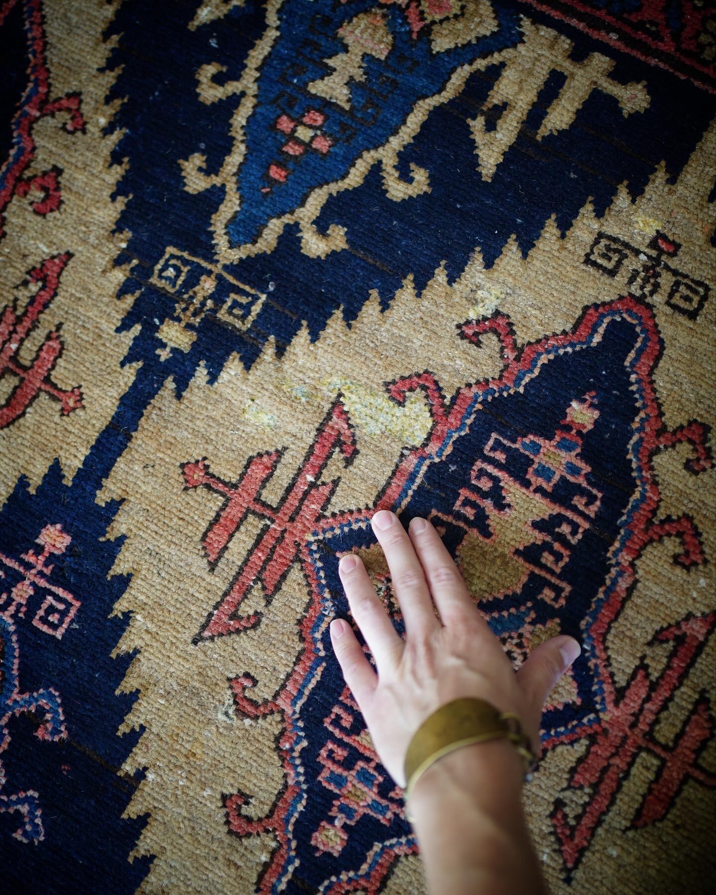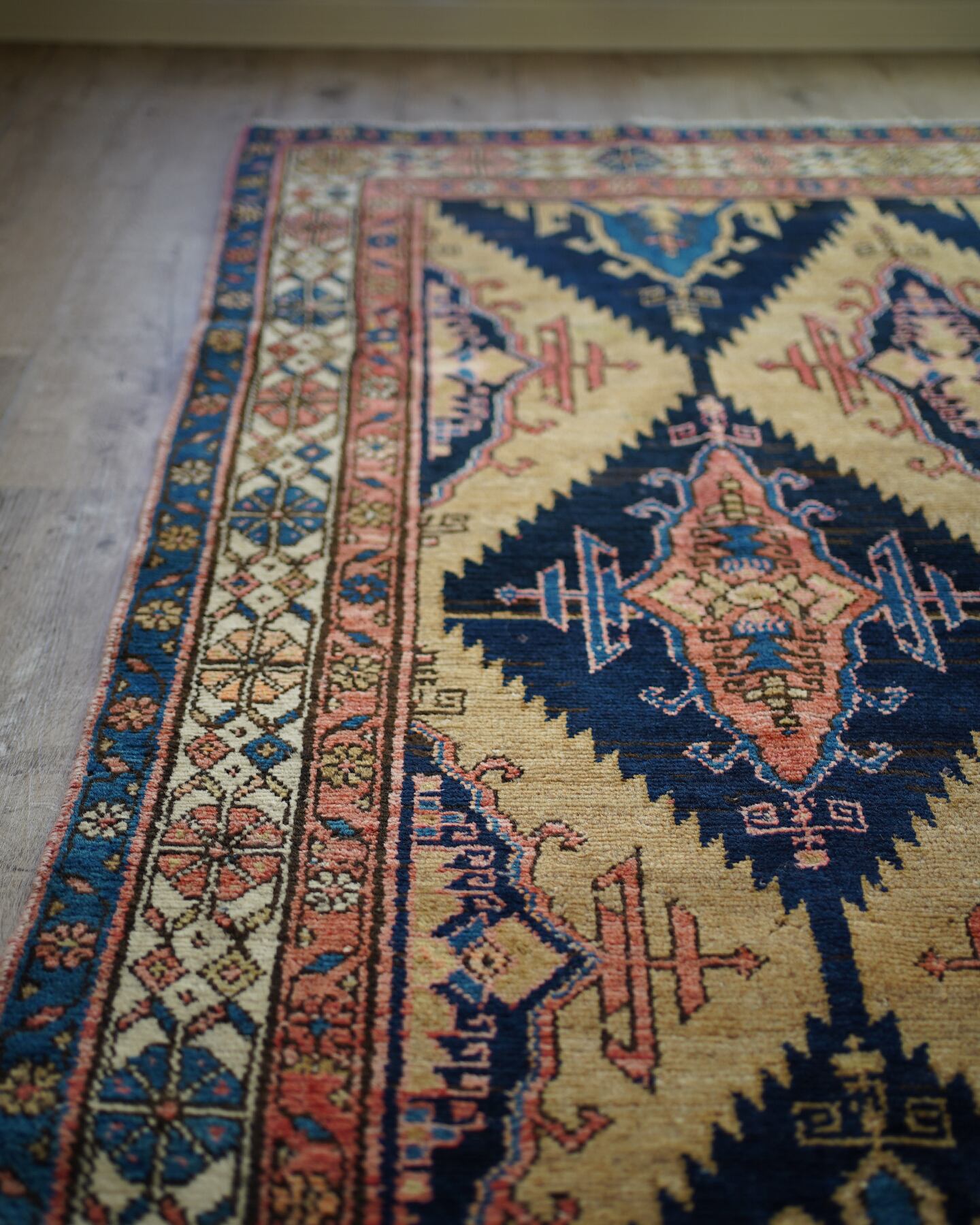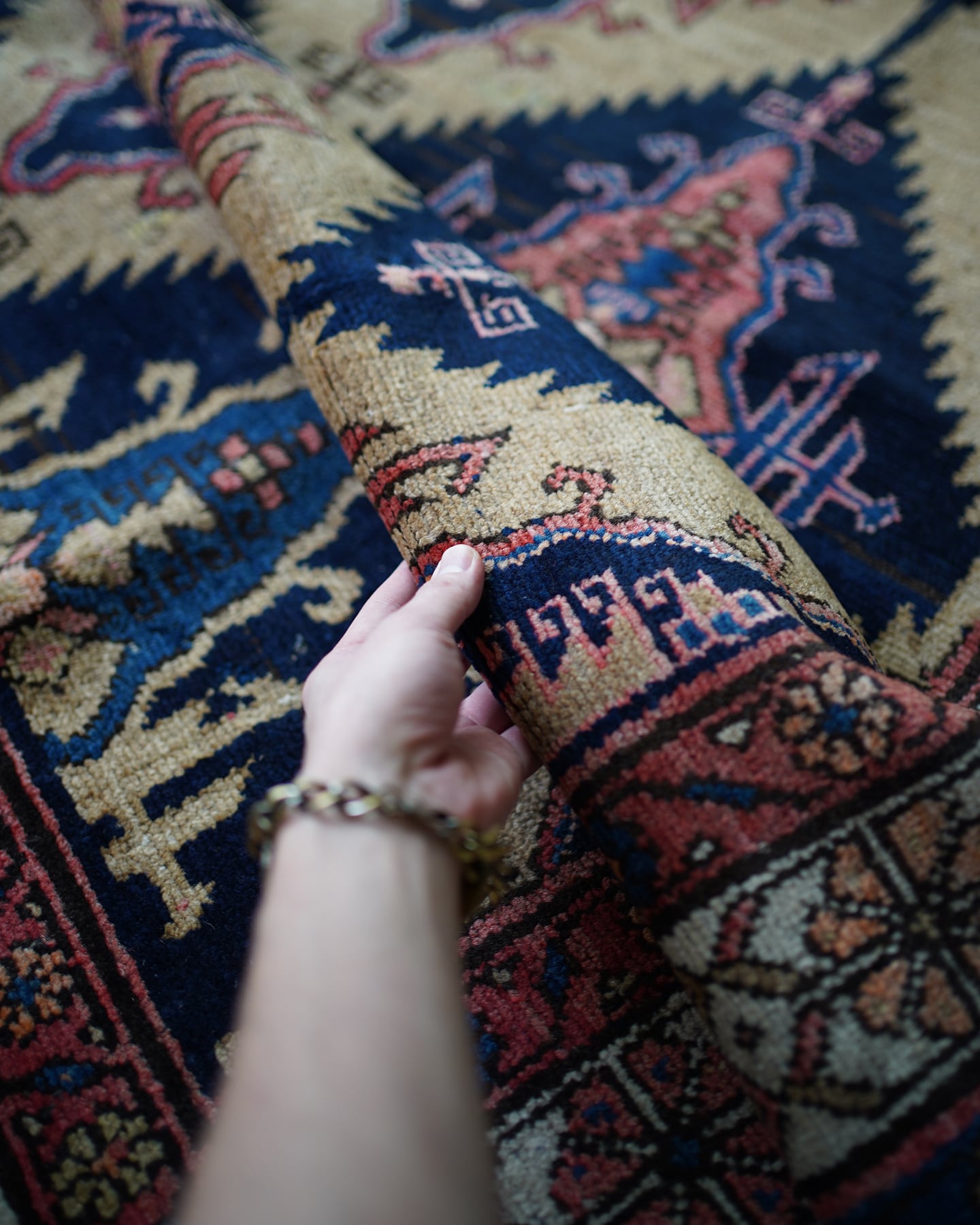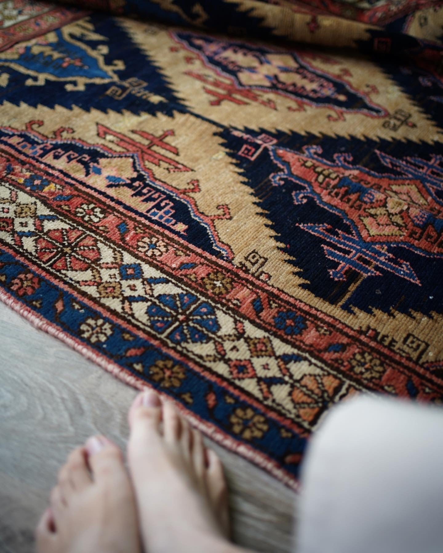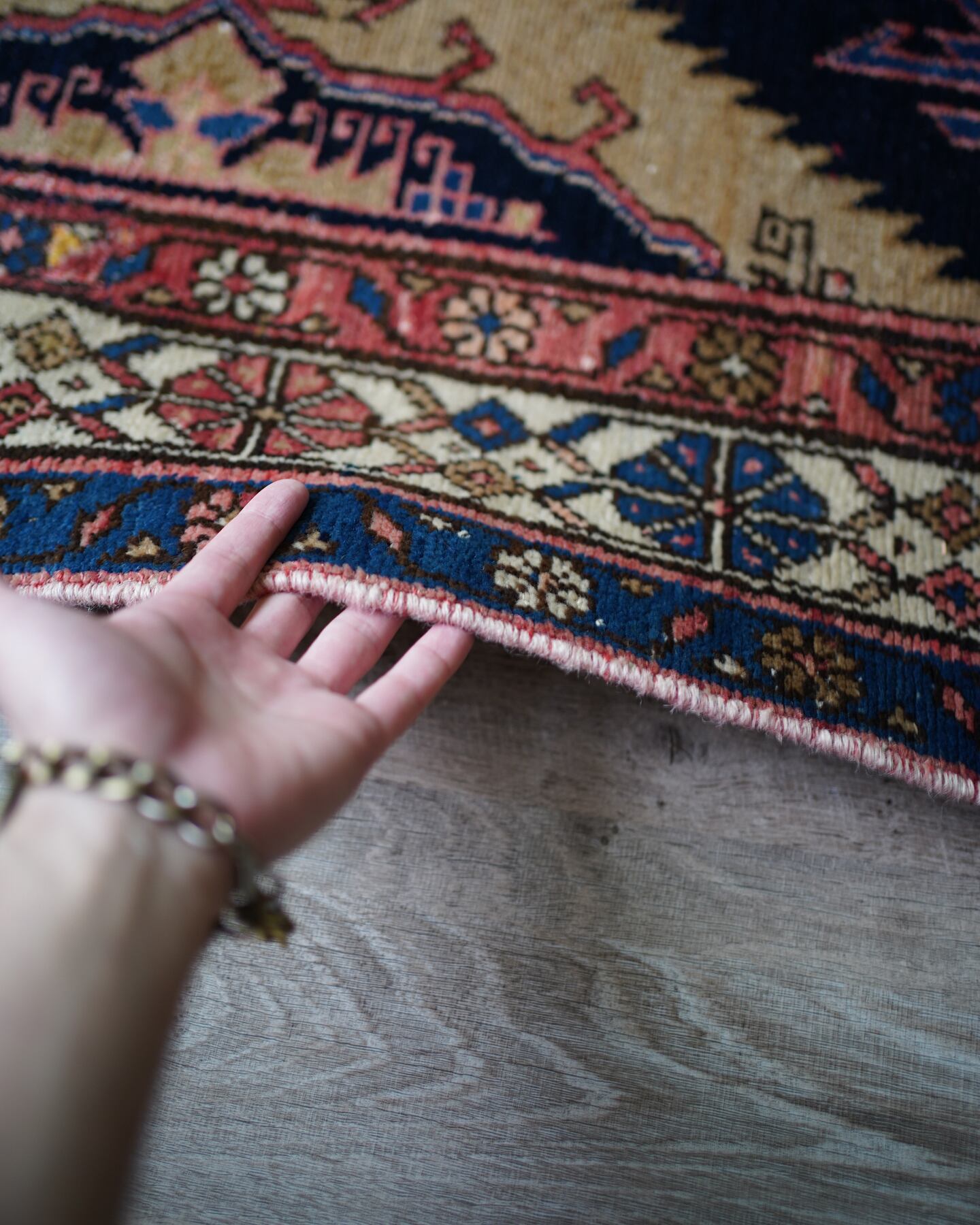 経年80年のアフシャール族によって織られたセミアンティークのラグ。菱形の濃いめのネイビーと薄いブラウンの紋様のコントラストがカッコいい一枚。あまり見かけないタイプのデザインです。ピンクの色味も入っているところが店主的にポイント高いです♫サラサラとした肌触り、毛並みは6mm〜7mm程度です。補修により少しだけ色味が変わっているところ(お写真最後)がありますが、馴染んでいるためほとんど気にならないかと思います。見れば見るほど好きになるスルメのようなラグです。笑
