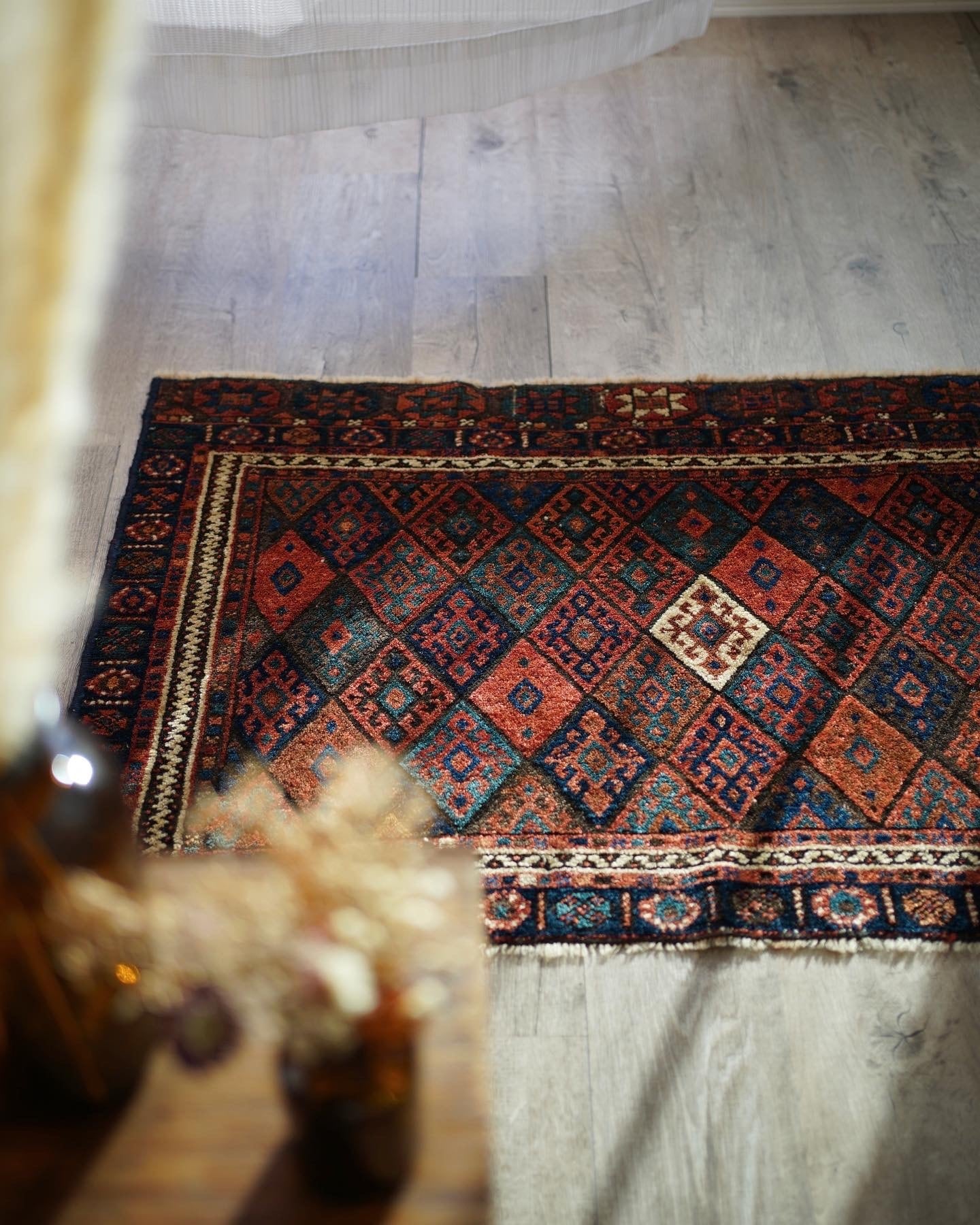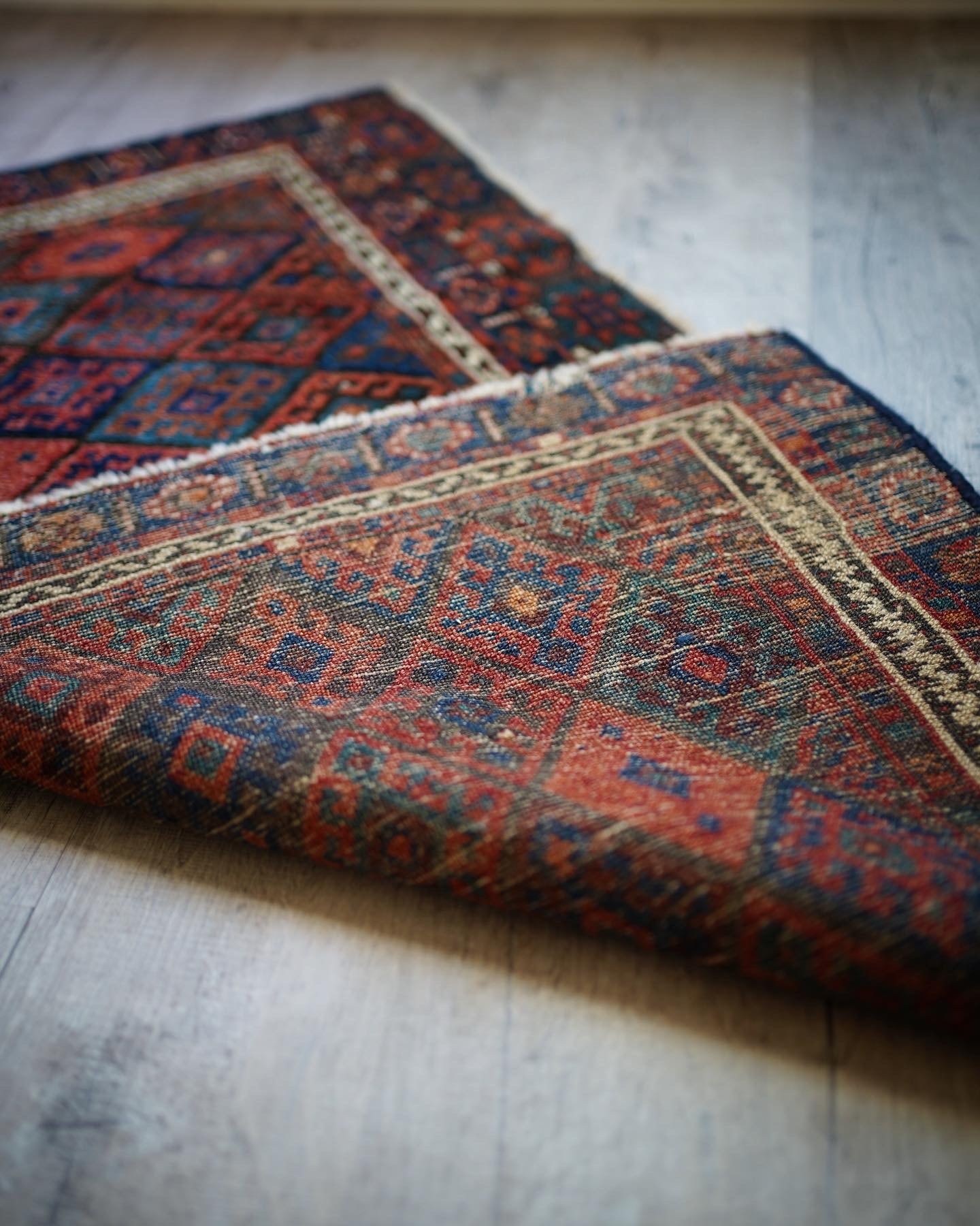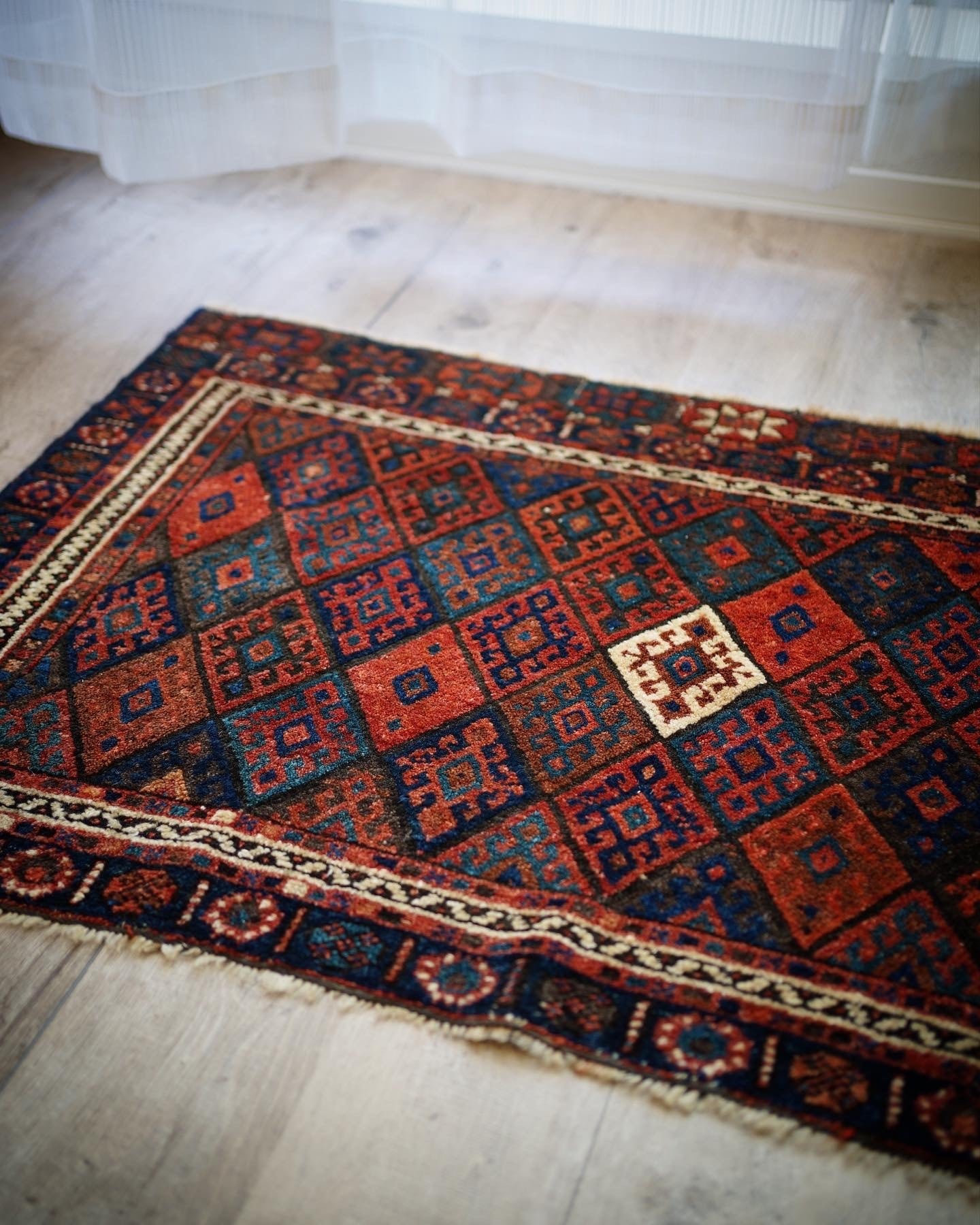 120年前にジャフクルドという人々(イラン〜イラク〜トルコ国境付近のクルディスタン地方の遊牧民)によって織られたマフラッシュパネルです。マフラッシュパネルとは直方体の家財道具などを収納する袋(マフラシュ)として使われるためのもので、その立方体の側面(パネル)部分を切り取ってラグにしたものです。ブルーグリーン・ブルー・朱色・ブラウンなどの配色で、中心の菱形紋様だけ白くなっており、色彩とデザインのバランスが大変素晴らしいです。日光の下で眺めると輝くような艶・染色を醸し出します。パイル(毛足)は短めで、厚みは6mmと比較的薄め。やわらかな織りでしなやかな質感です。コンディションとしては一部修繕部分がありますが、綺麗に修繕されているため、目立ちません。それ以外は120年前のものとは思えないほど良好なコンディションです。販売せず、店主のコレクションとしてキープしておこうとも考えていたお品。