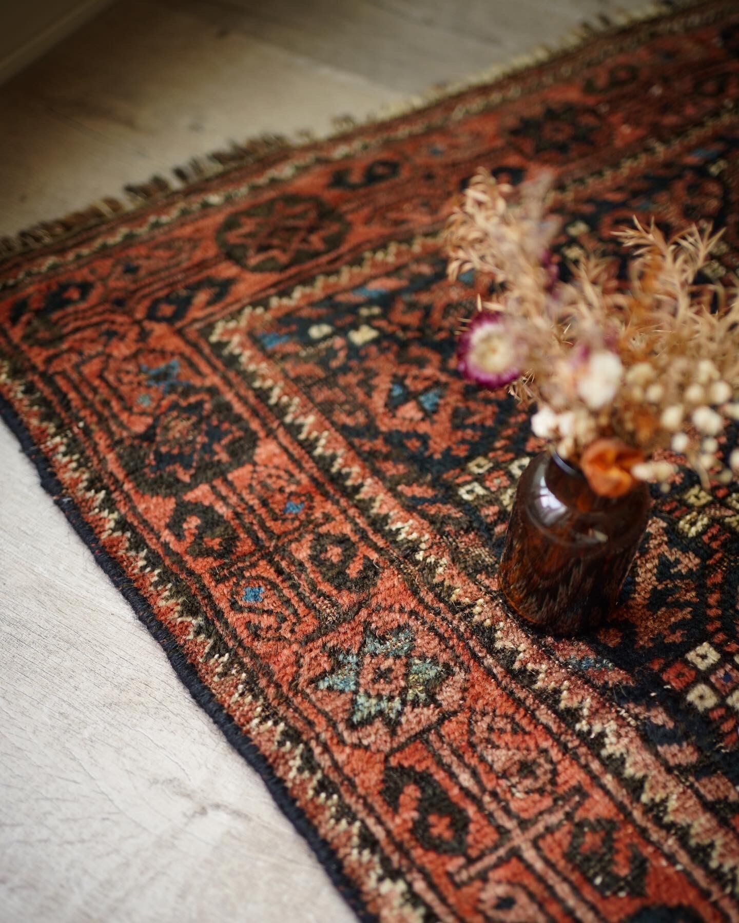 80年ほど前にシスターン地方(イラン東部~アフガニスタン西部)で織られたセミアンティークのバルーチ。擦れによるパイルの抜けも目立ちますが、見た目とは裏腹に触り心地はふわサラッとしており、大変滑らかで柔らかいです。厚みは5mm程度で薄めとなります。朱色と橙色の間のような色味で、アクセントにブルーグリーンやネイビーが可愛く、とても素敵な配色。ボーダーには幸運の象徴を意味する八角星モチーフが織り込まれています。