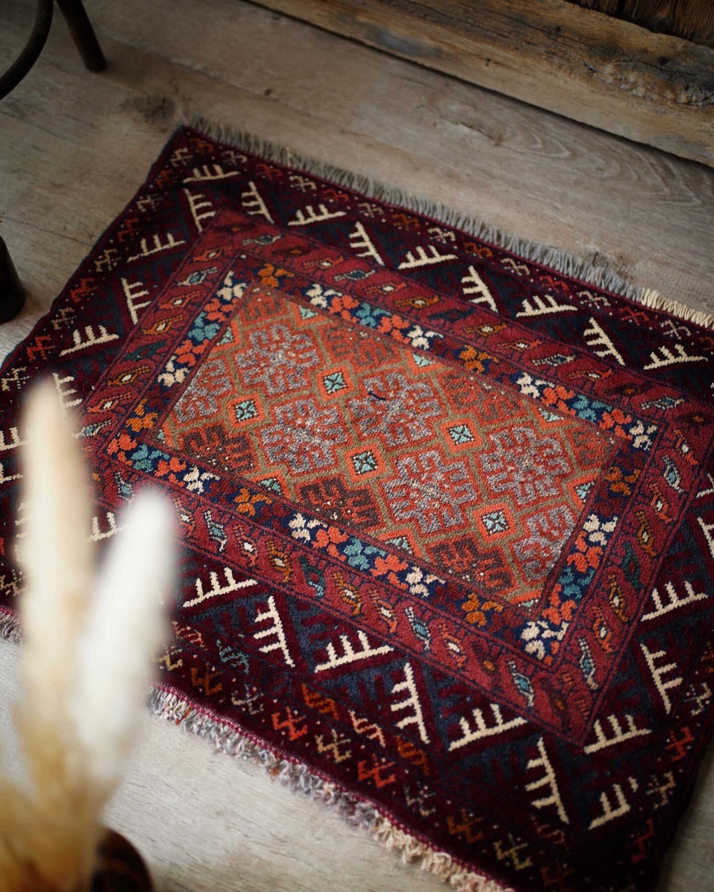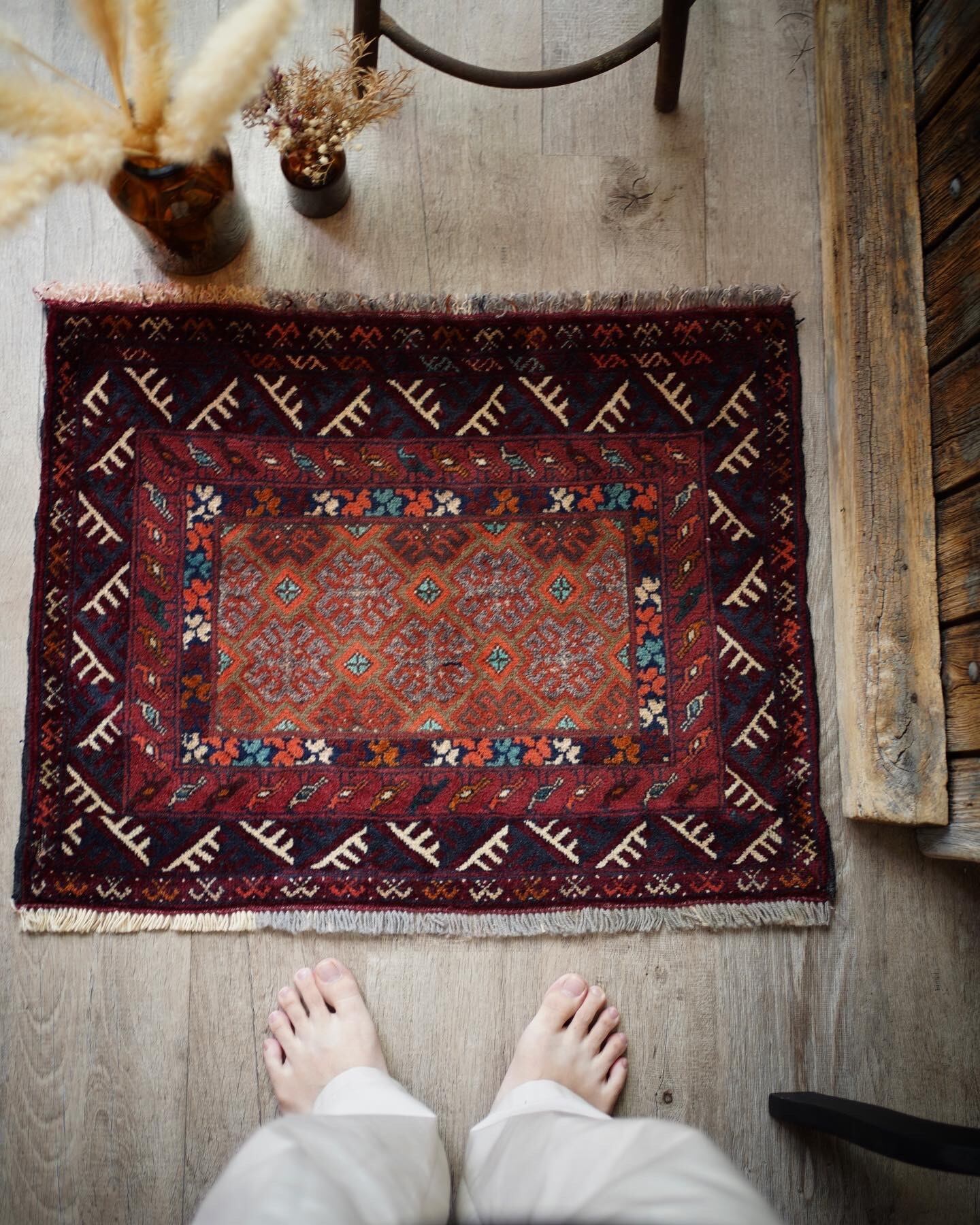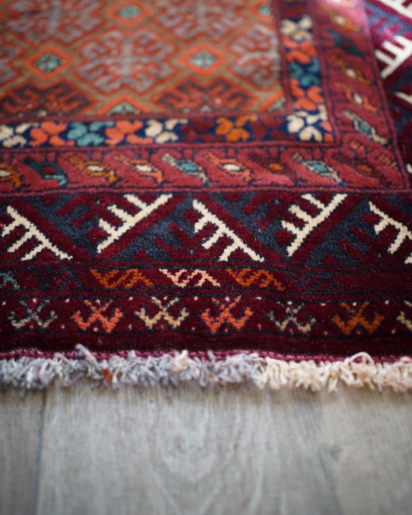 よく見るとカラフルな小さな鳥が整列している渋くて可愛いトルクメンラグ。赤茶ベースにブルーグリーンの差し色がとってもオシャレな一枚です。一部角の部分で小さなパイル抜けがありますが、馴染んでいてほとんど目立たず気にならないかと思われます。パイルは7mm程度で程よい厚み、全体的には柔らかくも少し張りのある質感です。