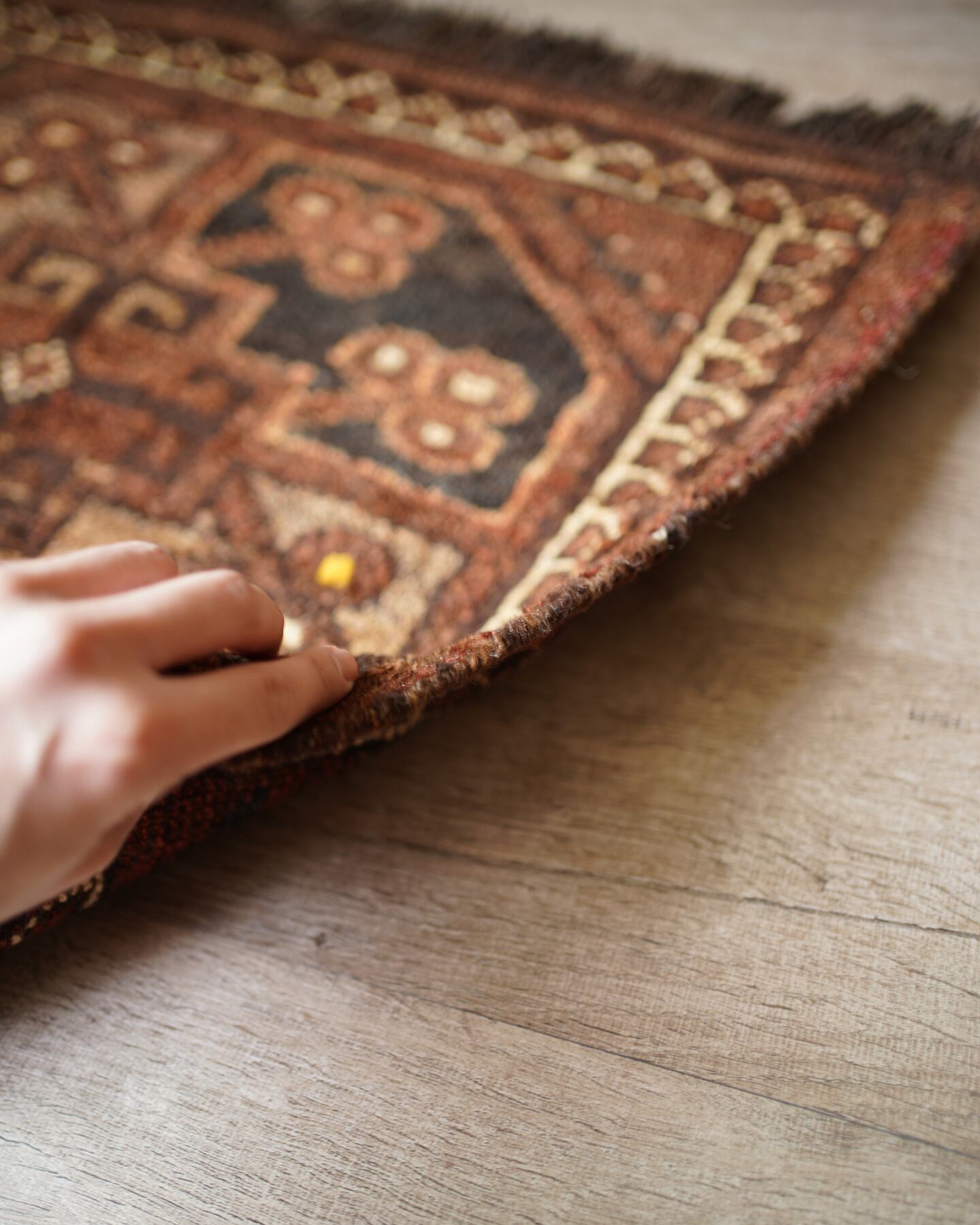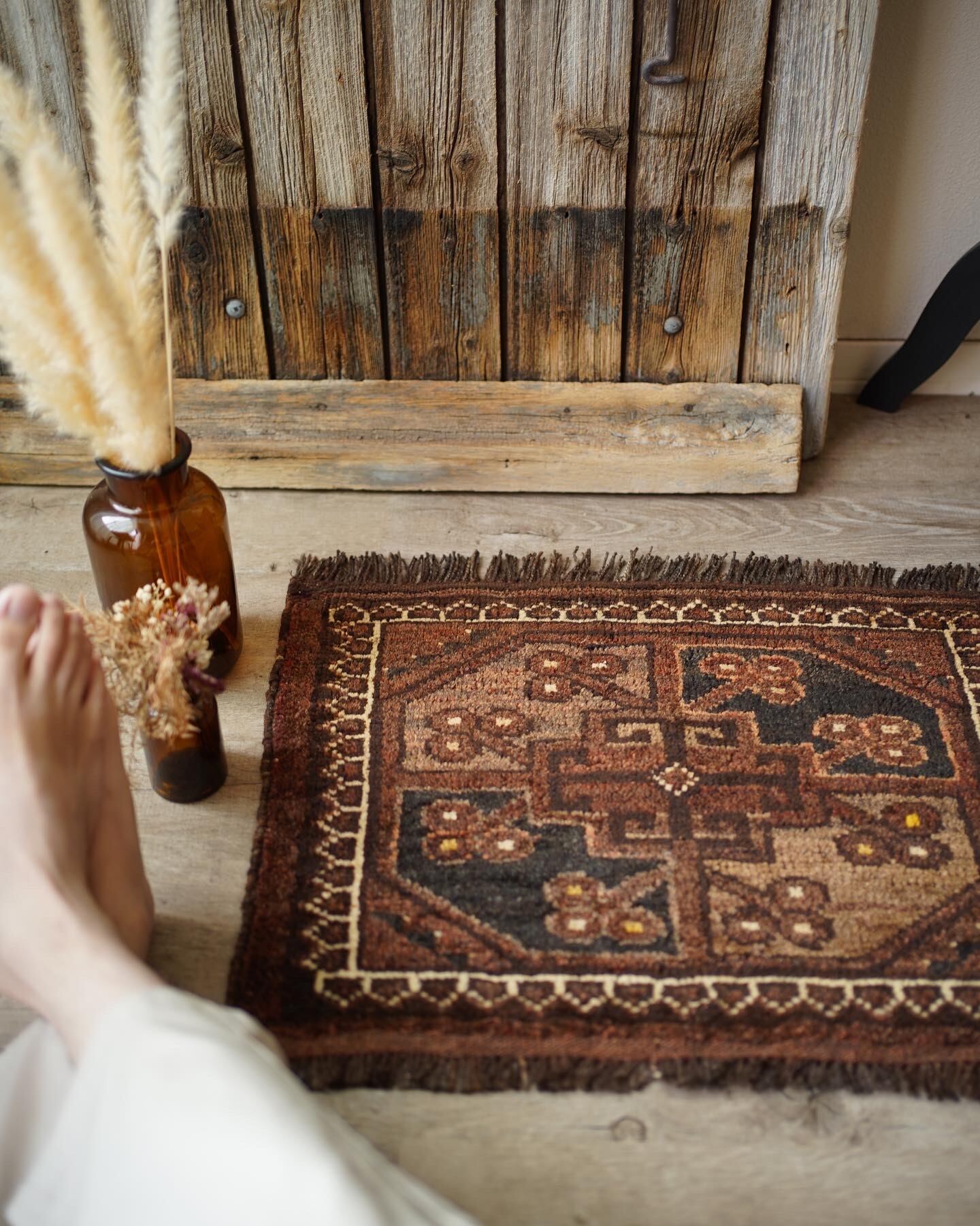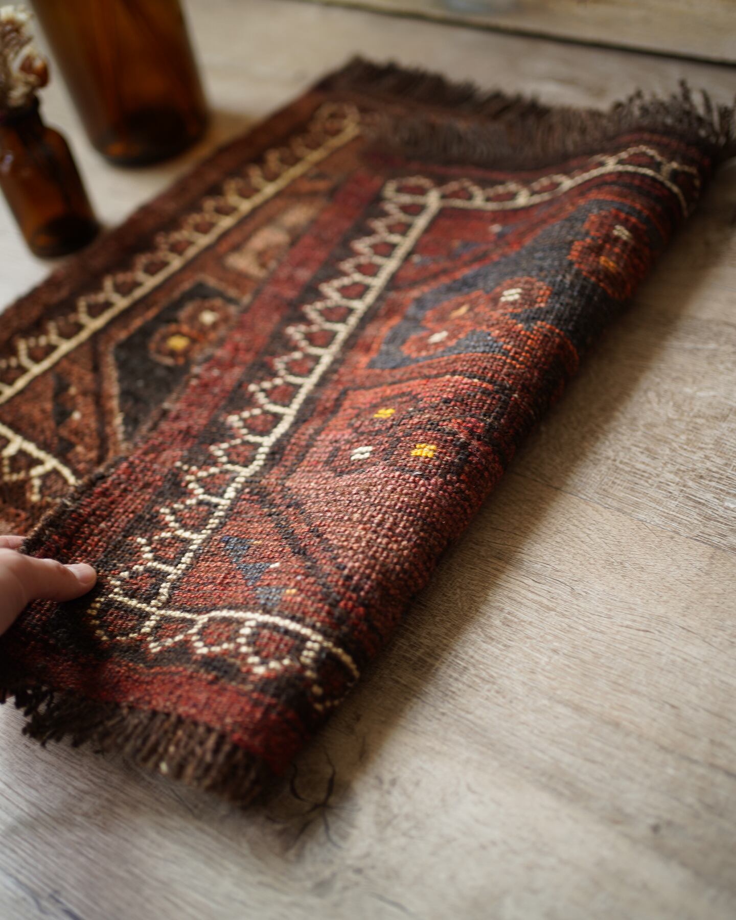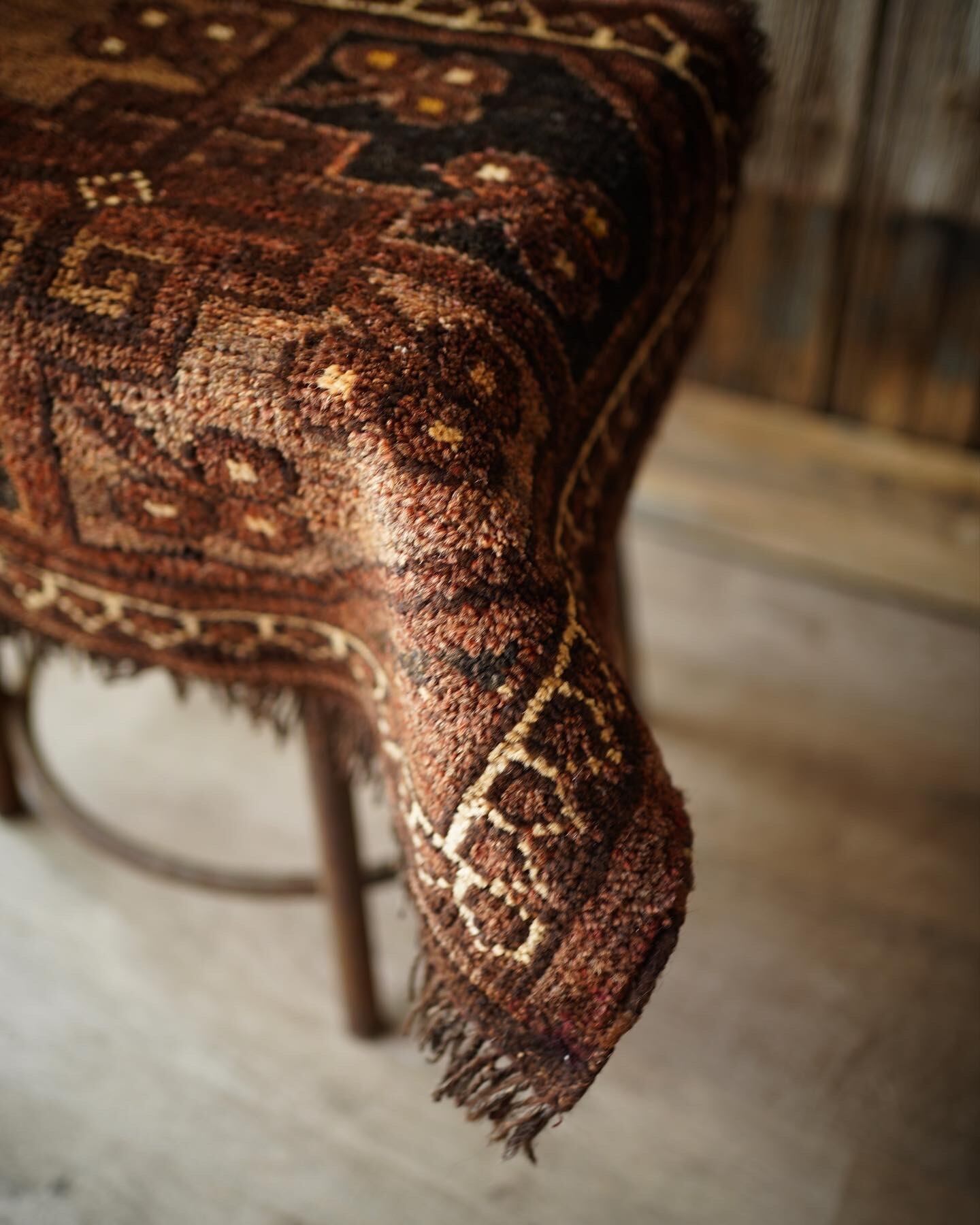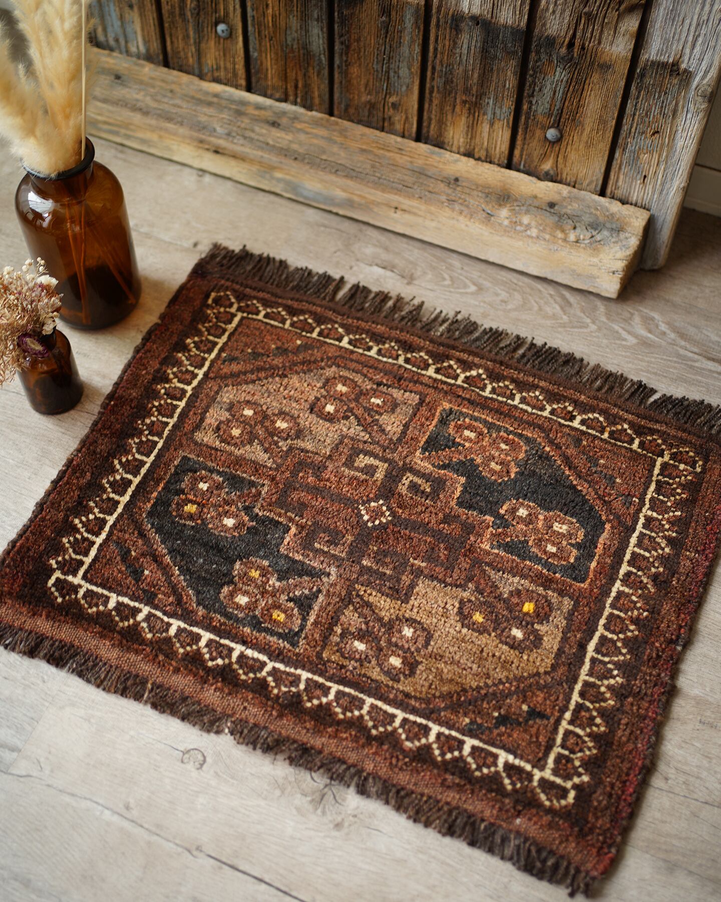 正方形タイプのトルクメンスモールラグ。フィルパイと呼ばれる三つ葉のクローバーのような柄がギュルの中に放射状に伸びたデザイン。元々、遊牧民が移動する際に家畜のロバや馬の背中に掛けて移動用の袋として利用していたサドルバッグの表面を切り取って作られたラグです。柔らかい質感で厚みは6mm程度。観葉植物や花瓶の下に敷いても良さそうですね♫