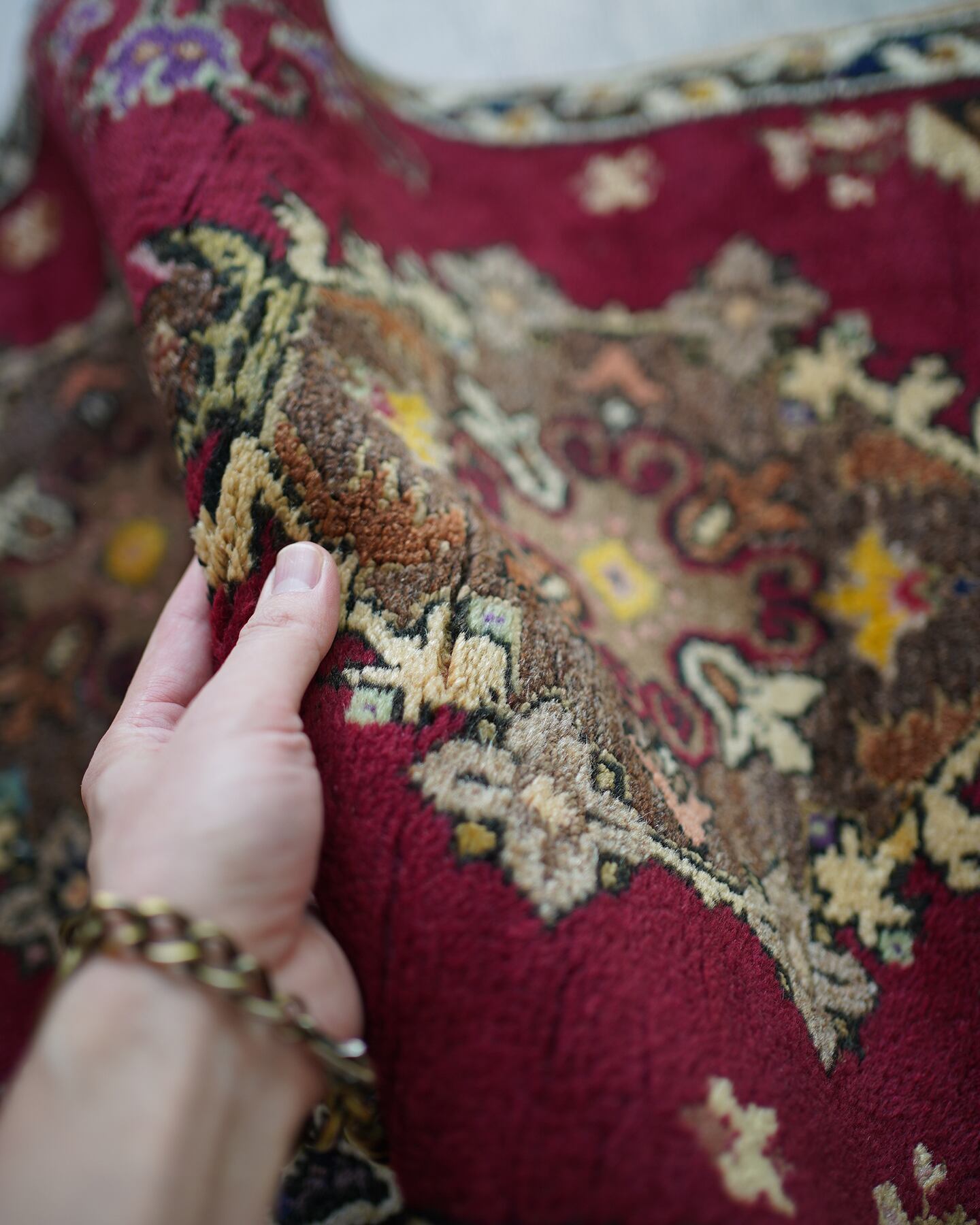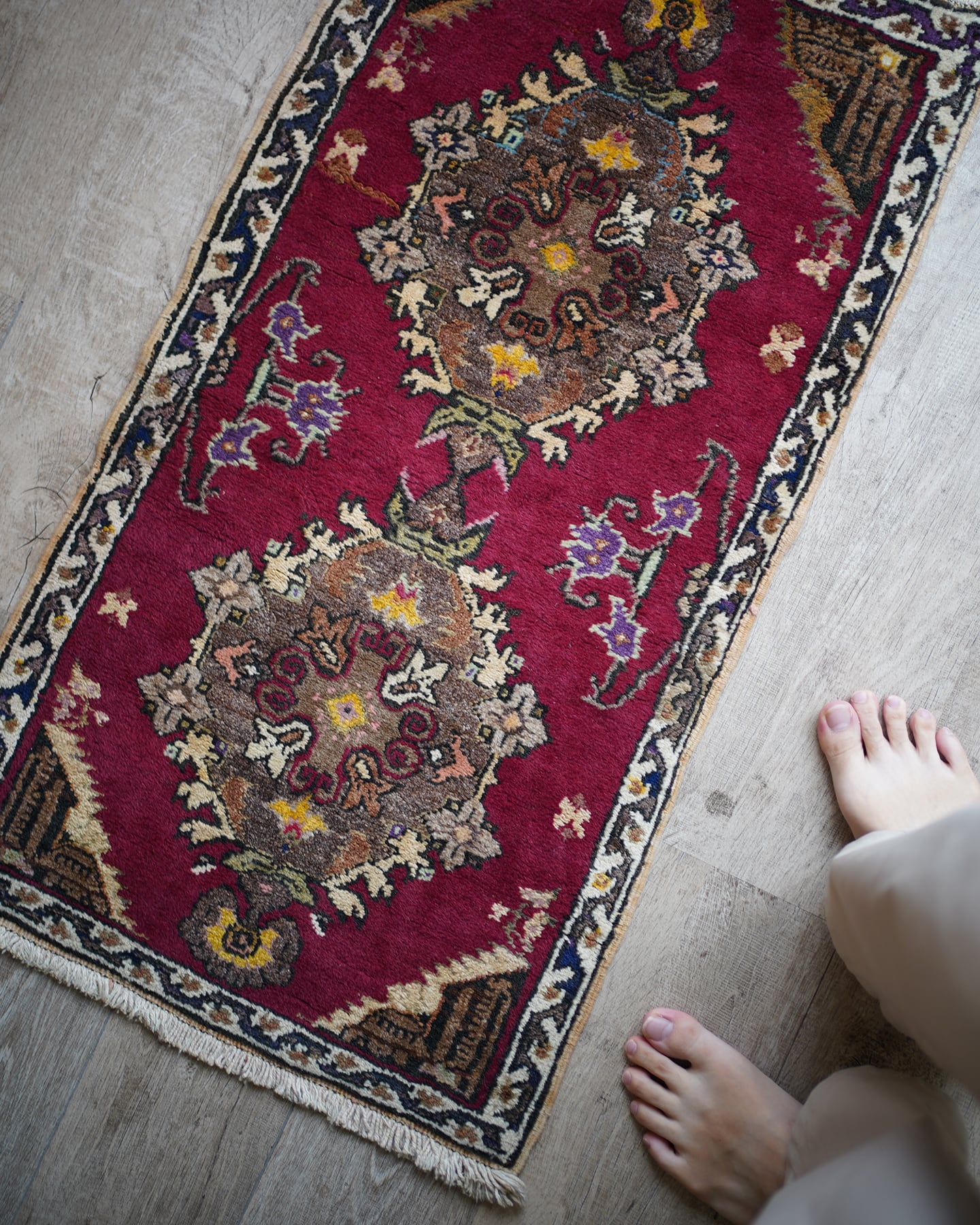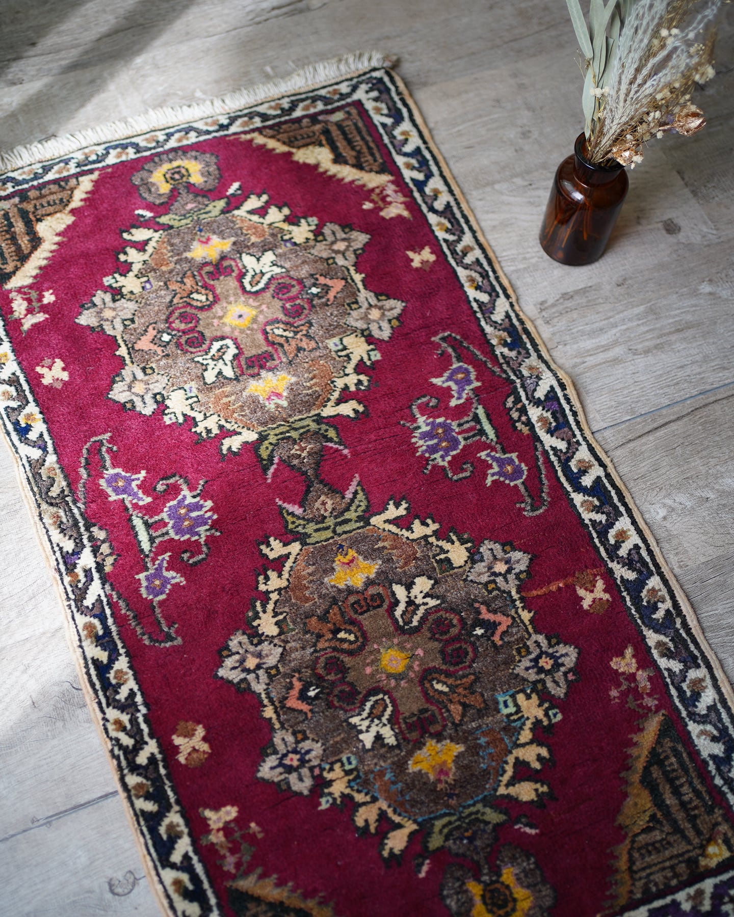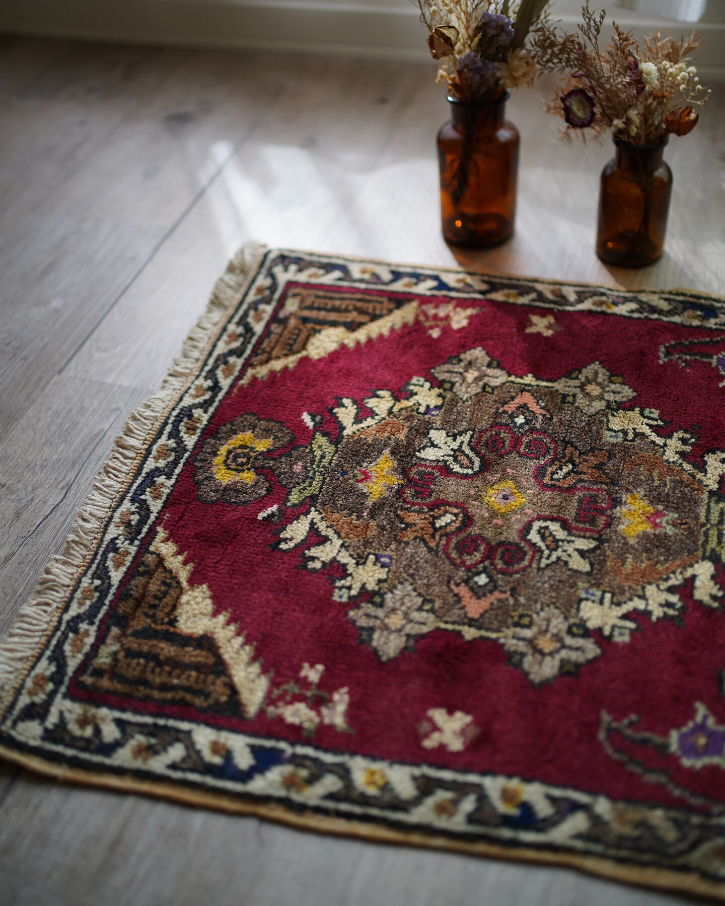 気品漂うカラーリングのトルコ産の手織りラグ。メインのワインレッド色にベージュとブラウンの配色で、ボーダーの紺から紫に変わるグラデーションが素敵な一枚です。サラッとした質感で、厚みは7〜8mm程度。手織り特有の歪みが少しあり、上下の幅がやや異なりますが、全体のバランスから鑑みると、さほど気にならない範囲かと思われます(お写真にてご確認ください)。お気に入りの場所に敷けば、たちまち上品な雰囲気になりますよ♫