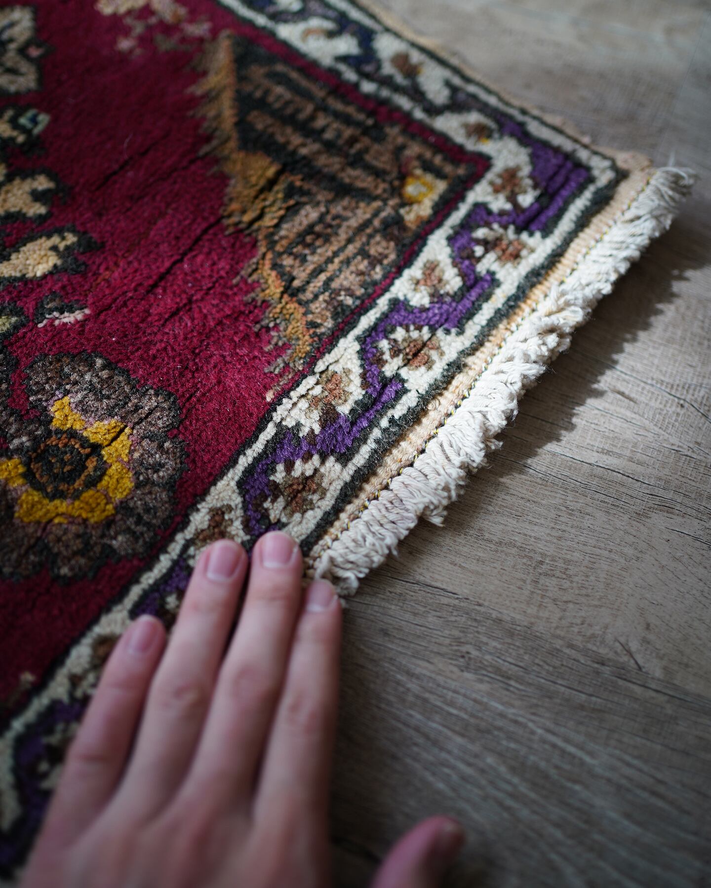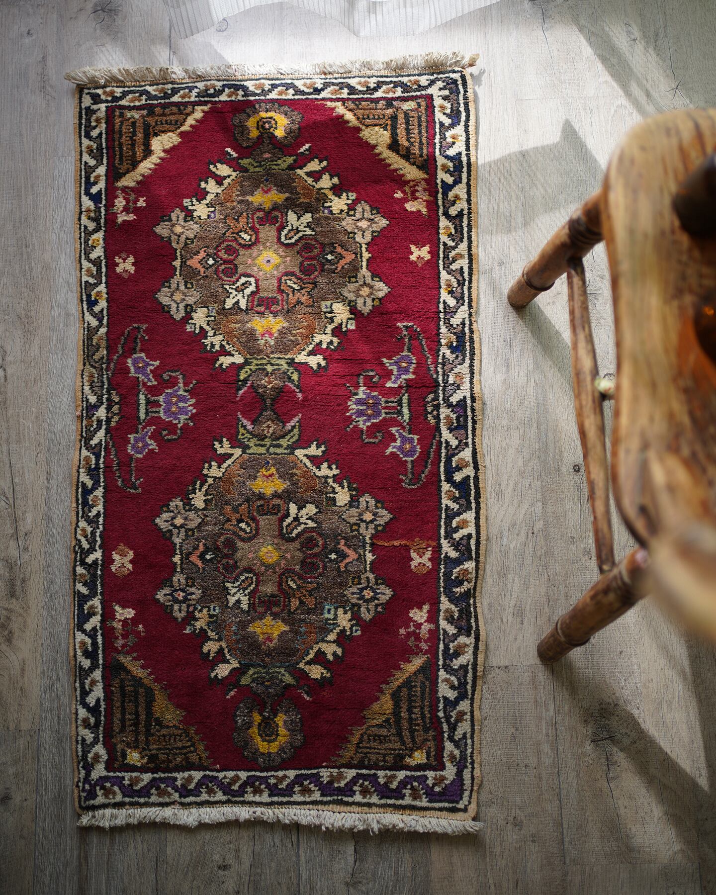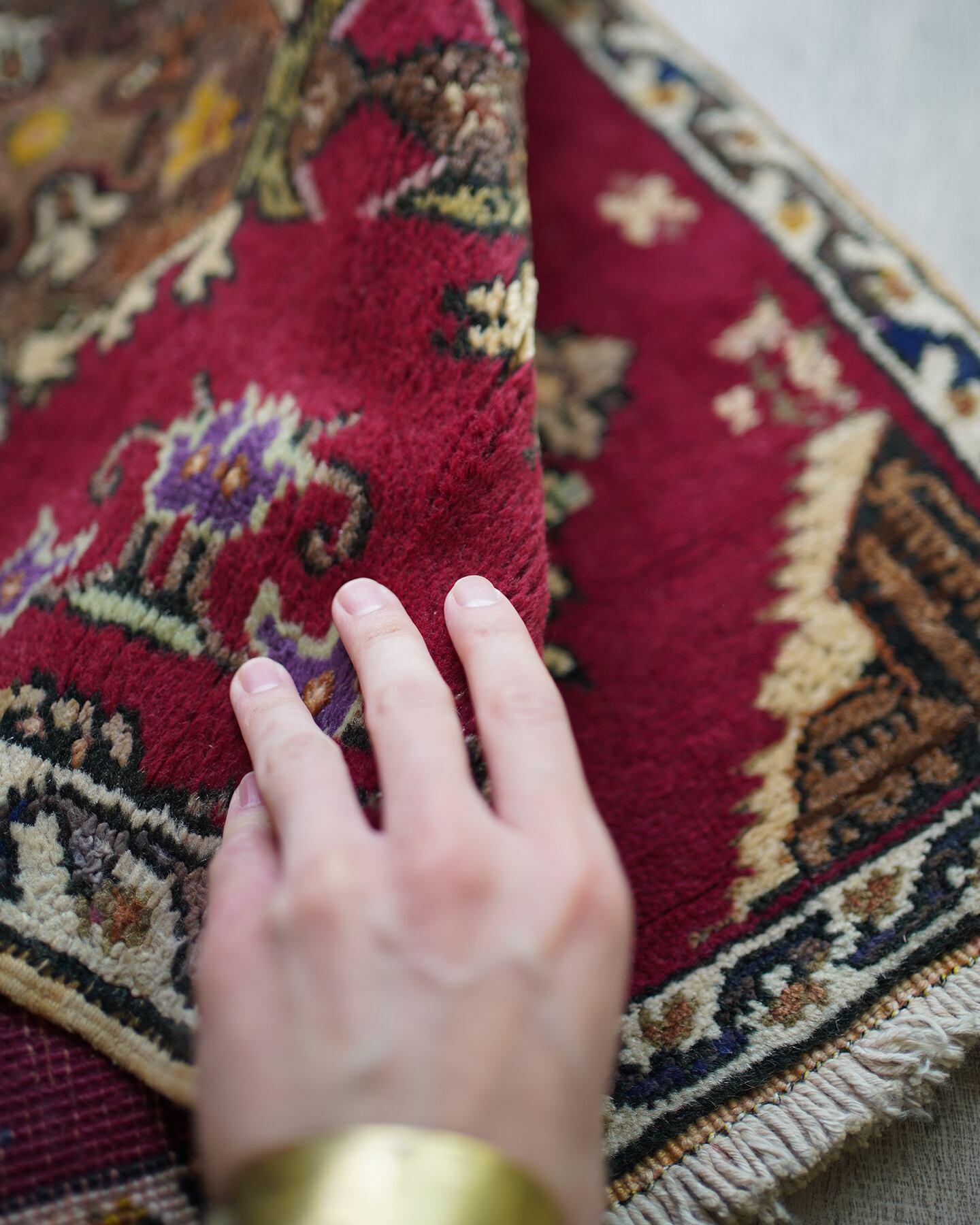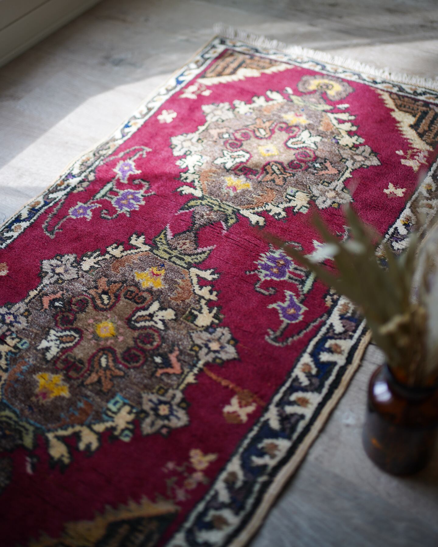 気品漂うカラーリングのトルコ産の手織りラグ。メインのワインレッド色にベージュとブラウンの配色で、ボーダーの紺から紫に変わるグラデーションが素敵な一枚です。サラッとした質感で、厚みは7〜8mm程度。手織り特有の歪みが少しあり、上下の幅がやや異なりますが、全体のバランスから鑑みると、さほど気にならない範囲かと思われます(お写真にてご確認ください)。お気に入りの場所に敷けば、たちまち上品な雰囲気になりますよ♫