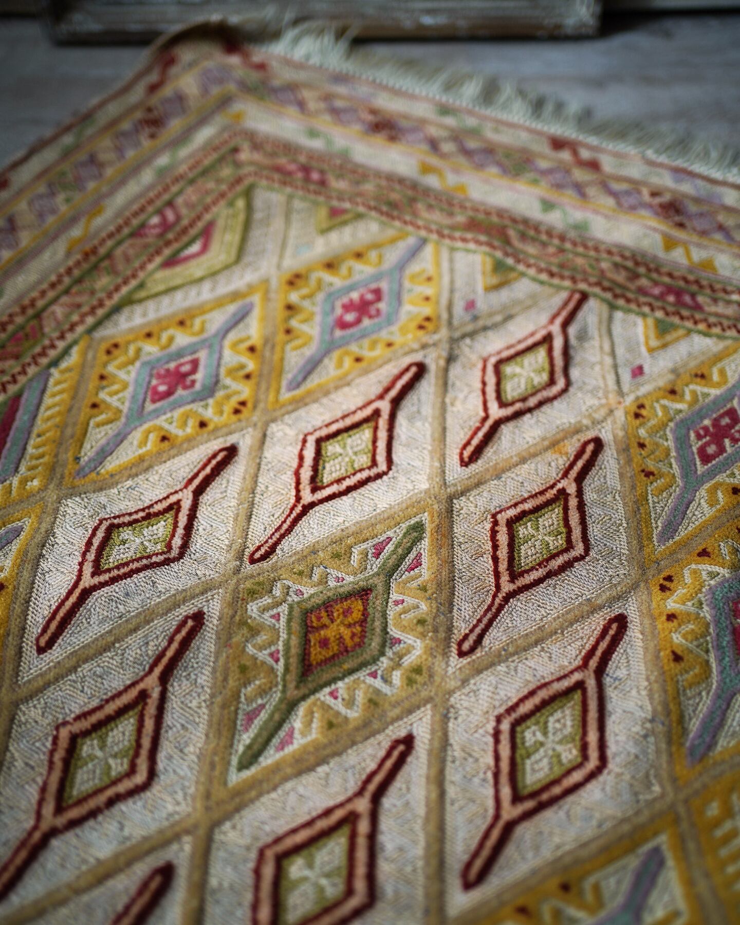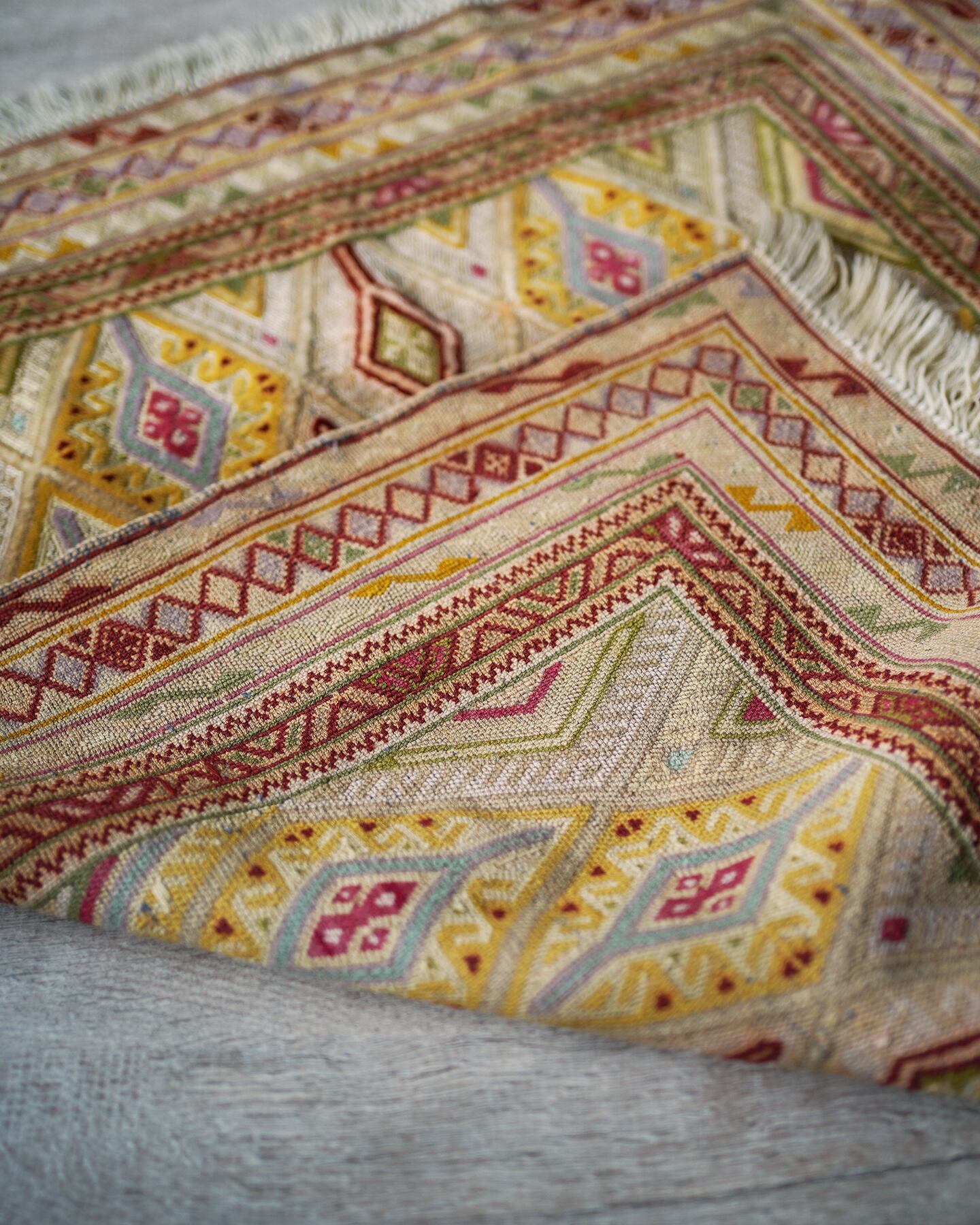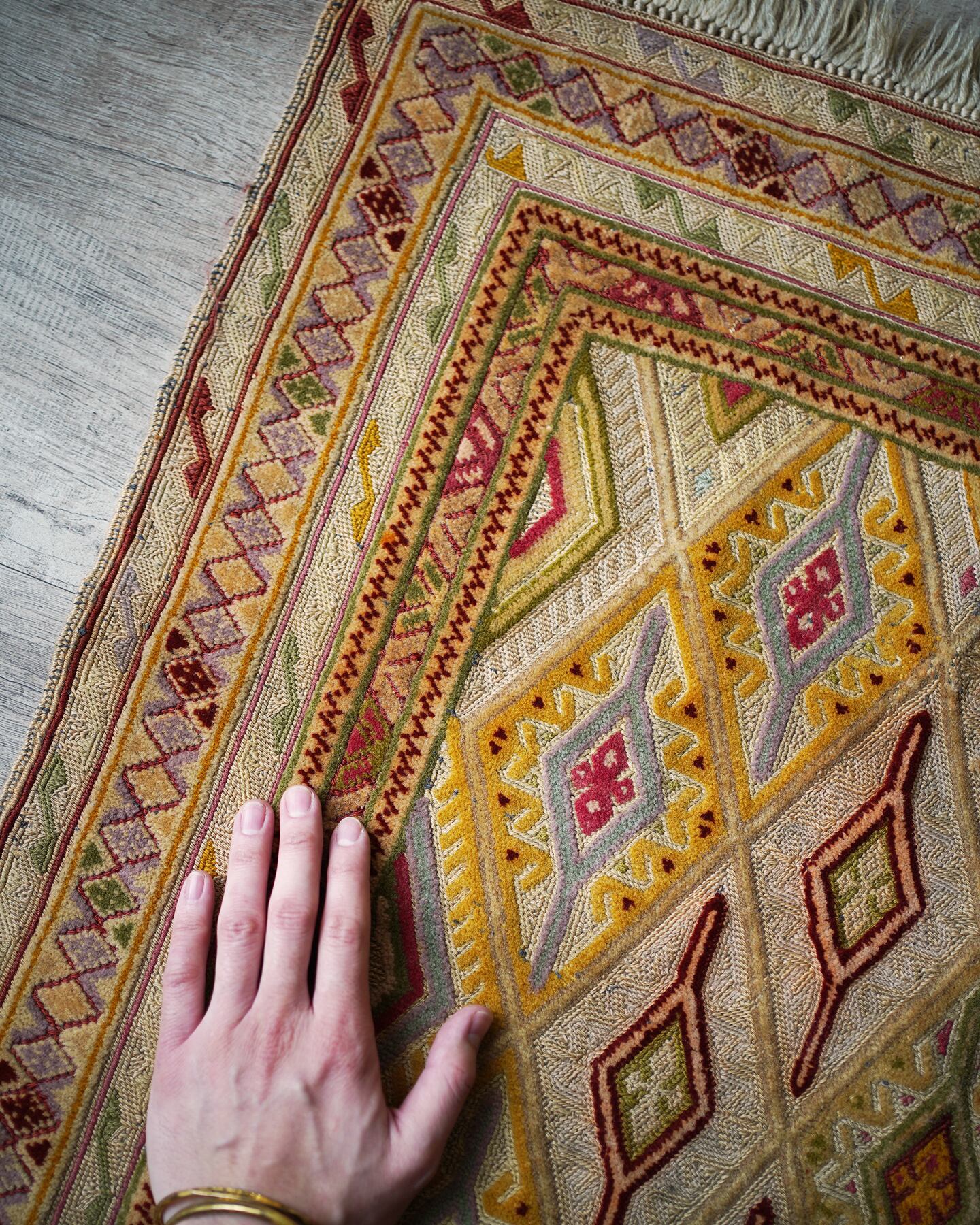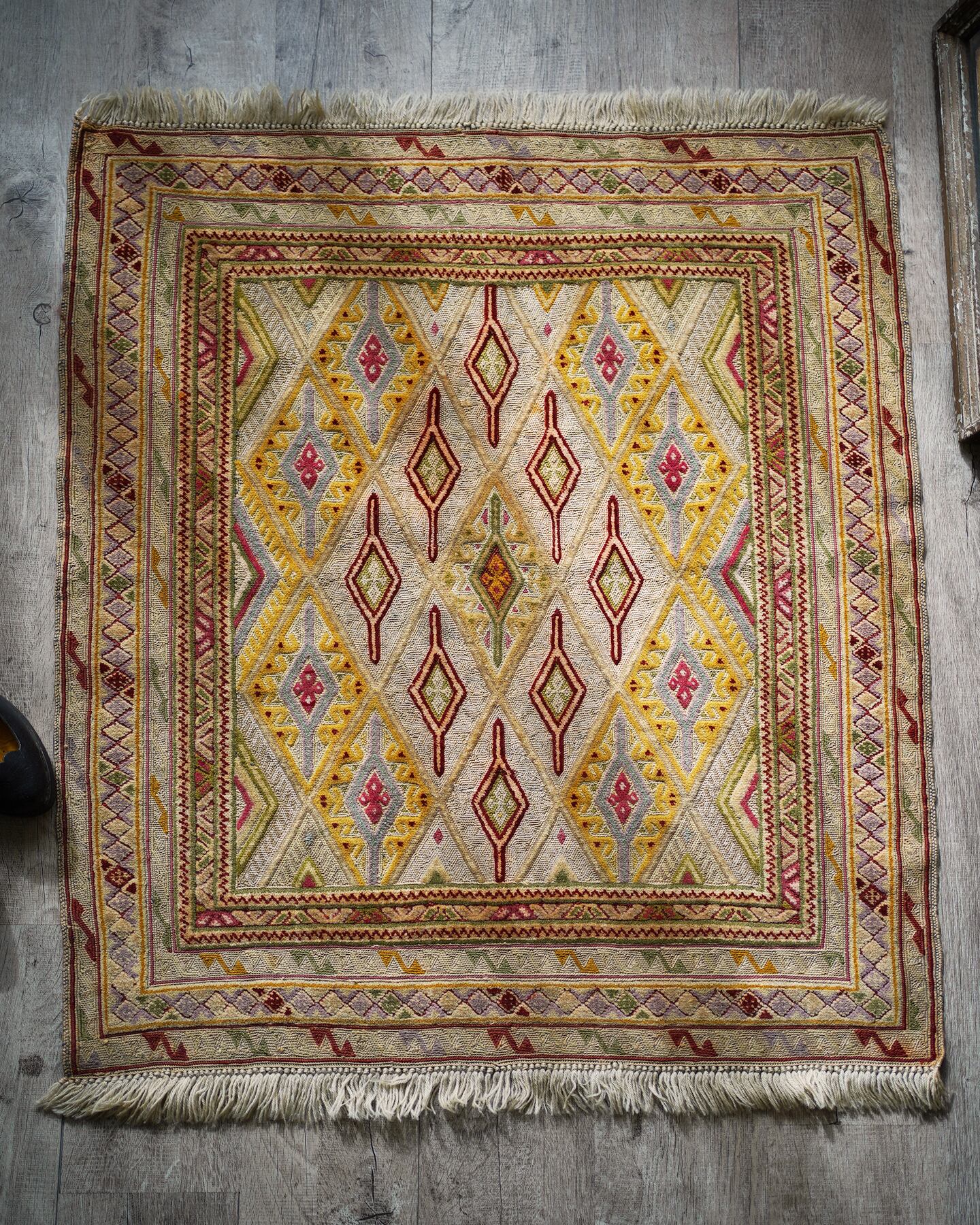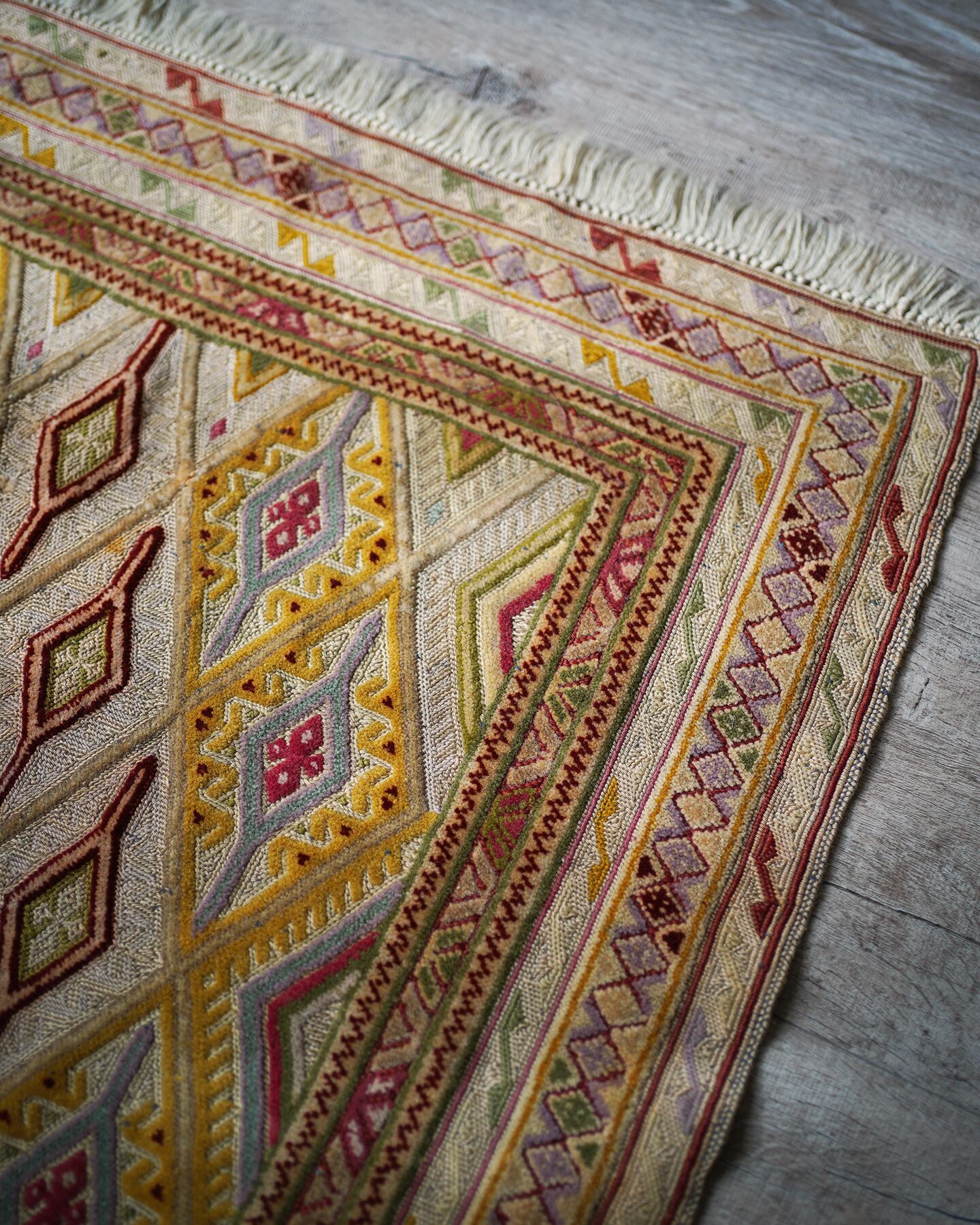 くすんだベージュの色味をベースカラーに菱形のマスタードイエローが可愛らしいマニュワニラグ。凹凸したポコポコとした感触が特徴的で、パイル織り(絨毯)と平織り(キリム)を組み合わせた技法で織られています。淡いピンクや赤紫色、薄い黄緑色なども使われており、全体的にカラフルでありながらも落ち着きのある雰囲気の一枚です。手触りはサラふわっとしており、厚みは3mm〜4mm程度で薄めです。ペラっとした質感のため、タペストリーとして飾っても可愛いかと思います♪