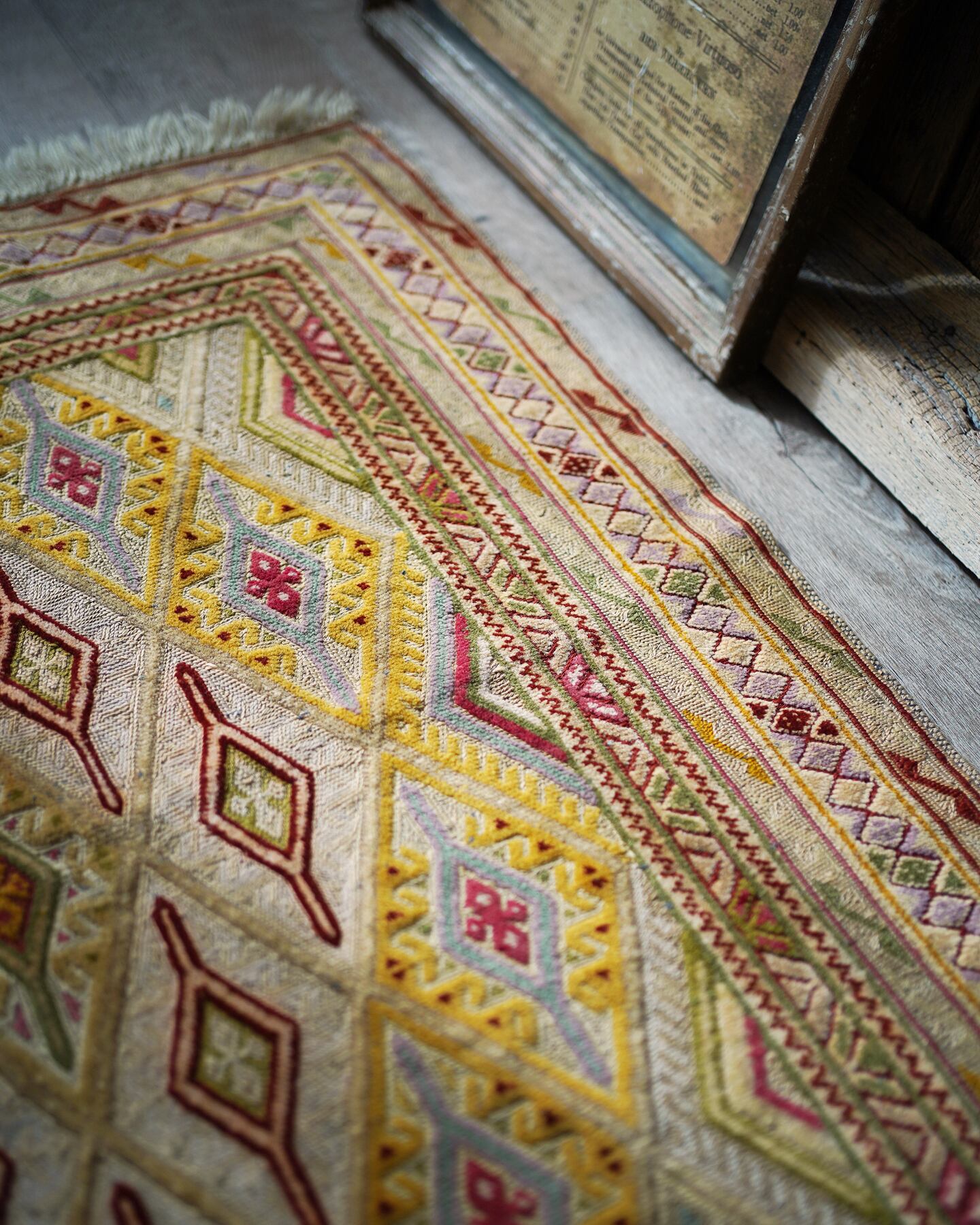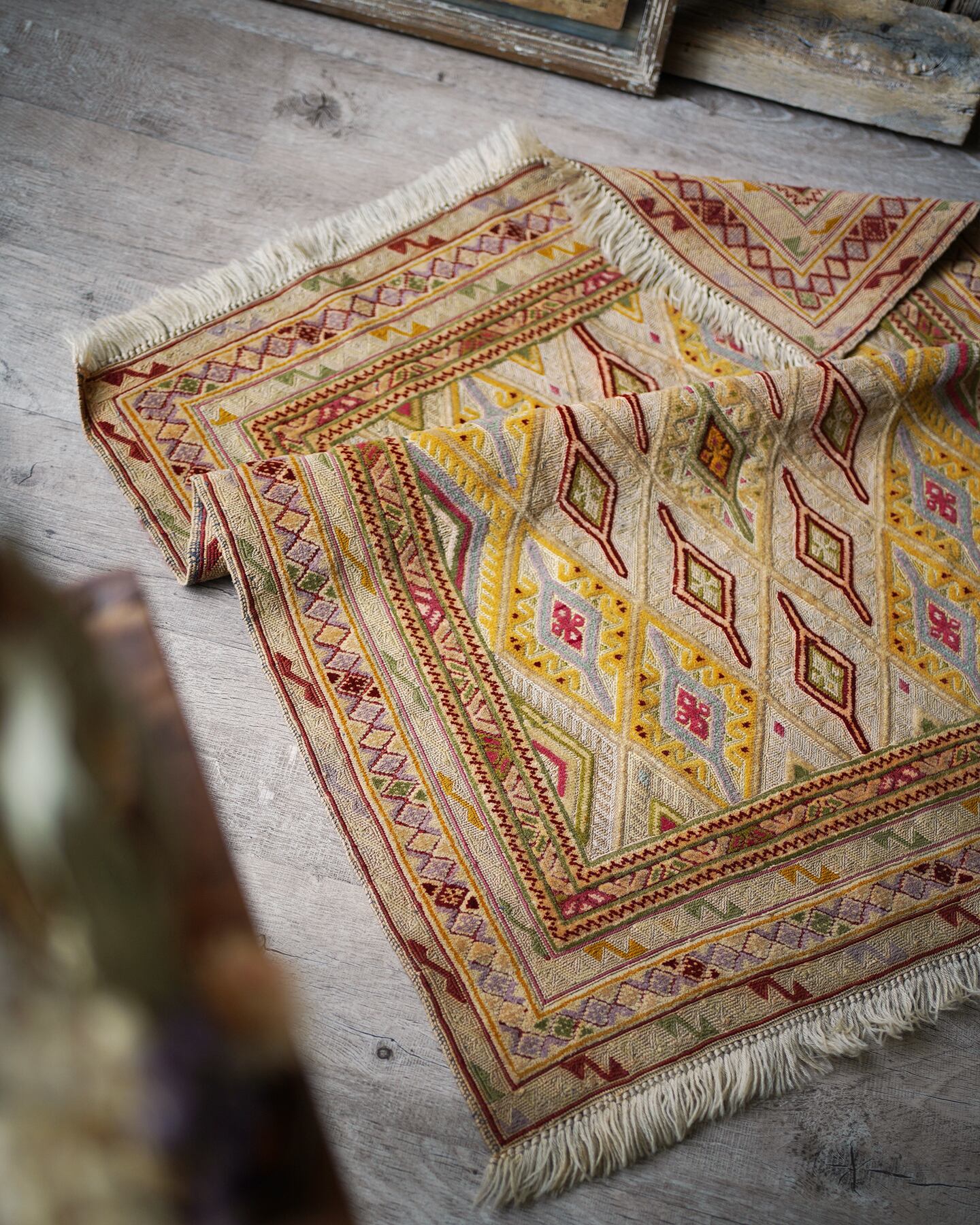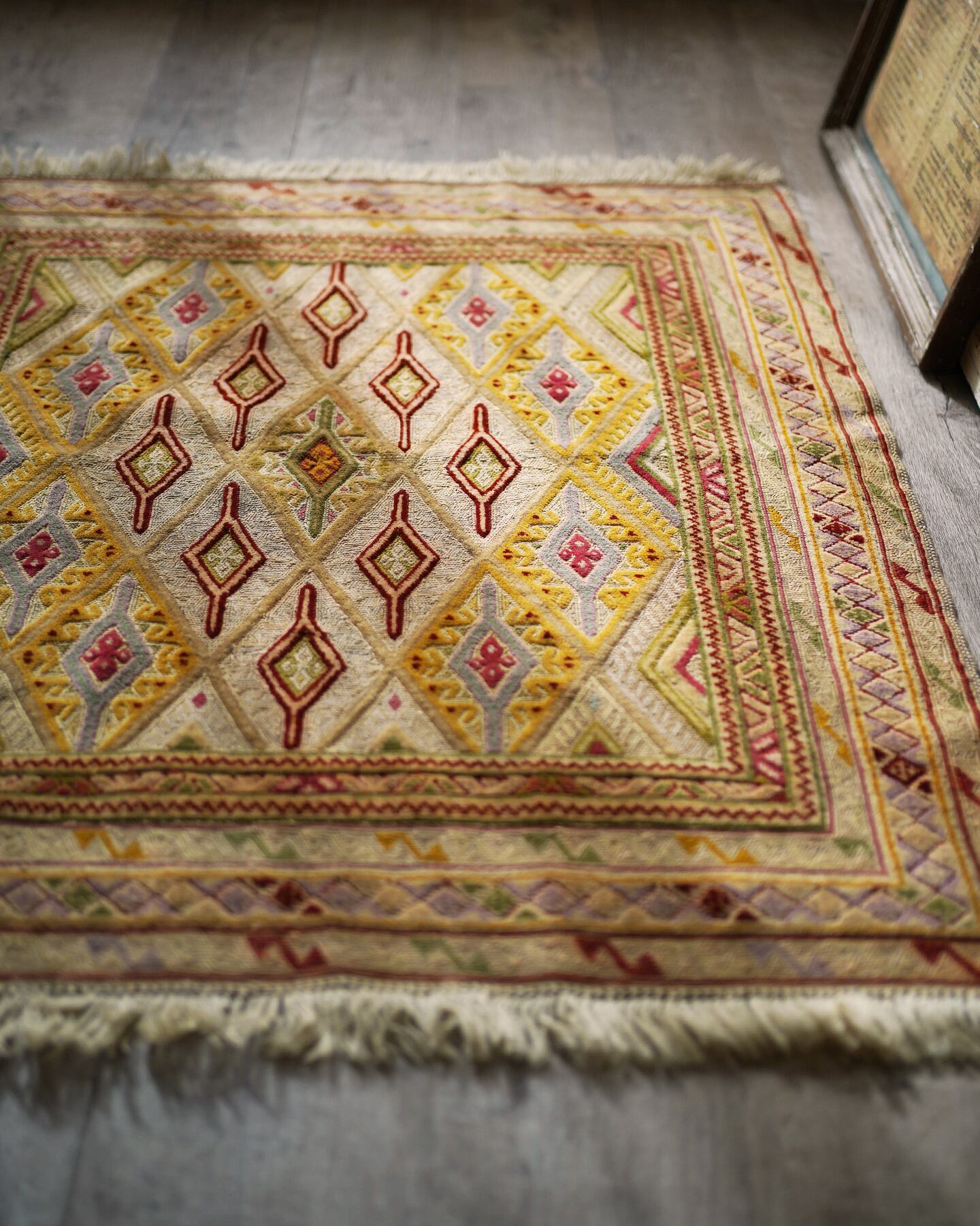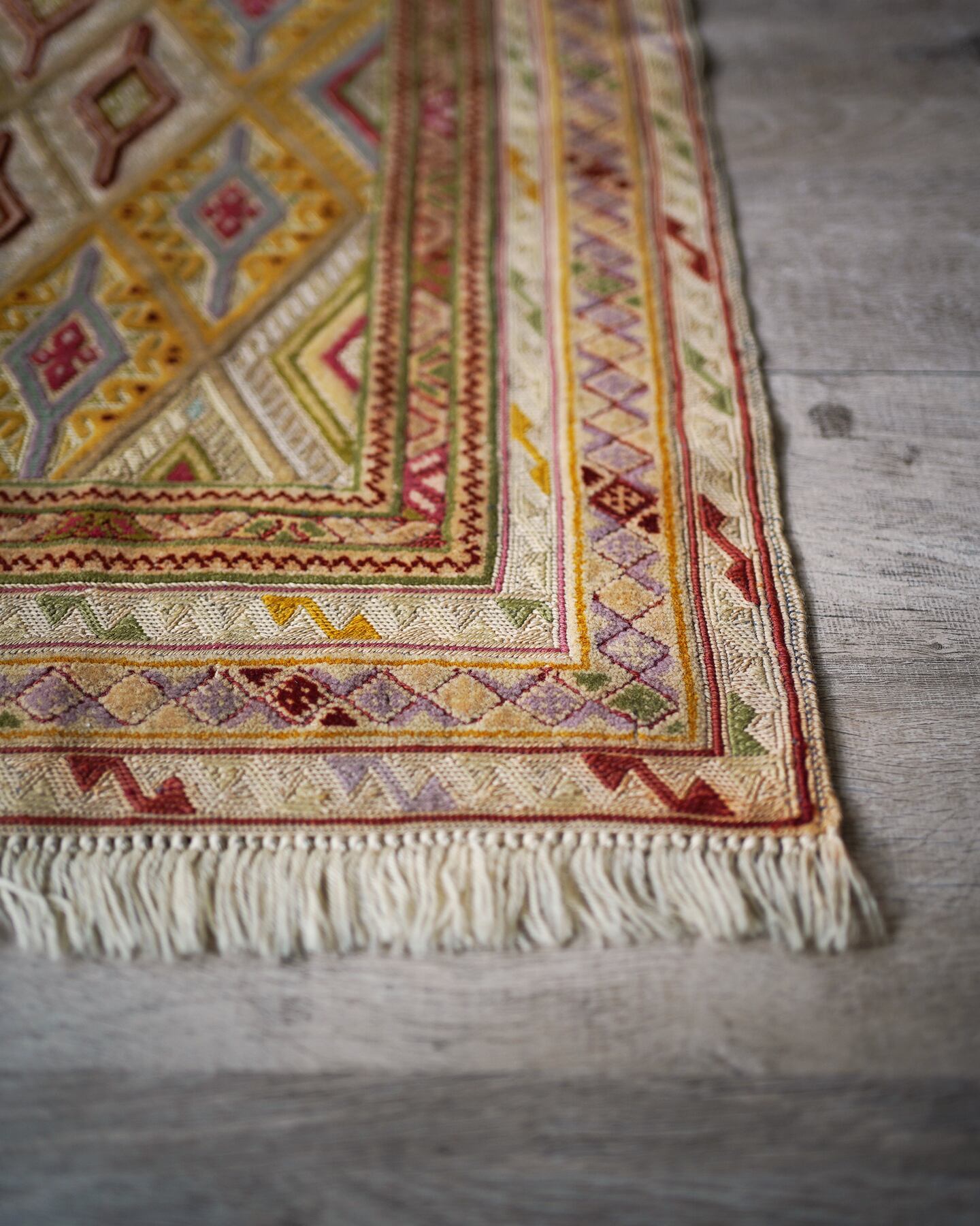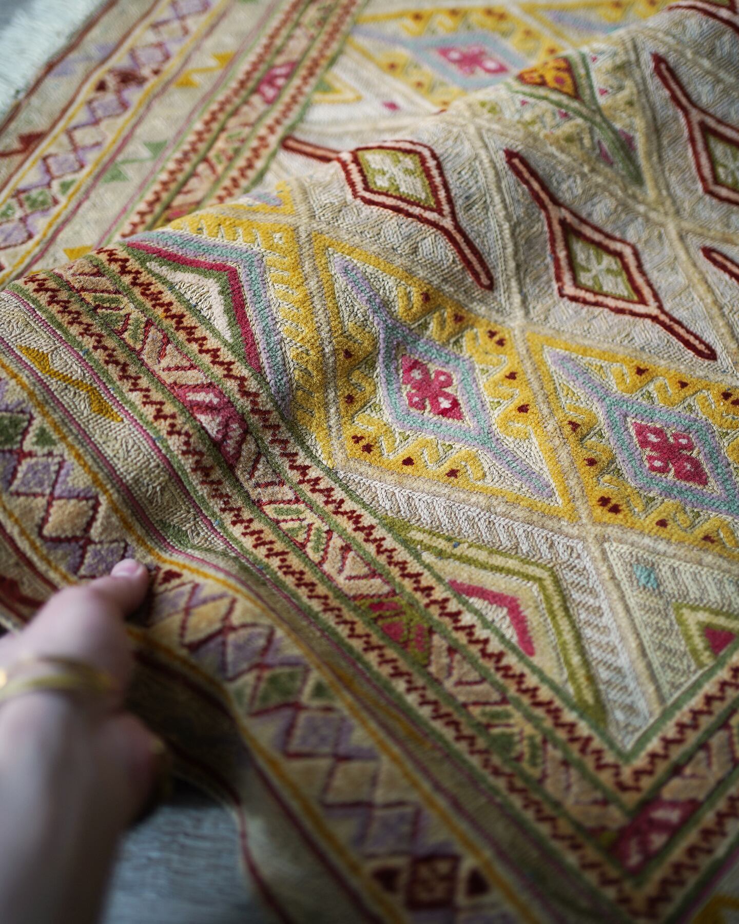 くすんだベージュの色味をベースカラーに菱形のマスタードイエローが可愛らしいマニュワニラグ。凹凸したポコポコとした感触が特徴的で、パイル織り(絨毯)と平織り(キリム)を組み合わせた技法で織られています。淡いピンクや赤紫色、薄い黄緑色なども使われており、全体的にカラフルでありながらも落ち着きのある雰囲気の一枚です。手触りはサラふわっとしており、厚みは3mm〜4mm程度で薄めです。ペラっとした質感のため、タペストリーとして飾っても可愛いかと思います♪