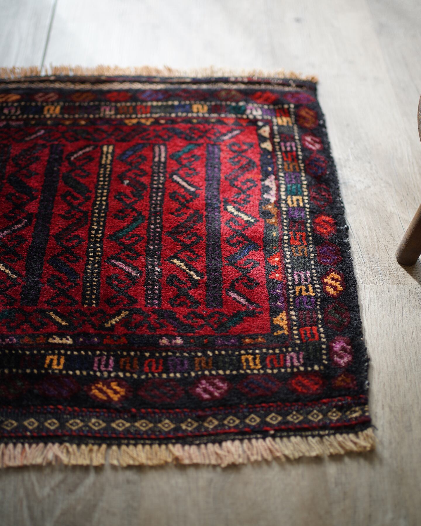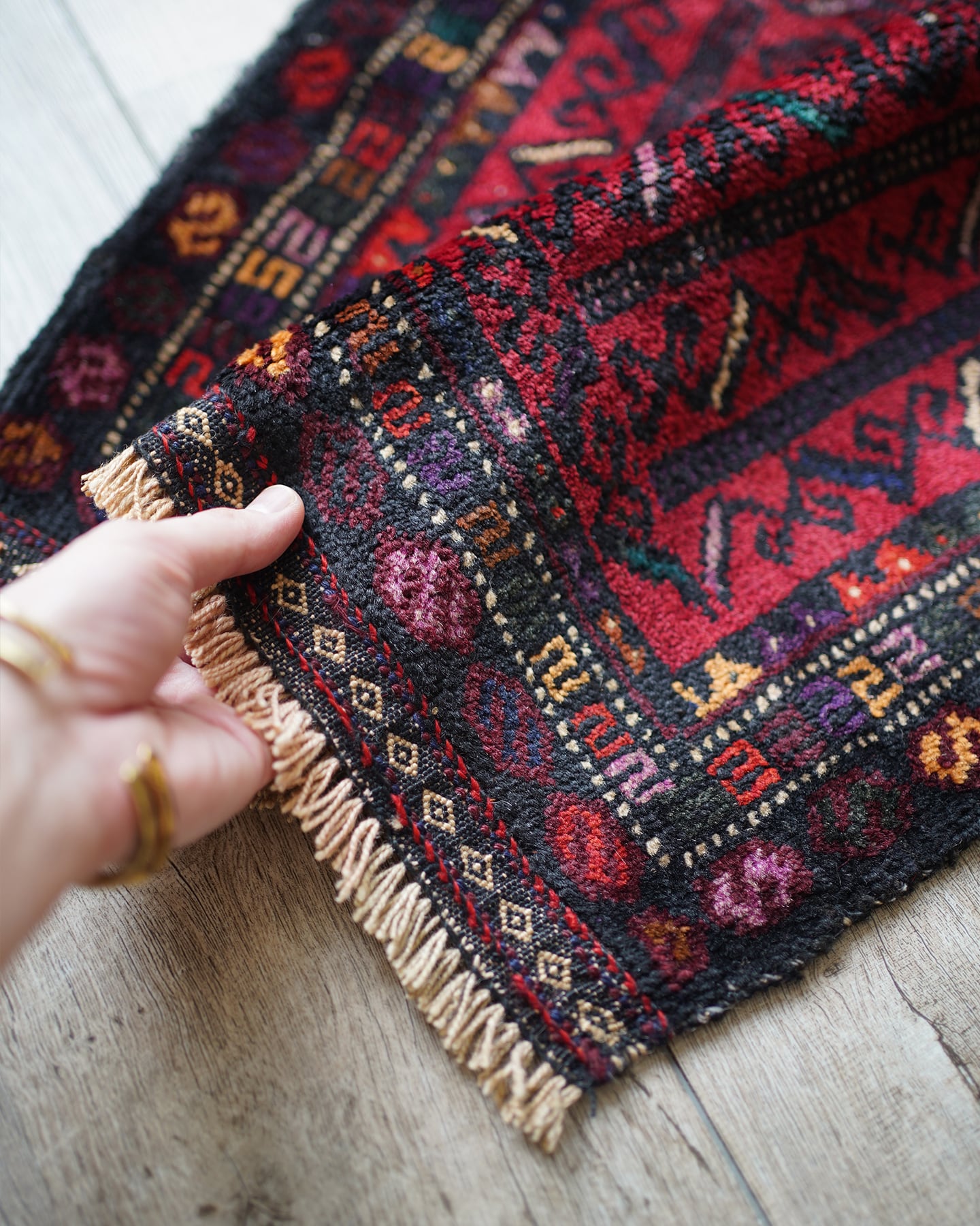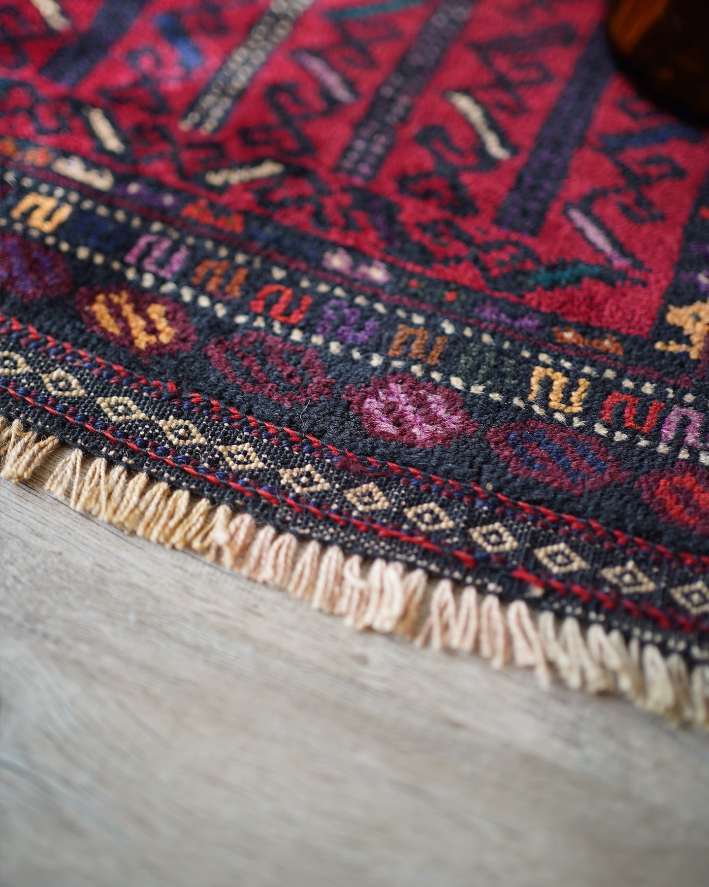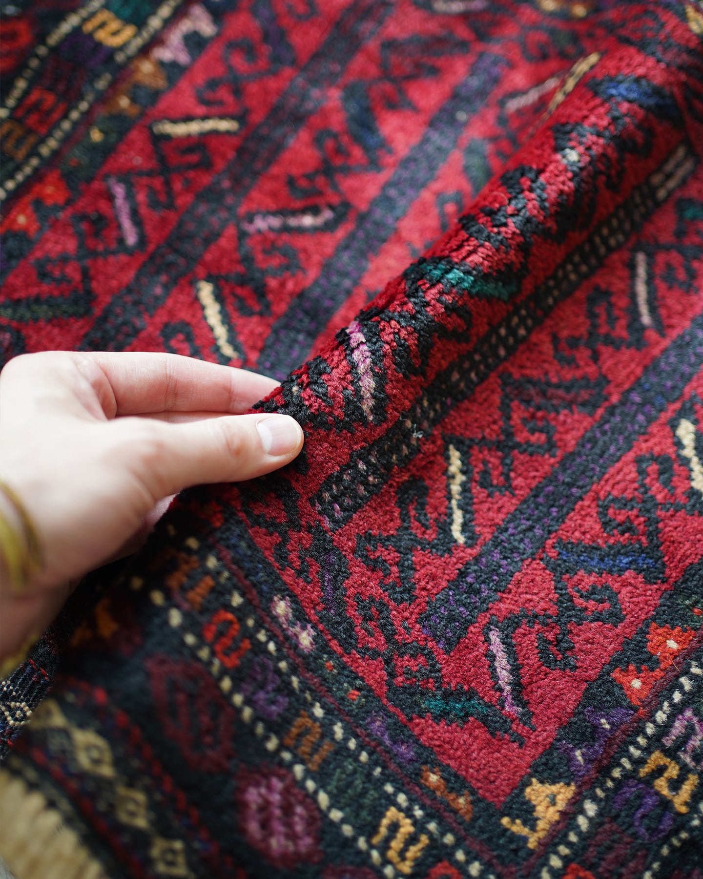 経年35年のアフガンバルーチラグ。カラーリングは真ん中部分が深い赤色、周りのボーダー部分は黒色で、細かい装飾で全体的にバイオレットやピンク、オレンジやグリーンなどカラフルな配色が使われています。また上下はキリムエンドになっています。サラっと滑らかで優しい触り心地、厚みは6mm程度で柔らかい質感です。コンディションも良好。観葉植物や花瓶など置いても可愛くなりそう♫