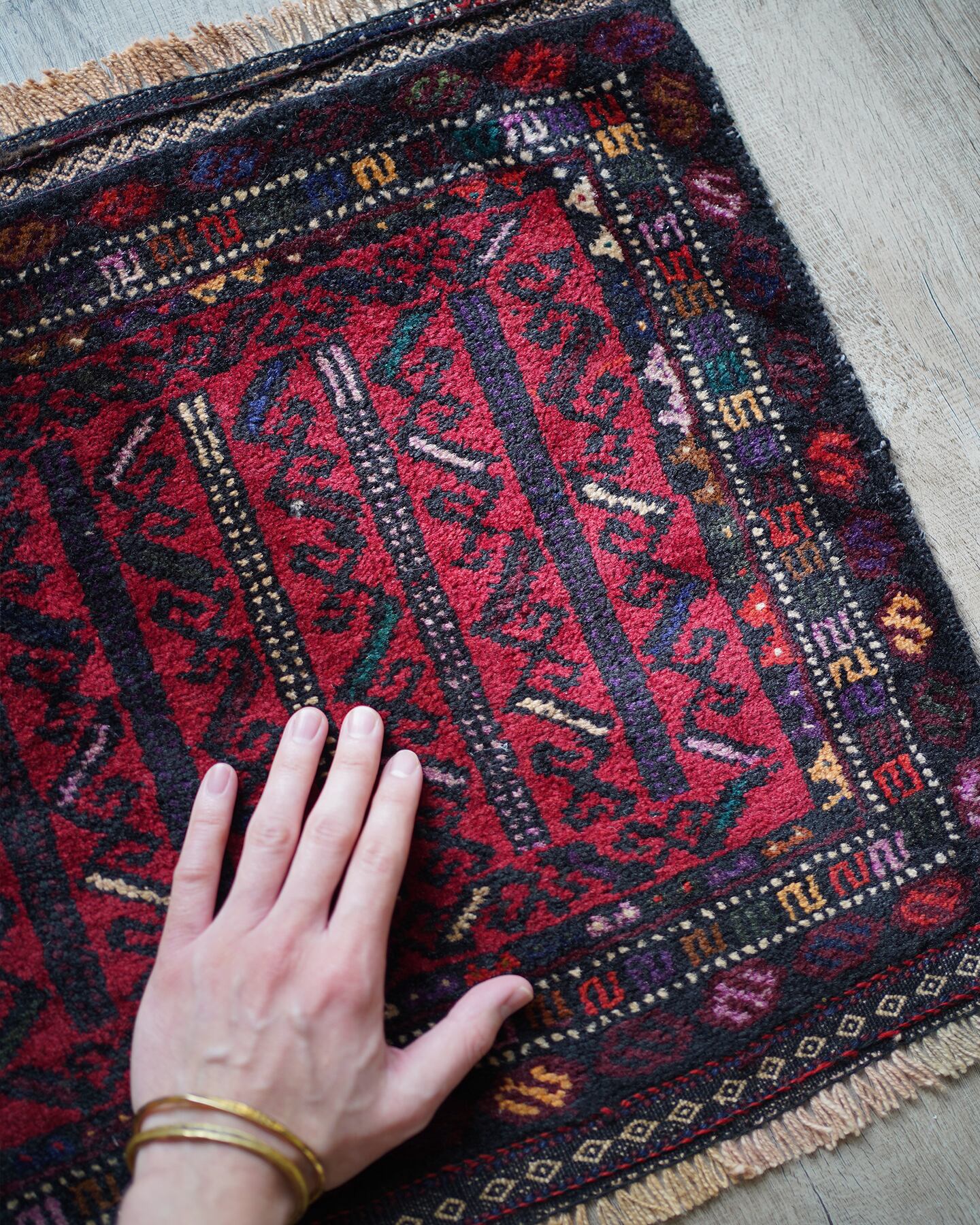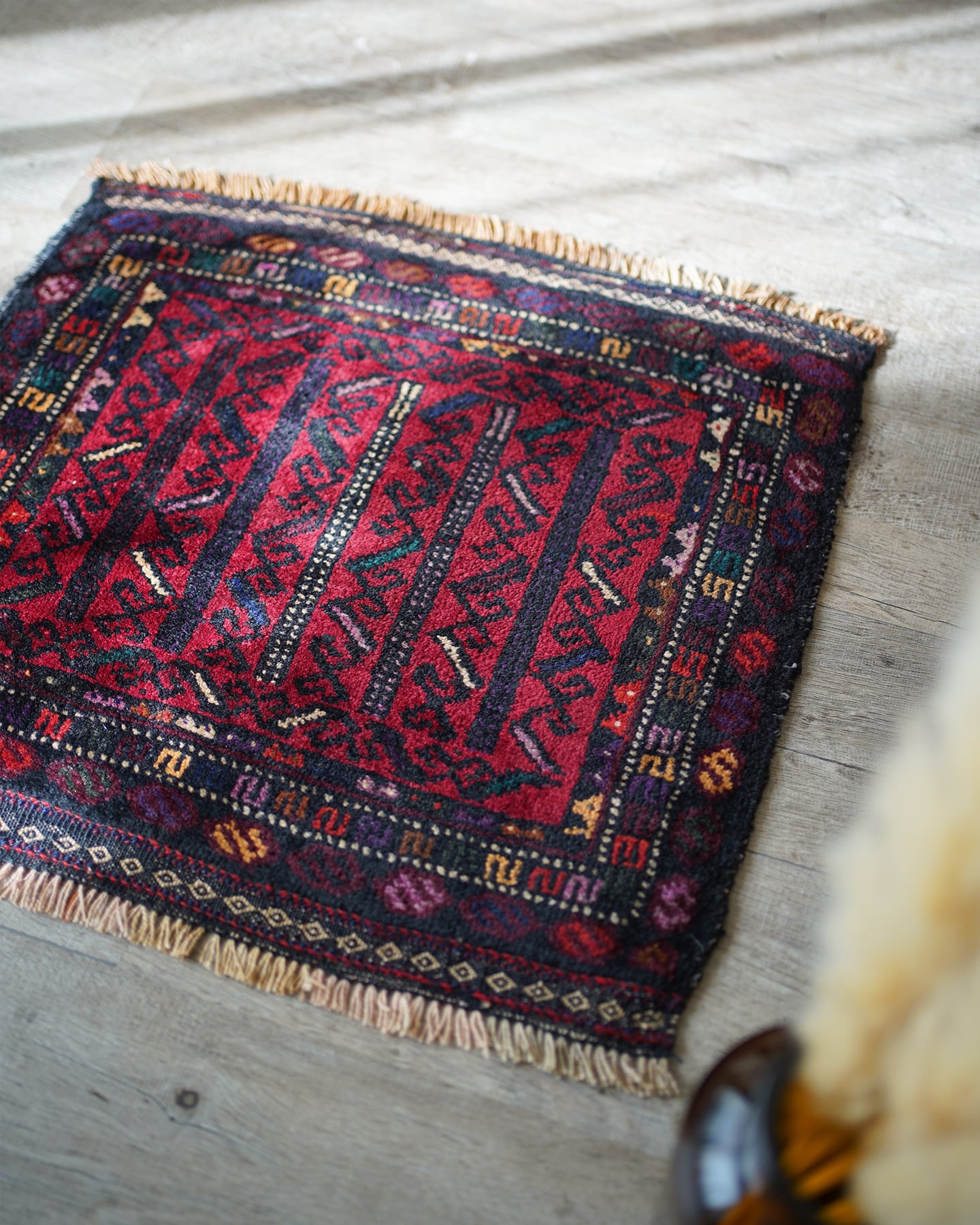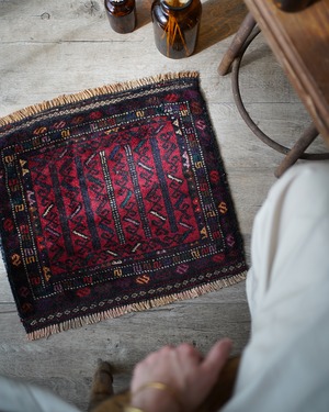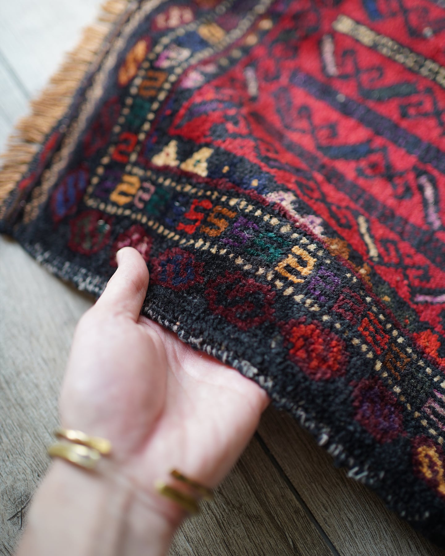経年35年のアフガンバルーチラグ。カラーリングは真ん中部分が深い赤色、周りのボーダー部分は黒色で、細かい装飾で全体的にバイオレットやピンク、オレンジやグリーンなどカラフルな配色が使われています。また上下はキリムエンドになっています。サラっと滑らかで優しい触り心地、厚みは6mm程度で柔らかい質感です。コンディションも良好。観葉植物や花瓶など置いても可愛くなりそう♫