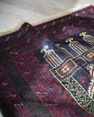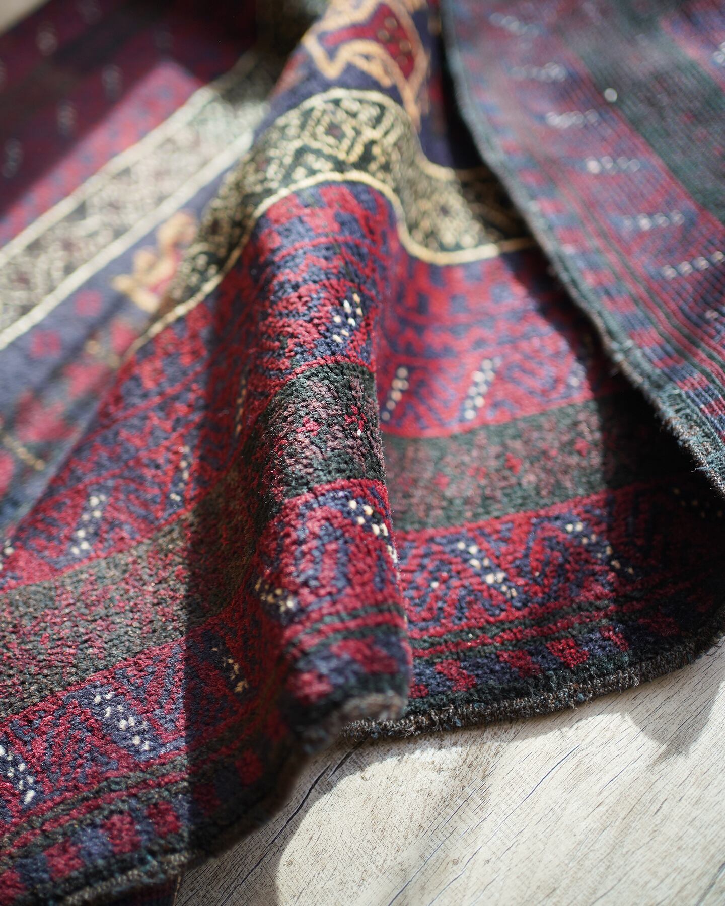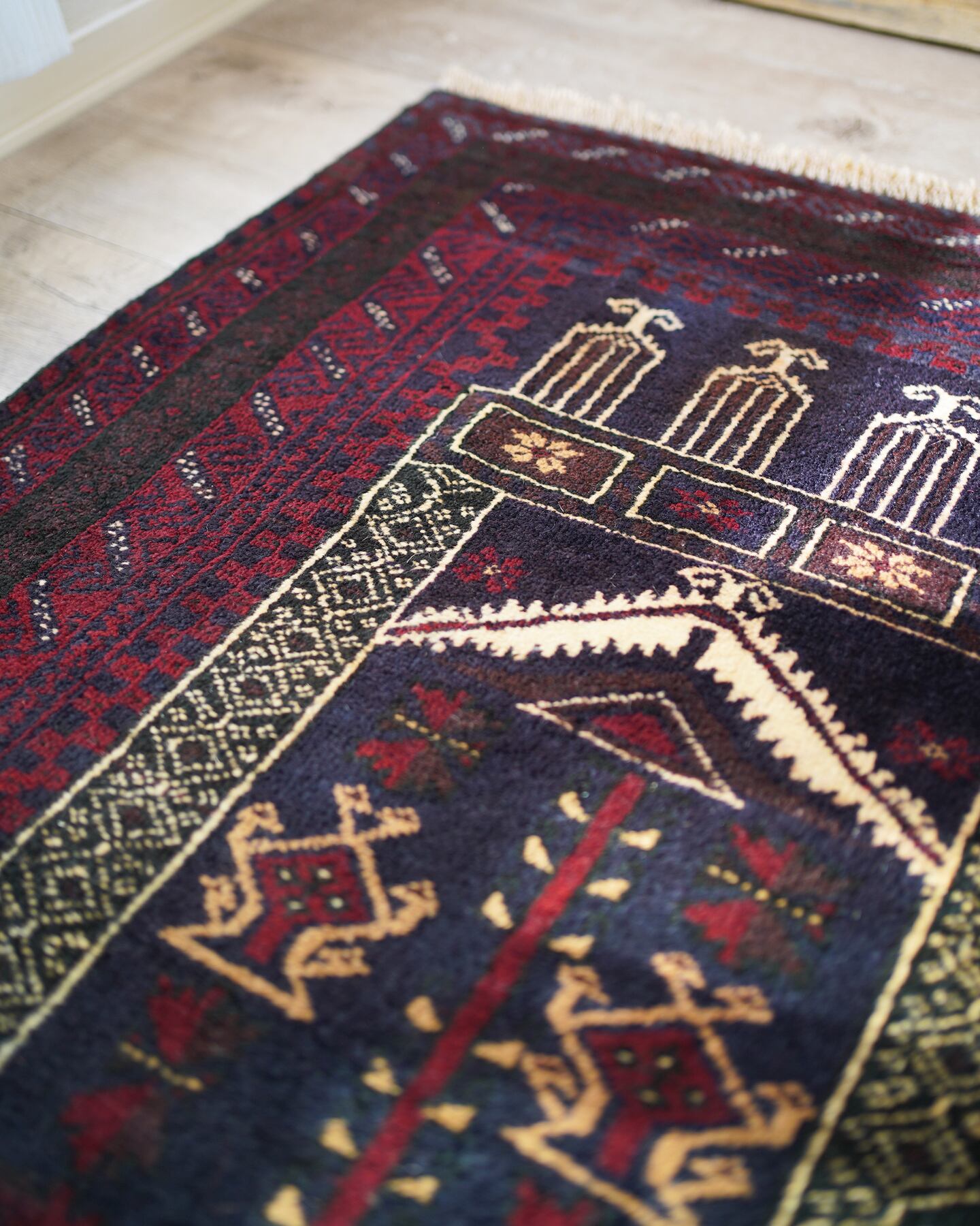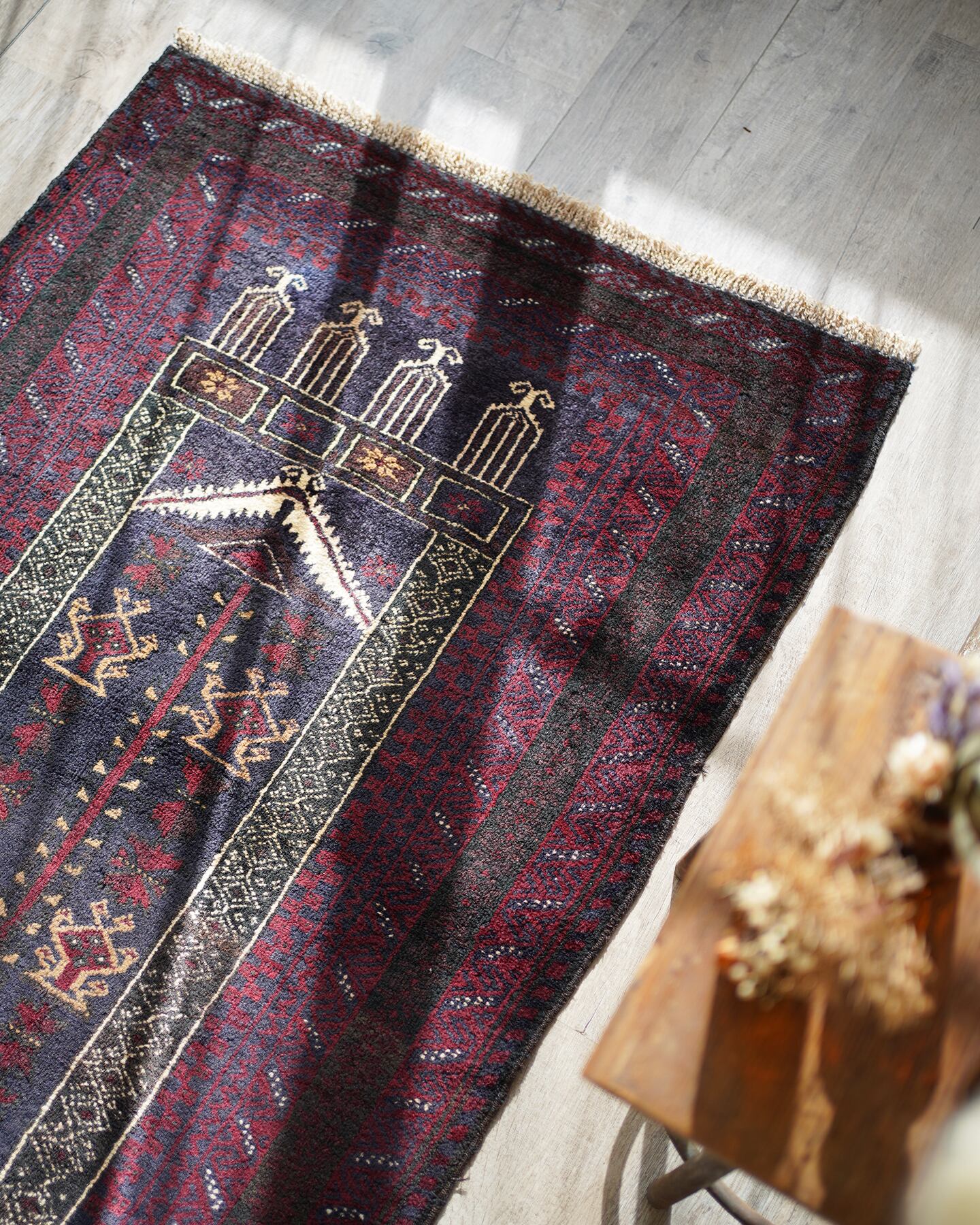 経年40年のバルーチプレイヤーラグ。深い紫色と濃紺のカラーリングが素敵で仕入れを決めた一枚です。深い色味で落ち着いた印象でありながらも、しっかりと存在感があります。ふわっとしていて柔らかく、気持ちの良い肌触りで、毛並みは8mm程度。程よい厚みがありますので、上に座っても心地良いです。補修跡も無く、コンディションも大変良好。リビングやベッドルームなどお気に入りの場所にどうぞ♫