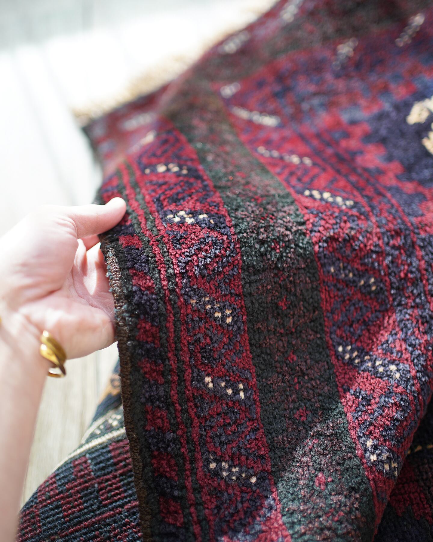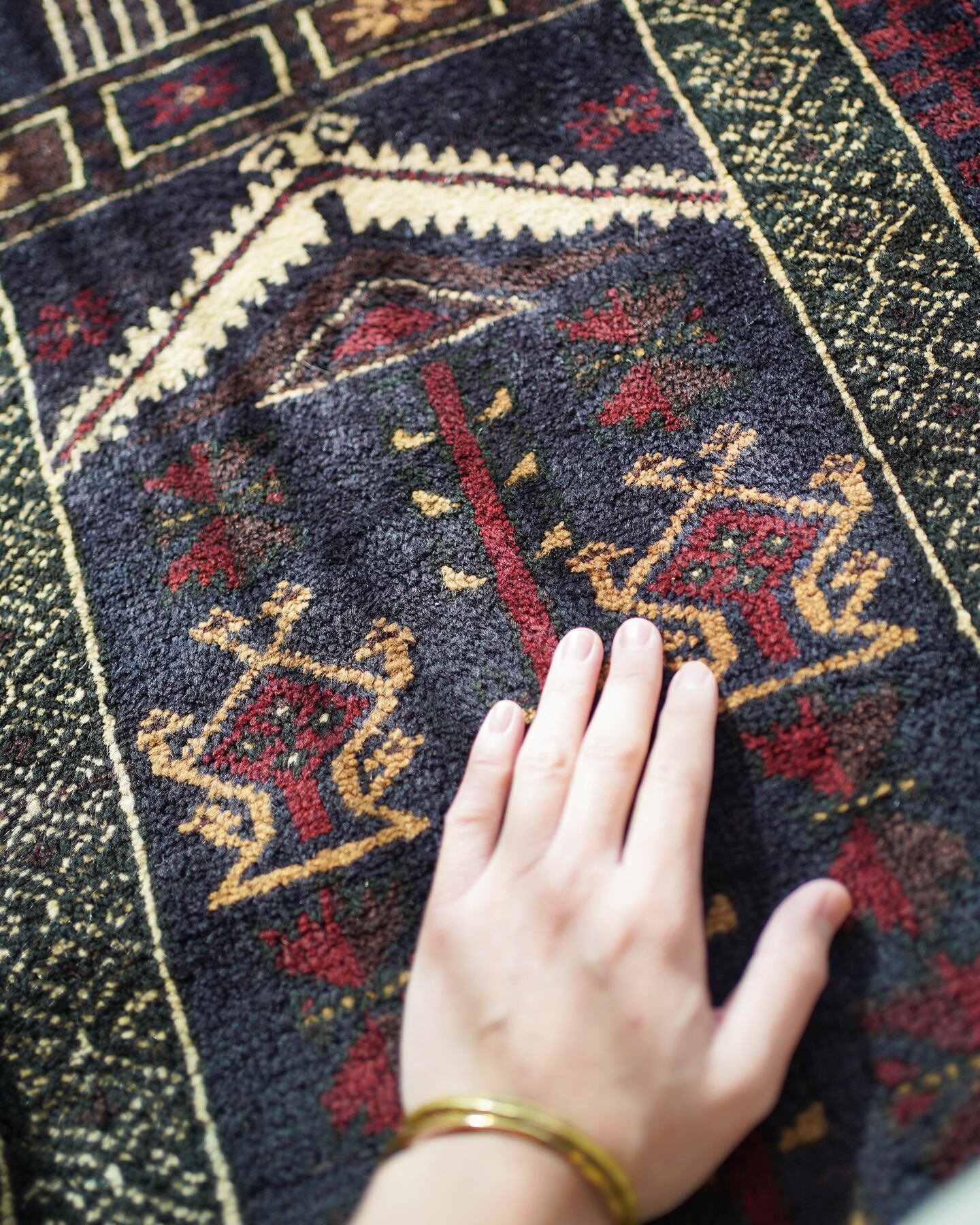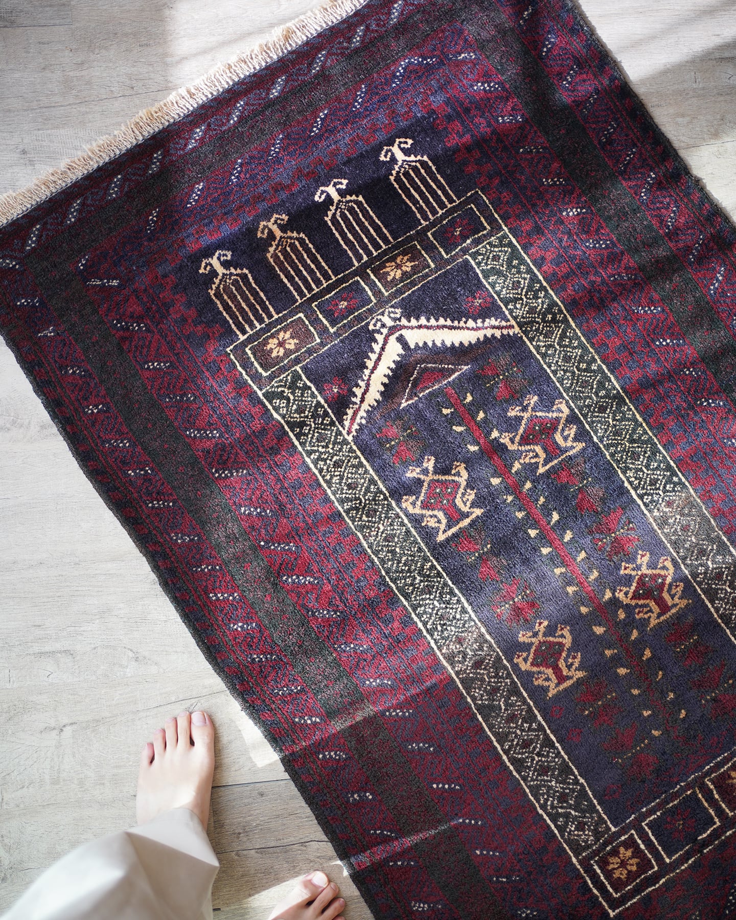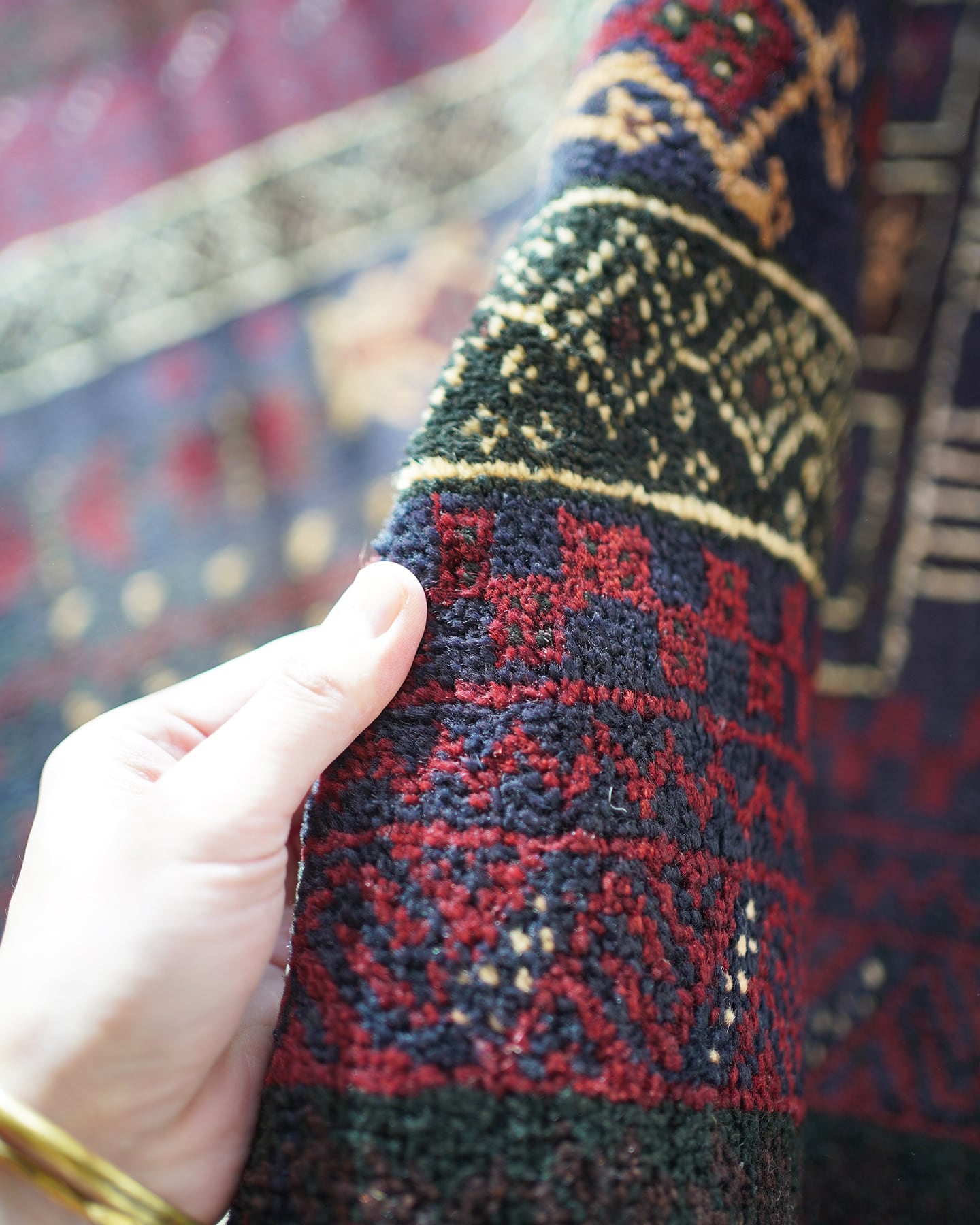 経年40年のバルーチプレイヤーラグ。深い紫色と濃紺のカラーリングが素敵で仕入れを決めた一枚です。深い色味で落ち着いた印象でありながらも、しっかりと存在感があります。ふわっとしていて柔らかく、気持ちの良い肌触りで、毛並みは8mm程度。程よい厚みがありますので、上に座っても心地良いです。補修跡も無く、コンディションも大変良好。リビングやベッドルームなどお気に入りの場所にどうぞ♫