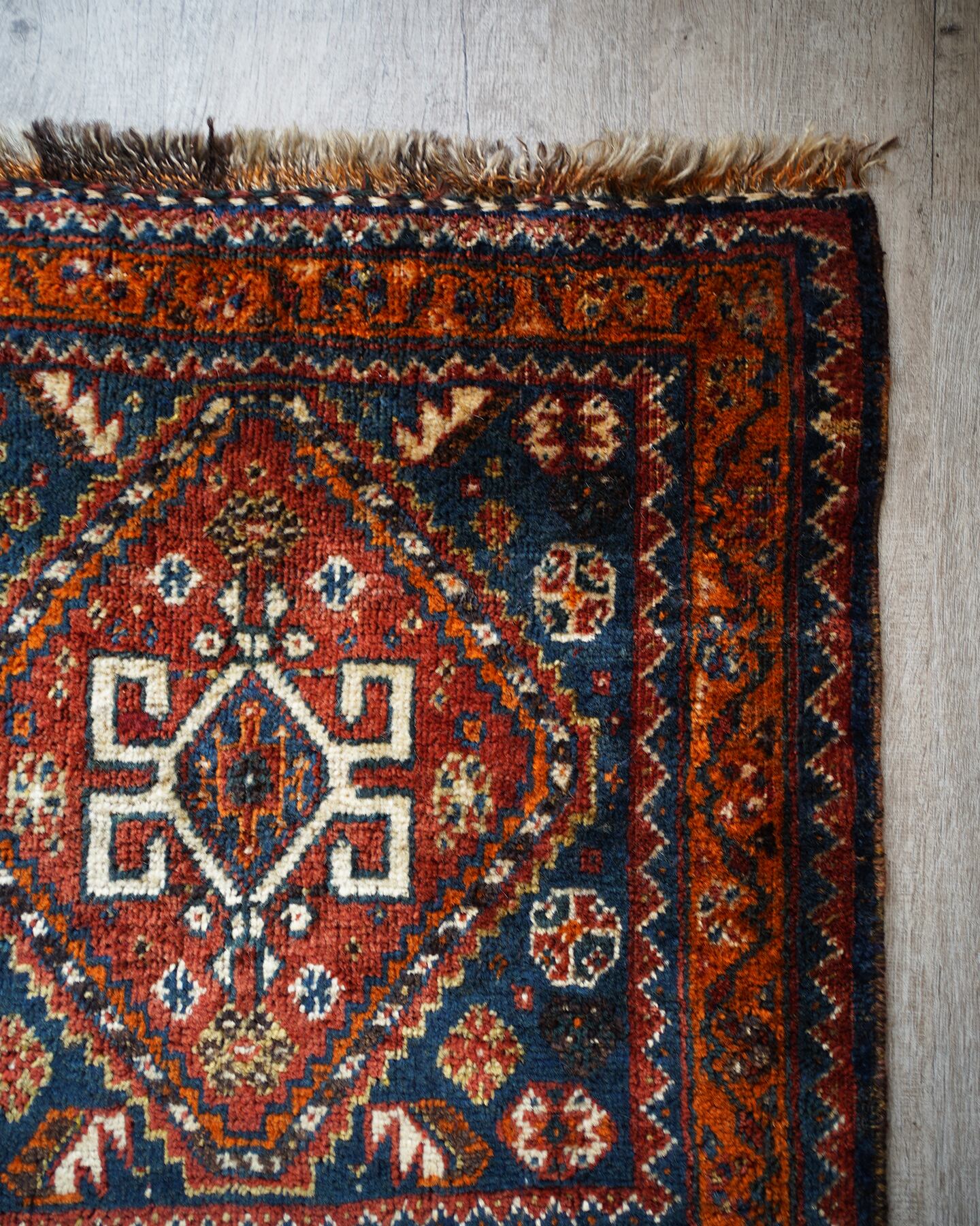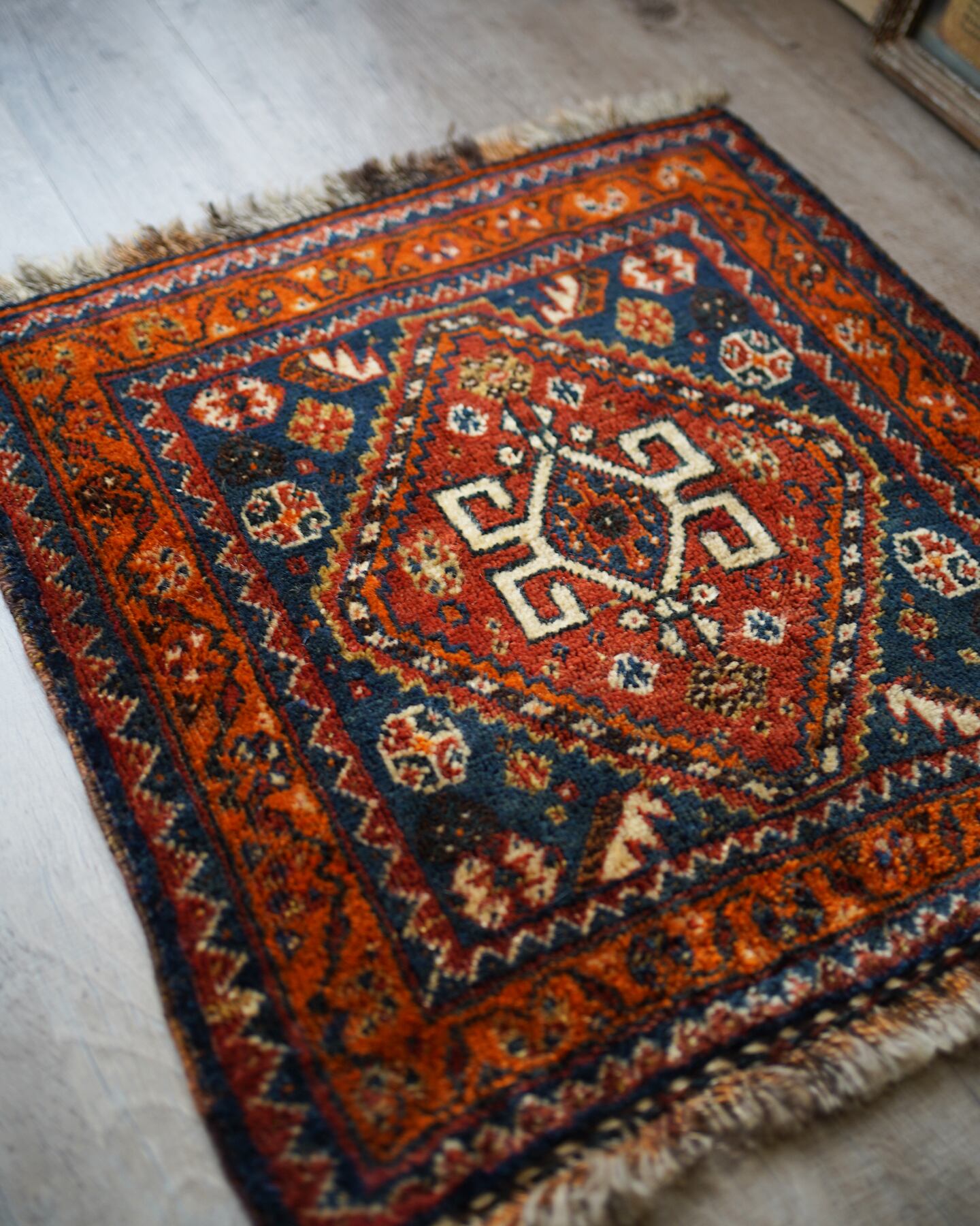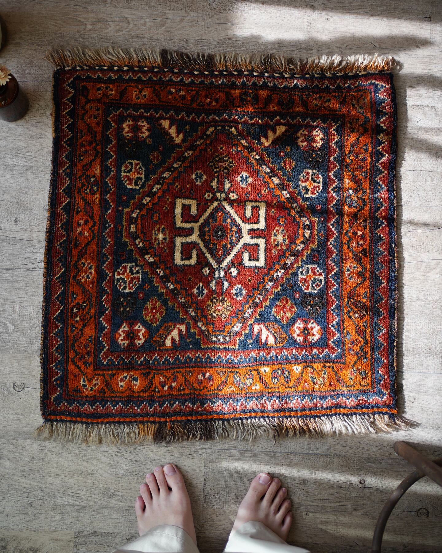 真ん中に大きく織り込まれたメダリオンが特徴的なスクエアタイプのシラーズラグ。メダリオン部分はブラウンと朱色の間のような色味、フィールド部分は濃紺、ボーダーはオレンジの配色となっています。ふわサラ〜っとした柔らかく優しい肌触りで、本当に質感が素晴らしいラグです。毛並みは7mm程度で程よい厚みがあります。目立った補修跡も無く、状態も大変良好です。玄関や洗面などのスペースに敷いたり、タペストリーにしても良さそうです♫