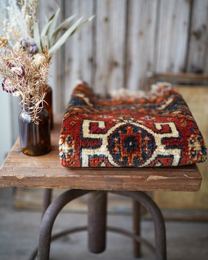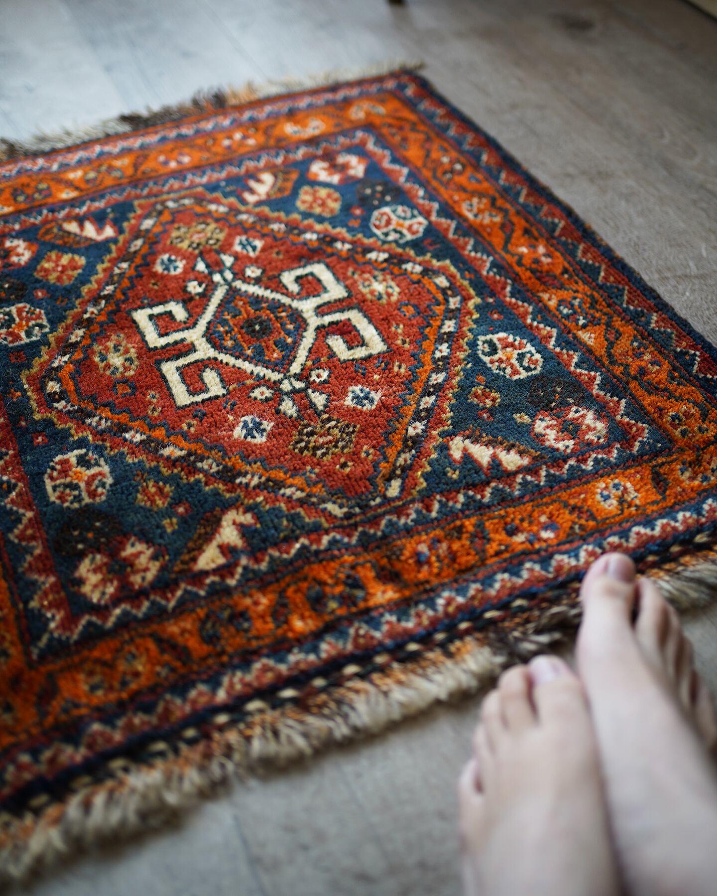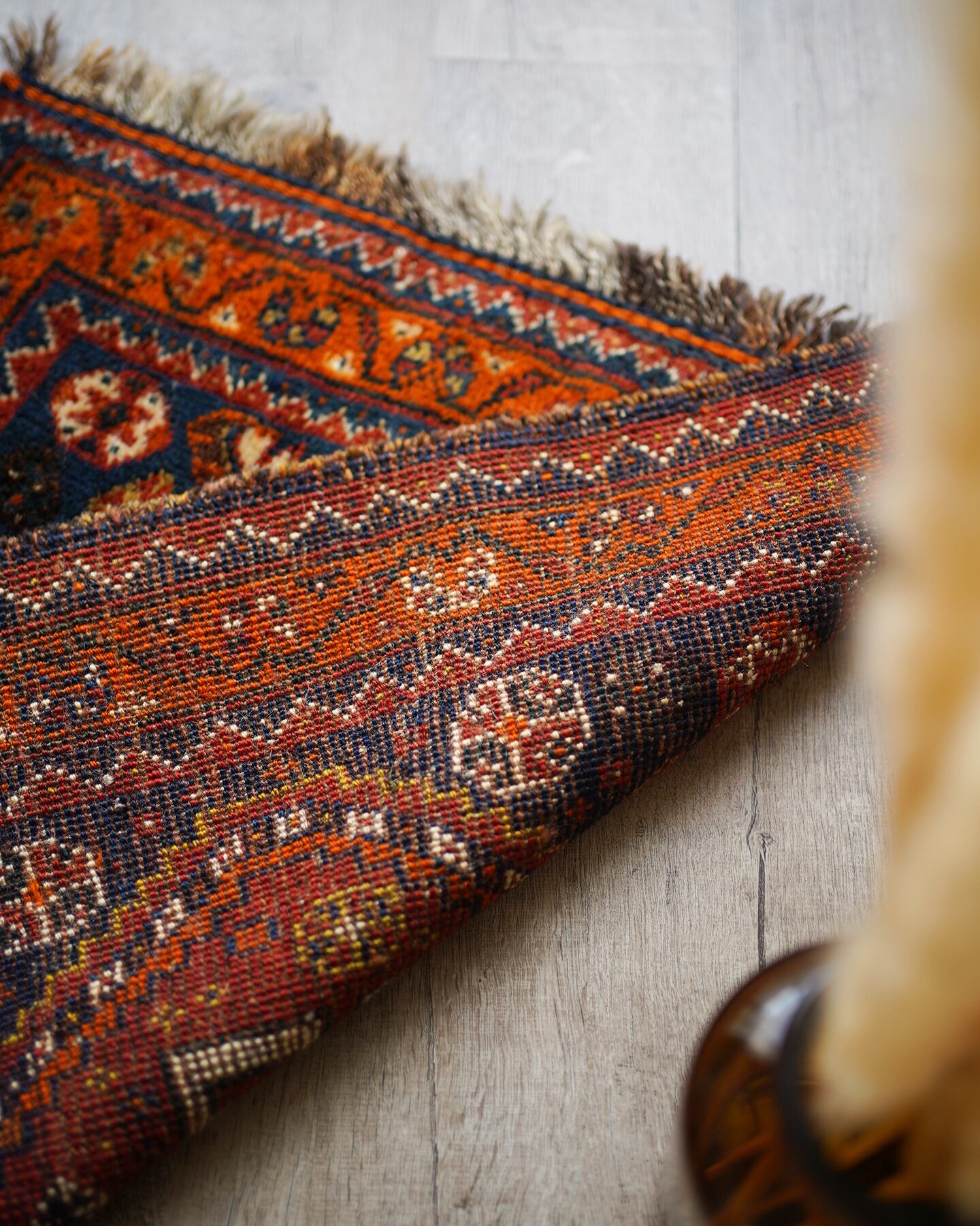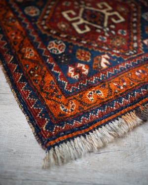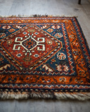 真ん中に大きく織り込まれたメダリオンが特徴的なスクエアタイプのシラーズラグ。メダリオン部分はブラウンと朱色の間のような色味、フィールド部分は濃紺、ボーダーはオレンジの配色となっています。ふわサラ〜っとした柔らかく優しい肌触りで、本当に質感が素晴らしいラグです。毛並みは7mm程度で程よい厚みがあります。目立った補修跡も無く、状態も大変良好です。玄関や洗面などのスペースに敷いたり、タペストリーにしても良さそうです♫